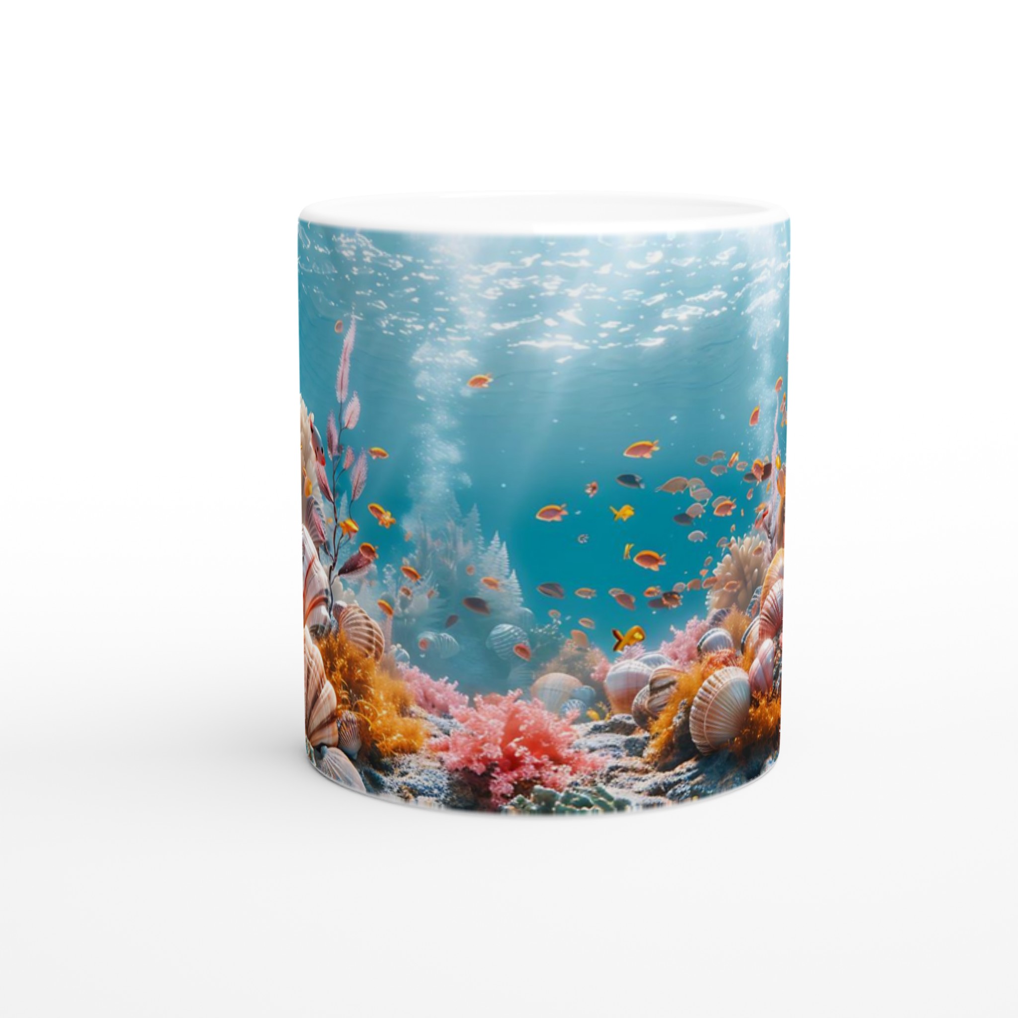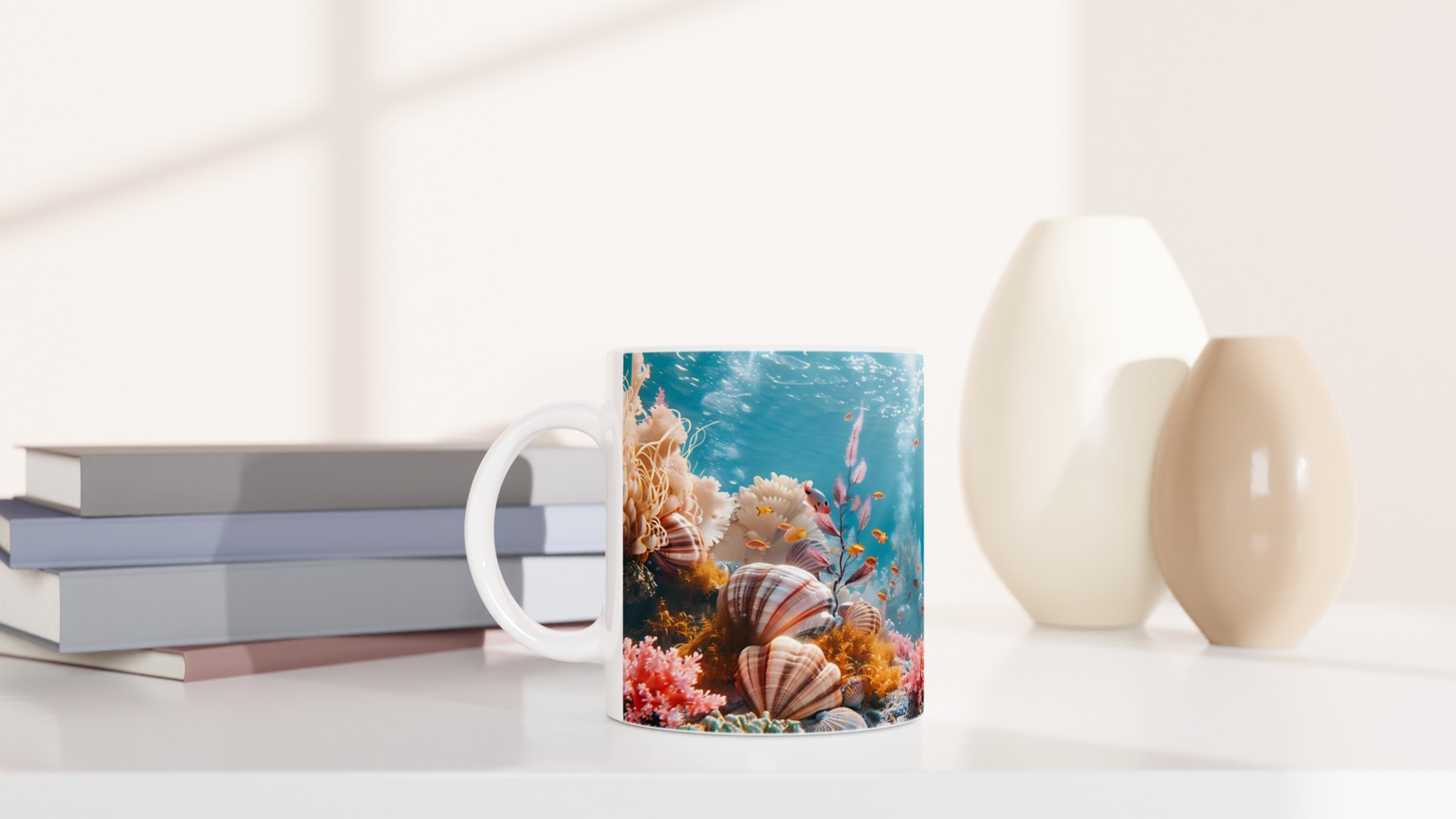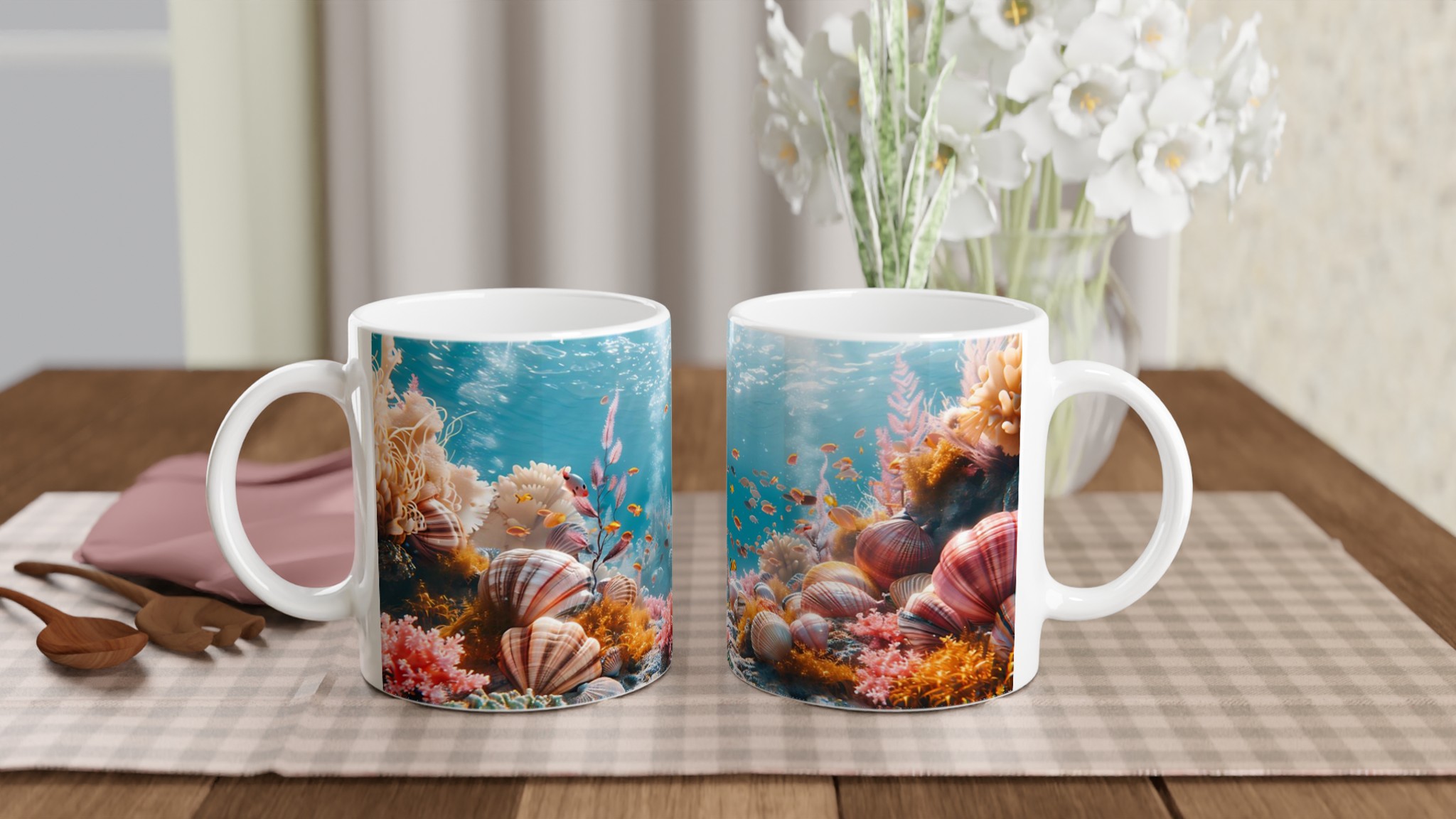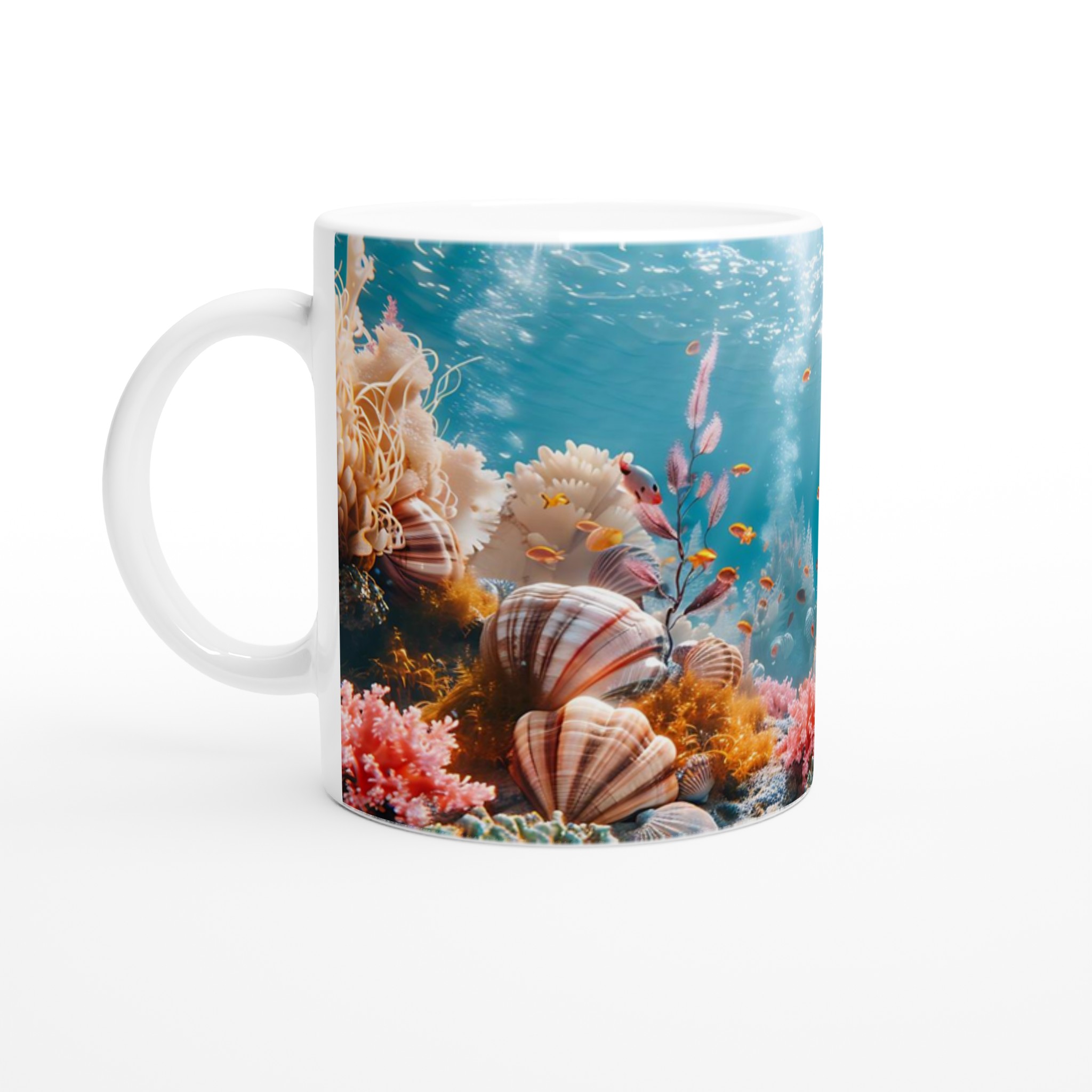 Dyk ner i en värld av lugn och skönhet varje gång du tar en klunk från den här stilrena keramiska muggen. Inspirerad av havets förtrollande färger och myllrande liv, blir den snabbt en vardagsfavorit. Perfekt för morgonkaffet, kvällens varma choklad eller när du bara vill njuta av en kopp te medan du drömmer dig bort till en undervattensvärld fylld av liv och glädje. Den blanka ytan framhäver trycken med klara och levande färger, som håller sig fina även efter många turer i mikron och diskmaskinen, precis som de livfulla korallreven under ytan.