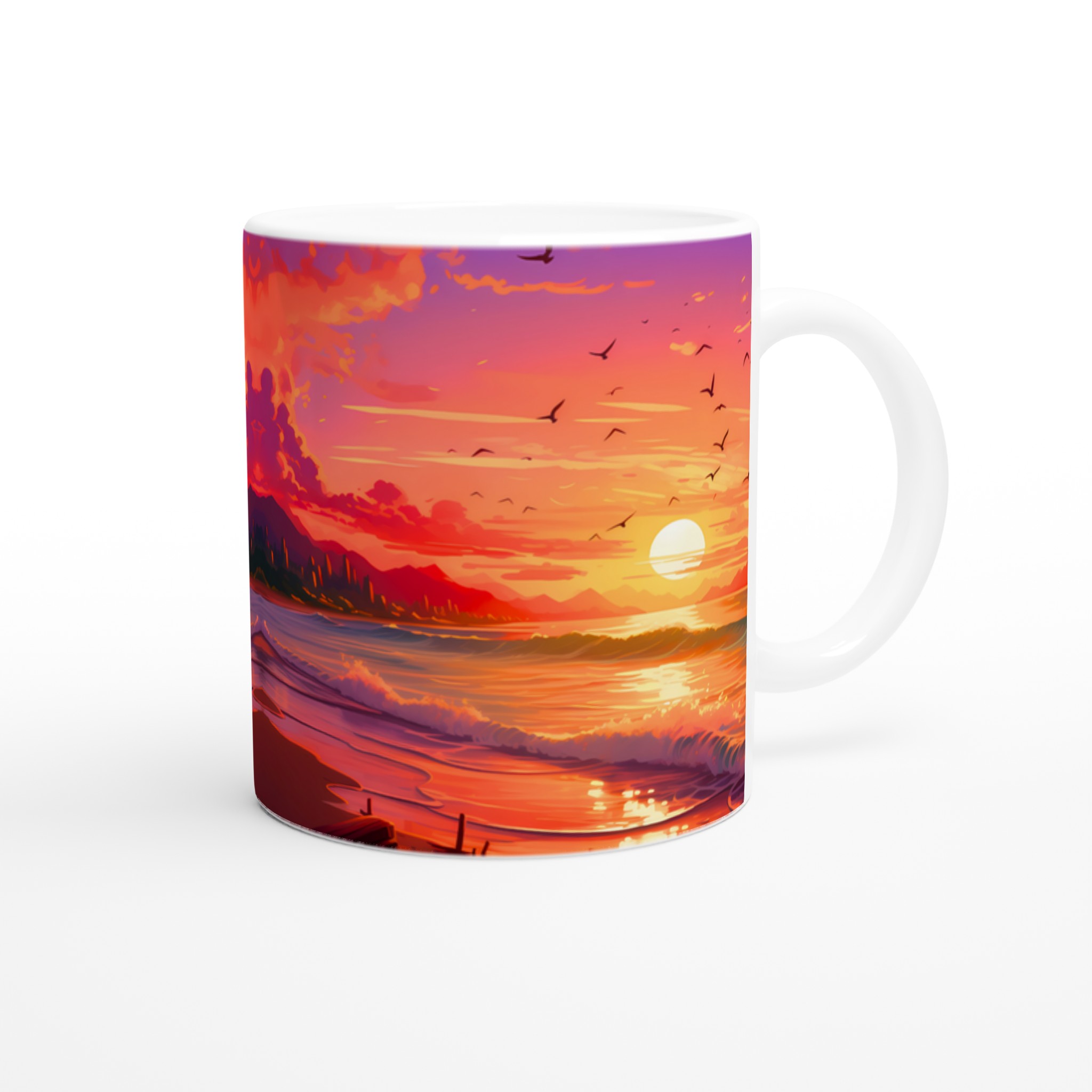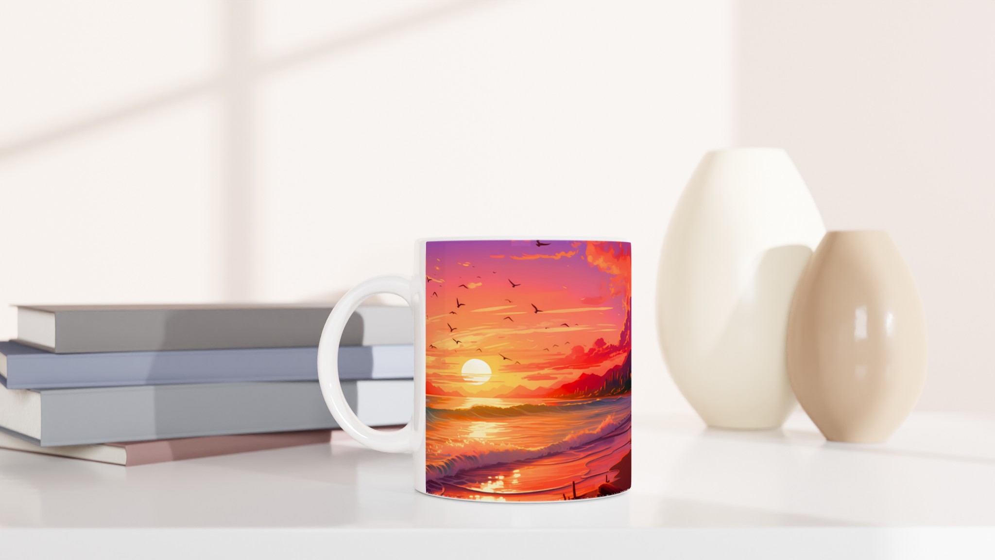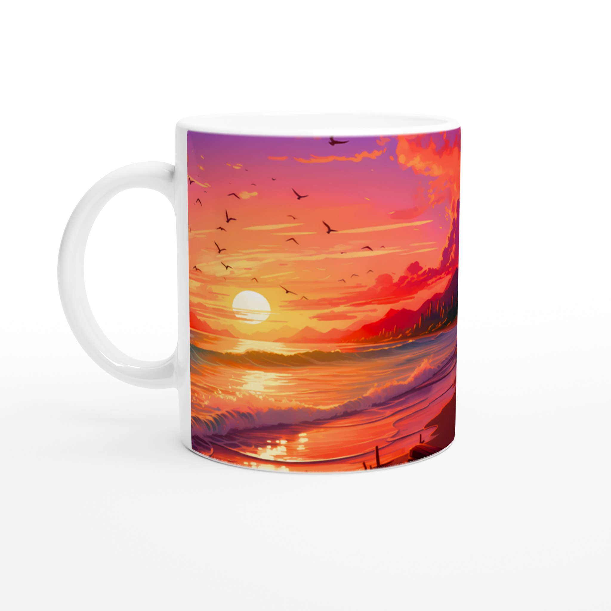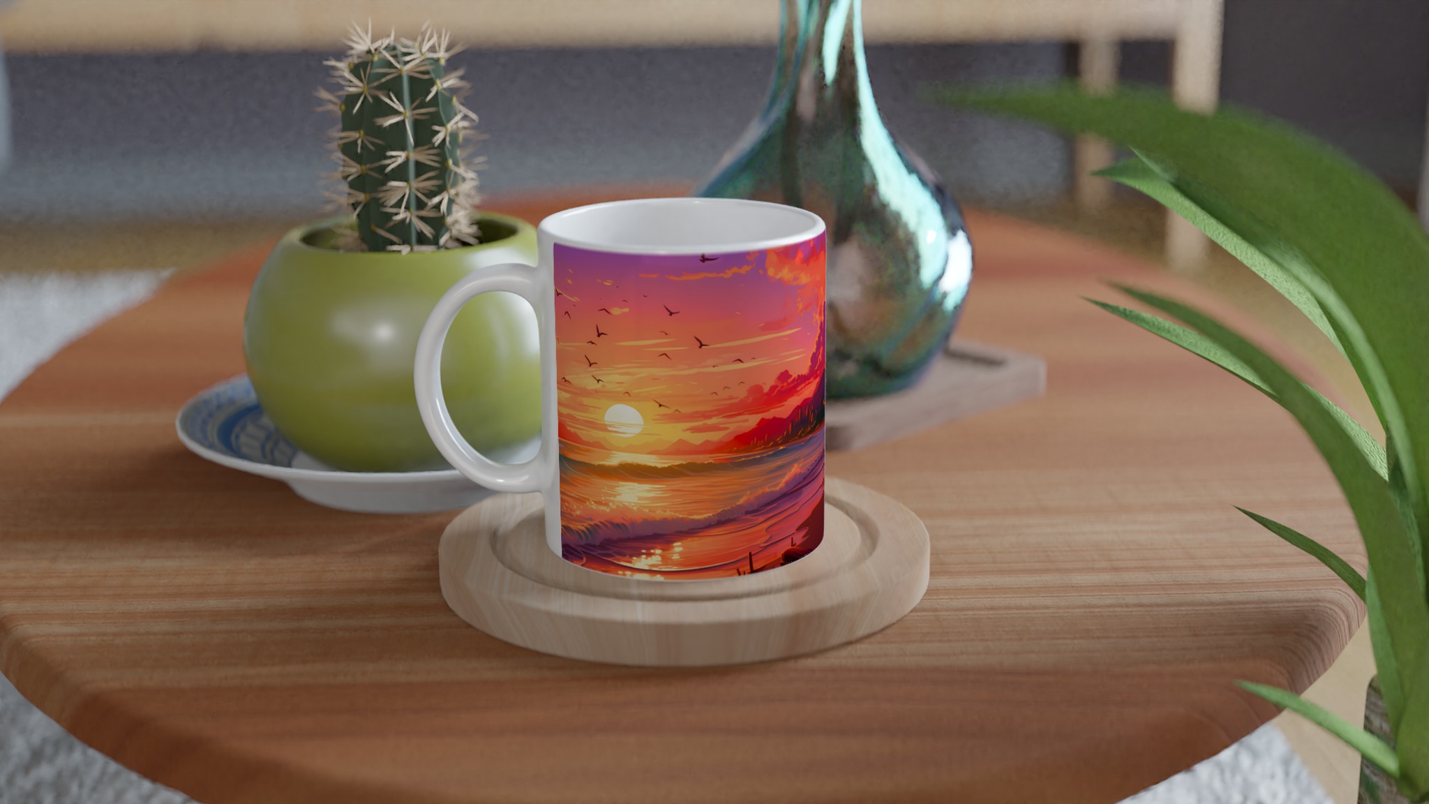 Låt dig svepas med av den drömska skönheten hos en solnedgång över havet varje gång du tar en klunk. Denna keramiska mugg fångar den varma glöden och de mjuka färgskiftningarna från en akvarellmålning, perfekt för att lyfta din dag. Med sin lugnande estetik blir den snabbt en vardagsfavorit, idealisk för morgonkaffet, kvällens varma choklad eller när du bara vill njuta av en kopp te.