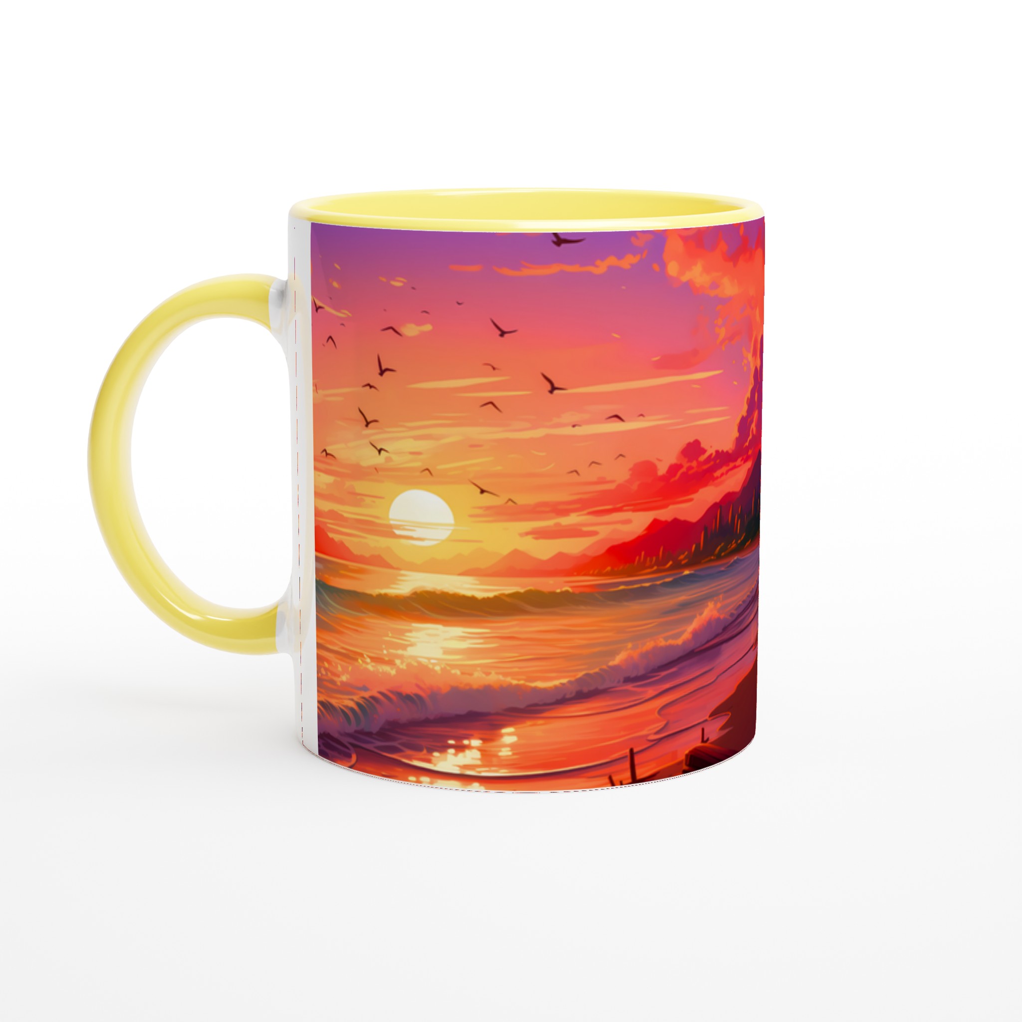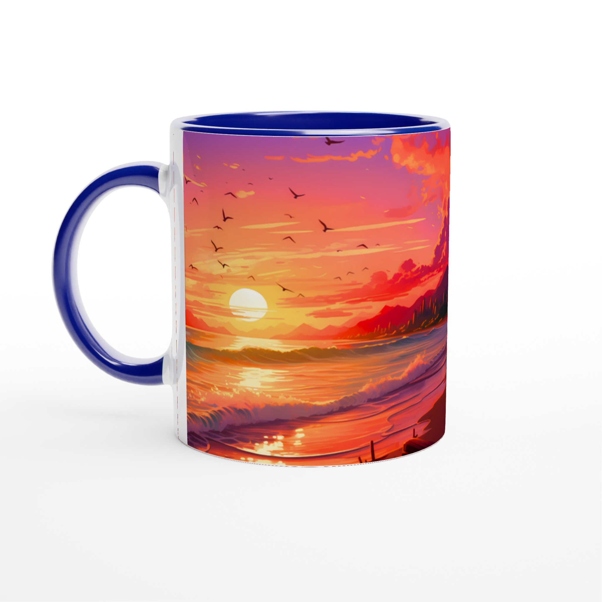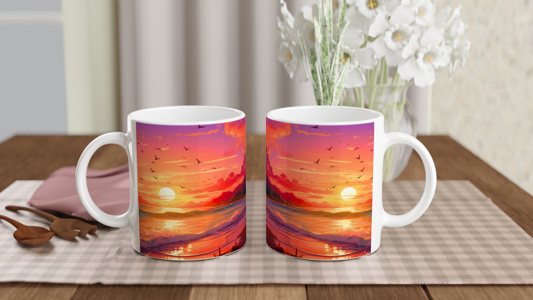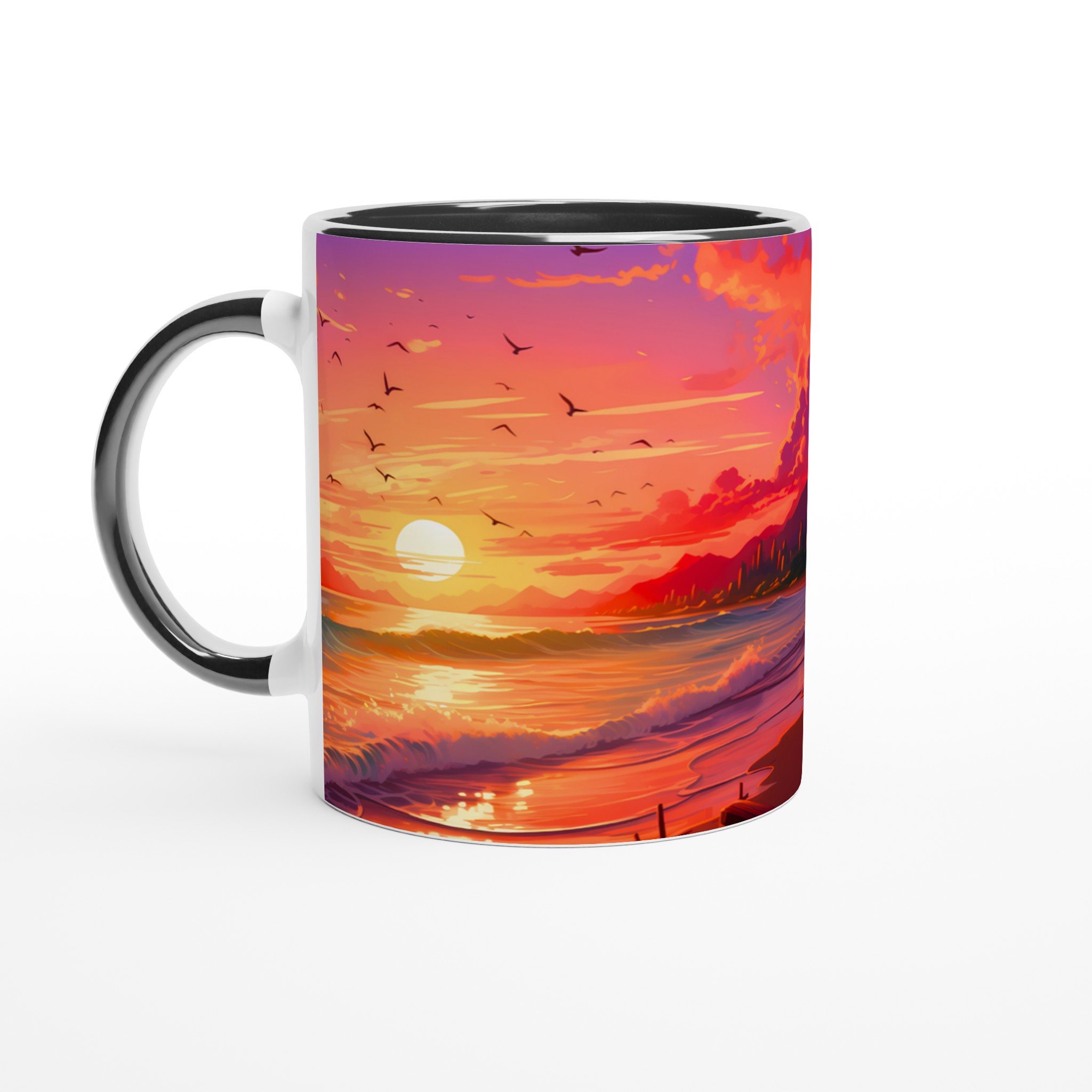 Låt dig svepas med av den drömska skönheten hos en solnedgång över havet varje gång du tar en klunk. Denna keramiska mugg fångar den varma glöden och de mjuka färgskiftningarna från en akvarellmålning, perfekt för att lyfta din dag. Med sin lugnande estetik blir den snabbt en vardagsfavorit, idealisk för morgonkaffet, kvällens varma choklad eller när du bara vill njuta av en kopp te.