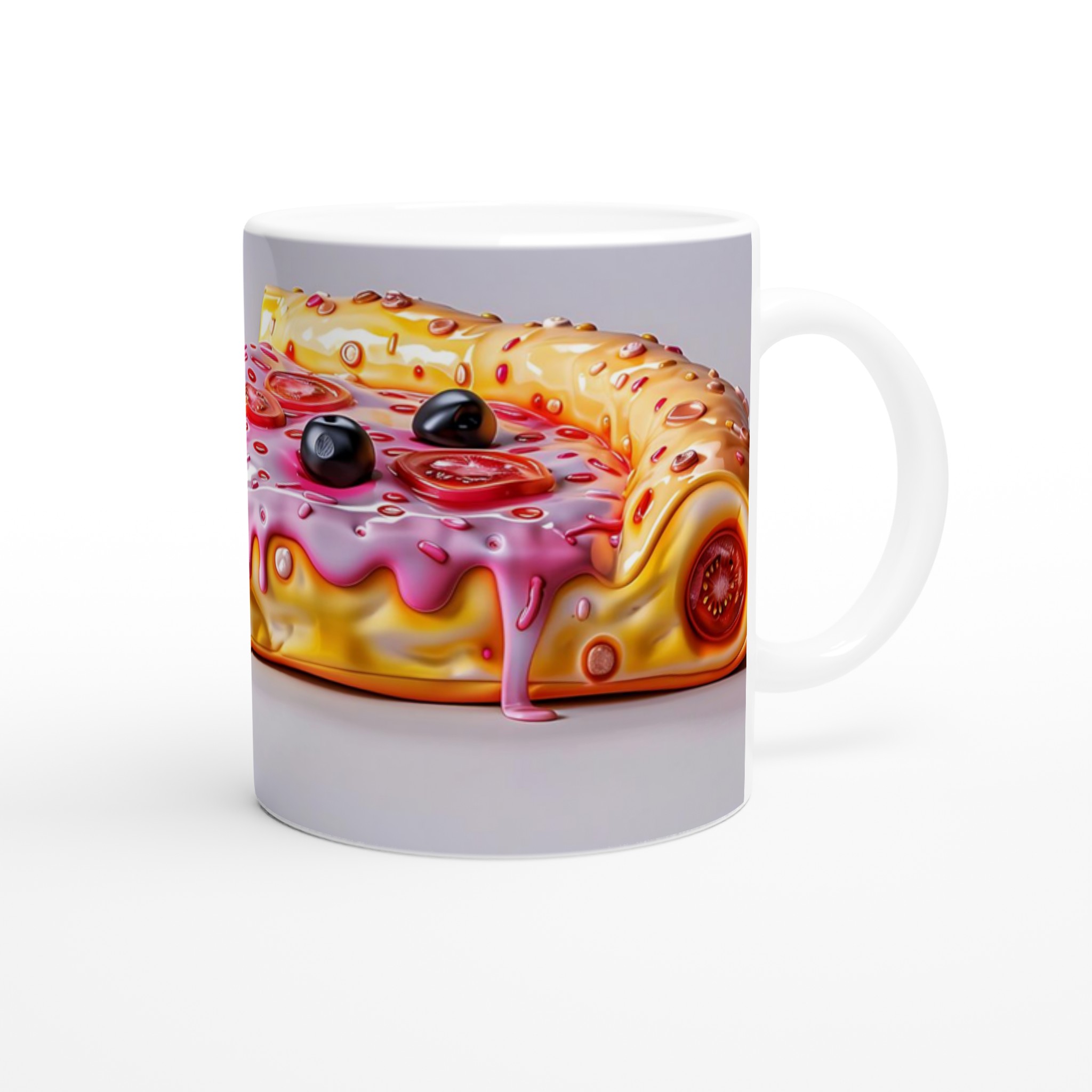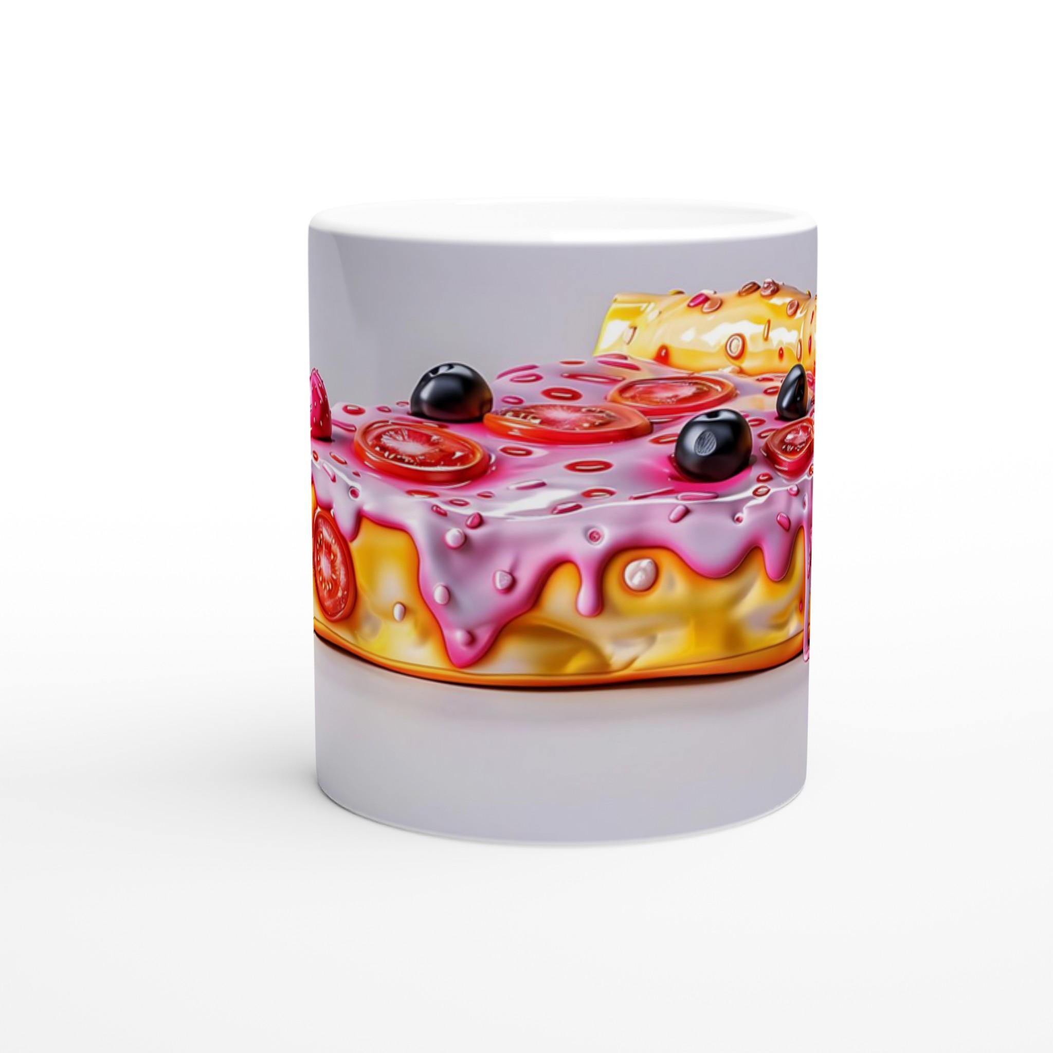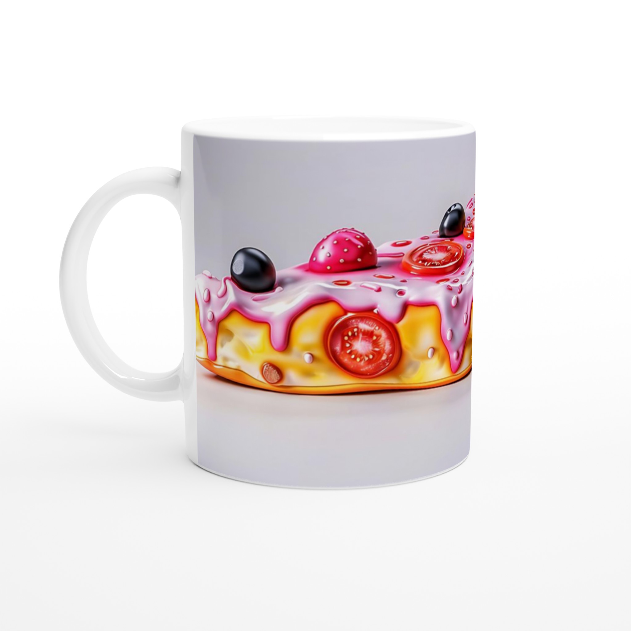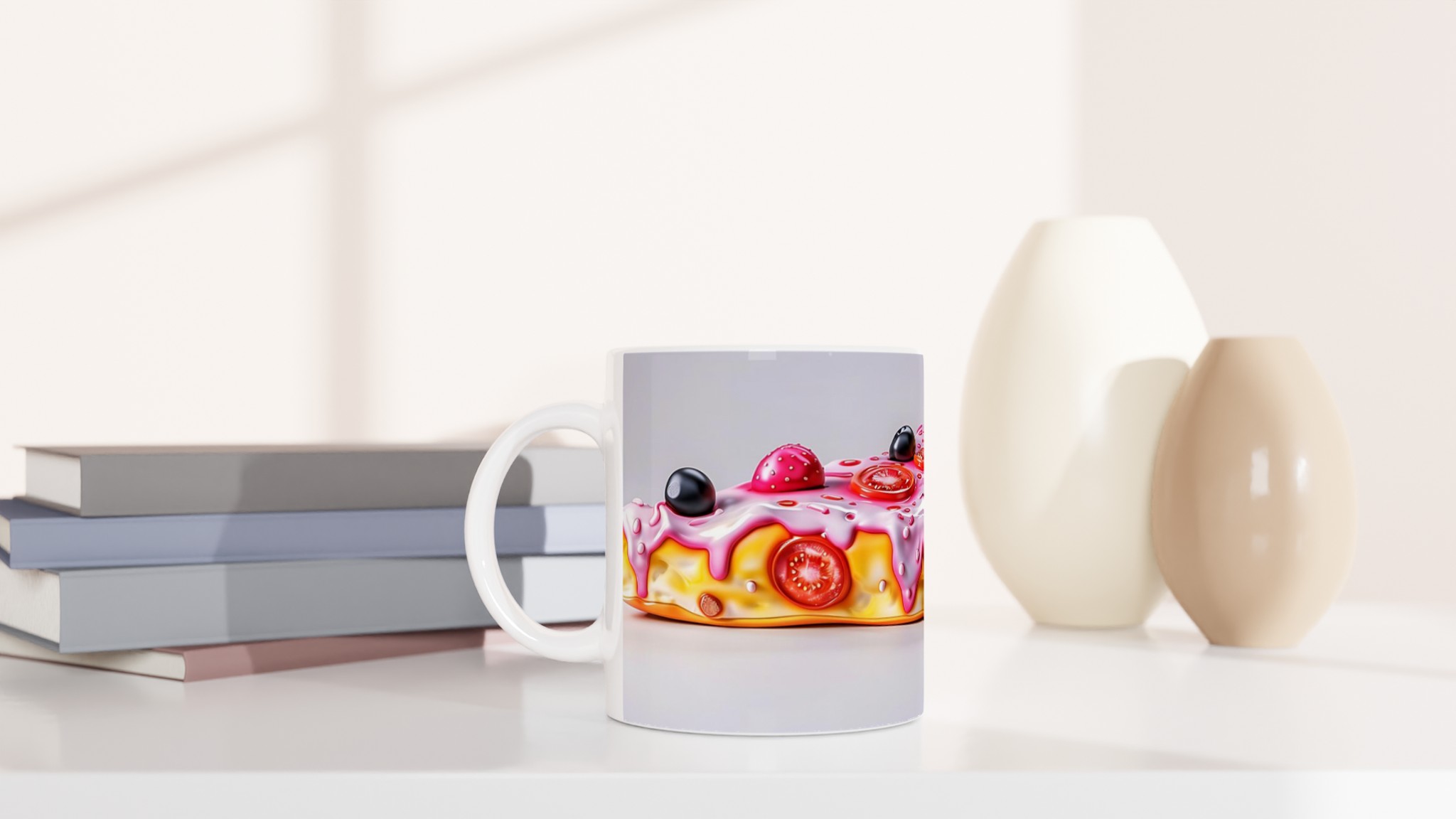 Lyft din vardagsrutin med vår keramiska mugg – en verklig ögonfångare som kombinerar lekfull design med tidlös charm. Den här muggen är inte bara en behållare för din favoritdryck; den är en konversationsstartare, prydd med en surrealistisk och aptitretande ’sweet pizza’-design med glänsande, droppande glasyr, godistomater och chokladoliver. Dess blanka yta framhäver de klara, levande färgerna som kommer att förbli lika strålande som första dagen, även efter otaliga användningar och rengöringar.