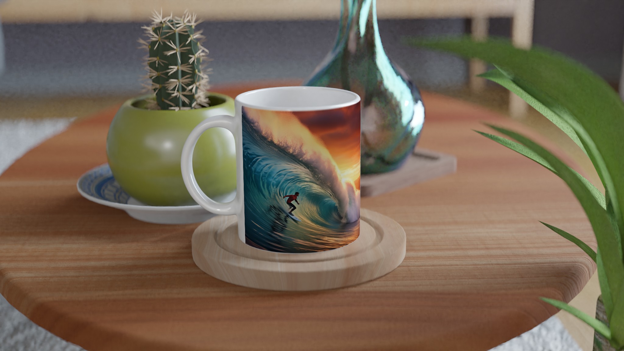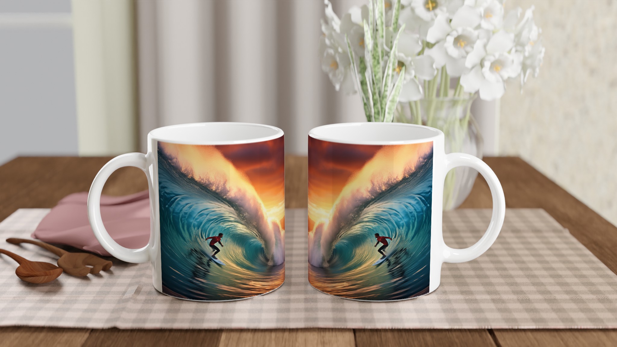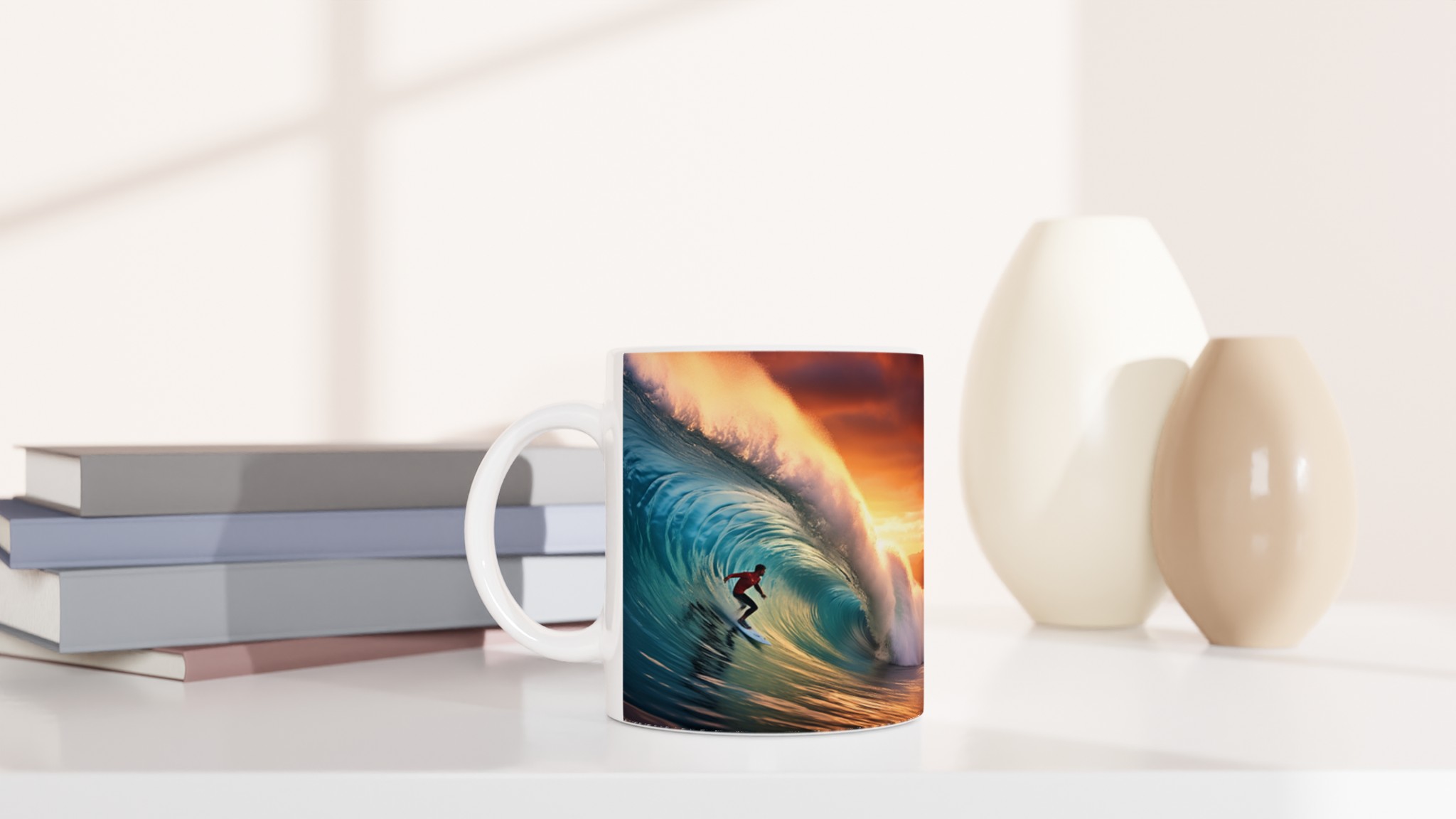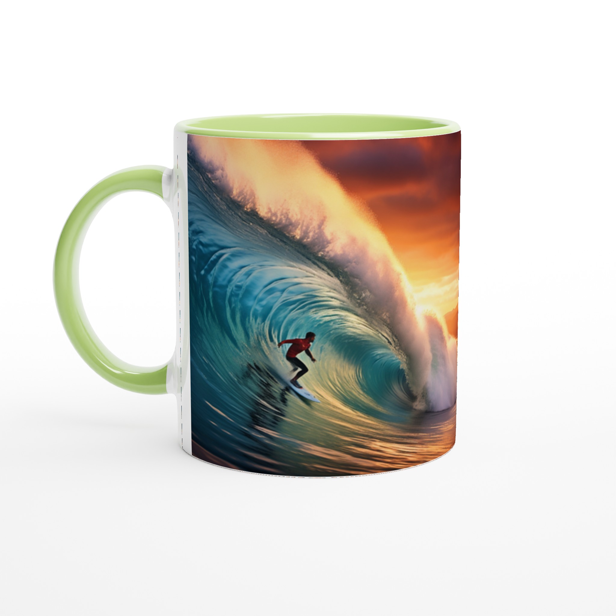 Fånga den mäktiga energin från en perfekt våg och en brinnande solnedgång med vår keramiska mugg – en verklig vardagsfavorit för dig som älskar havet och storslagna ögonblick. Denna mugg är perfekt för ditt morgonkaffe, en lugn stund med kvällens varma choklad, eller när du bara vill njuta av en kopp te medan du drömmer dig bort till kusten.