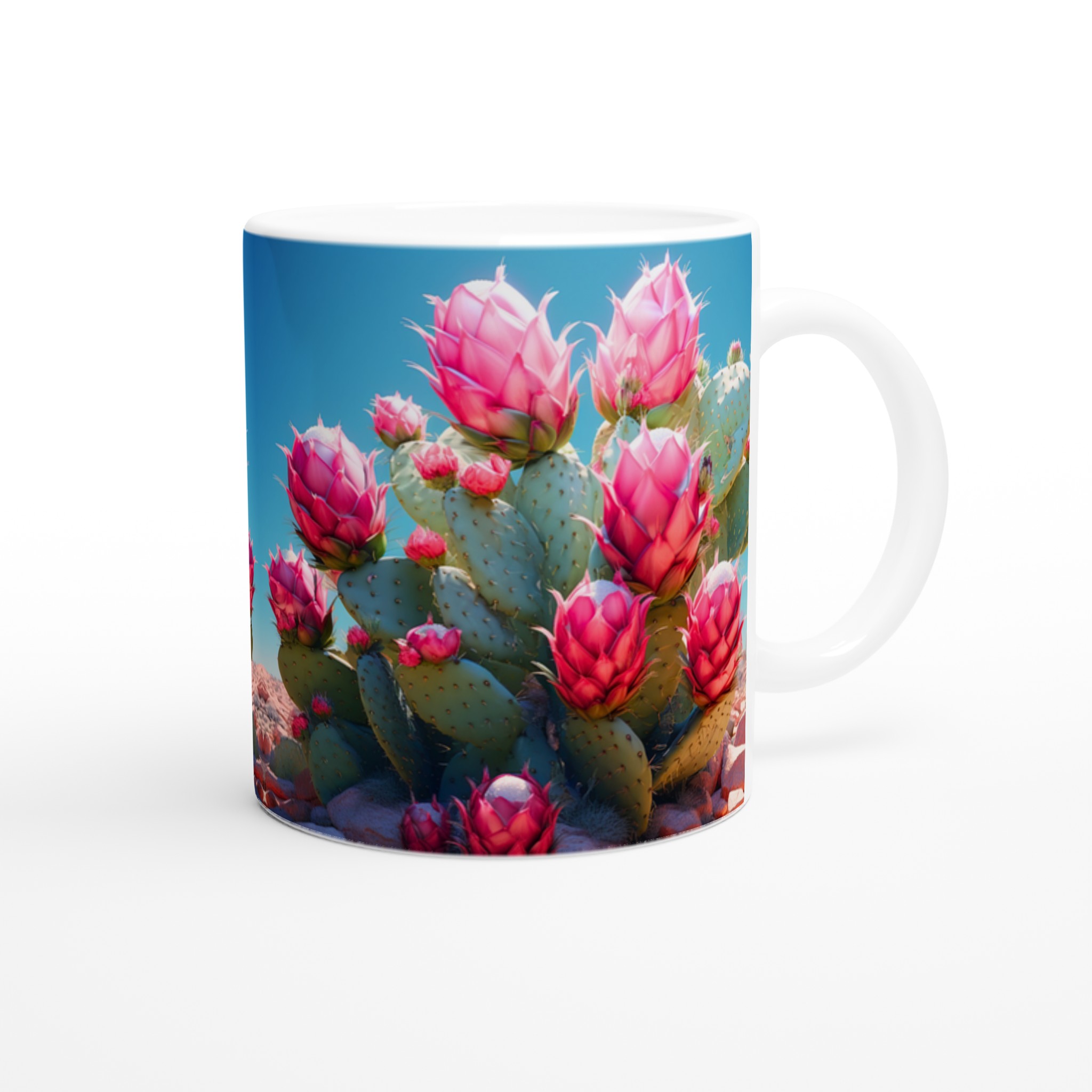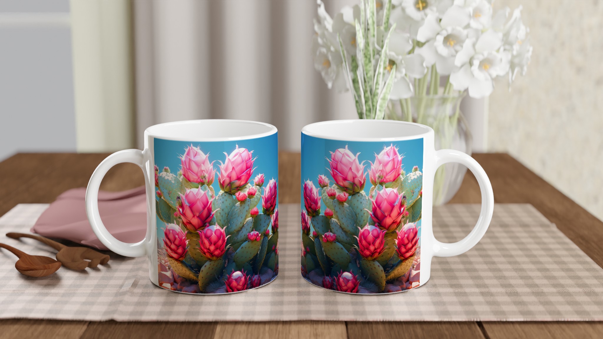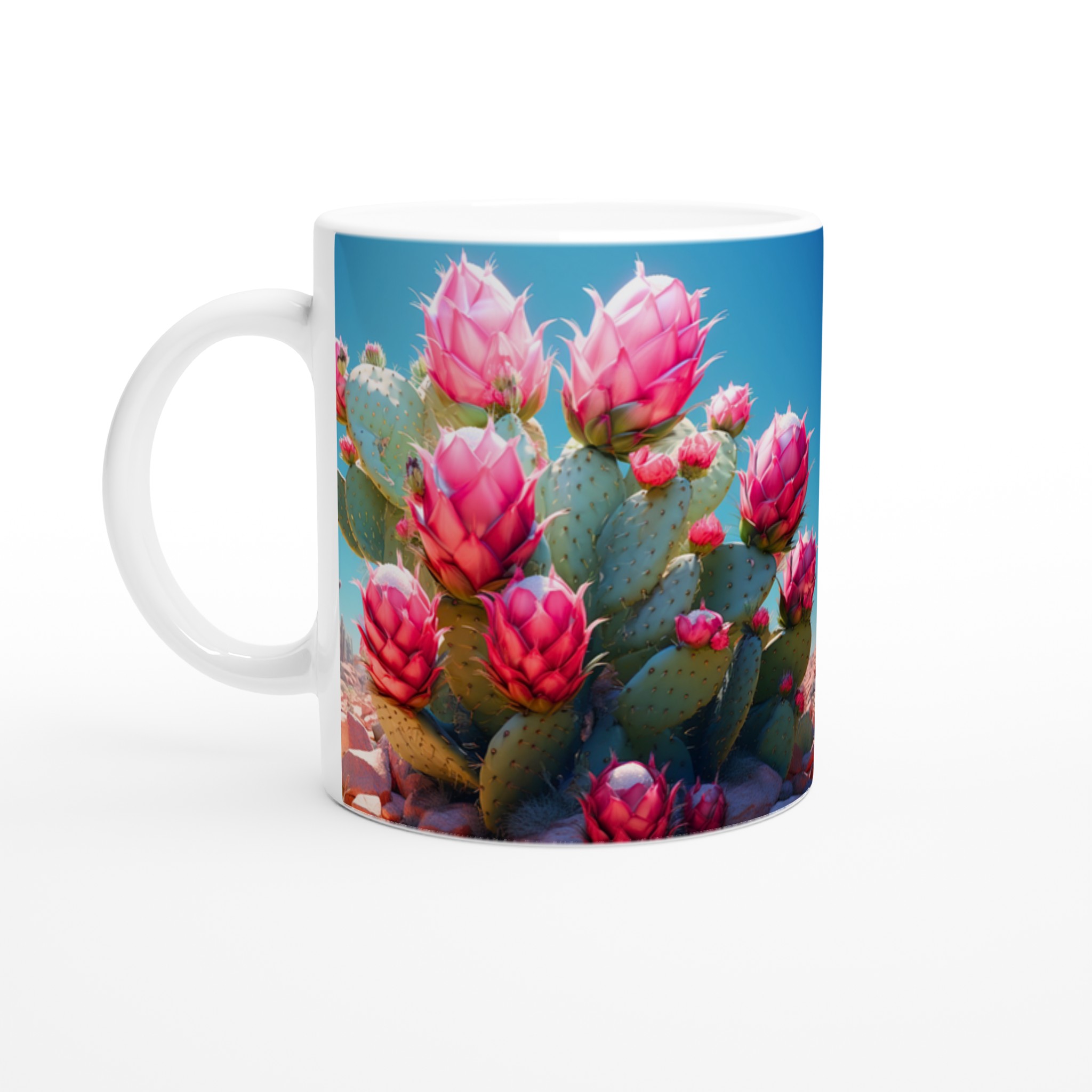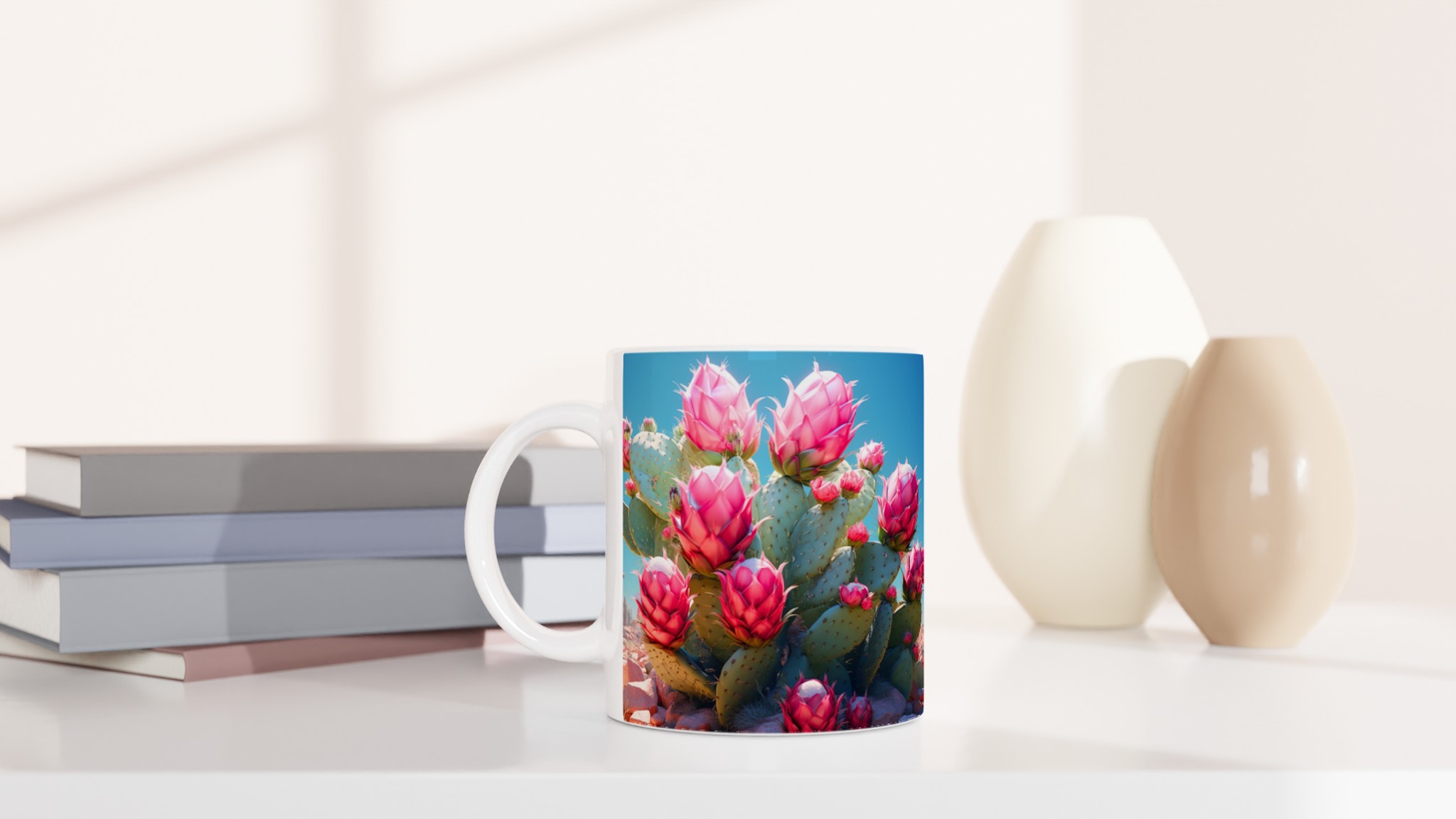 Dröm dig bort till soliga öknar varje gång du tar en klunk med denna iögonfallande keramiska mugg, prydd med en levande illustration av blomstrande kaktusar under en klarblå himmel. Denna stilrena mugg blir snabbt en vardagsfavorit, perfekt för morgonkaffet, kvällens varma choklad eller när du bara vill njuta av en kopp te.
