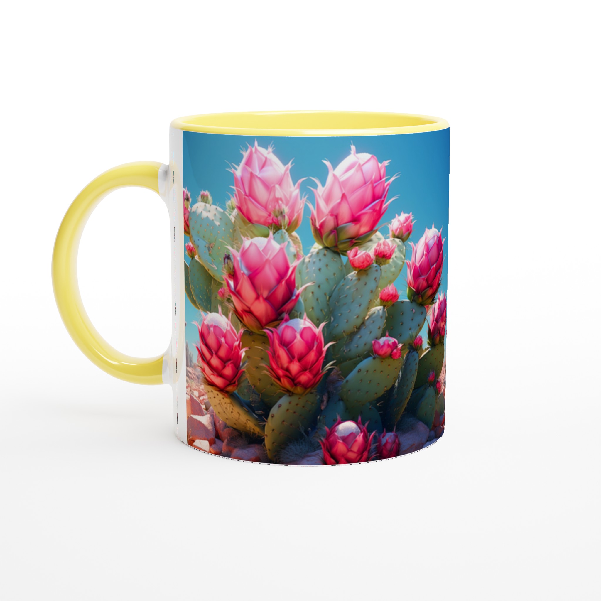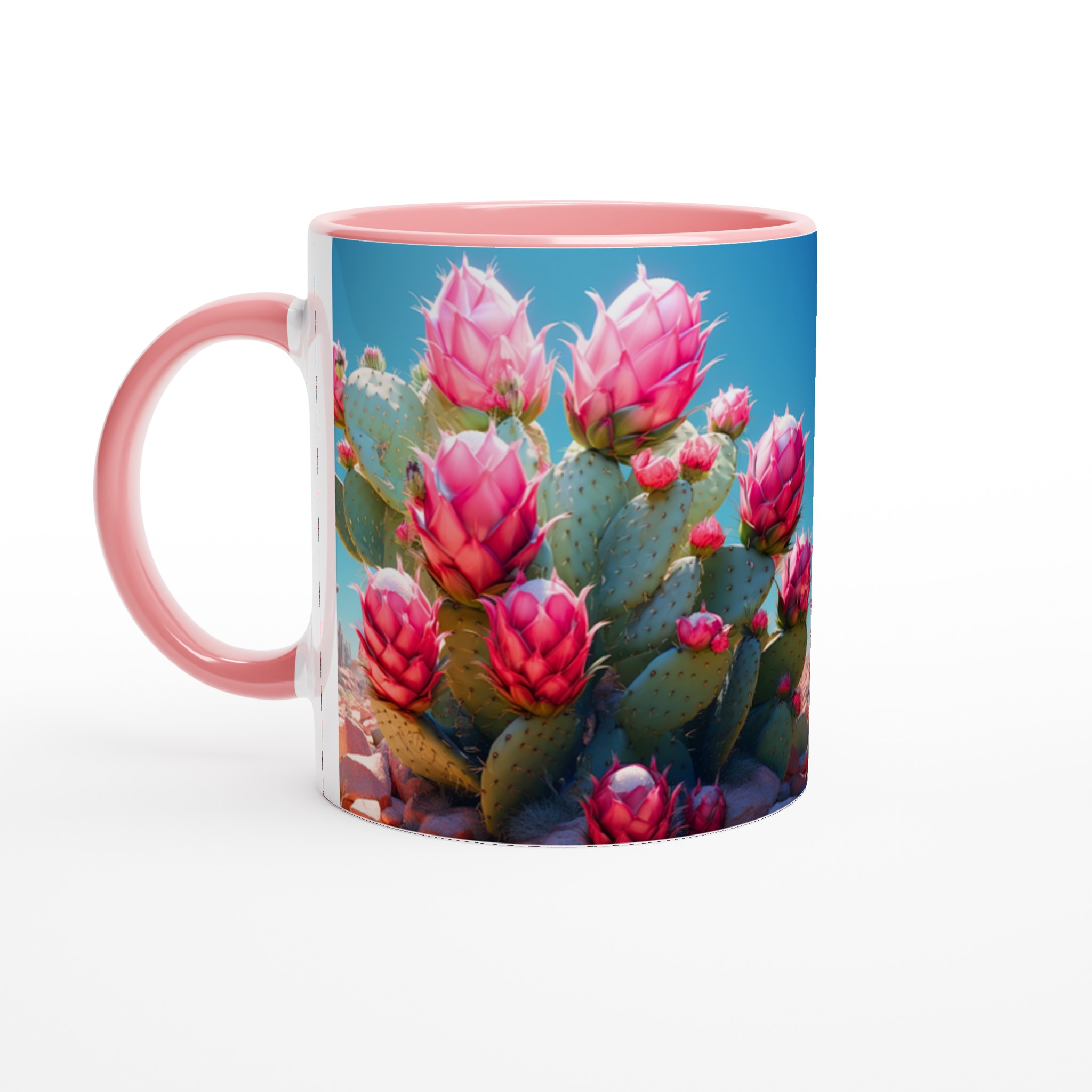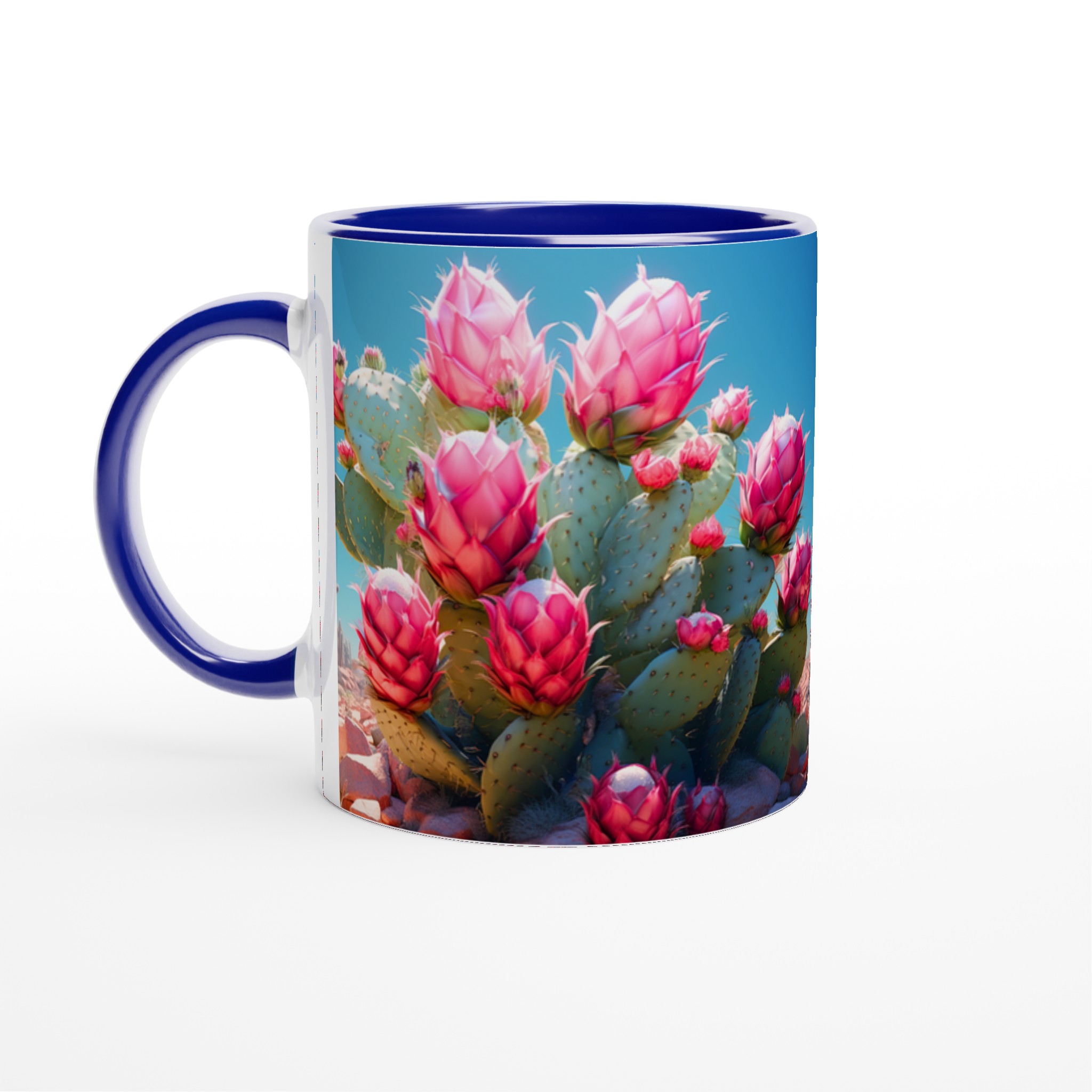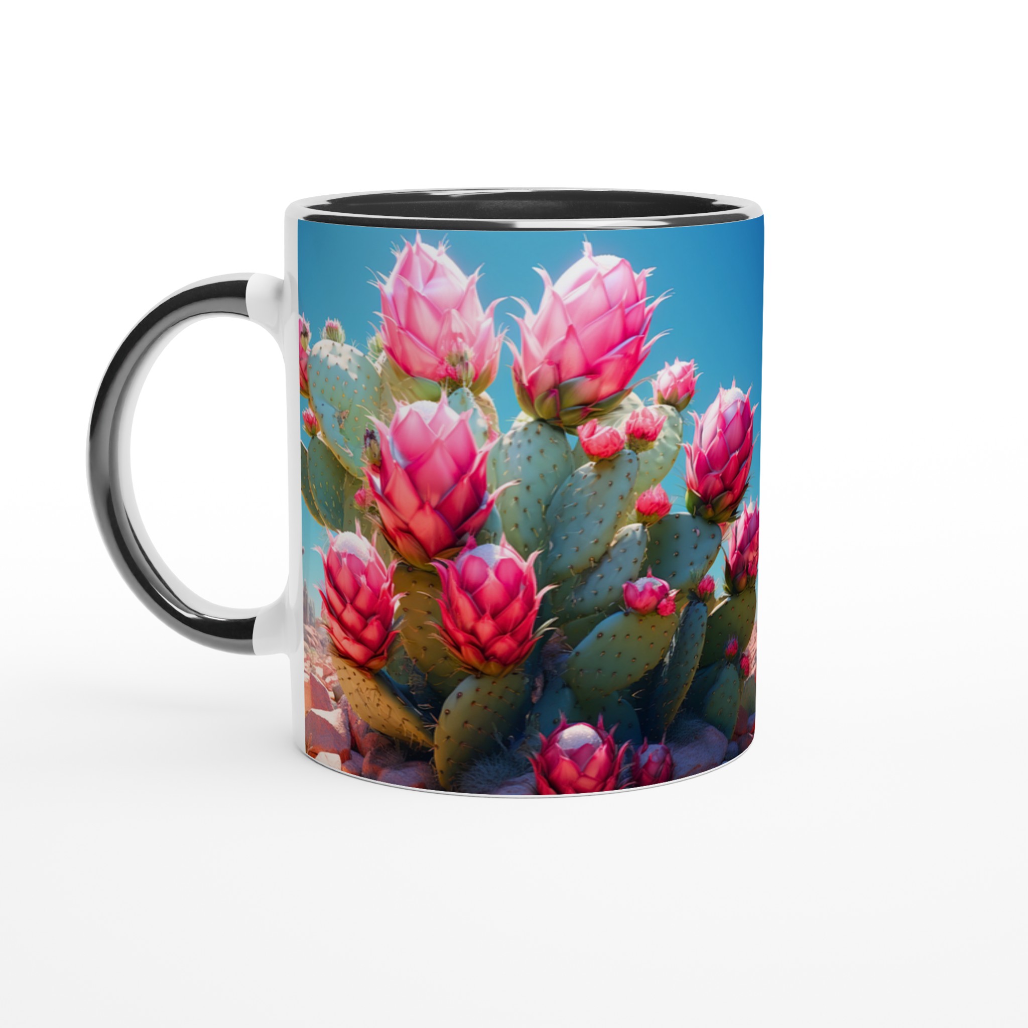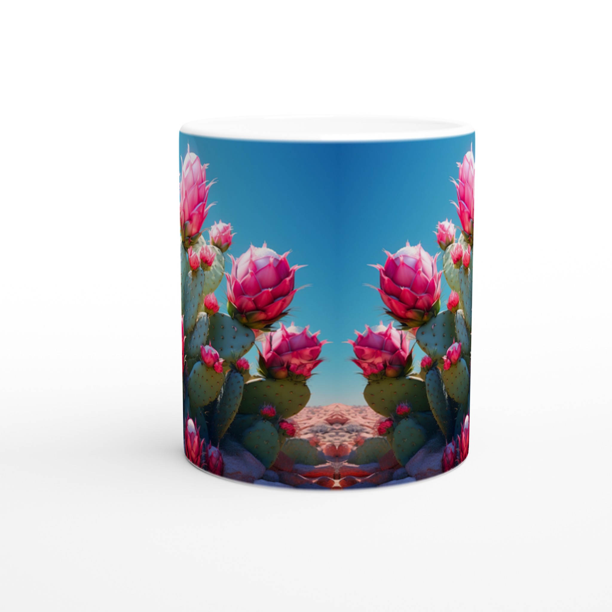 Dröm dig bort till soliga öknar varje gång du tar en klunk med denna iögonfallande keramiska mugg, prydd med en levande illustration av blomstrande kaktusar under en klarblå himmel. Denna stilrena mugg blir snabbt en vardagsfavorit, perfekt för morgonkaffet, kvällens varma choklad eller när du bara vill njuta av en kopp te.