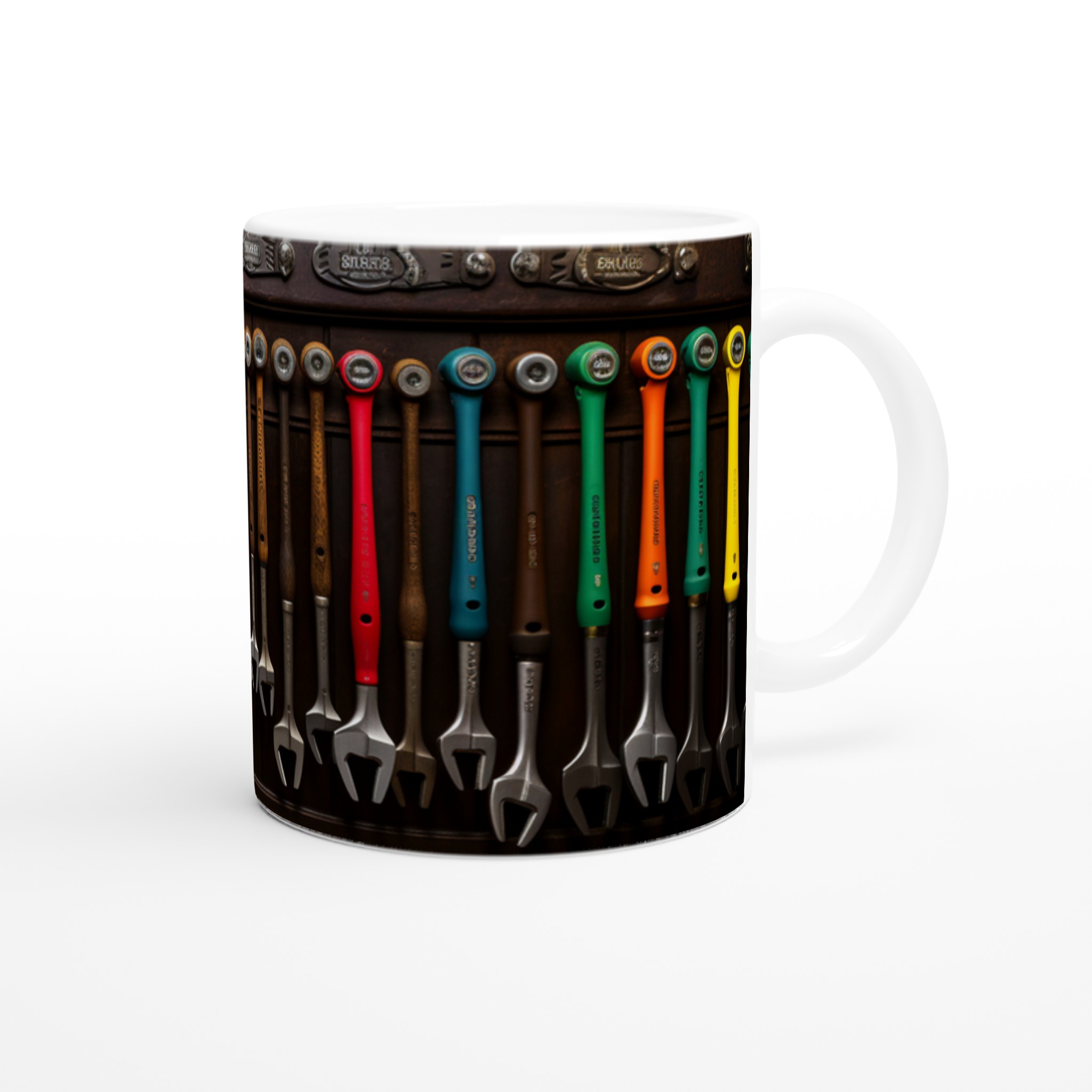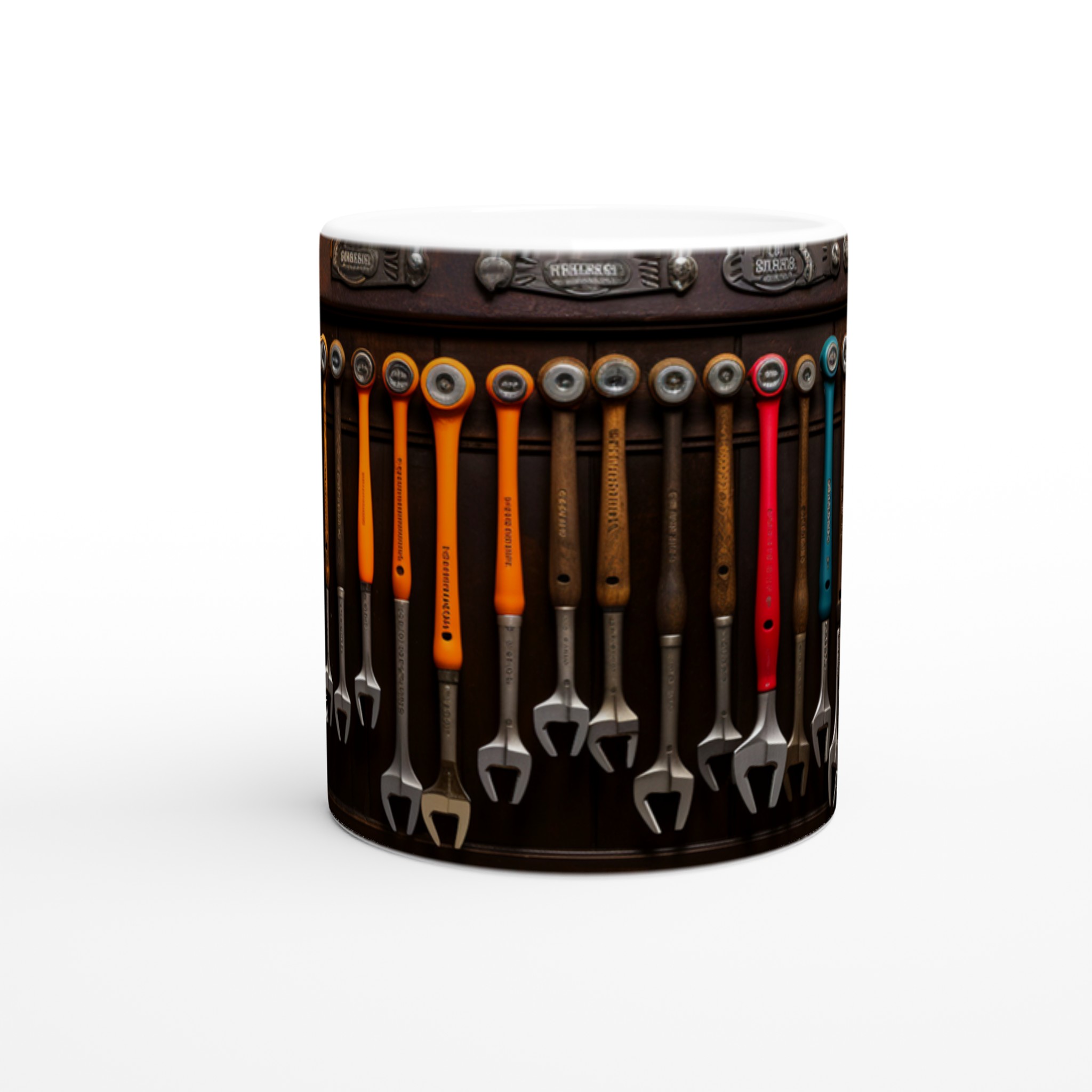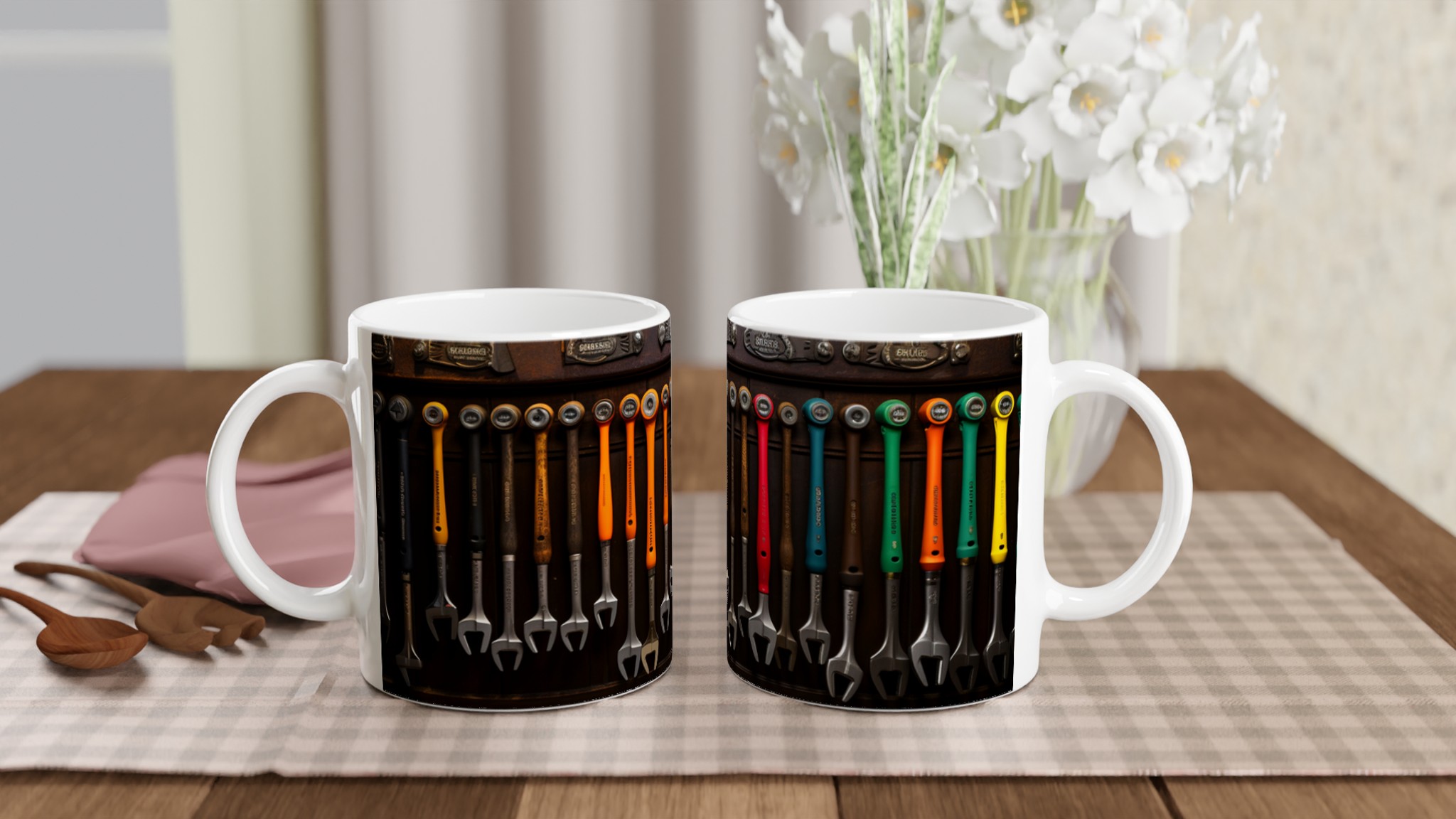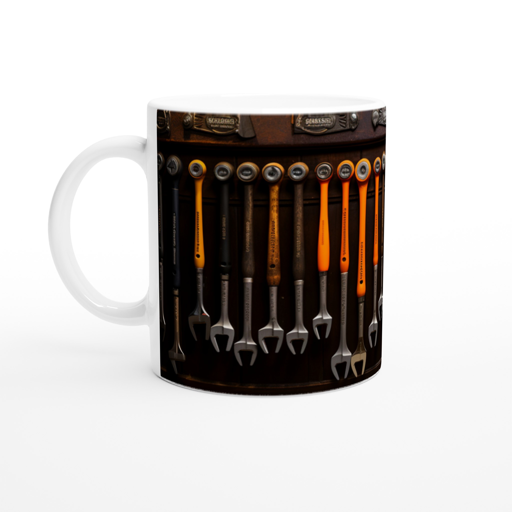 Denna unika keramiska mugg firar hantverket med en levande samling verktyg, perfekt för den som uppskattar både funktion och estetik. Oavsett om du kickstartar dagen med en kopp kaffe, varvar ner med varm choklad på kvällen, eller bara njuter av en lugn te-stund, blir denna mugg snabbt din vardagsfavorit. Den blanka vita ytan ger ett perfekt canvas för det detaljerade verktygsmotivet, med klara och levande färger som behåller sin lyster även efter otaliga turer i mikron och diskmaskinen.