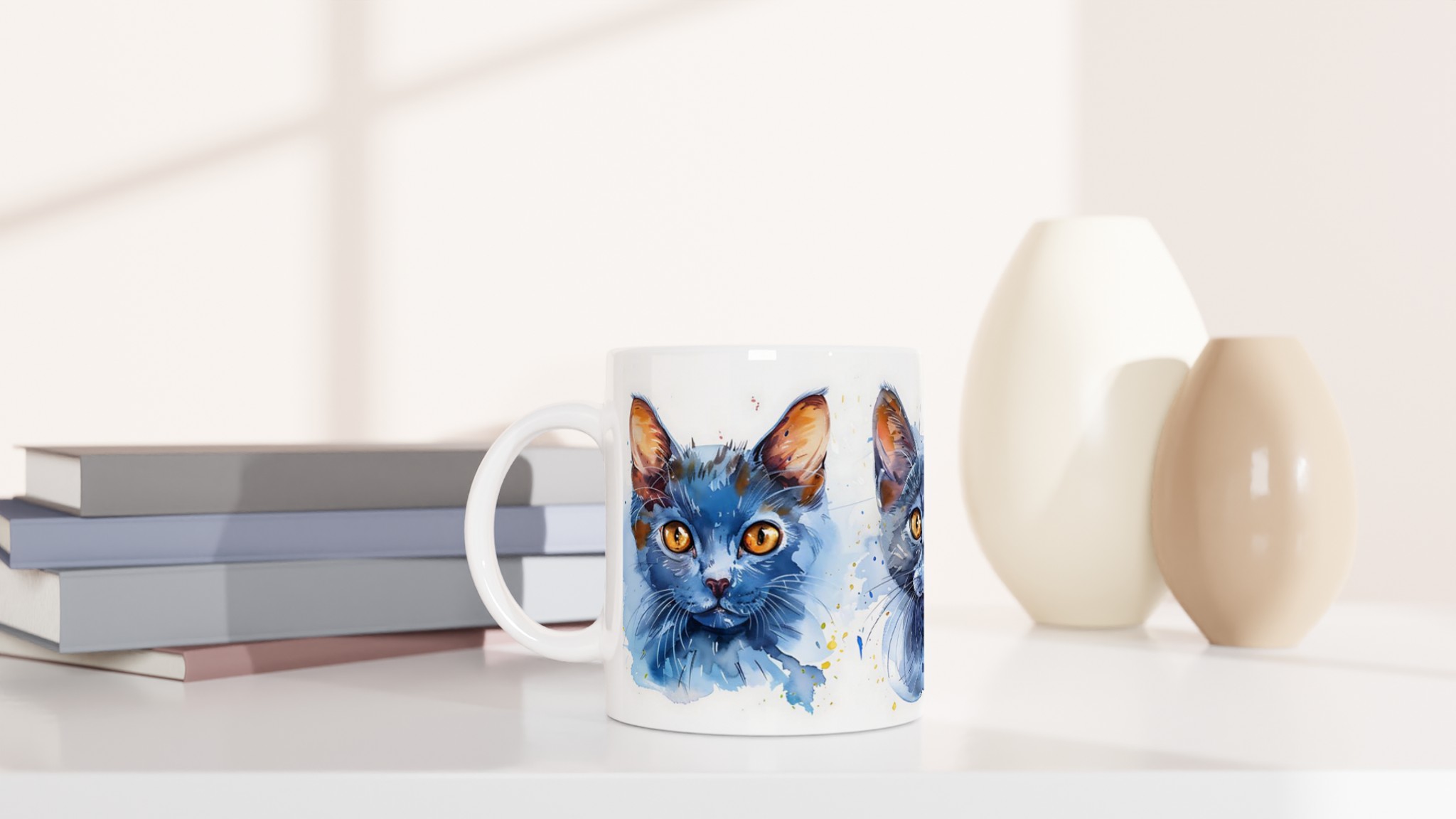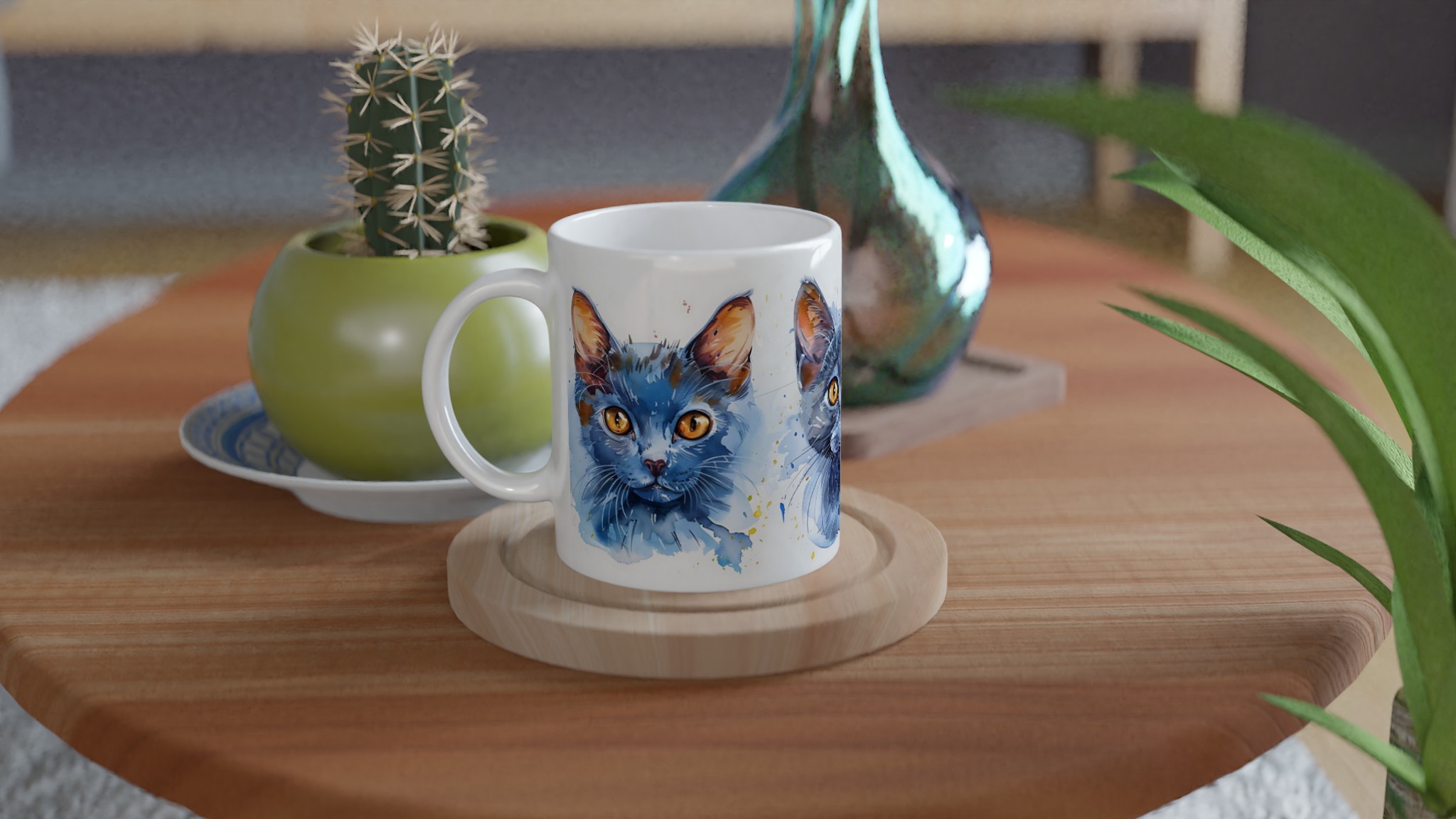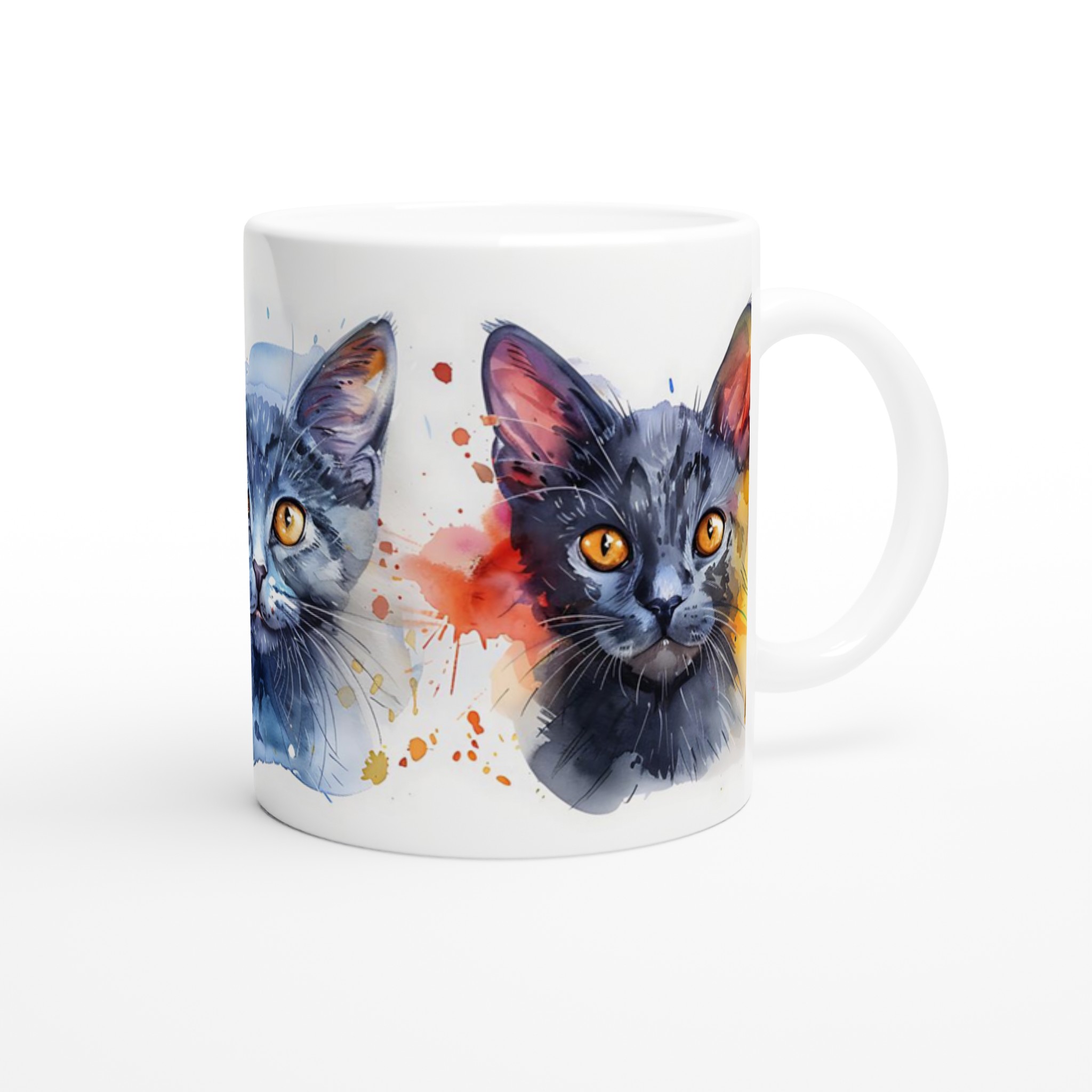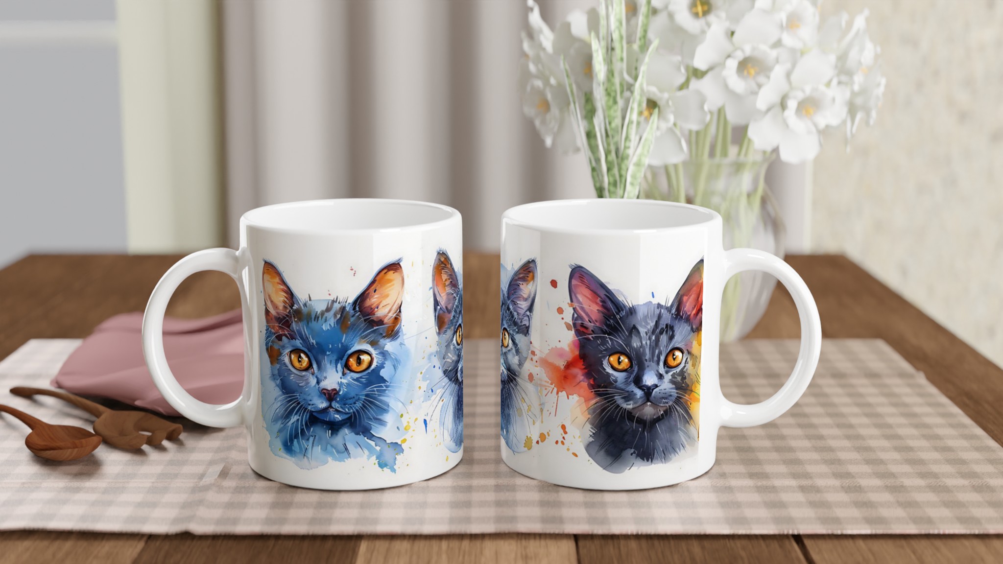 Lyft din fikapaus med denna charmiga keramiska mugg, prydd med livfulla akvarellporträtt av bedårande katter. Varje mugg fångar den unika personligheten hos dessa älskade djur, med en explosion av färgstänk som ger en konstnärlig touch. Perfekt för morgonkaffet, kvällens varma choklad eller när du bara vill njuta av en kopp te. Den blanka vita ytan gör att trycken framhävs med klara och levande färger, som håller sig fina även efter många turer i mikron och diskmaskinen.