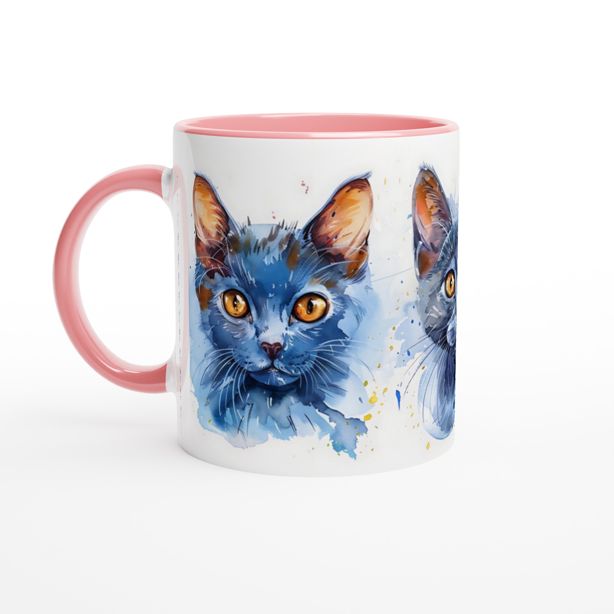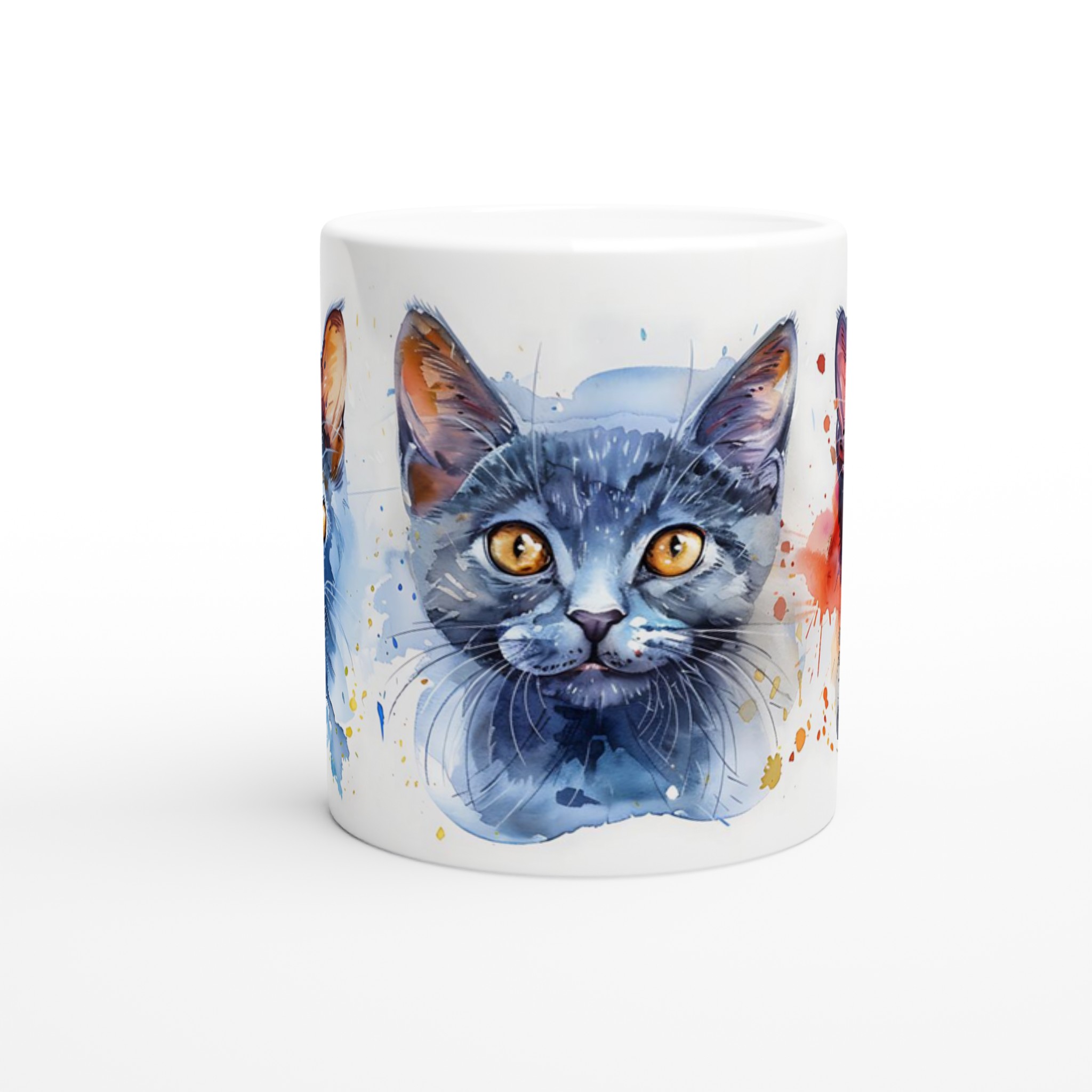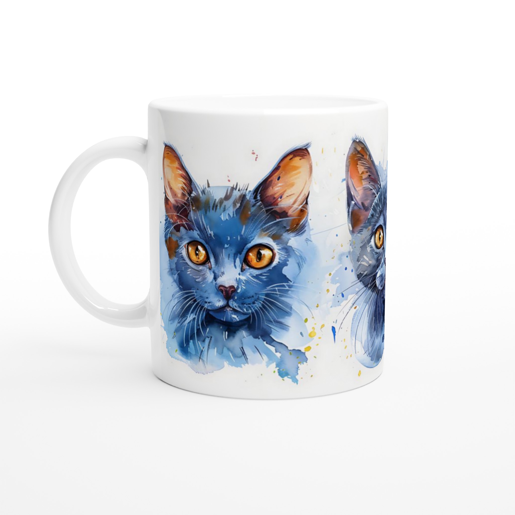 Lyft din fikapaus med denna charmiga keramiska mugg, prydd med livfulla akvarellporträtt av bedårande katter. Varje mugg fångar den unika personligheten hos dessa älskade djur, med en explosion av färgstänk som ger en konstnärlig touch. Perfekt för morgonkaffet, kvällens varma choklad eller när du bara vill njuta av en kopp te. Den blanka vita ytan gör att trycken framhävs med klara och levande färger, som håller sig fina även efter många turer i mikron och diskmaskinen.