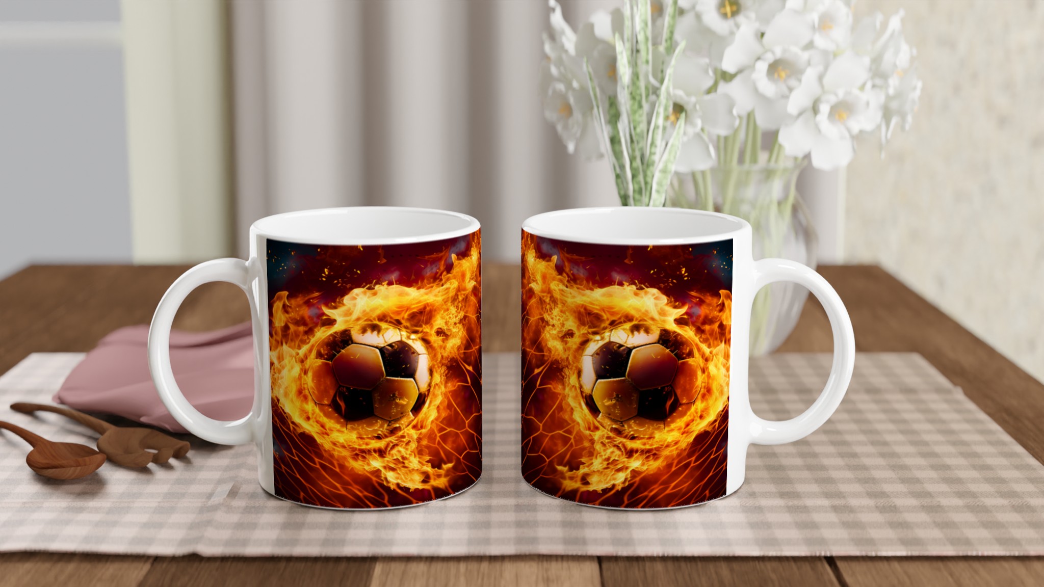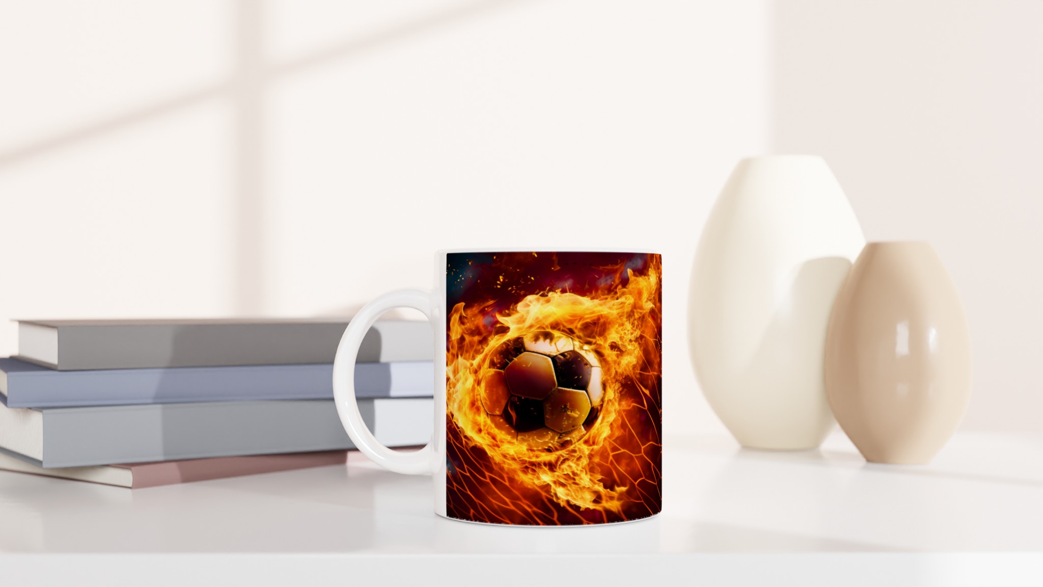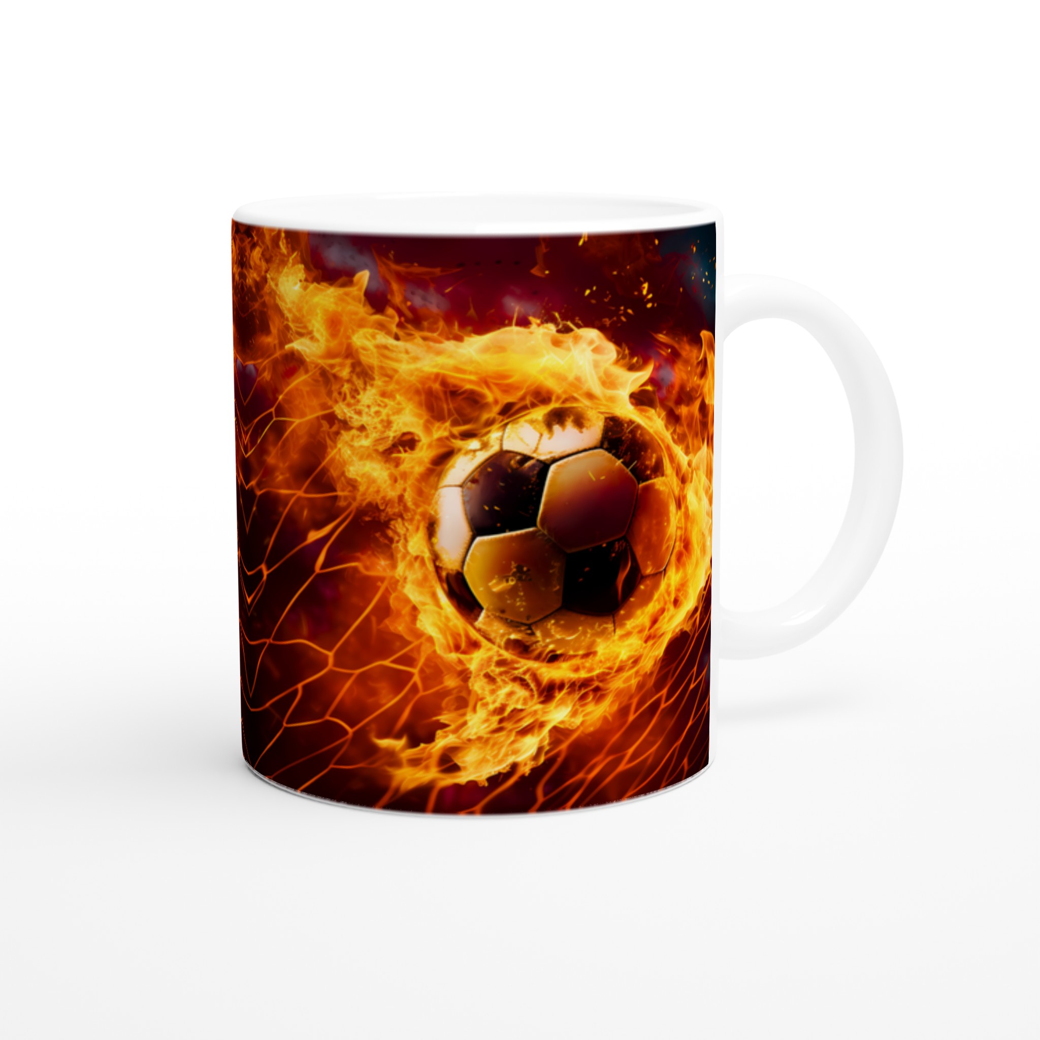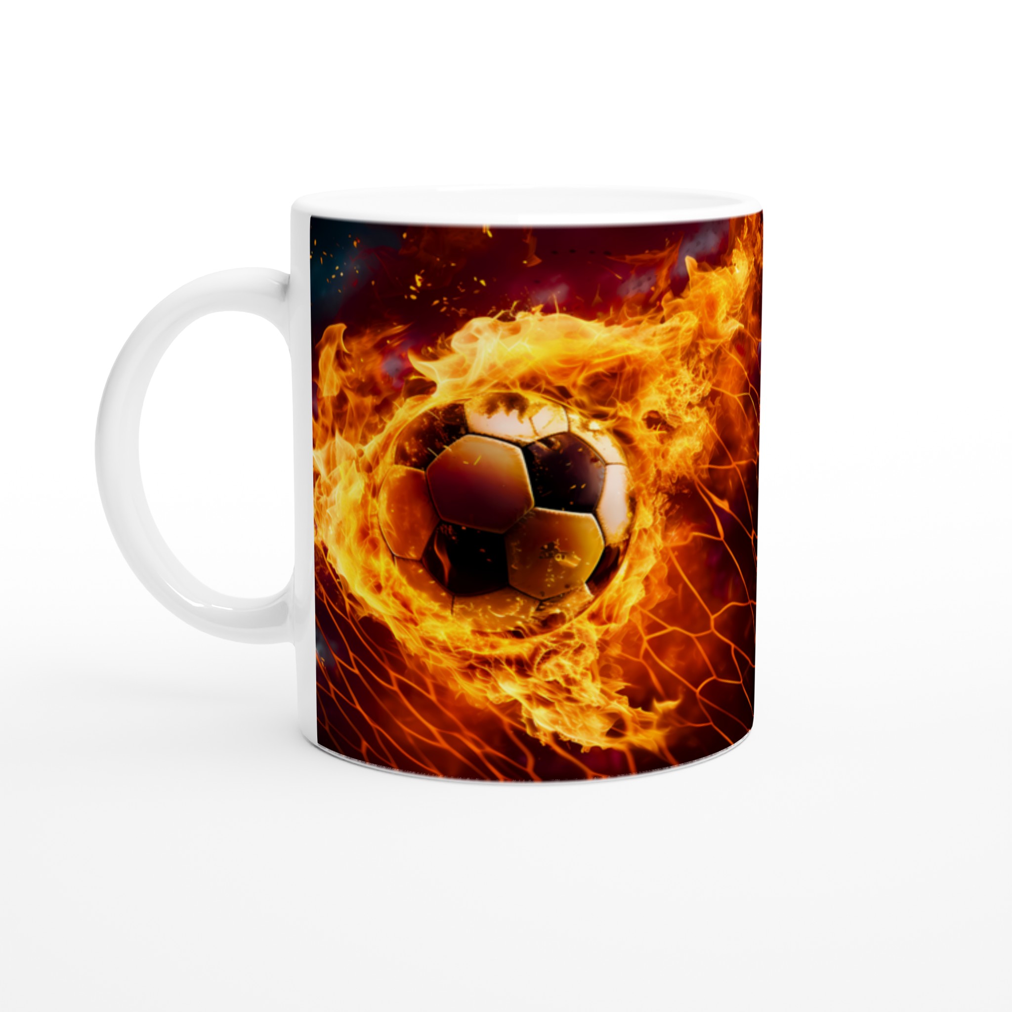 Tänd passionen för sport med vår keramiska mugg med fotboll i eld och lågor! Den här stilrena muggen blir snabbt en vardagsfavorit, perfekt för morgonkaffet, kvällens varma choklad eller när du bara vill njuta av en kopp te. Med sitt dynamiska motiv av en fotboll omsluten av flammande eld, fångar den spänningen och energin från spelet. Den blanka ytan framhäver trycket med klara och levande färger, som håller sig fina även efter många turer i mikron och diskmaskinen.