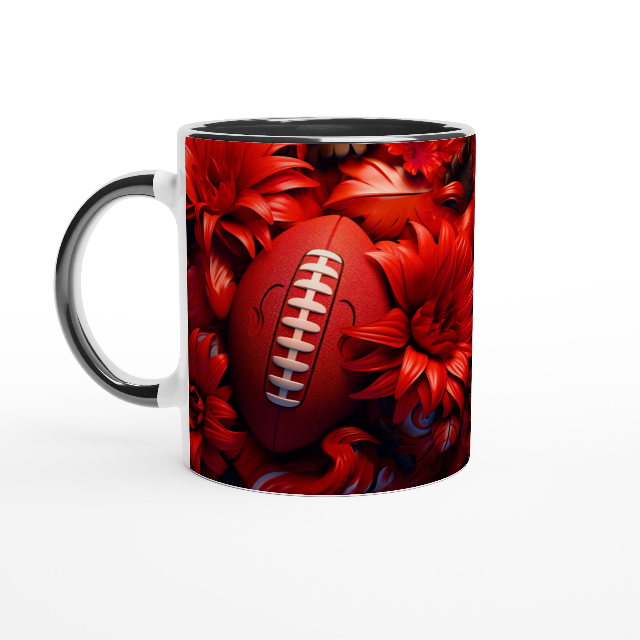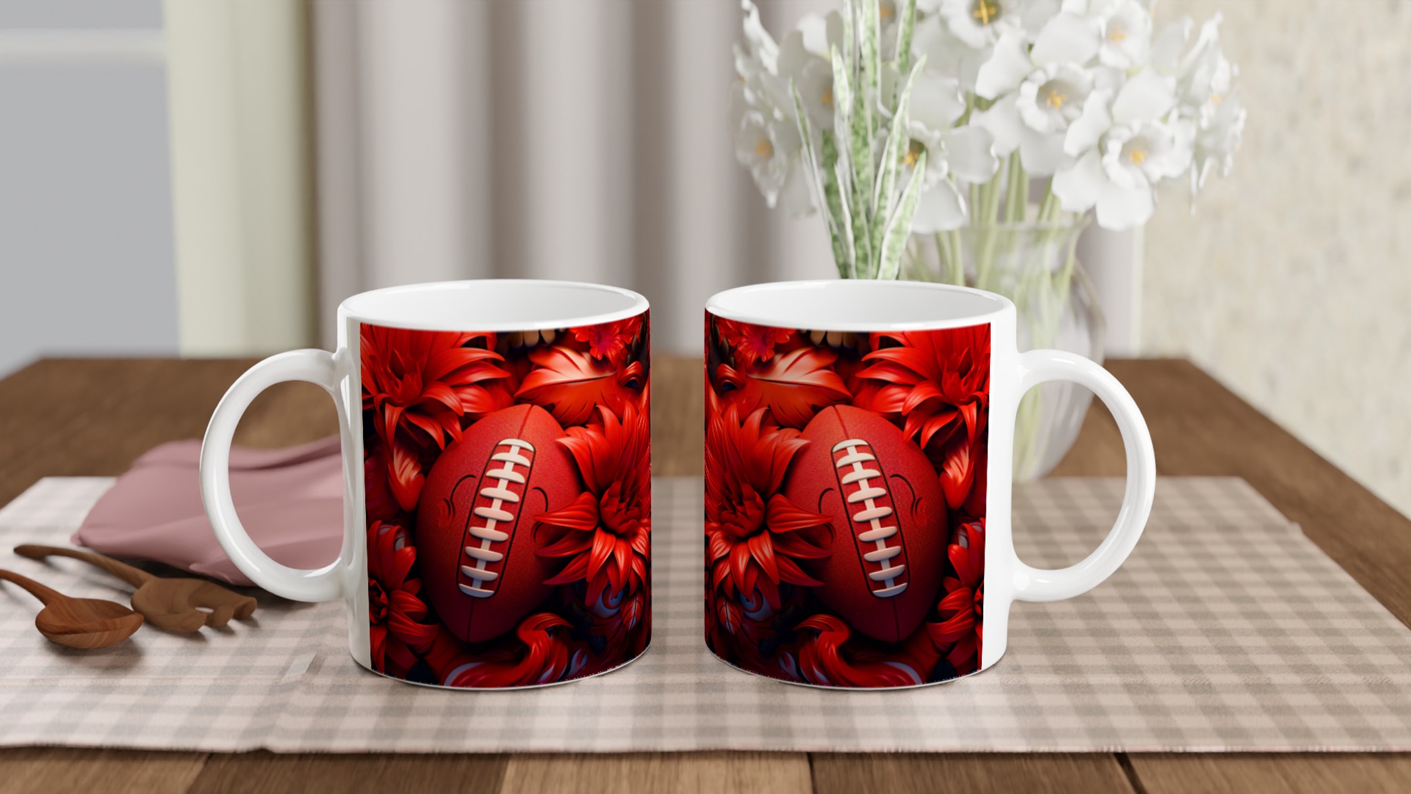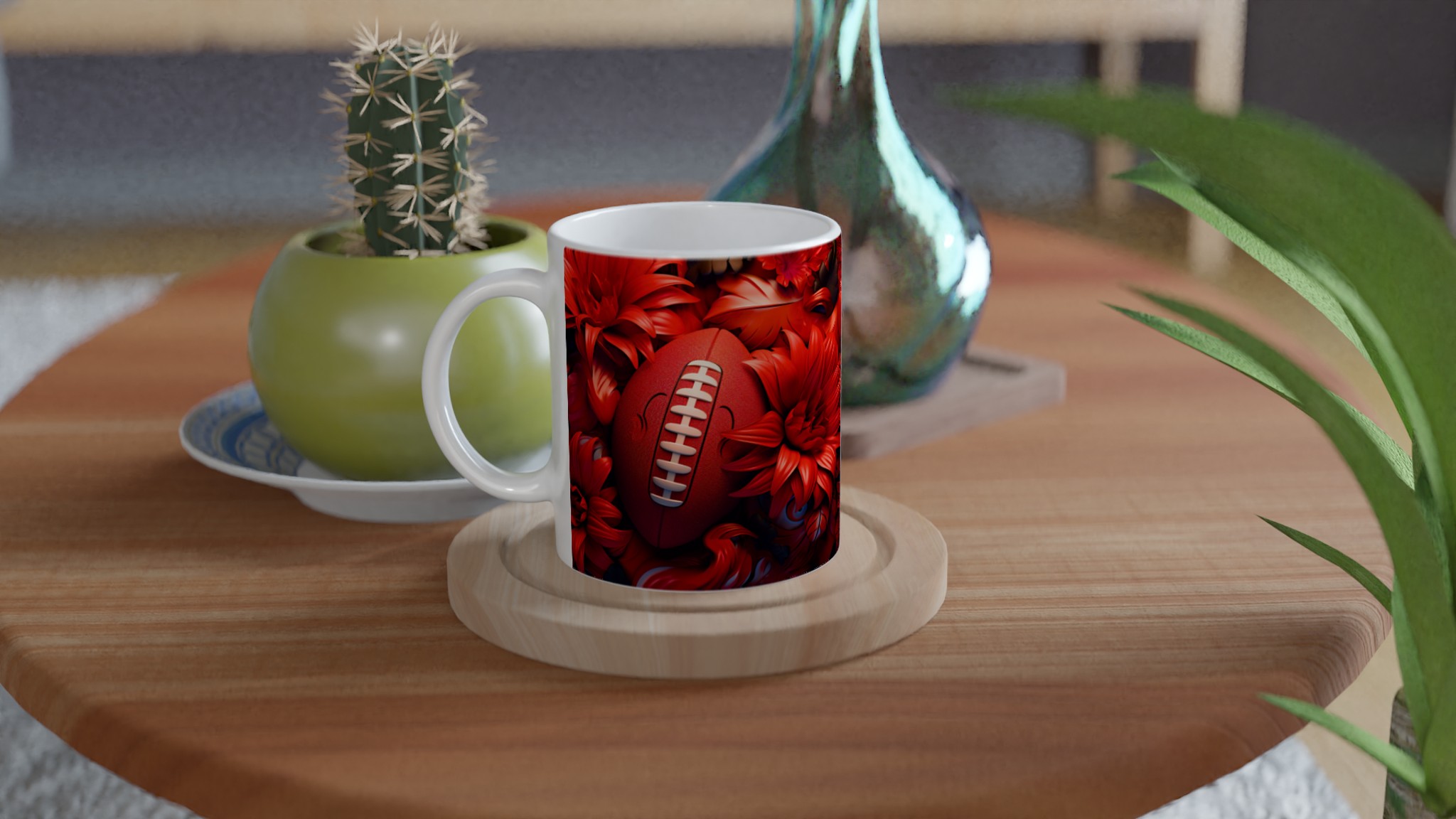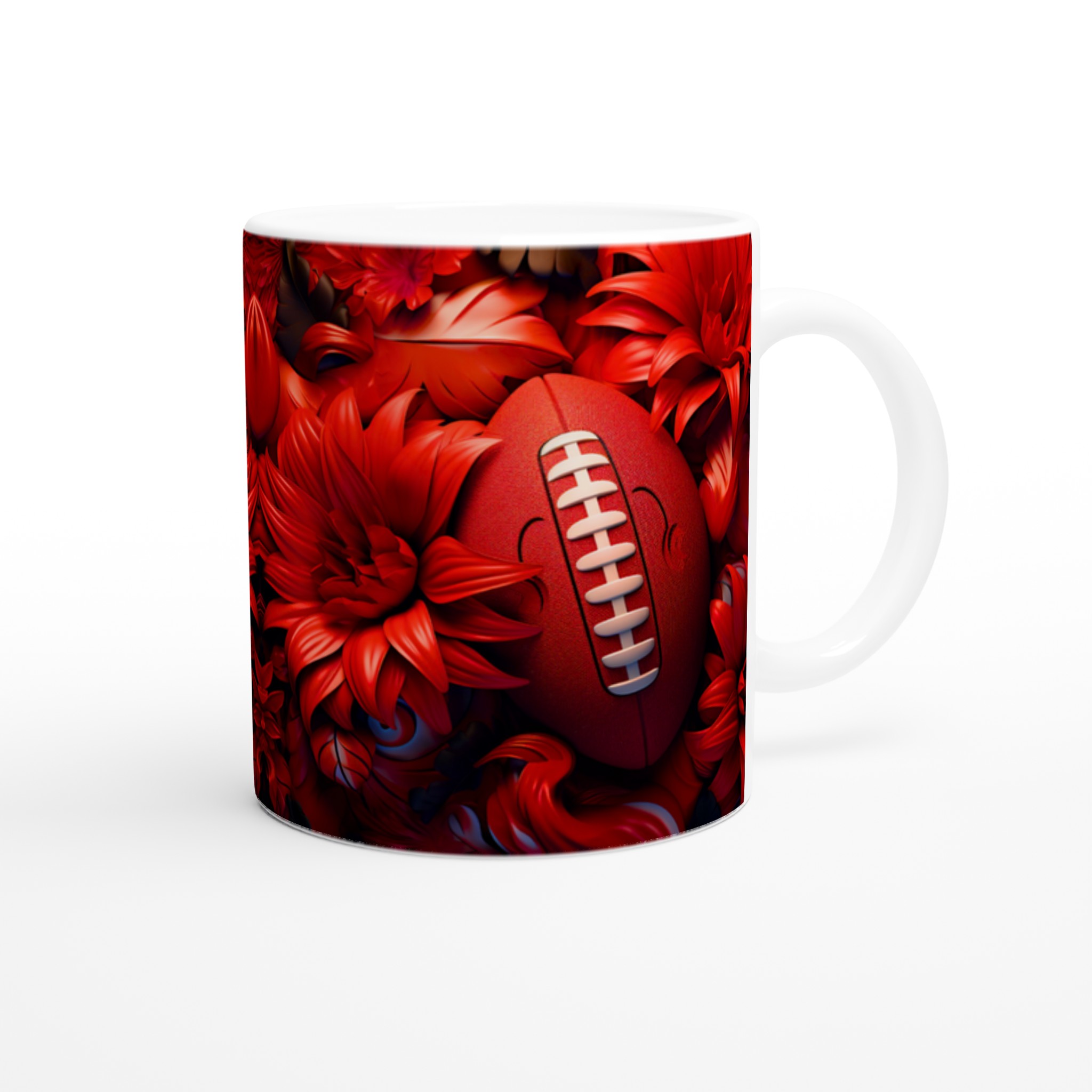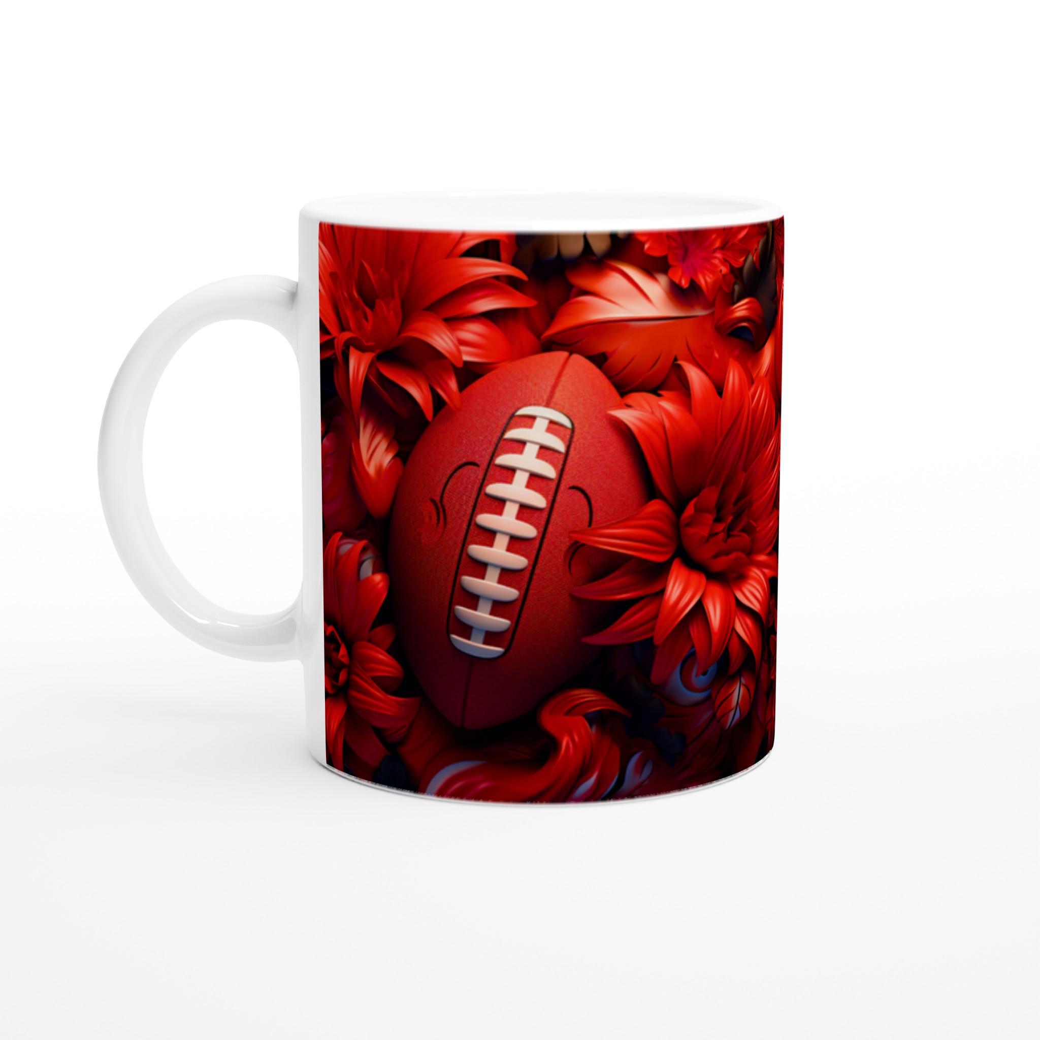 Fånga sportandan med en konstnärlig touch! Denna unika keramiska mugg förenar passionen för fotboll med naturens skönhet, inramad av en explosion av djupröda blommor. Den blir snabbt en vardagsfavorit, perfekt för morgonkaffet, kvällens varma choklad eller när du bara vill njuta av en kopp te. Den blanka vita ytan ser till att detta levande, sportiga motiv framhävs med klara och intensiva färger, som håller sig fina även efter många turer i mikron och diskmaskinen.