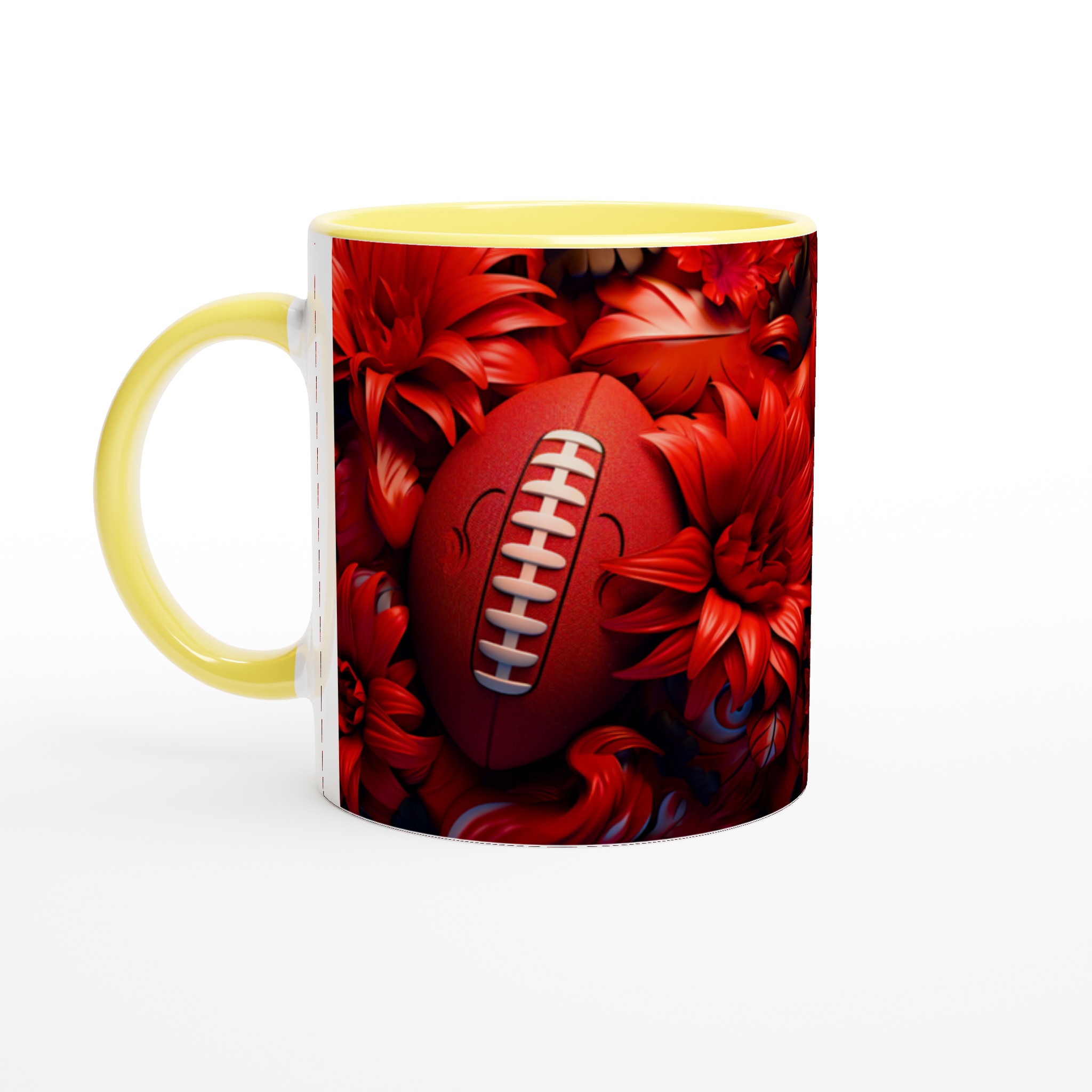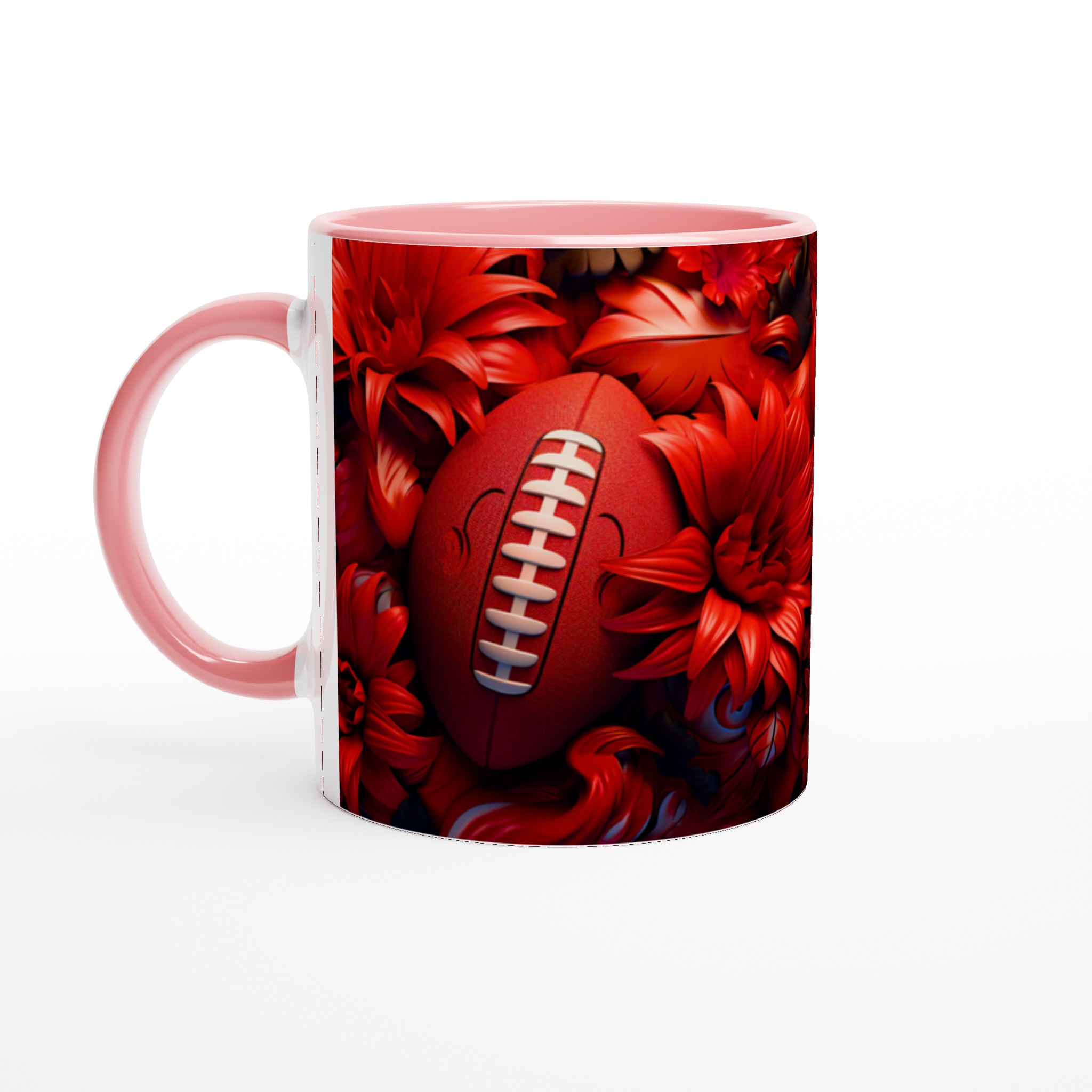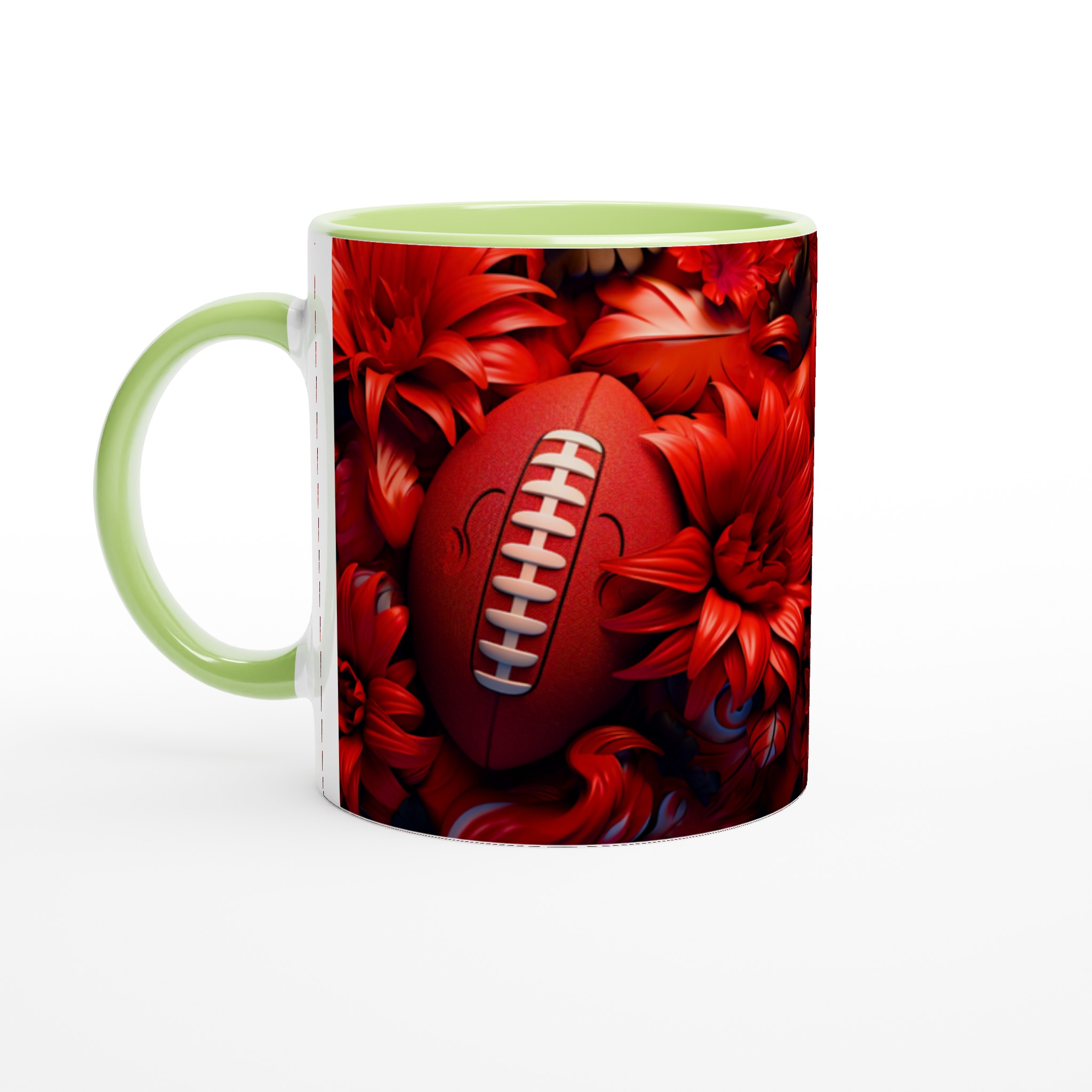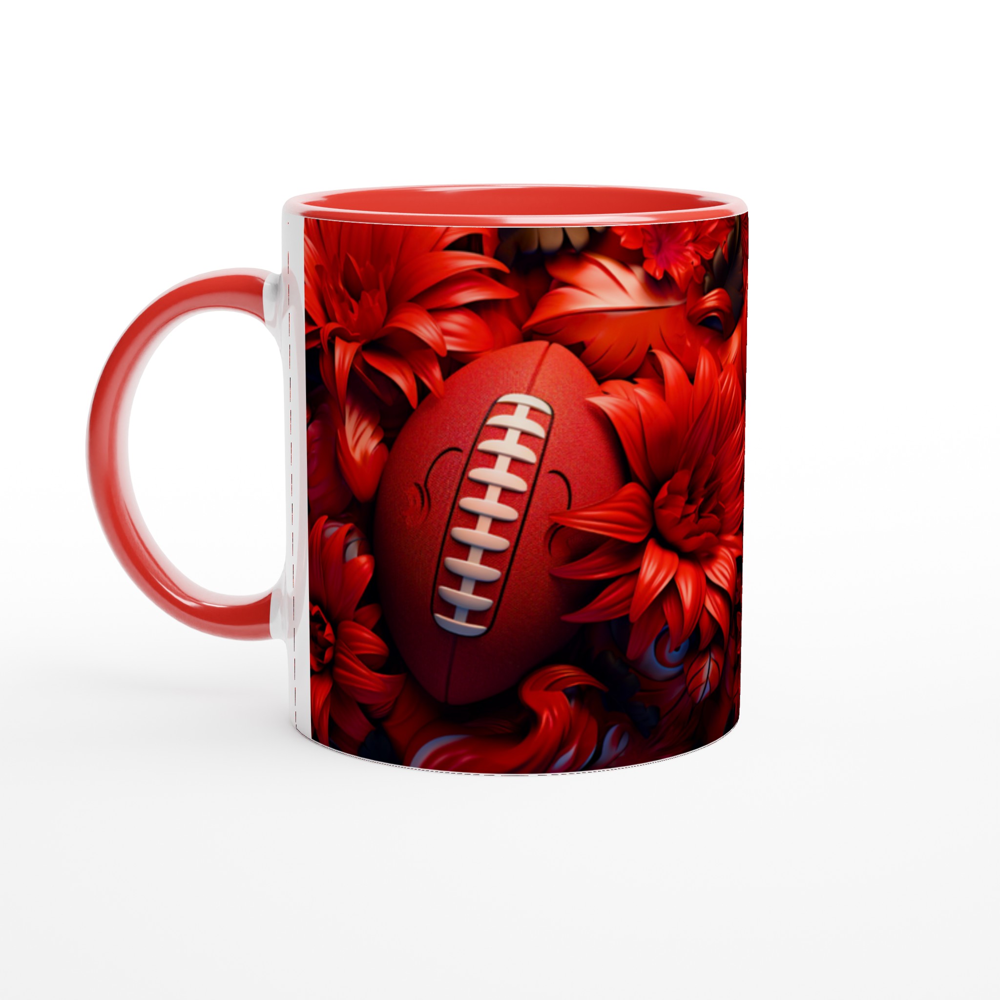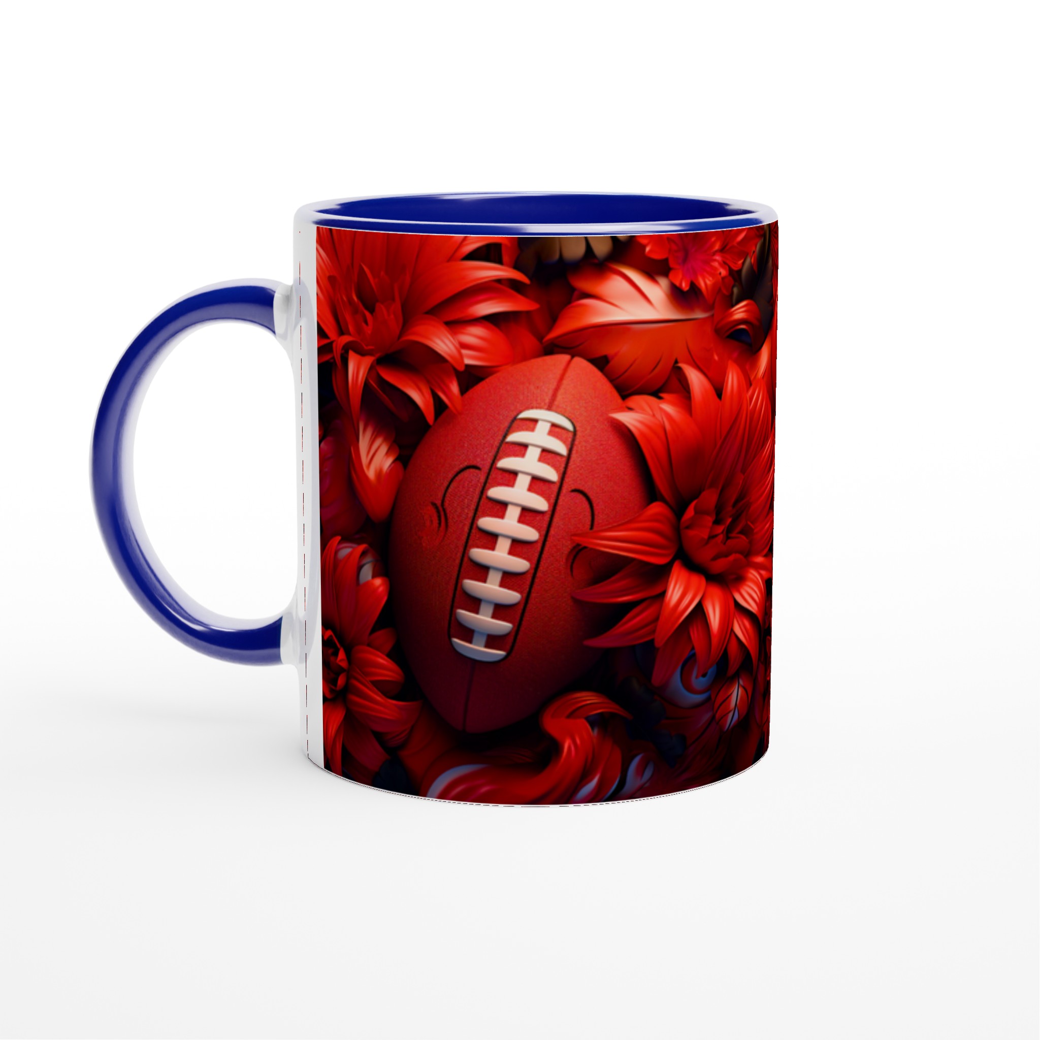 Fånga sportandan med en konstnärlig touch! Denna unika keramiska mugg förenar passionen för fotboll med naturens skönhet, inramad av en explosion av djupröda blommor. Den blir snabbt en vardagsfavorit, perfekt för morgonkaffet, kvällens varma choklad eller när du bara vill njuta av en kopp te. Den blanka vita ytan ser till att detta levande, sportiga motiv framhävs med klara och intensiva färger, som håller sig fina även efter många turer i mikron och diskmaskinen.