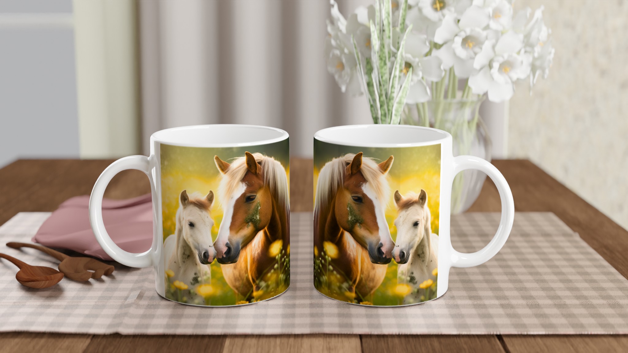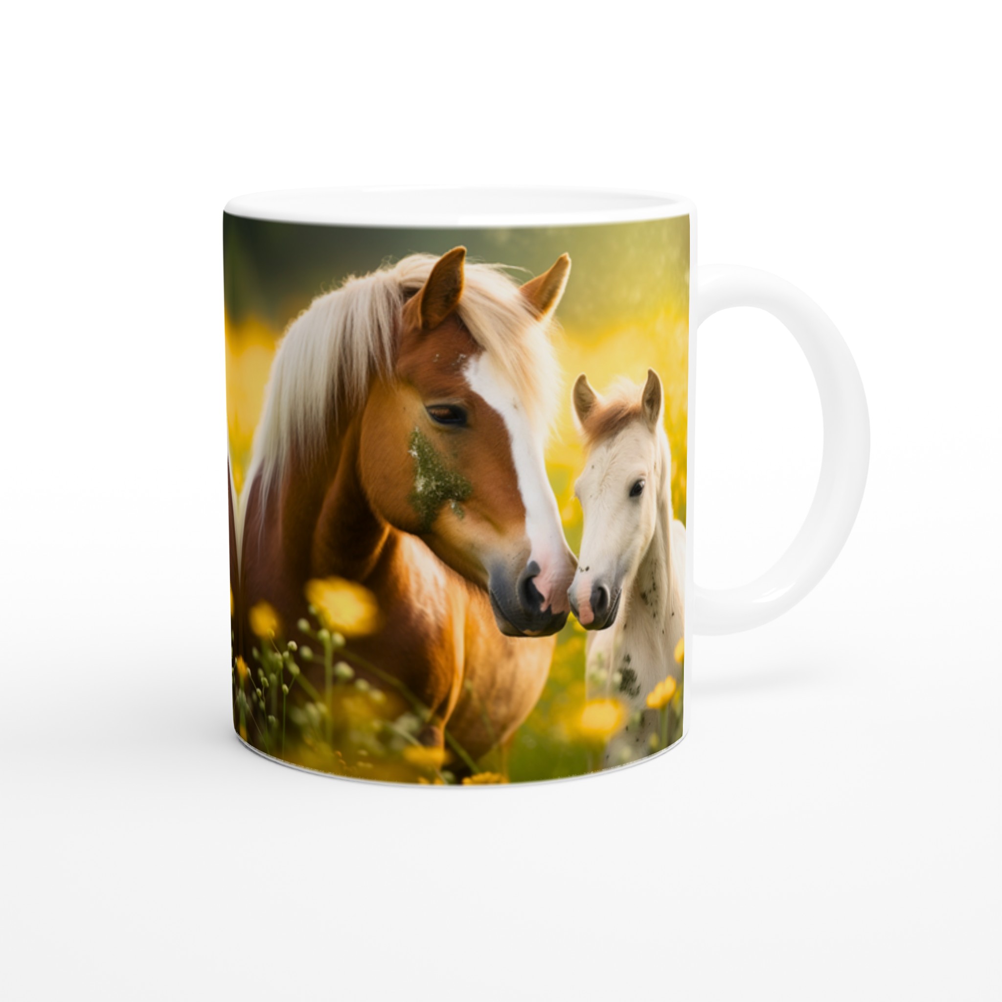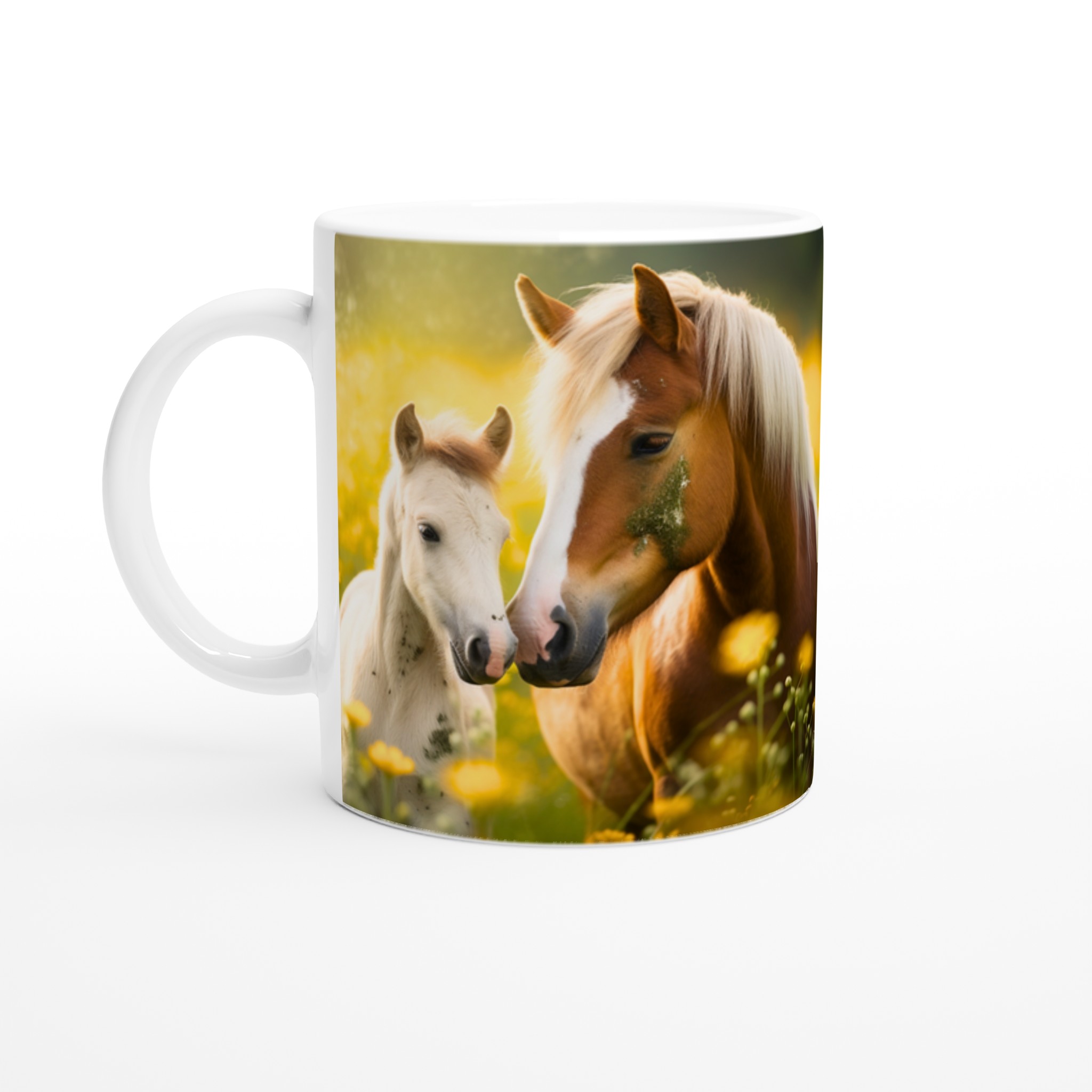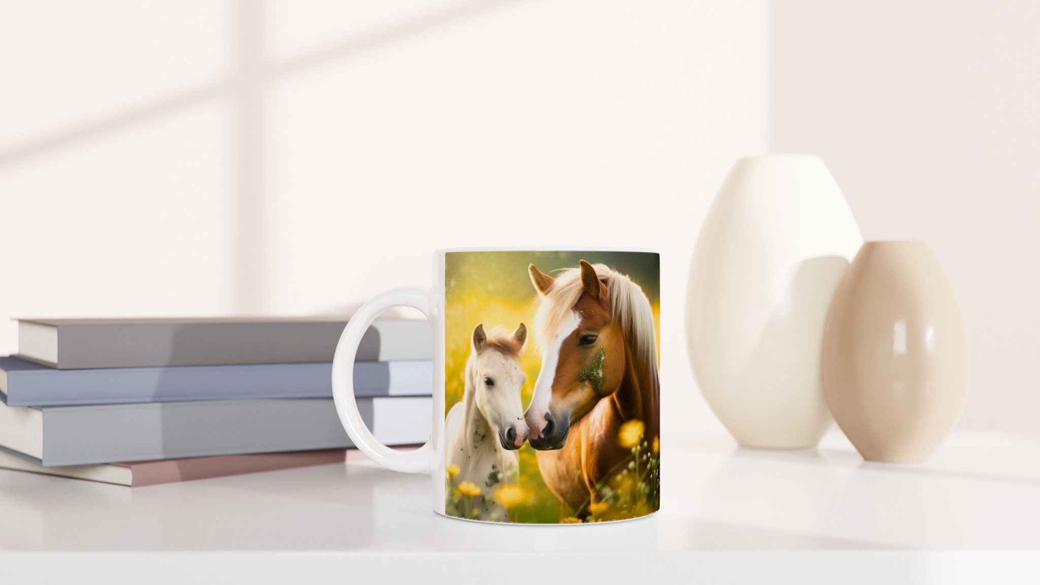 Föreställ dig att du sippar på din favoritdryck, omfamnad av lugnet från en gyllene äng där vackra hästar betar i solnedgången. Den här stilrena keramiska muggen, prydd med ett motiv som fångar ögonblickets magi, blir snabbt en vardagsfavorit. Perfekt för morgonkaffet, kvällens varma choklad eller när du bara vill njuta av en kopp te.