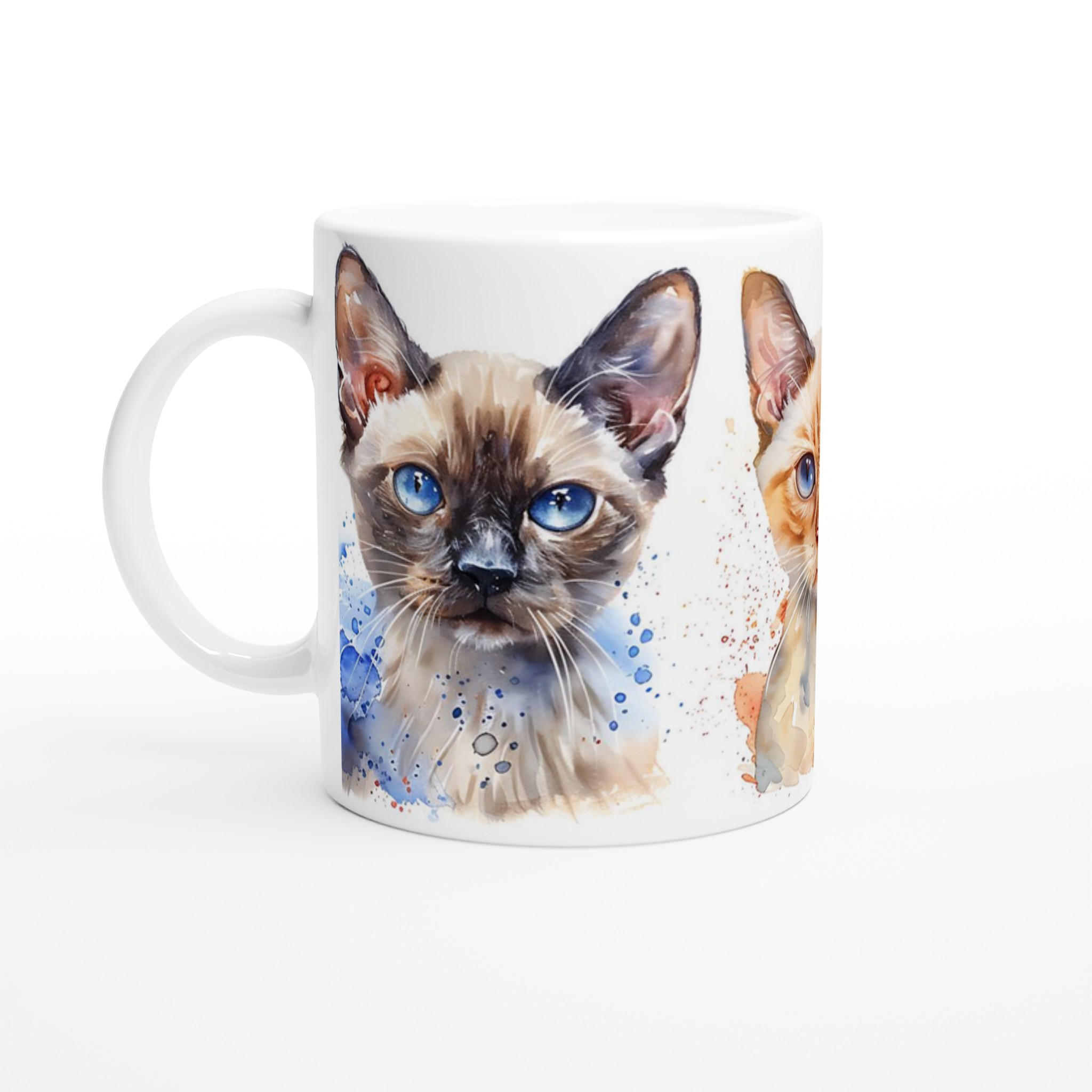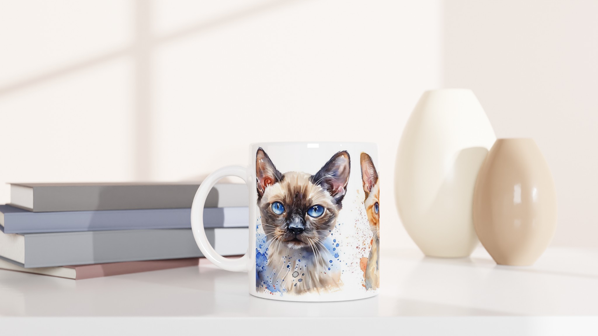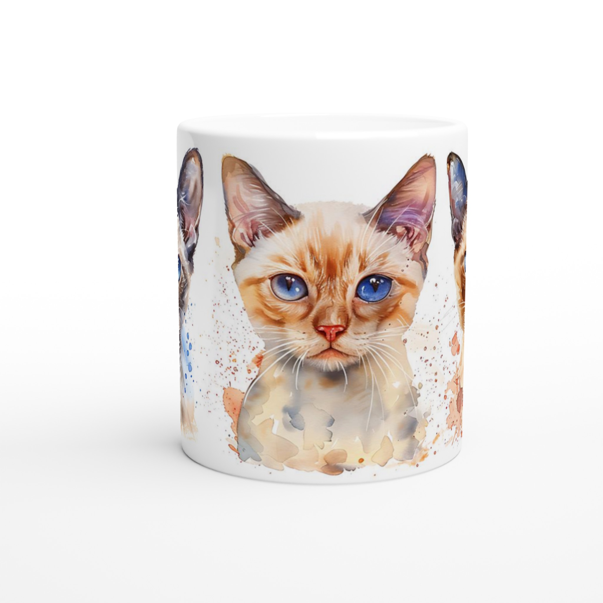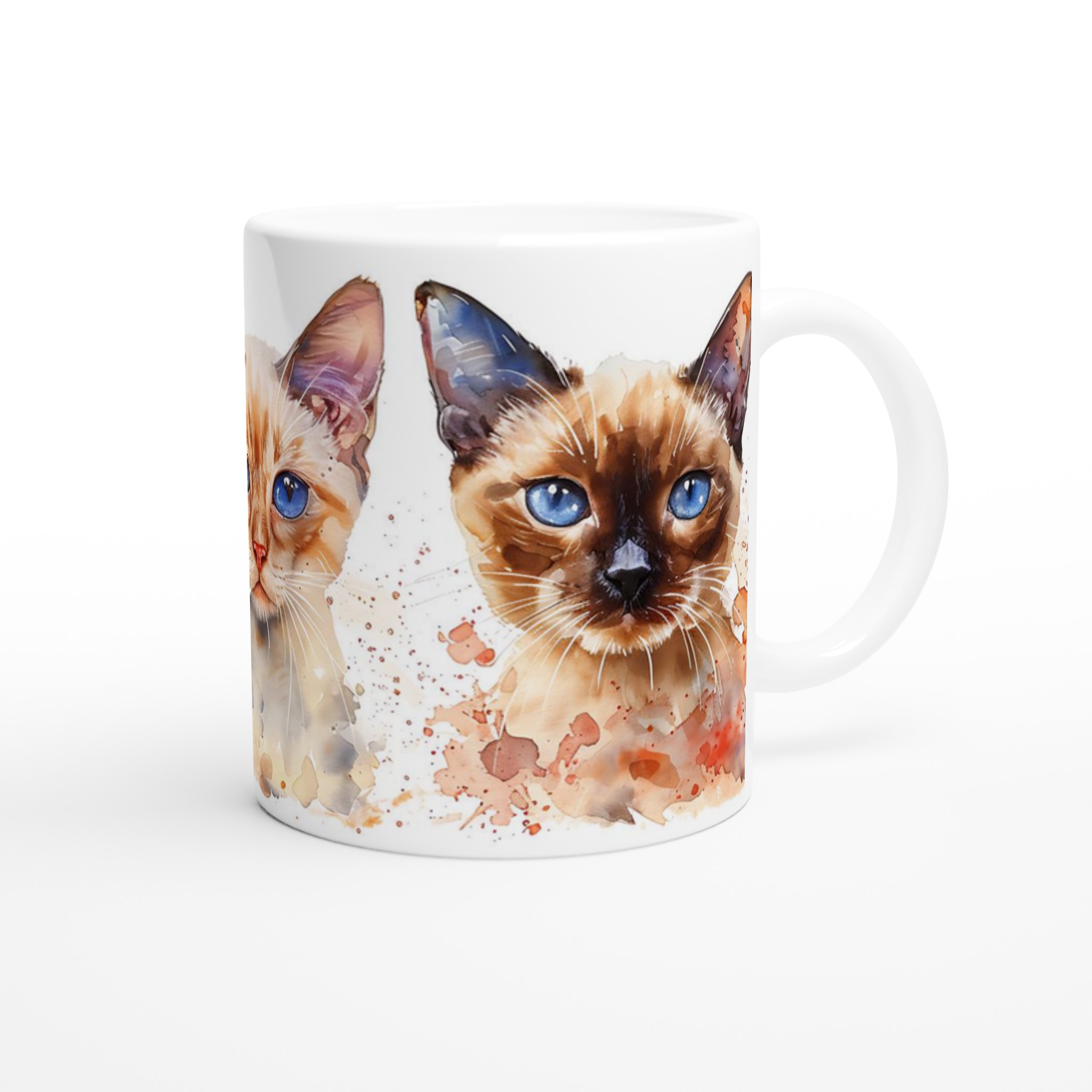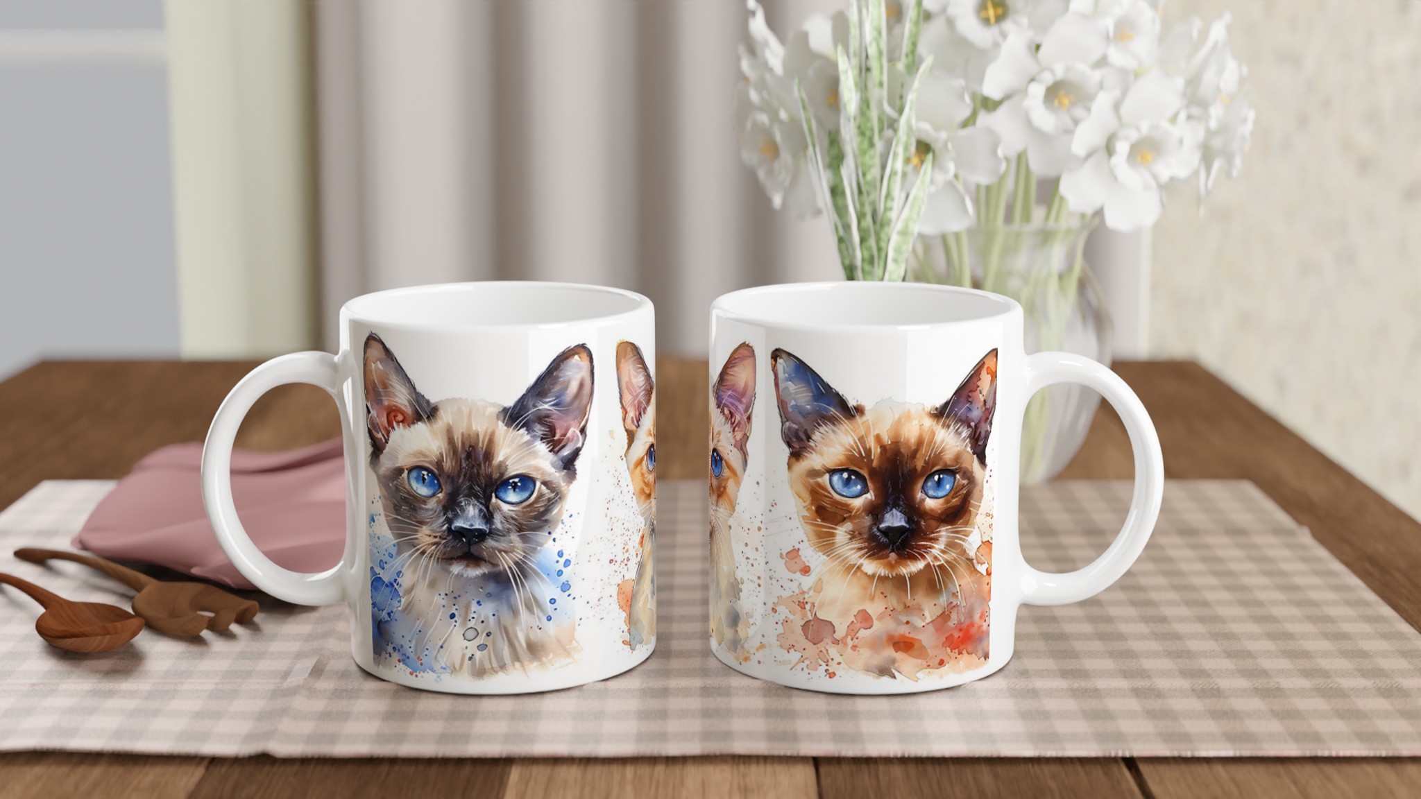 Förvandla din fikastund till en konstnärlig upplevelse med denna charmiga keramiska mugg, prydd med ett bedårande akvarellporträtt av en katt med intensivt blå ögon. Denna stilrena mugg blir snabbt en vardagsfavorit. Perfekt för morgonkaffet, kvällens varma choklad eller när du bara vill njuta av en kopp te. De levande akvarelldetaljerna och de fängslande kattansiktena framhävs vackert mot den blanka ytan och skapar en känsla av lugn och glädje.