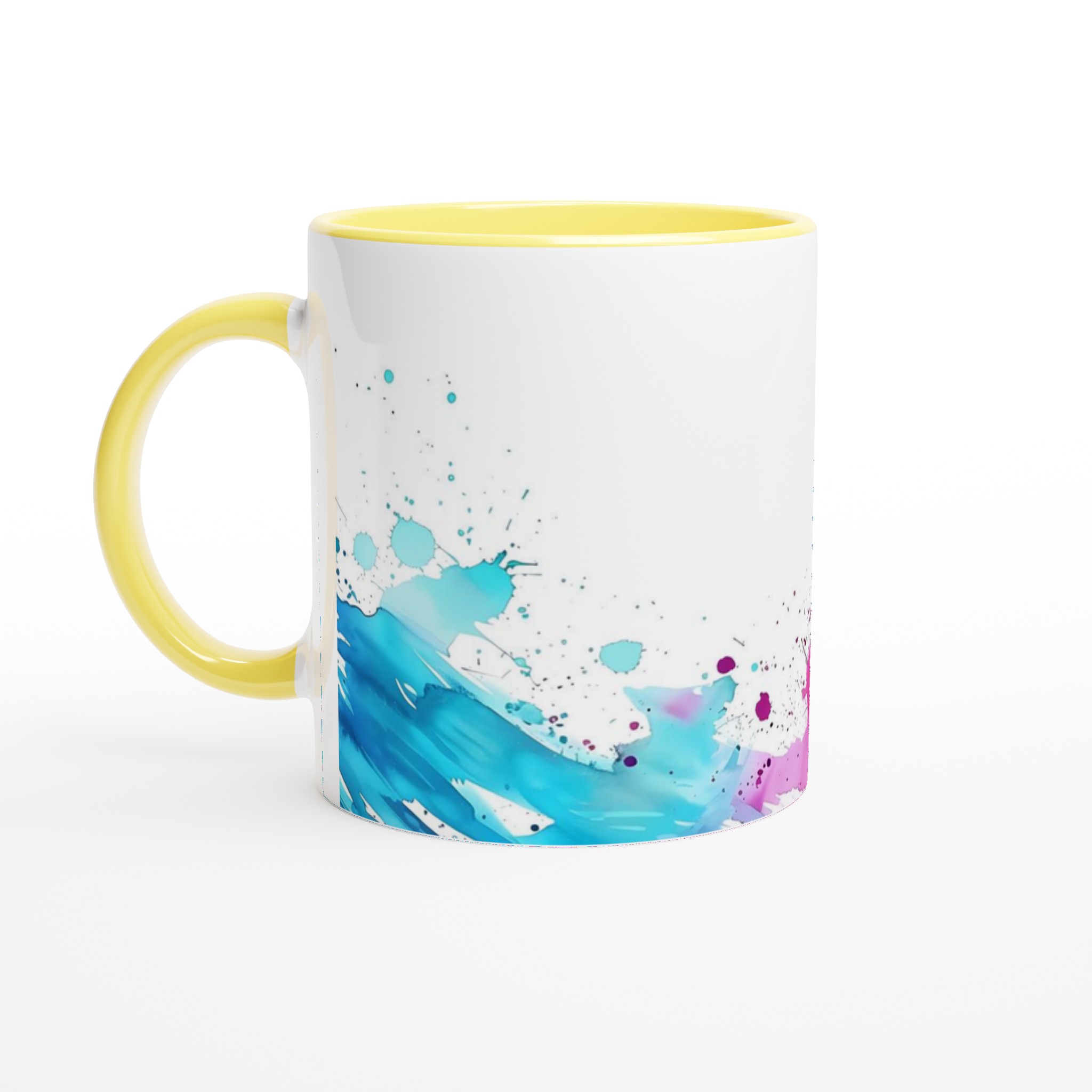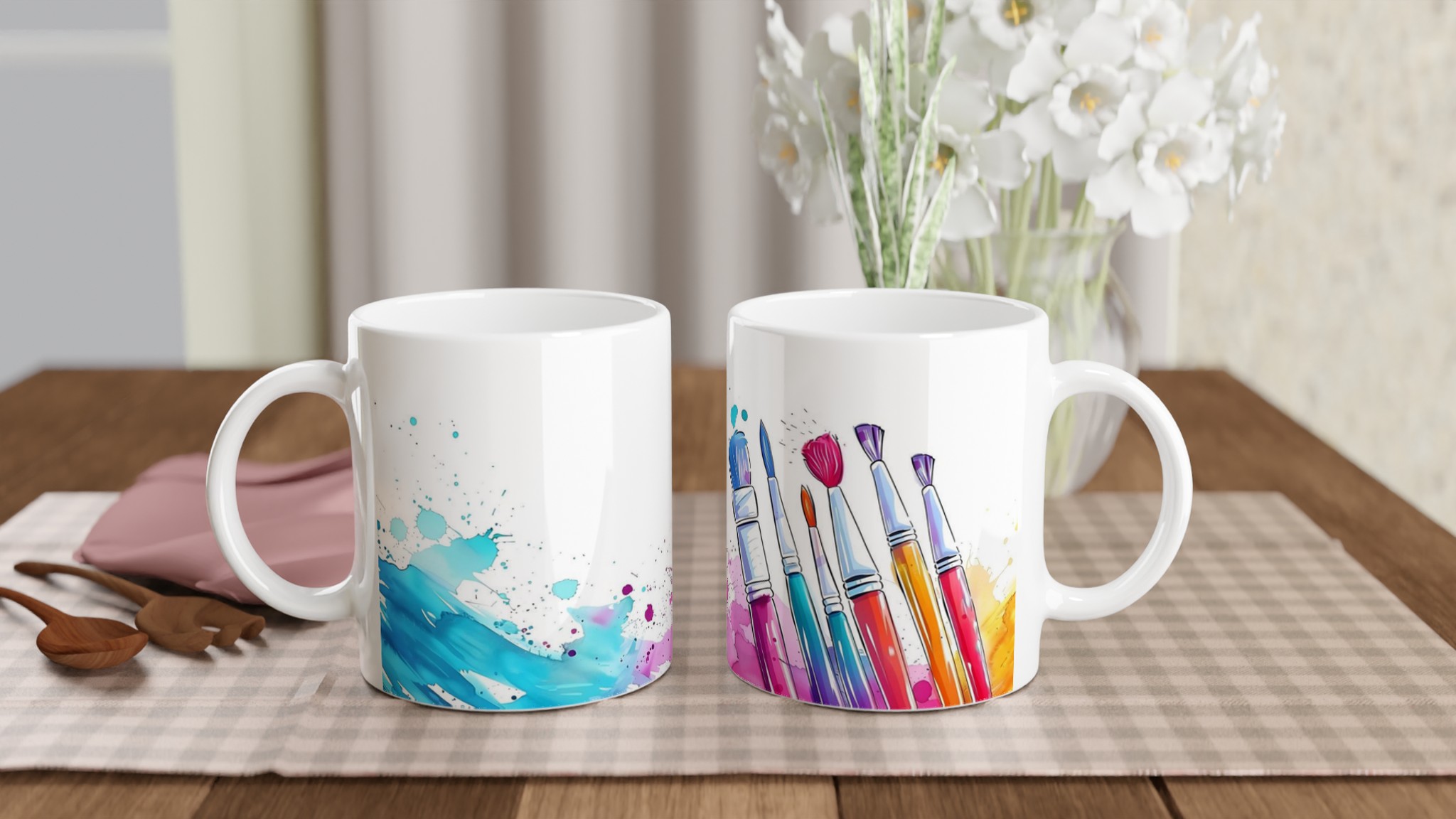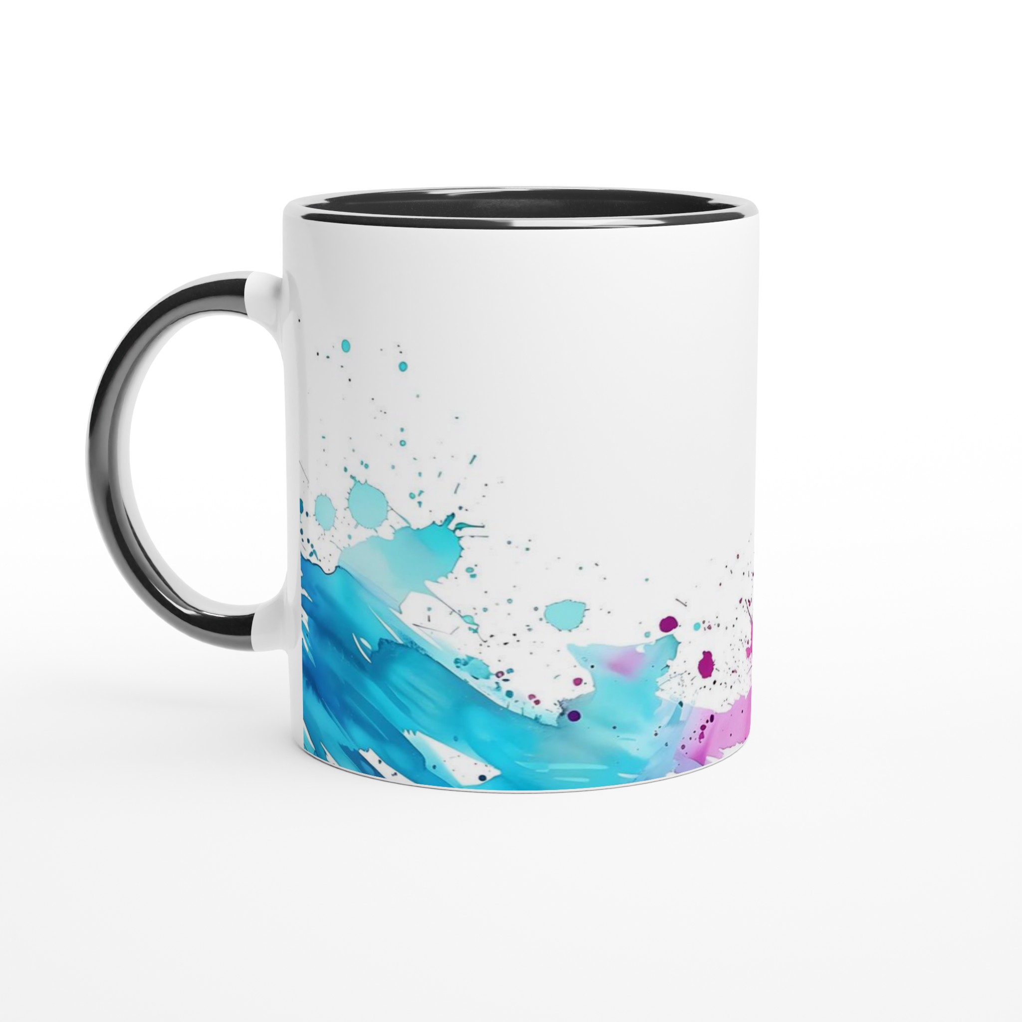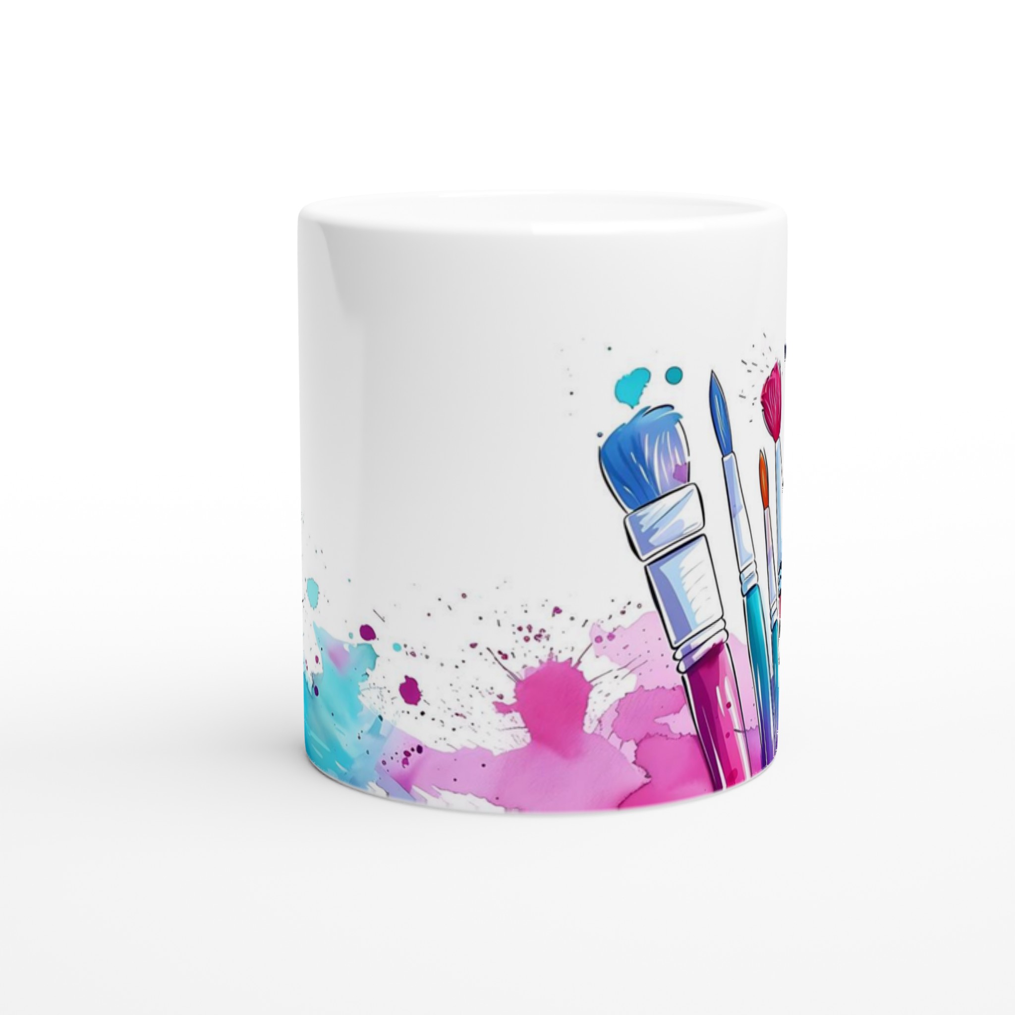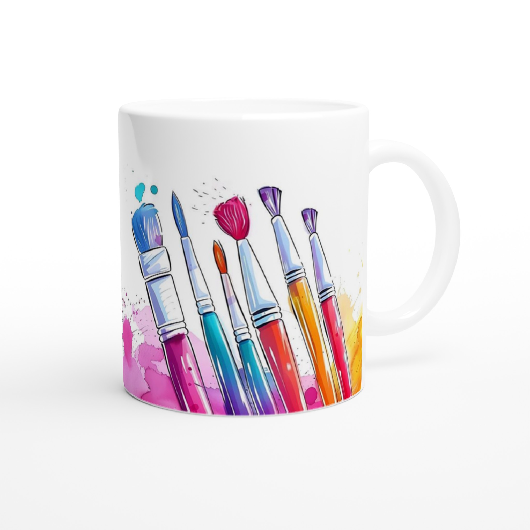 Låt din kreativa ådra flöda varje dag med denna inspirerande keramiska mugg. Dess design, med lekfulla penslar och akvarellstänk i livfulla färger som spänner från djupblått till energiskt gult, förvandlar varje paus till ett litet konstverk. Perfekt för morgonkaffet, kvällens varma choklad eller när du bara vill njuta av en kopp te och drömma dig bort till en värld av färg och form.