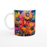 Lys upp din dag med vår unika keramiska mugg, prydd med ett fantastiskt akvarellmotiv av vibrerande solrosor. Denna konstnärliga design, med sina djärva rosa, gula och orangea toner mot en mystisk turkos och djupblå bakgrund, förvandlar varje fikapaus till en stund av glädje och inspiration.