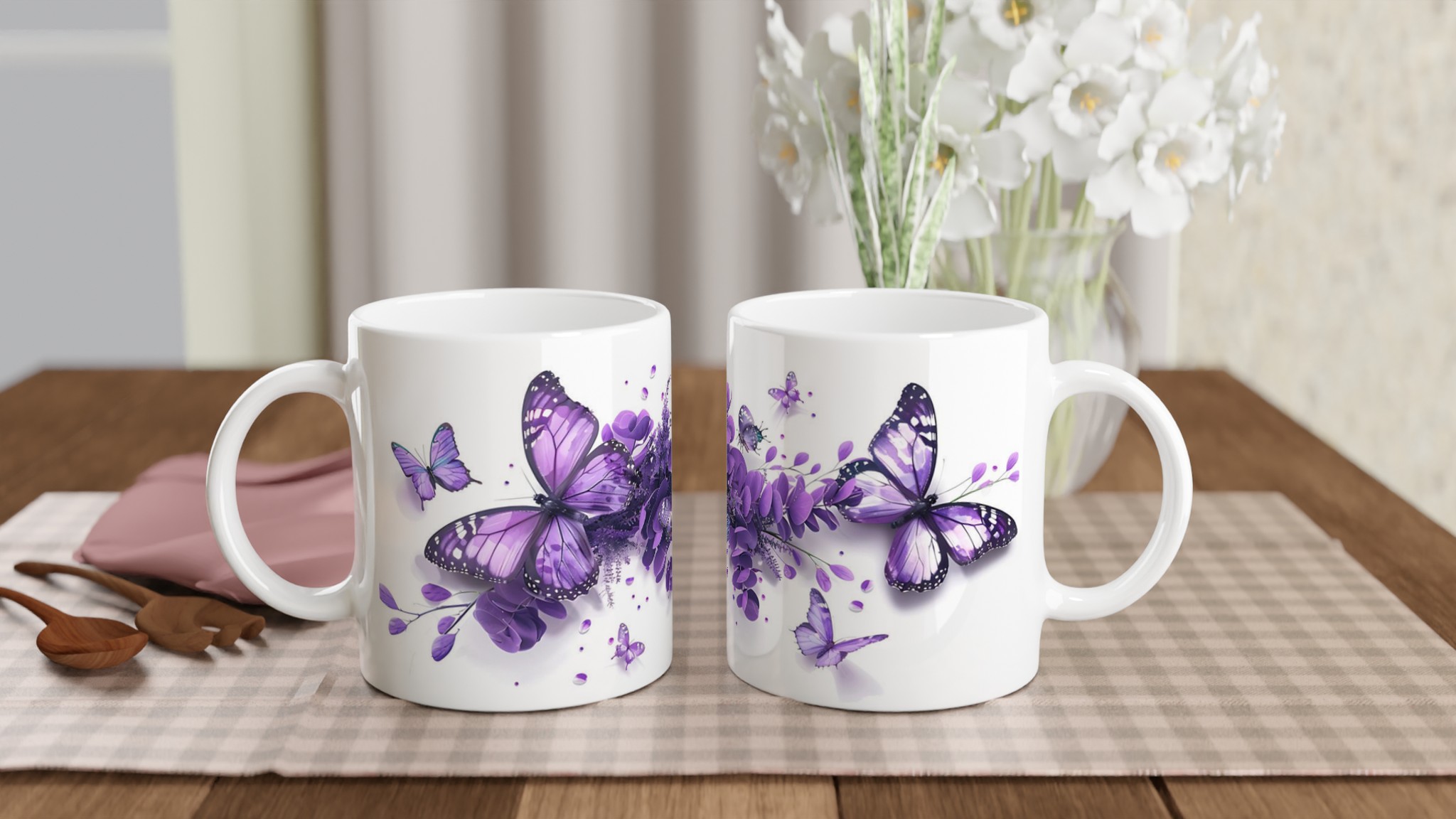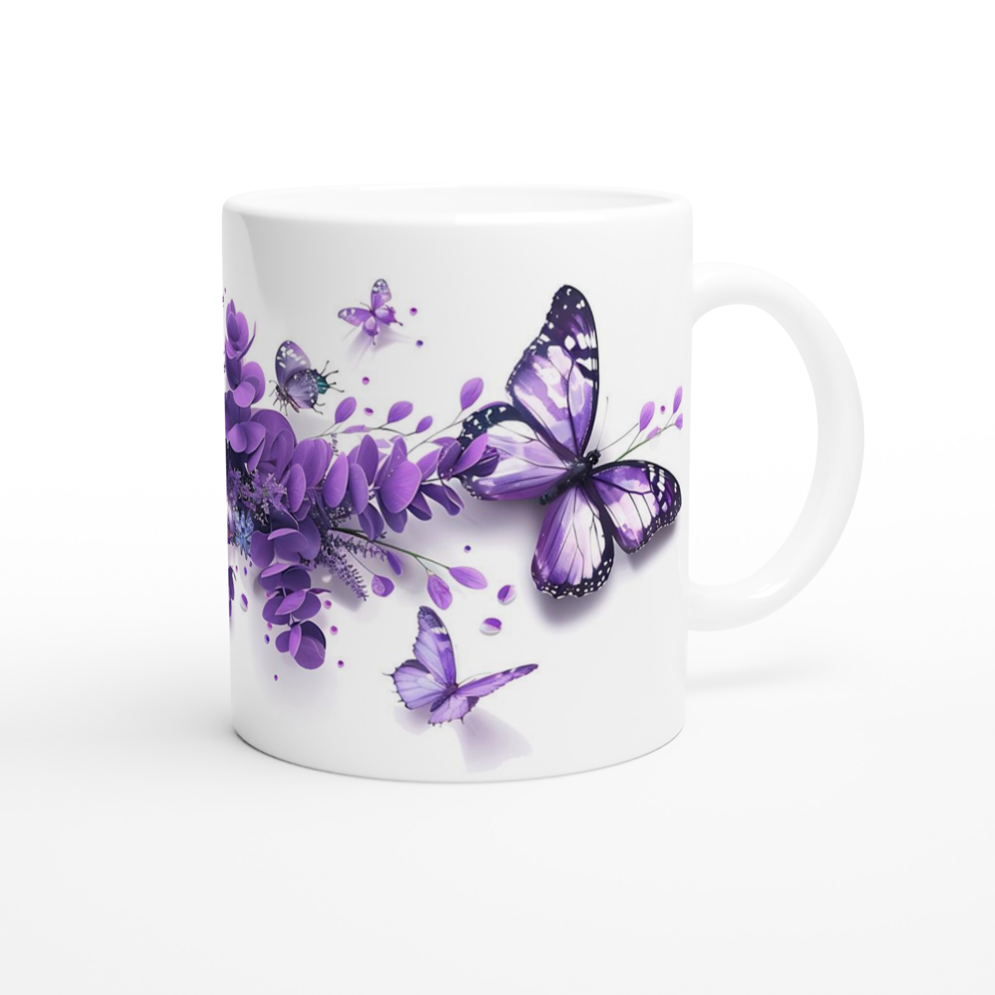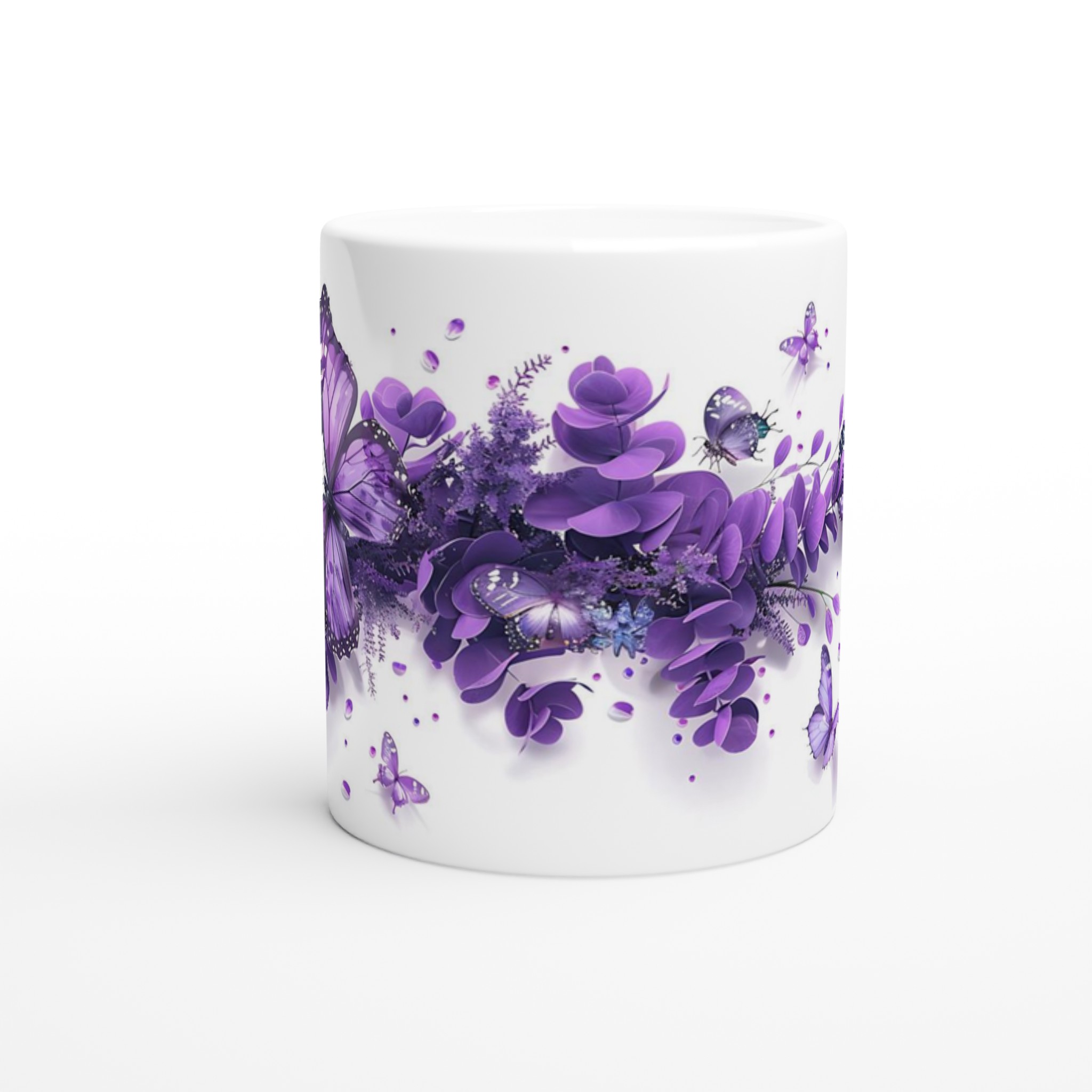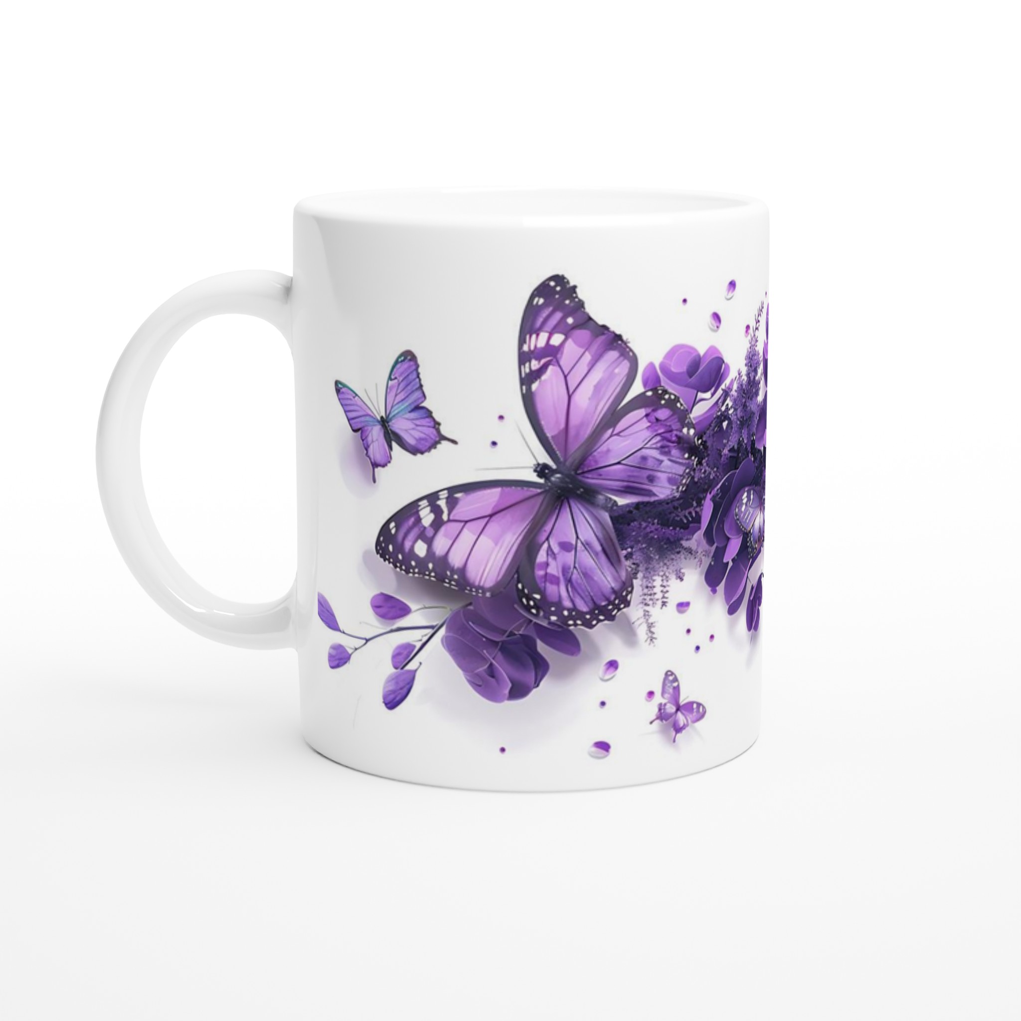 Låt dig förtrollas av denna underbara keramiska mugg, prydd med ett drömskt motiv av lila fjärilar och blomster – en verklig hyllning till naturens skönhet. Denna mugg blir snabbt en vardagsfavorit, perfekt för morgonkaffet, kvällens varma choklad eller när du bara vill njuta av en kopp te i lugn och ro. Den blanka ytan får trycken att framträda med klara och levande färger, som håller sig fina även efter många turer i mikron och diskmaskinen.