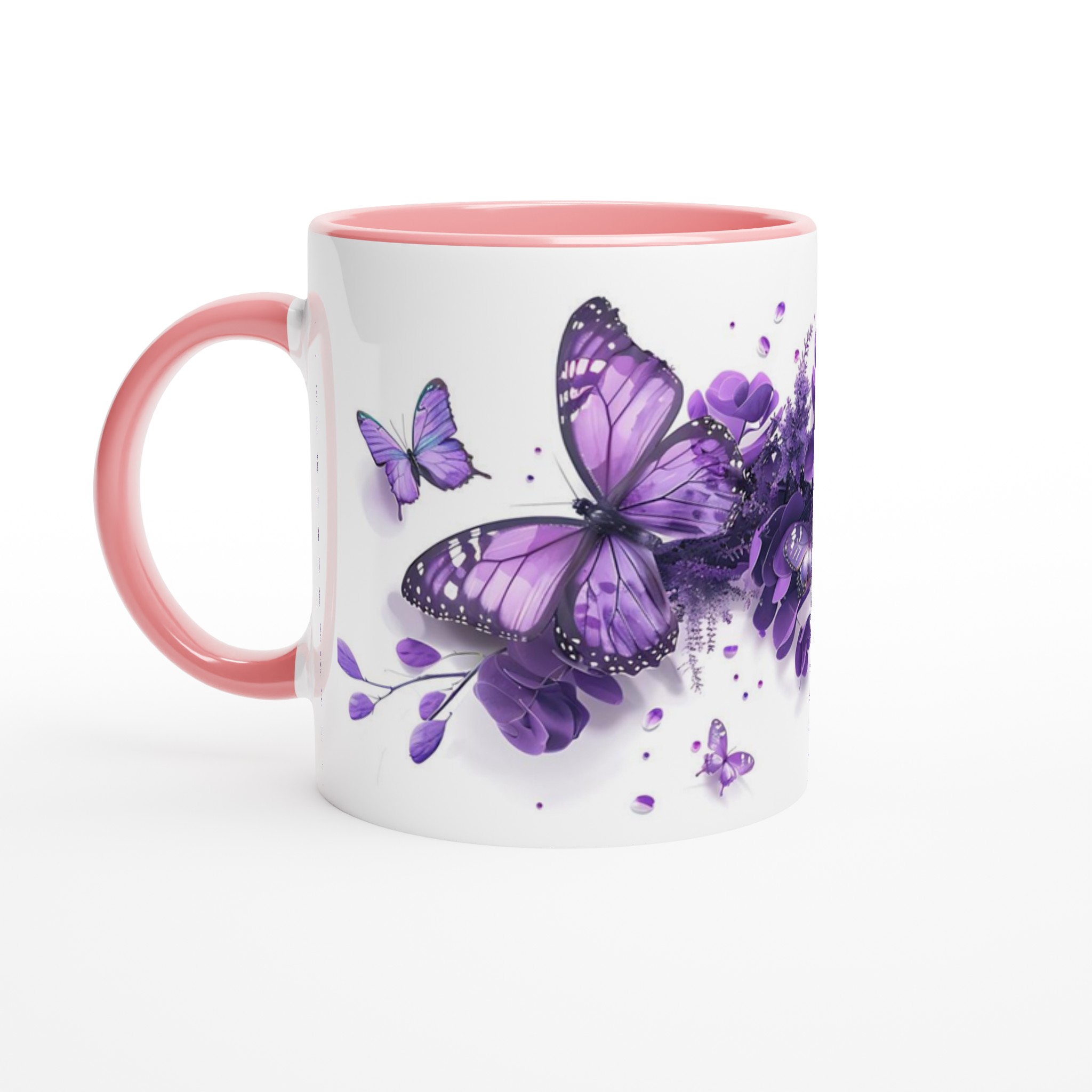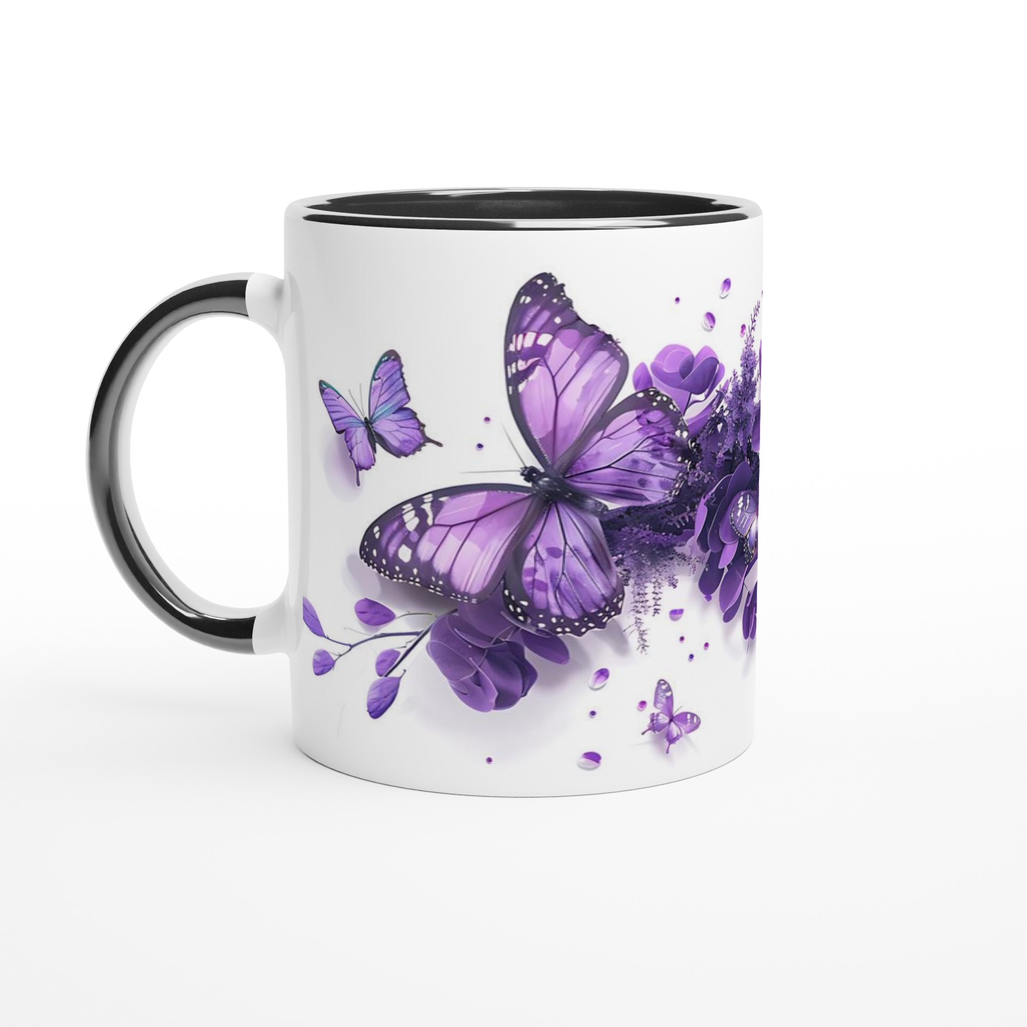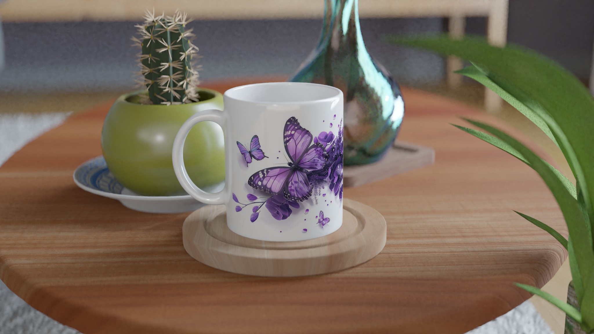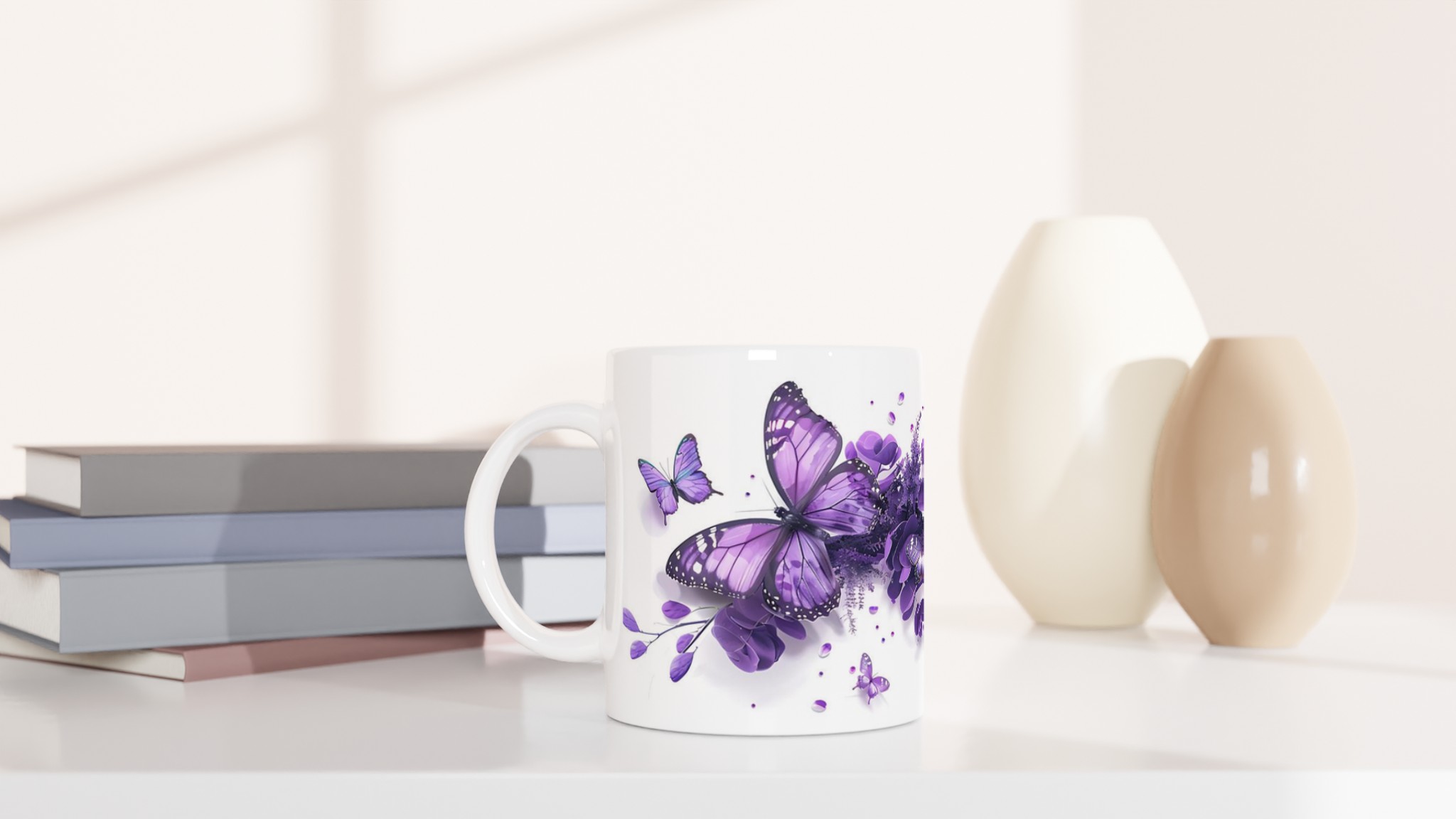 Låt dig förtrollas av denna underbara keramiska mugg, prydd med ett drömskt motiv av lila fjärilar och blomster – en verklig hyllning till naturens skönhet. Denna mugg blir snabbt en vardagsfavorit, perfekt för morgonkaffet, kvällens varma choklad eller när du bara vill njuta av en kopp te i lugn och ro. Den blanka ytan får trycken att framträda med klara och levande färger, som håller sig fina även efter många turer i mikron och diskmaskinen.
