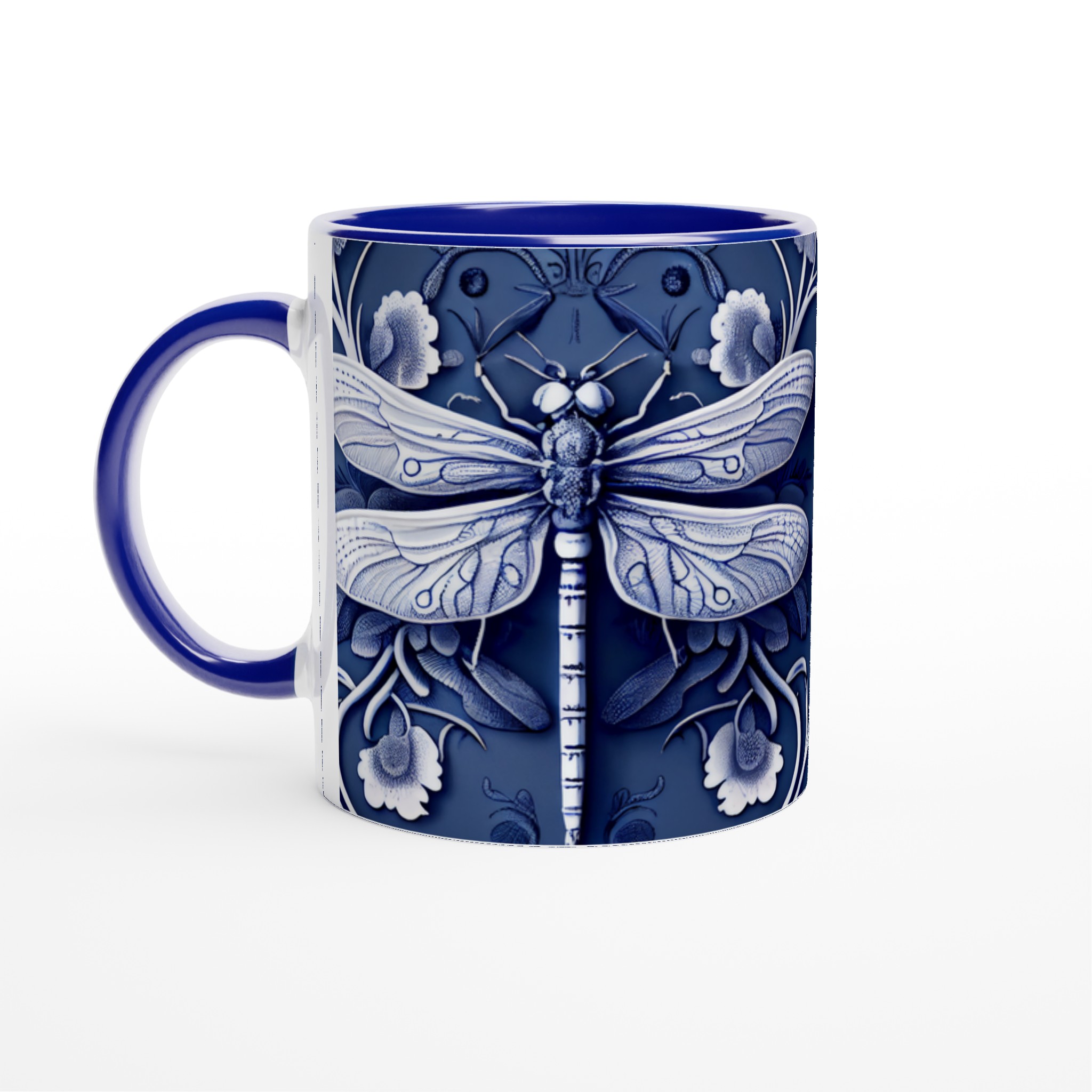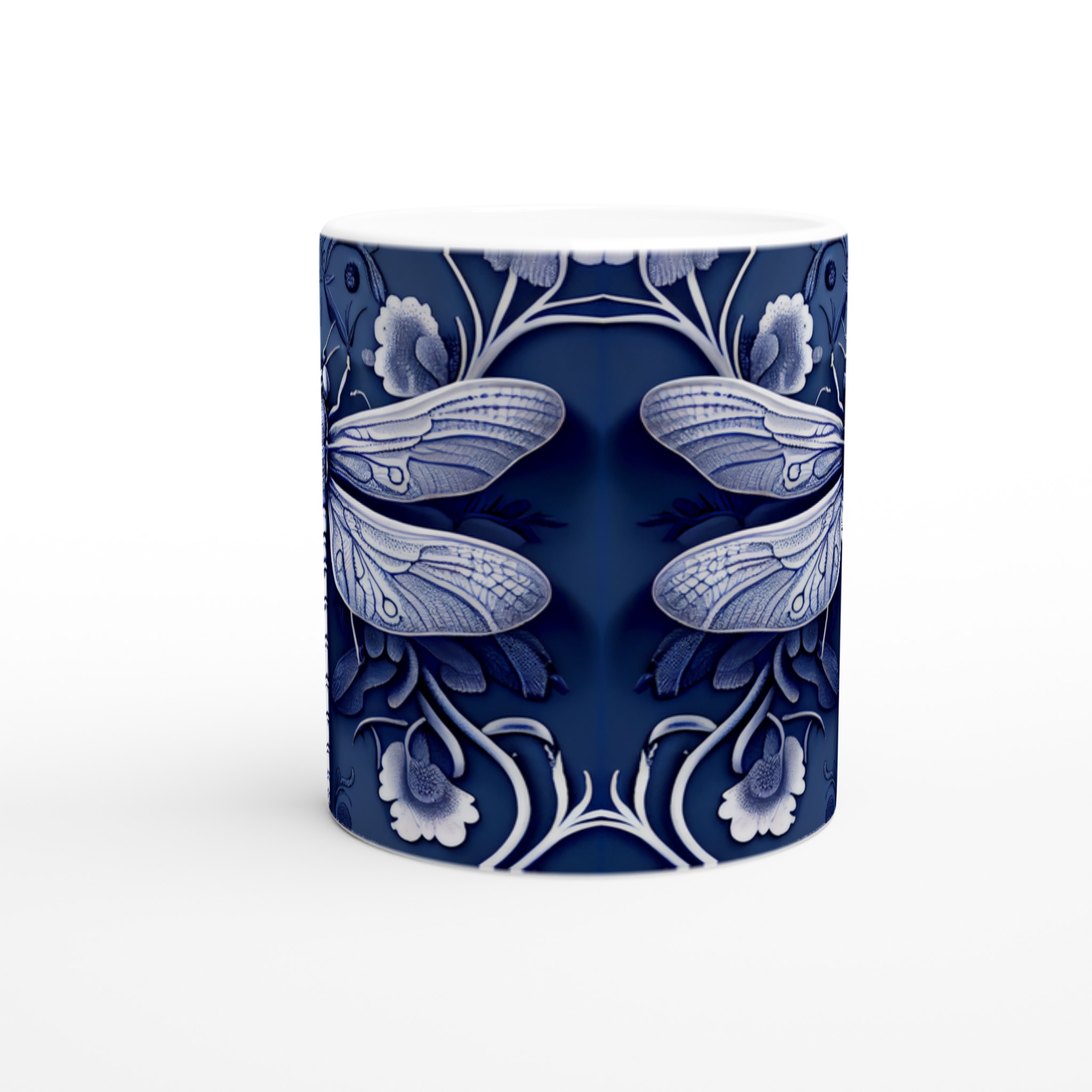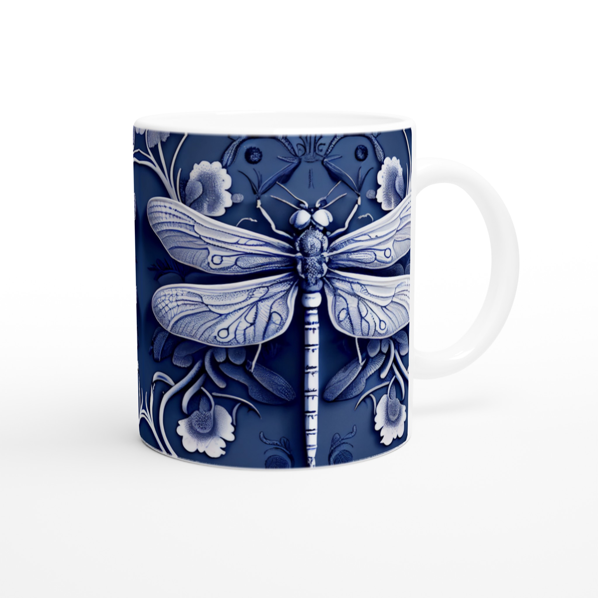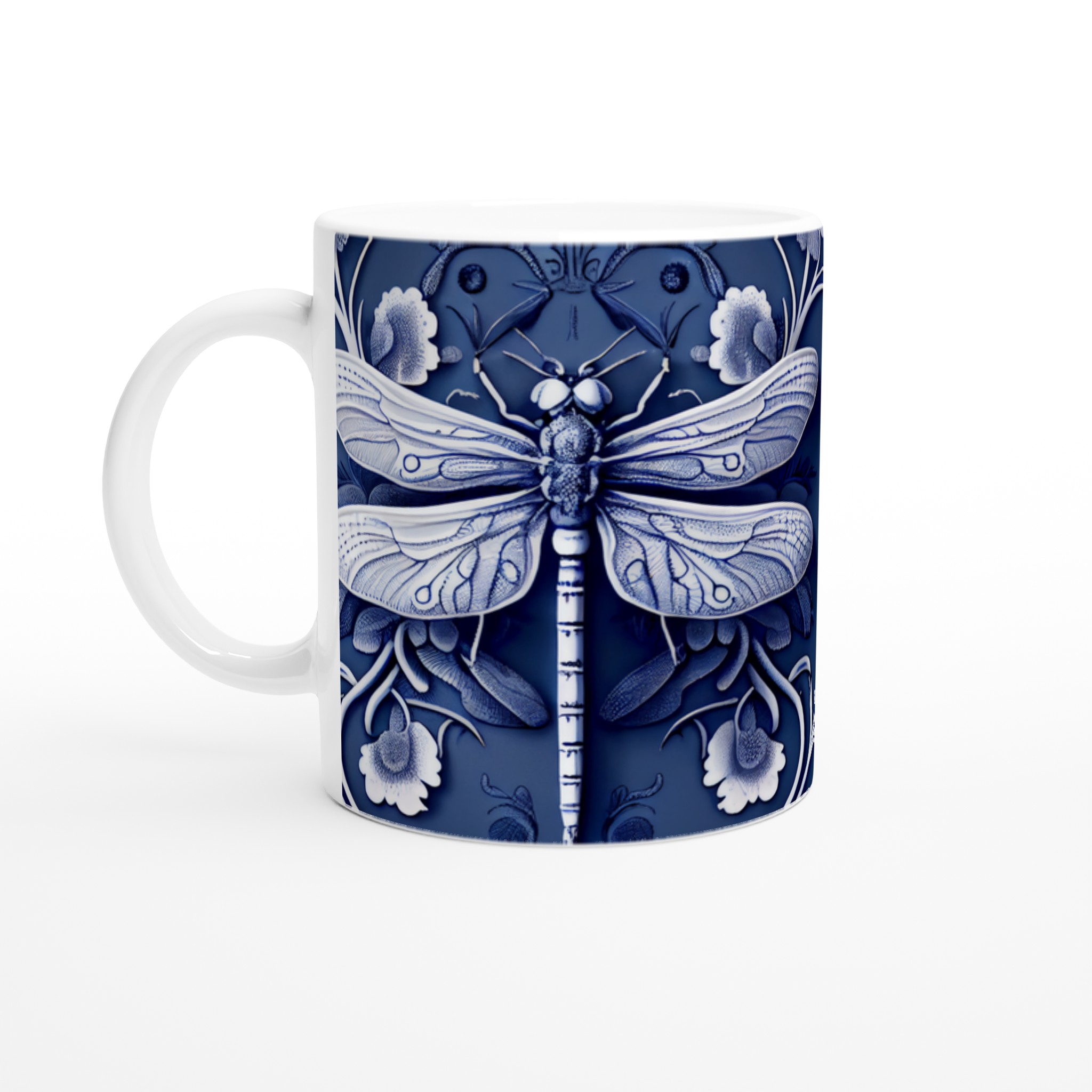 Lyft din fikastund med vår förtrollande keramiska mugg, prydd med en intrikat blåvit design av trollsländor och flora. Denna mugg är mer än bara en kopp – den är en konstnärlig upplevelse som för tankarna till traditionellt kinesiskt porslin, med dess djupa indigoblå nyanser och eleganta vita detaljer som skapar en sofistikerad och lugn känsla. Perfekt för morgonkaffet, kvällens varma choklad eller när du bara vill njuta av en kopp te.