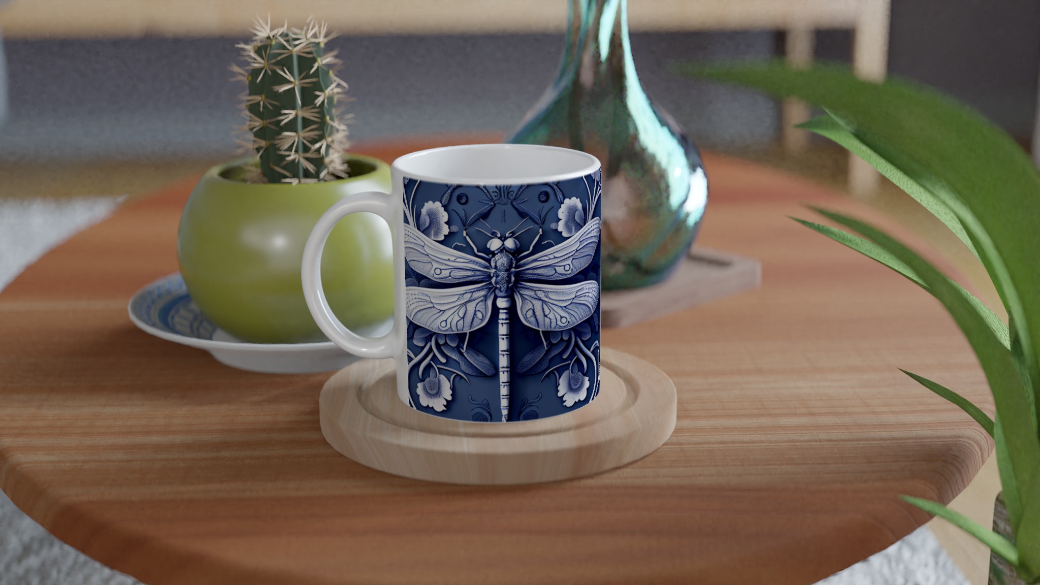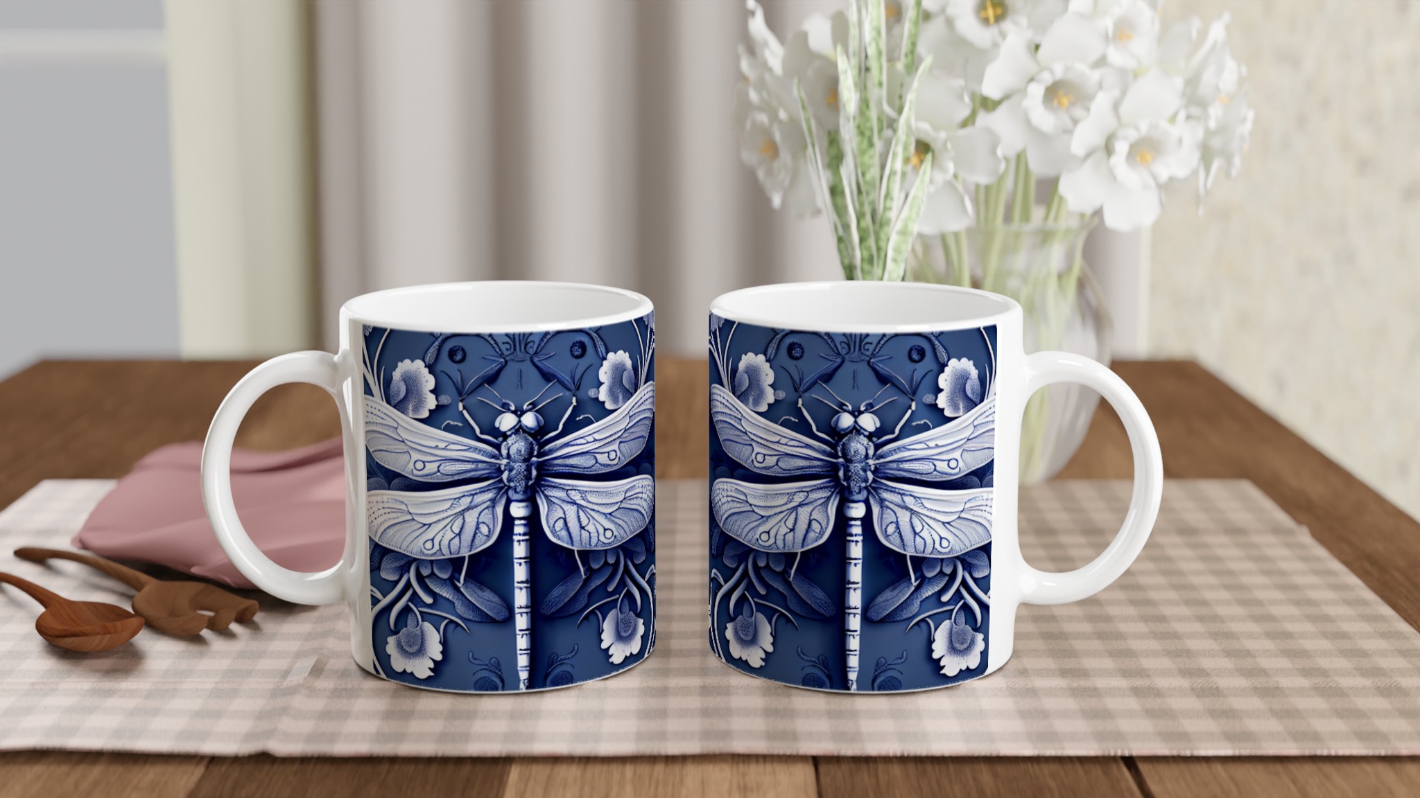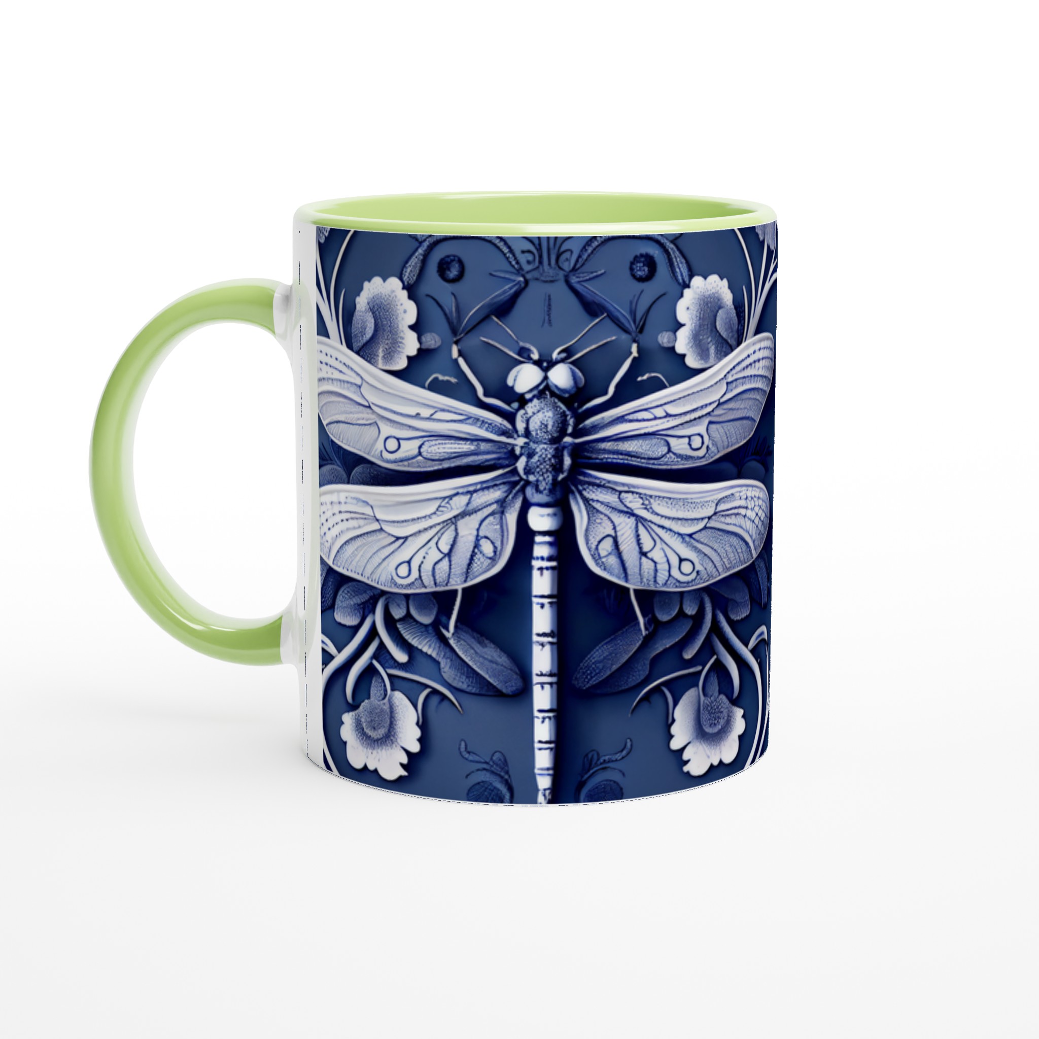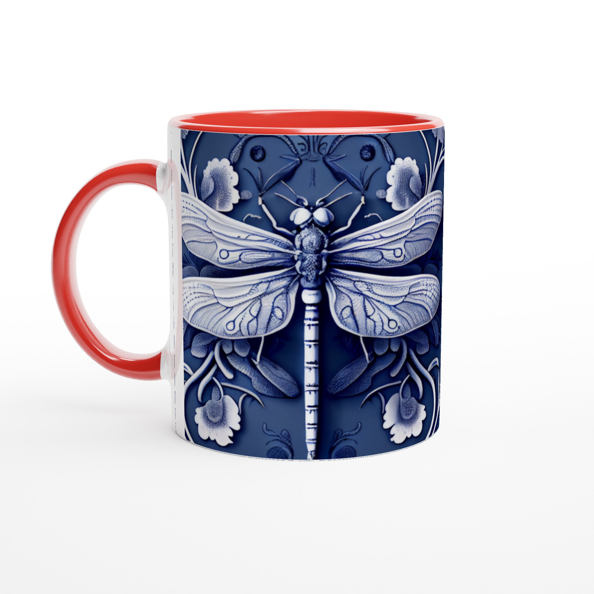 Lyft din fikastund med vår förtrollande keramiska mugg, prydd med en intrikat blåvit design av trollsländor och flora. Denna mugg är mer än bara en kopp – den är en konstnärlig upplevelse som för tankarna till traditionellt kinesiskt porslin, med dess djupa indigoblå nyanser och eleganta vita detaljer som skapar en sofistikerad och lugn känsla. Perfekt för morgonkaffet, kvällens varma choklad eller när du bara vill njuta av en kopp te.