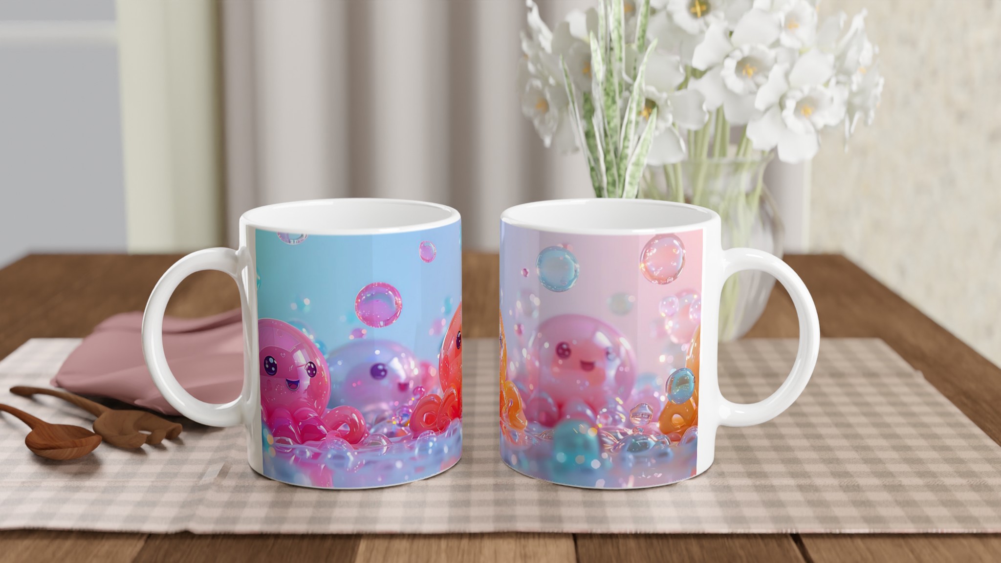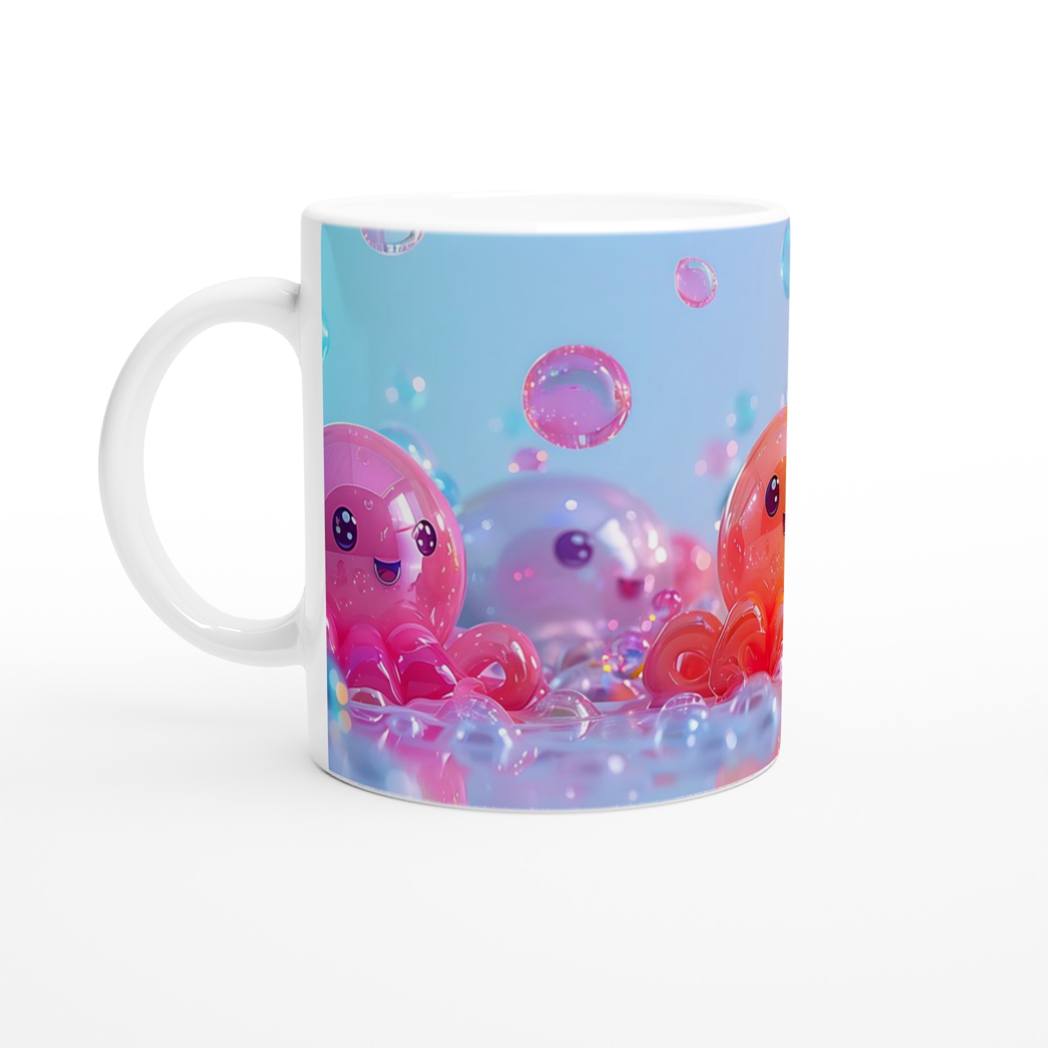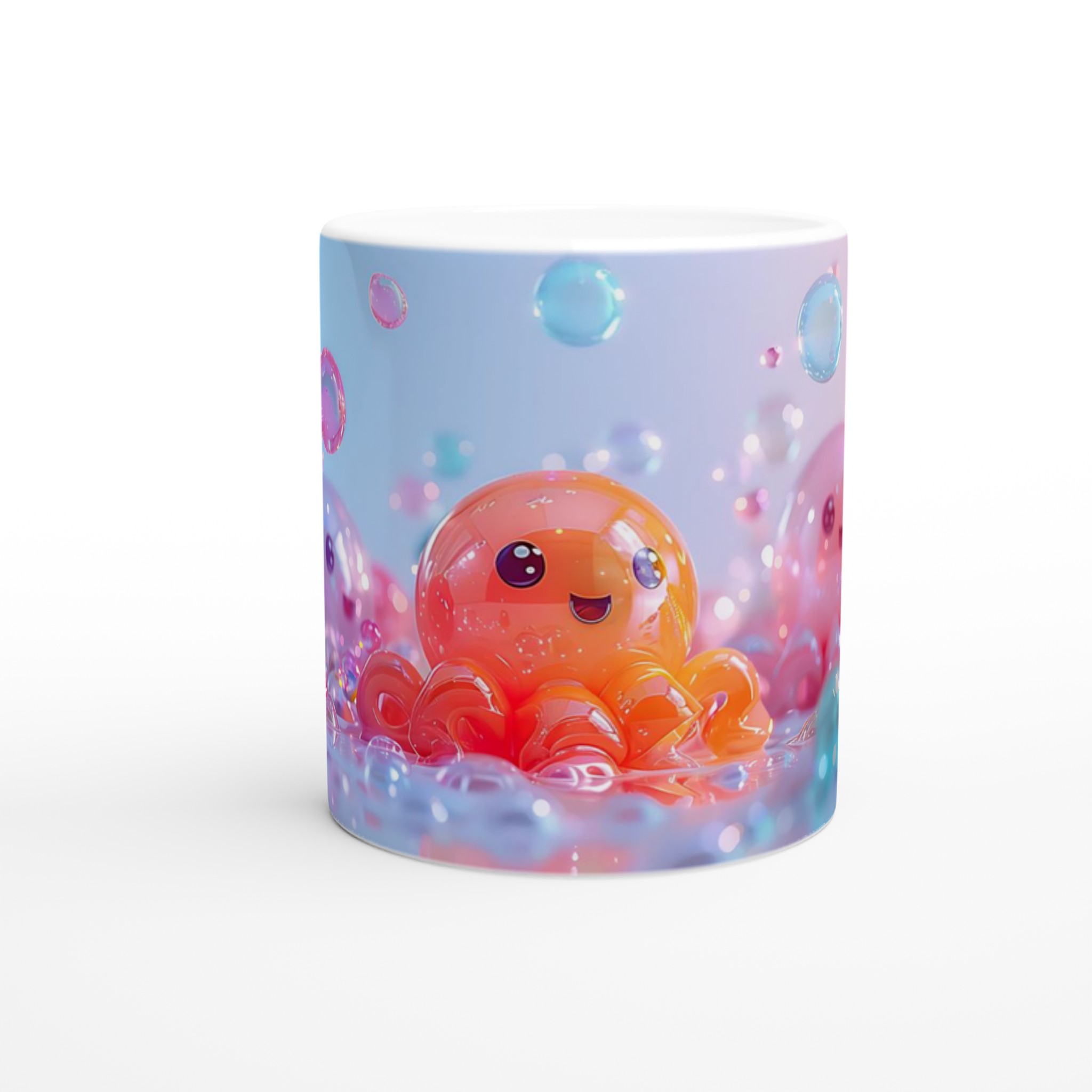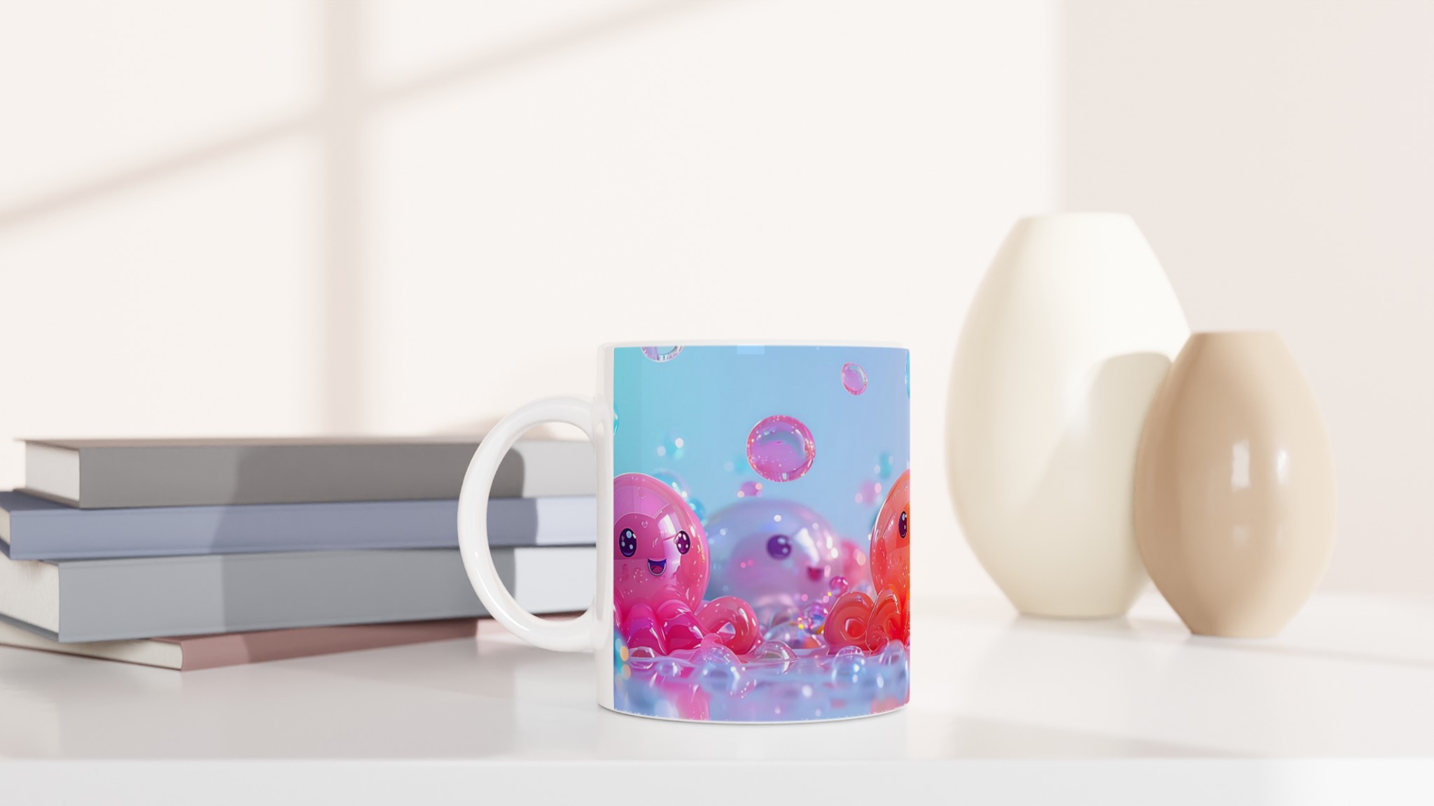 Gör varje fika till en fest med vår keramiska mugg, prydd med bedårande, bubblande bläckfiskar i en drömsk palett av rosa, orange och pastellblått. Den här stilrena muggen blir snabbt en vardagsfavorit, perfekt för morgonkaffet, kvällens varma choklad eller när du bara vill njuta av en kopp te. Den blanka vita ytan framhäver trycken med klara och levande färger, som håller sig fina även efter många turer i mikron och diskmaskinen.