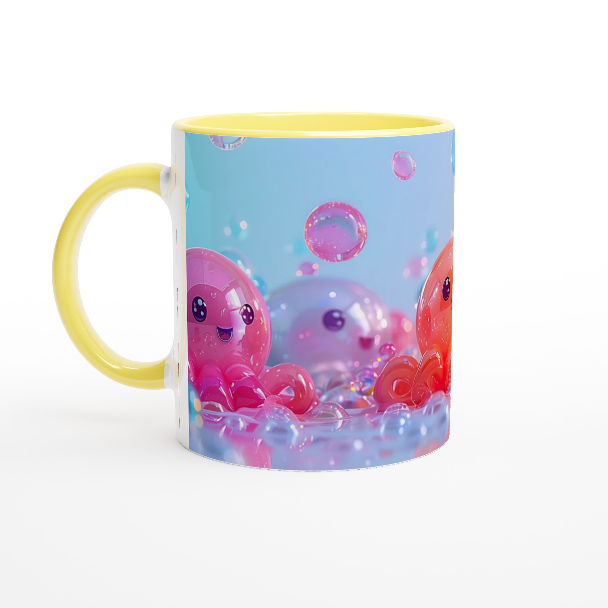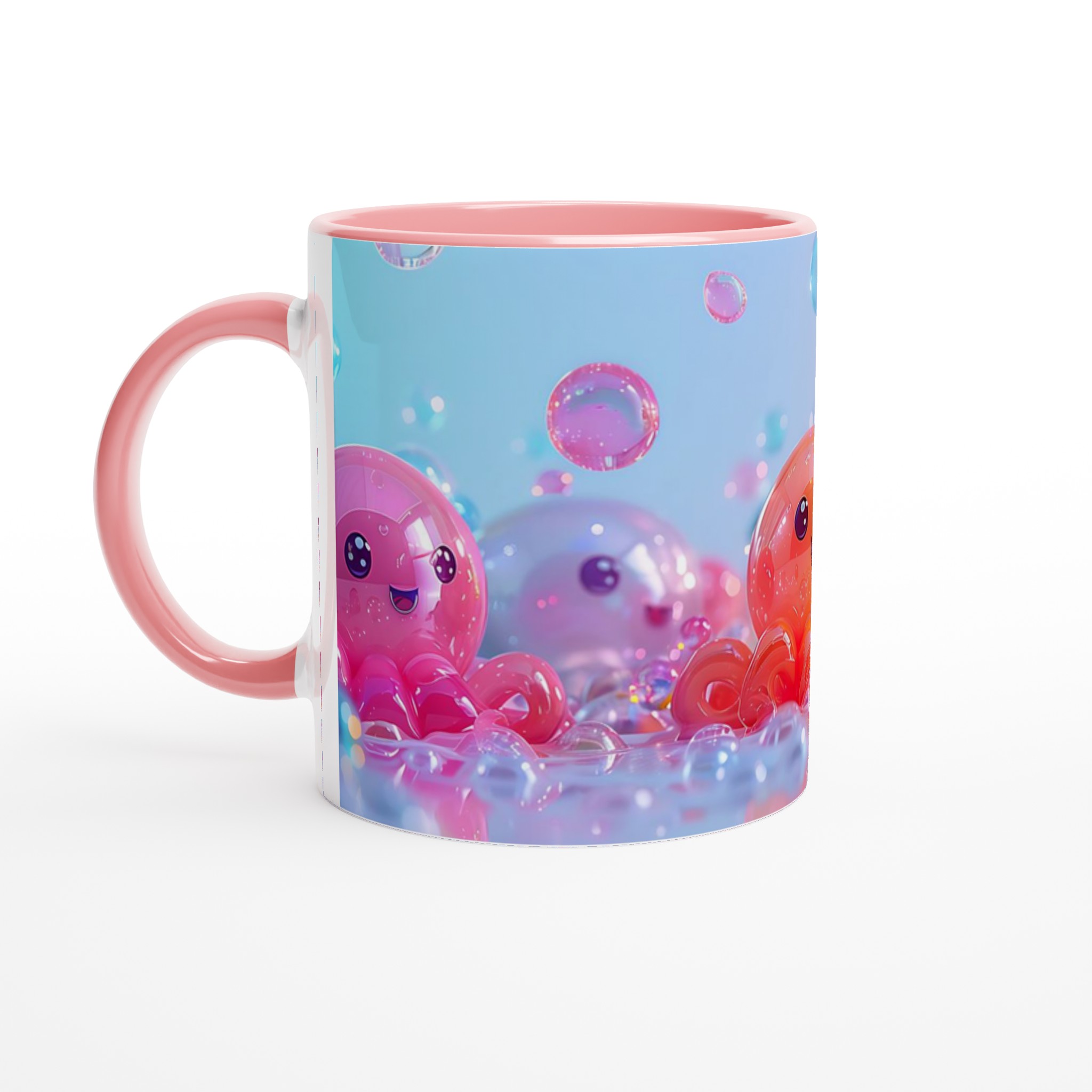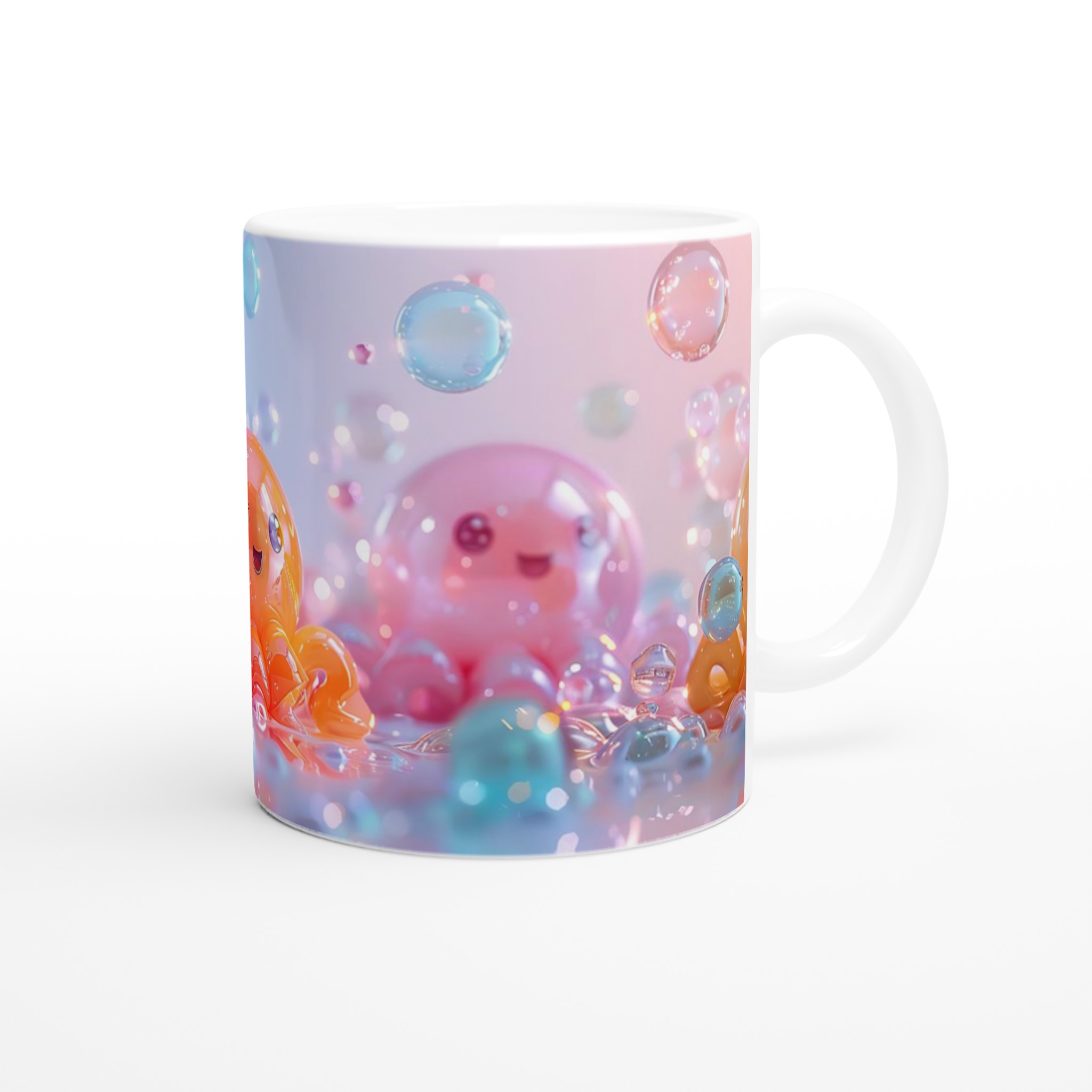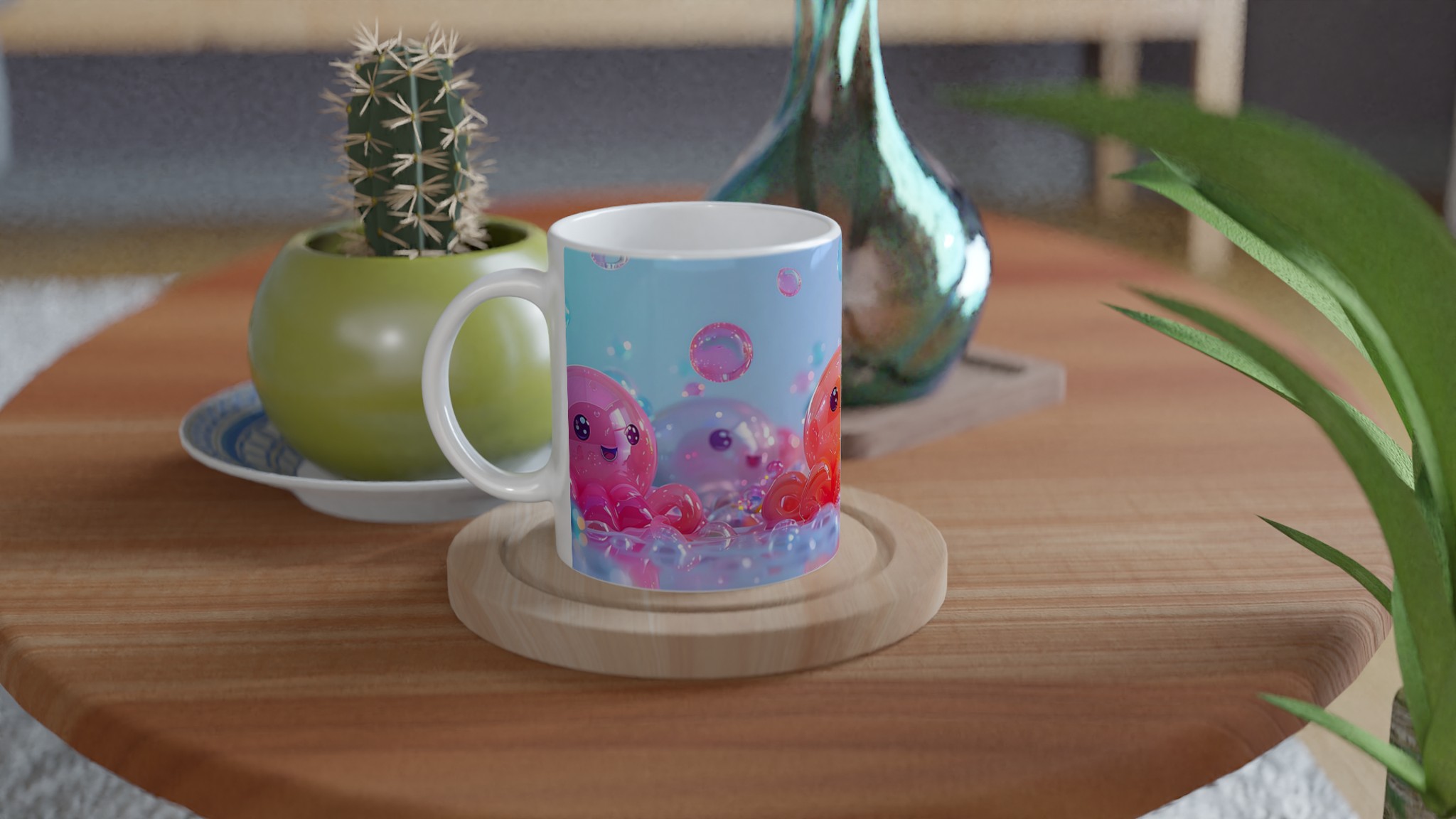 Gör varje fika till en fest med vår keramiska mugg, prydd med bedårande, bubblande bläckfiskar i en drömsk palett av rosa, orange och pastellblått. Den här stilrena muggen blir snabbt en vardagsfavorit, perfekt för morgonkaffet, kvällens varma choklad eller när du bara vill njuta av en kopp te. Den blanka vita ytan framhäver trycken med klara och levande färger, som håller sig fina även efter många turer i mikron och diskmaskinen.