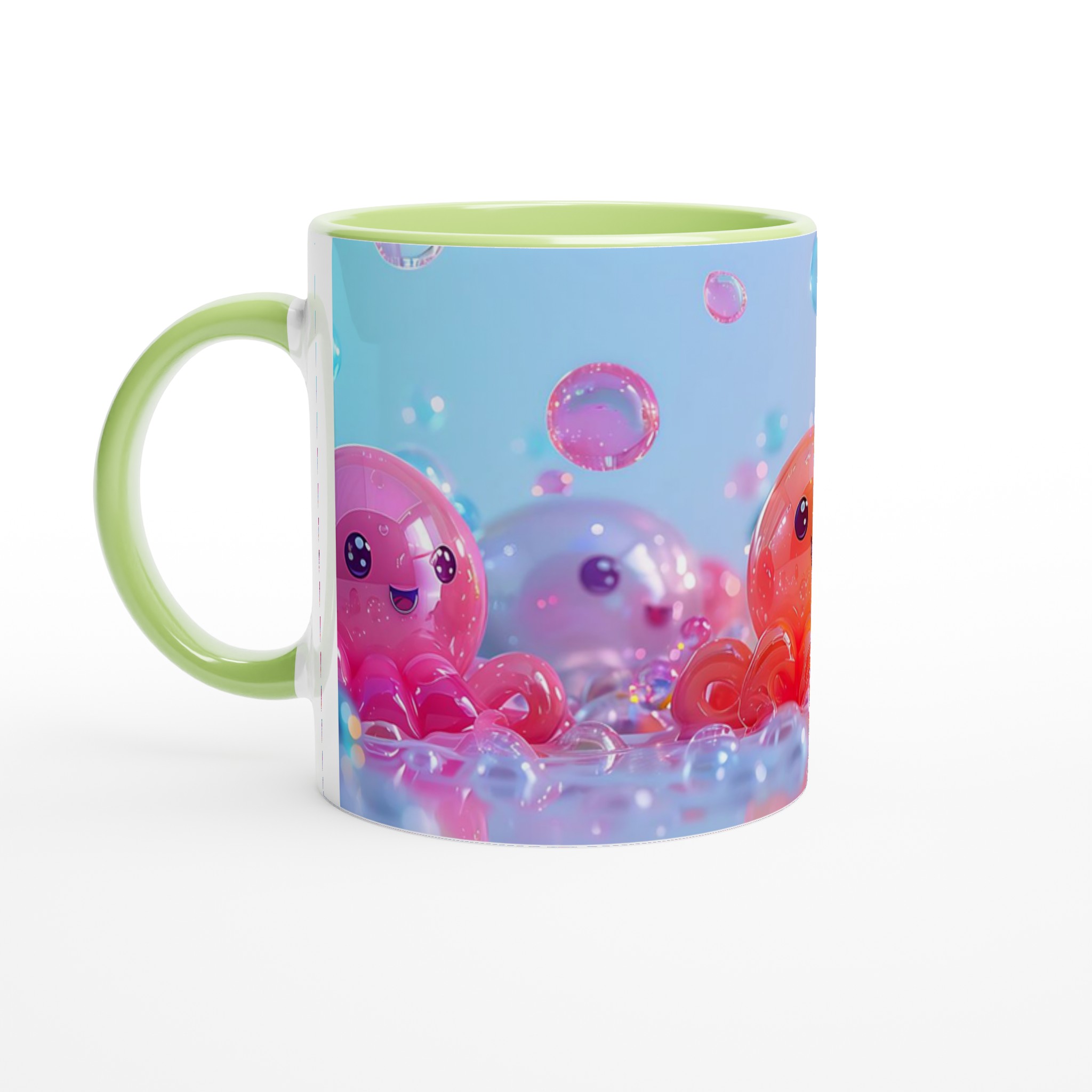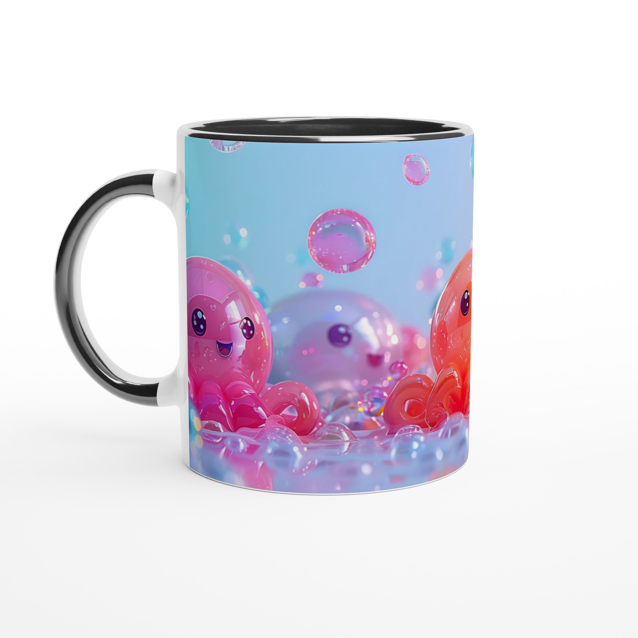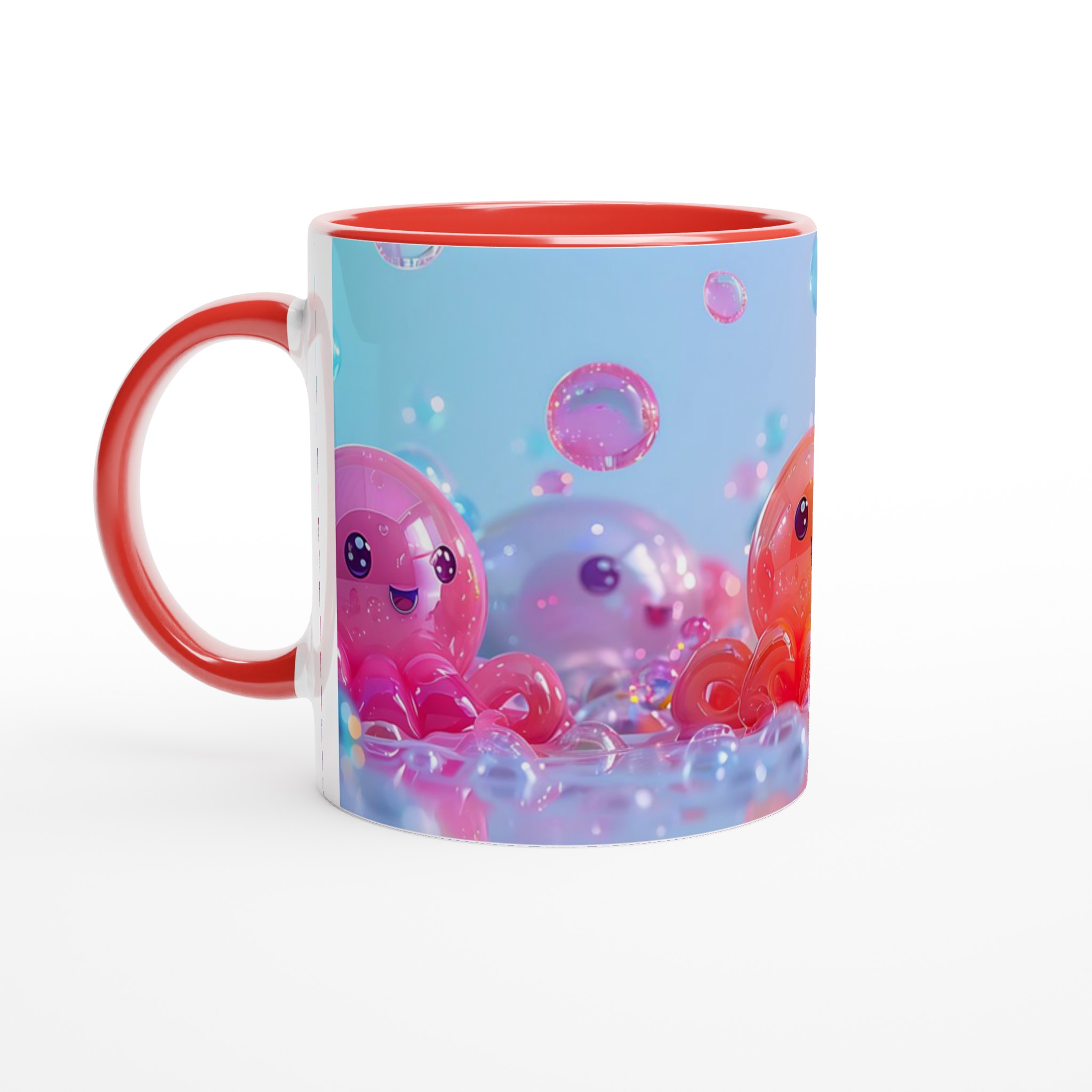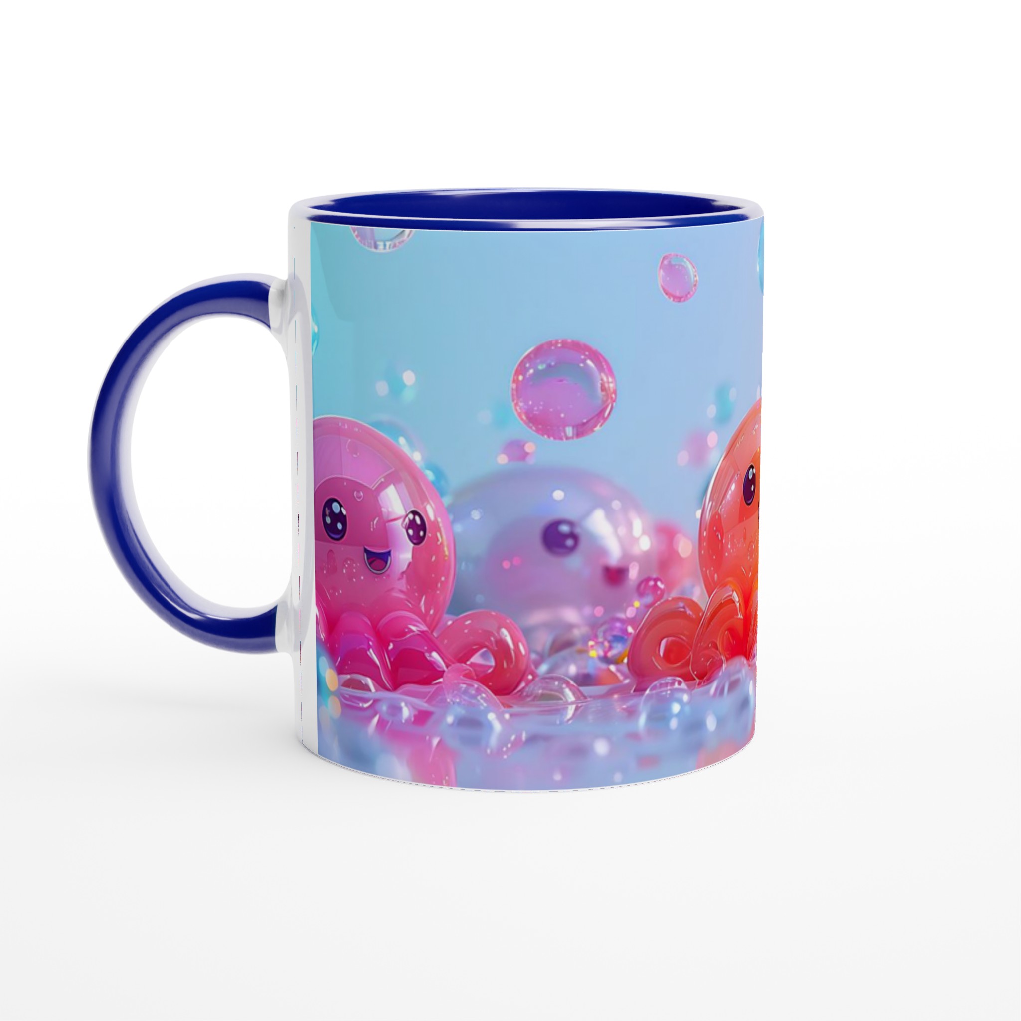 Gör varje fika till en fest med vår keramiska mugg, prydd med bedårande, bubblande bläckfiskar i en drömsk palett av rosa, orange och pastellblått. Den här stilrena muggen blir snabbt en vardagsfavorit, perfekt för morgonkaffet, kvällens varma choklad eller när du bara vill njuta av en kopp te. Den blanka vita ytan framhäver trycken med klara och levande färger, som håller sig fina även efter många turer i mikron och diskmaskinen.