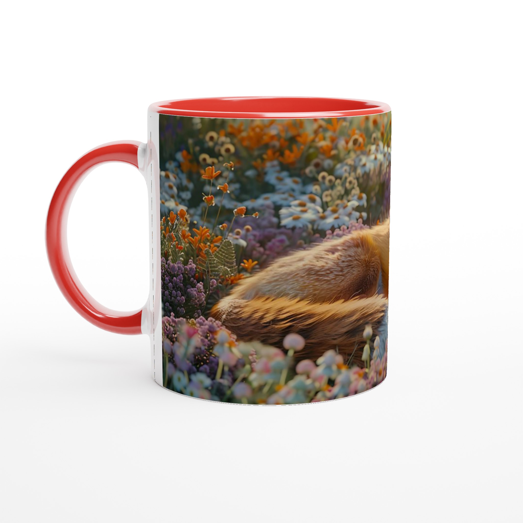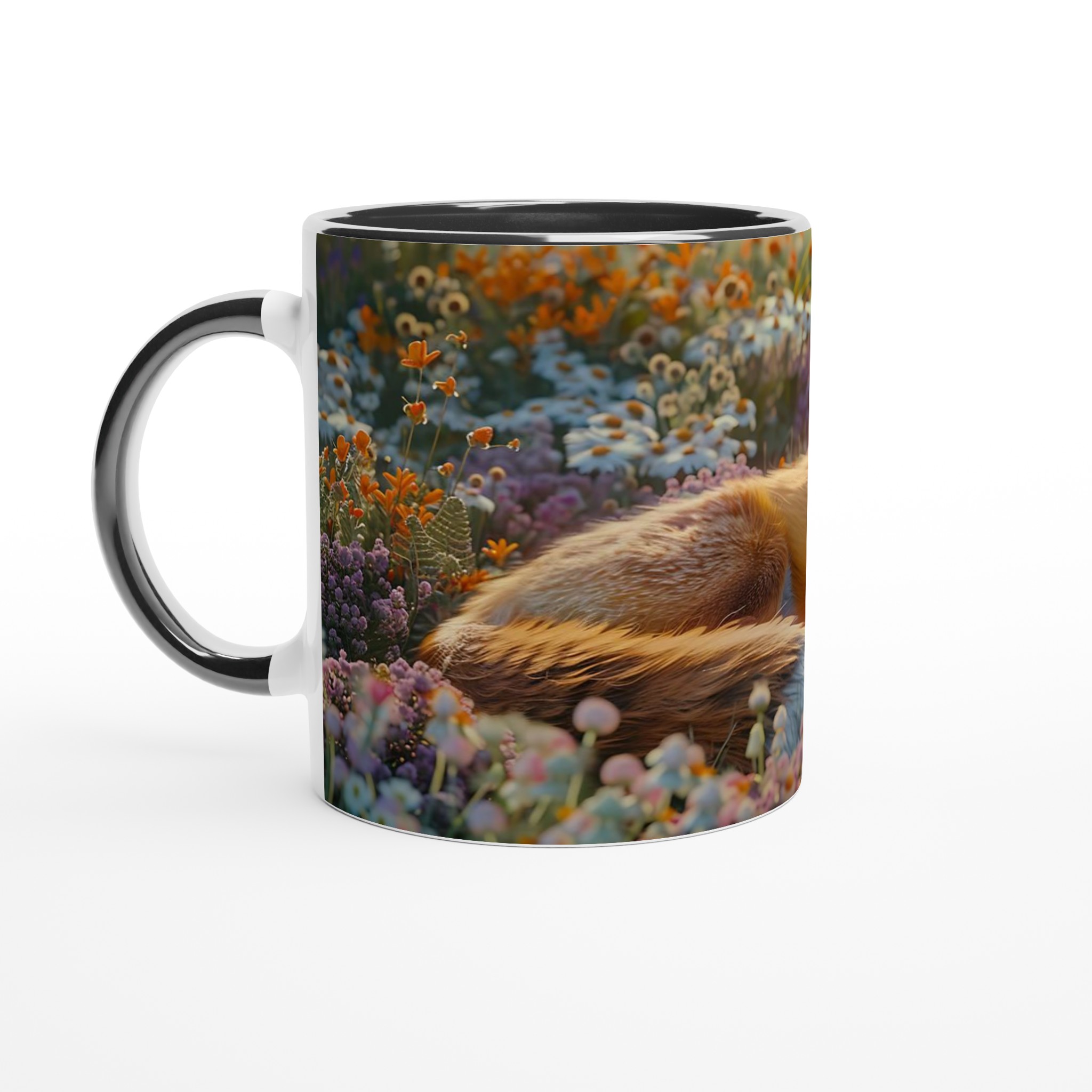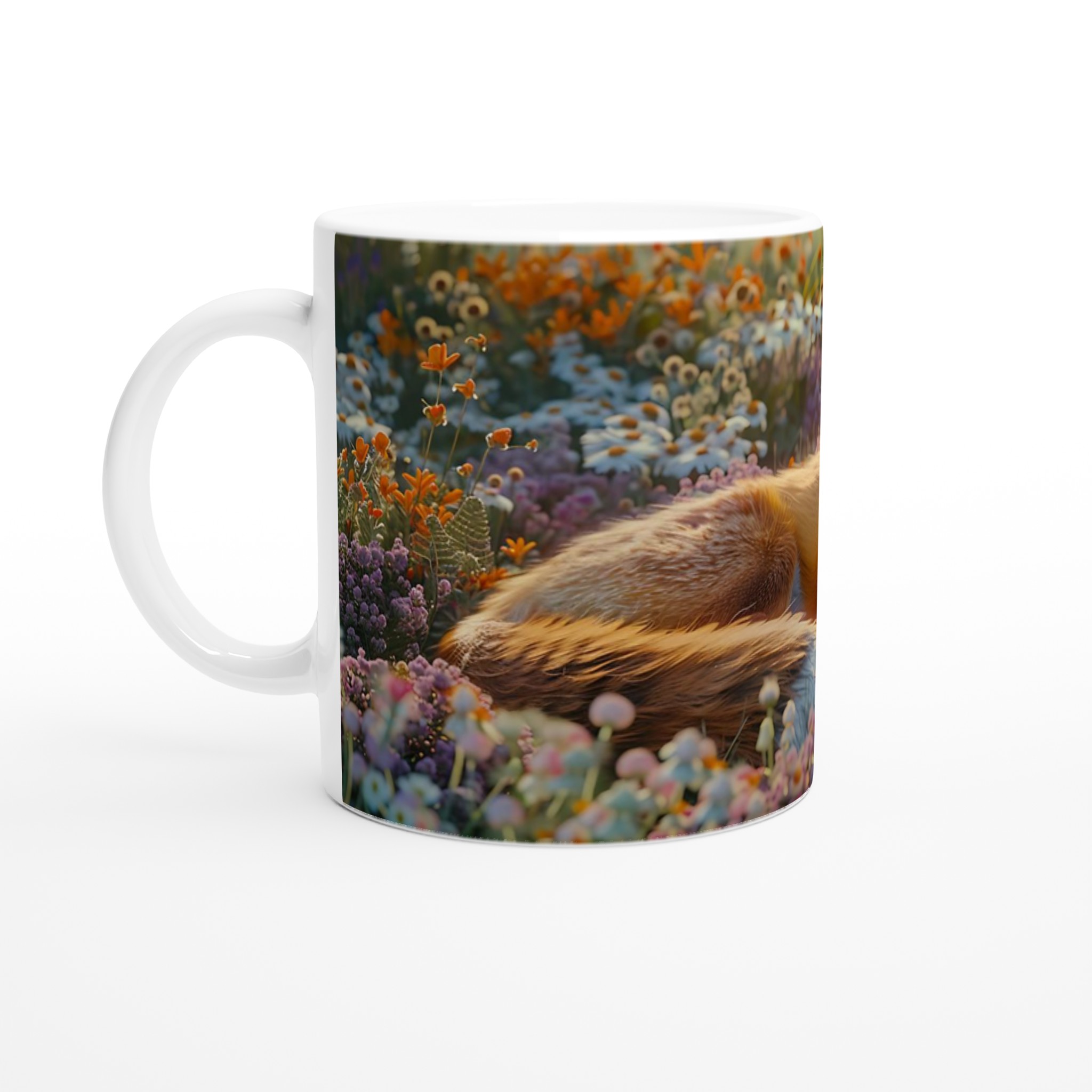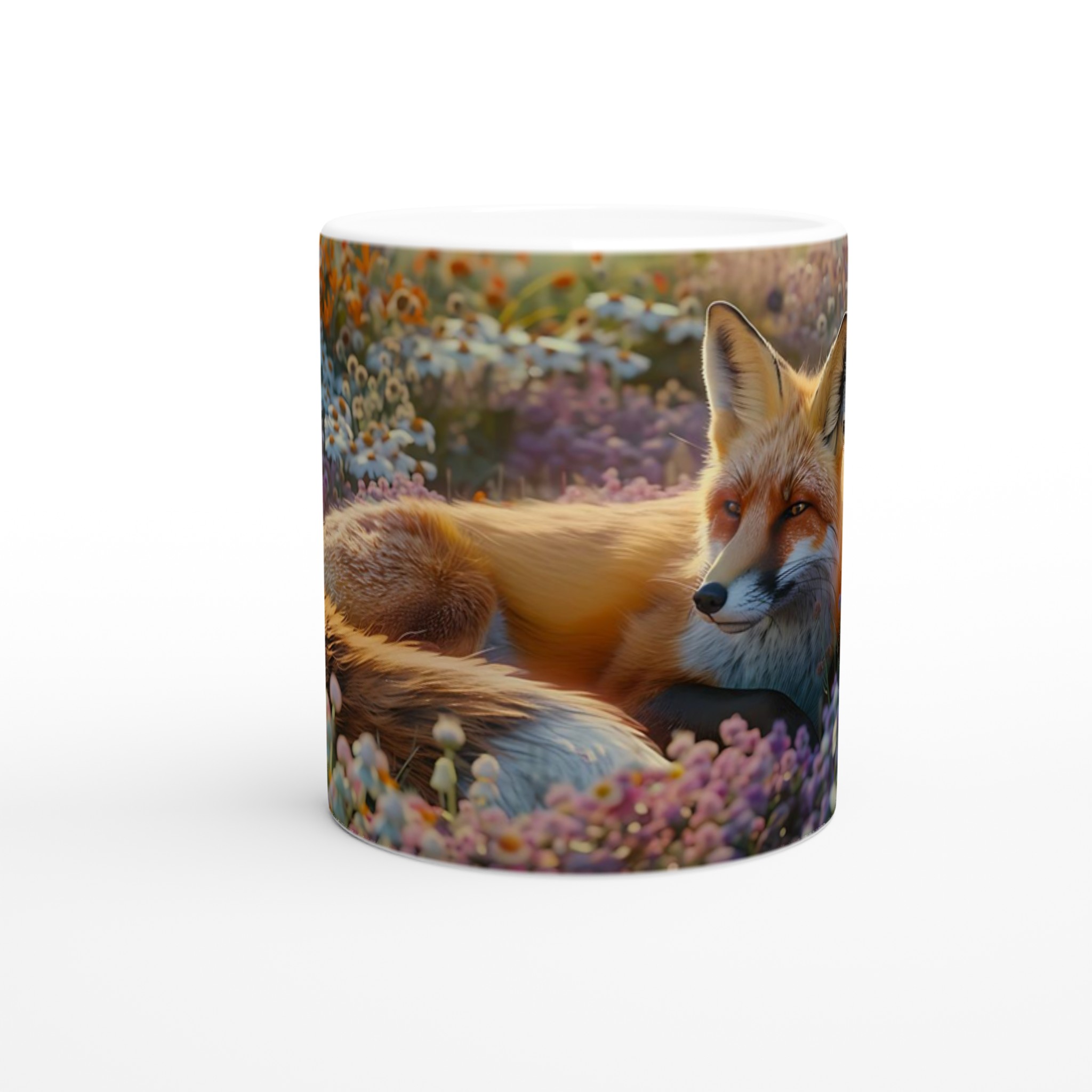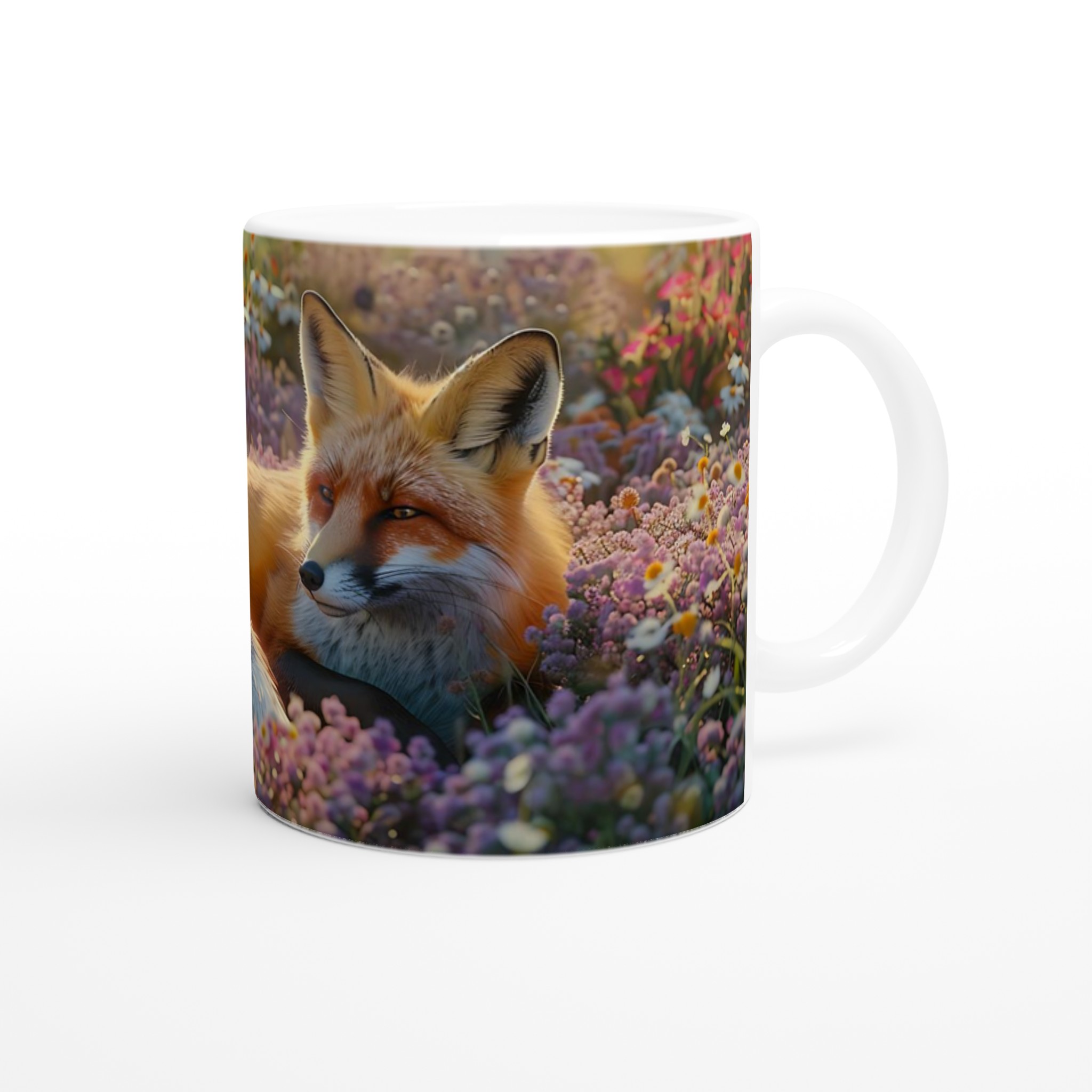 Föreställ dig en stillsam morgon eller en lugn kväll, omfamnad av en varm dryck i din nya favoritmugg. Denna mugg fångar den fridfulla charmen hos en räv som vilar i en blomstrande äng, med mjuka lila och orange toner som inbjuder till ro. Den här stilrena keramiska muggen blir snabbt en vardagsfavorit. Perfekt för morgonkaffet, kvällens varma choklad eller när du bara vill njuta av en kopp te. Den blanka ytan gör att trycken framhävs med klara och levande färger, som håller sig fina även efter många turer i mikron och diskmaskinen.