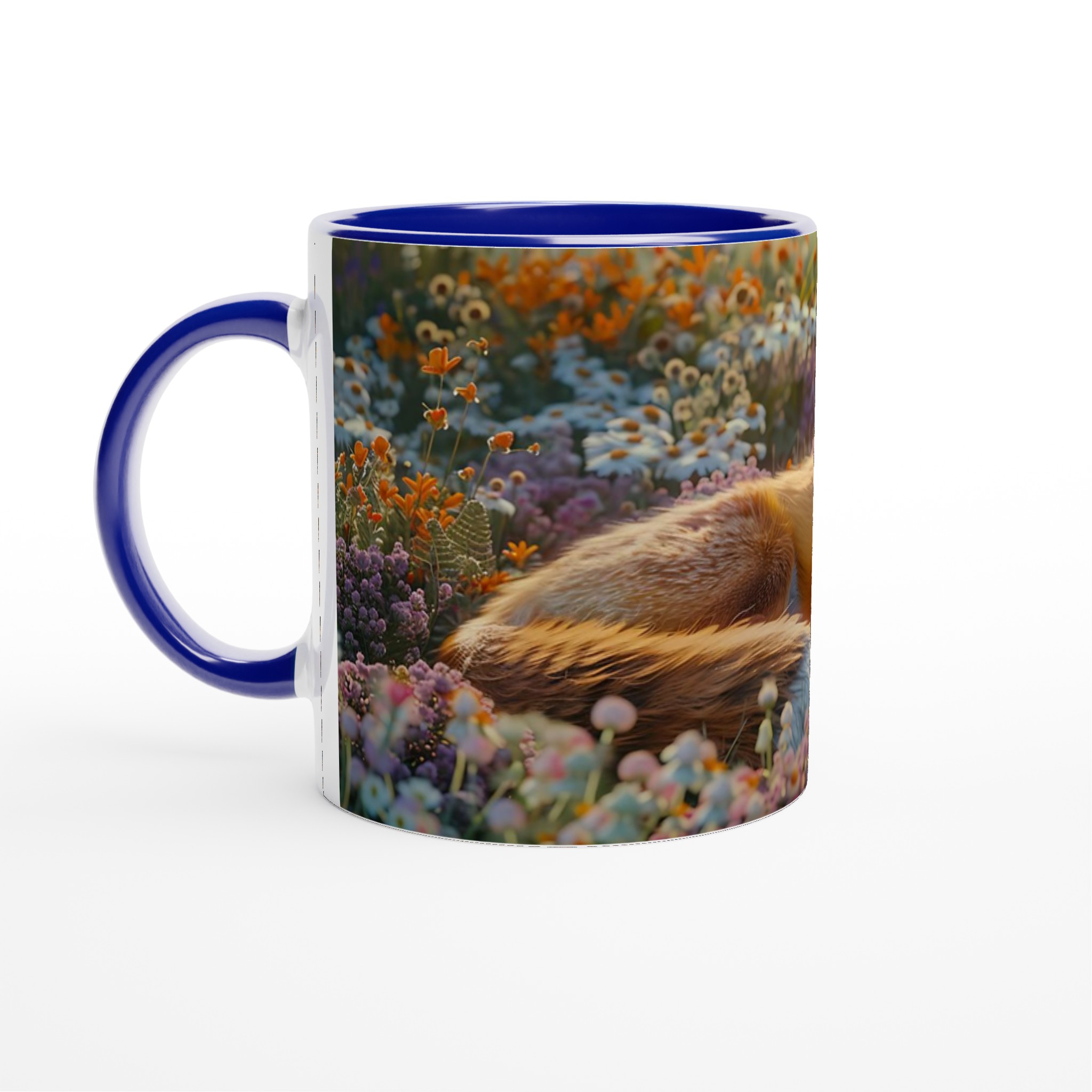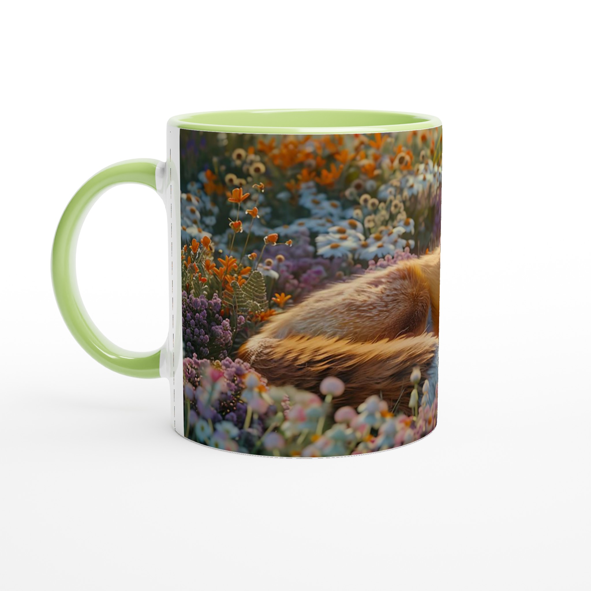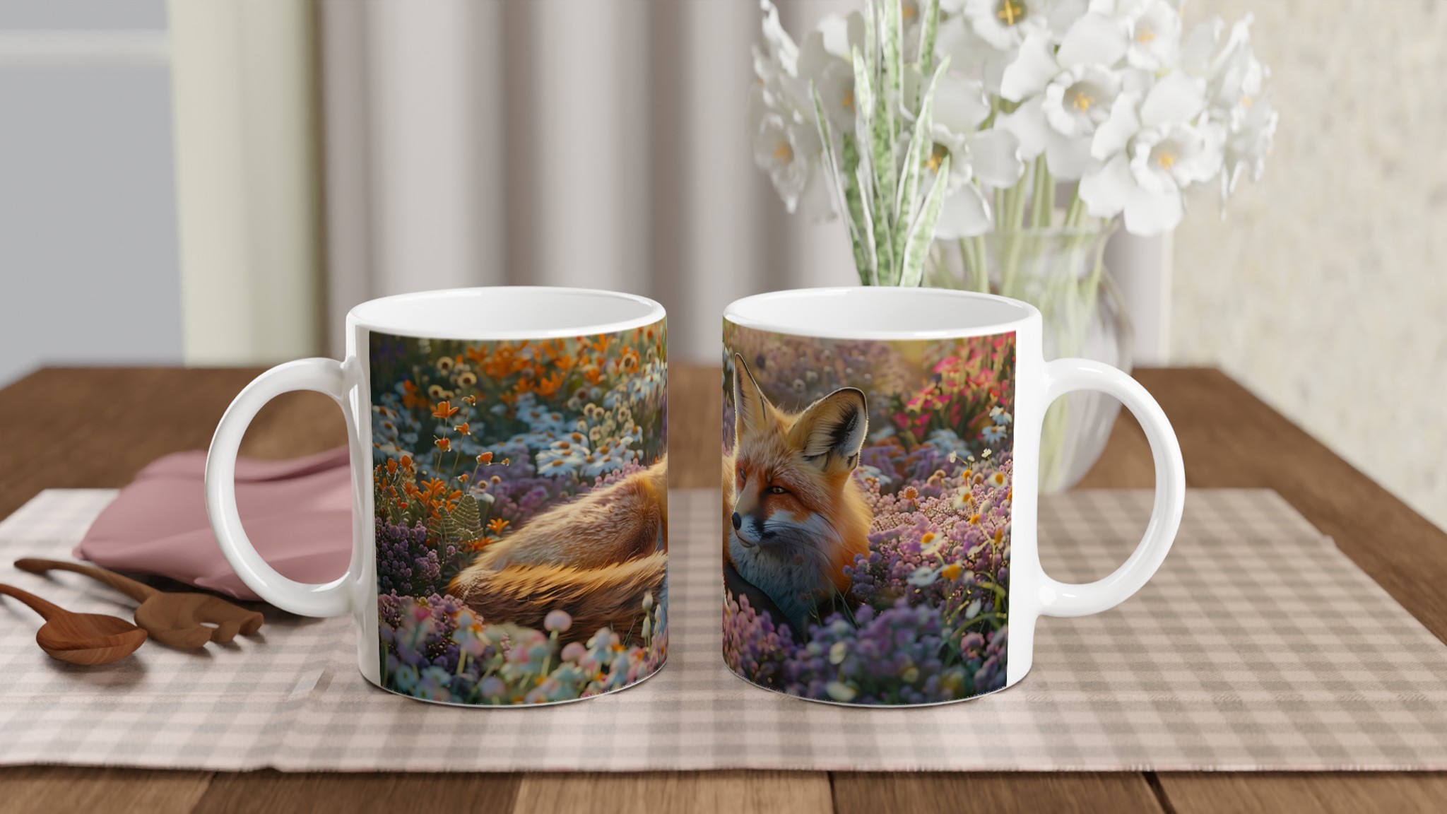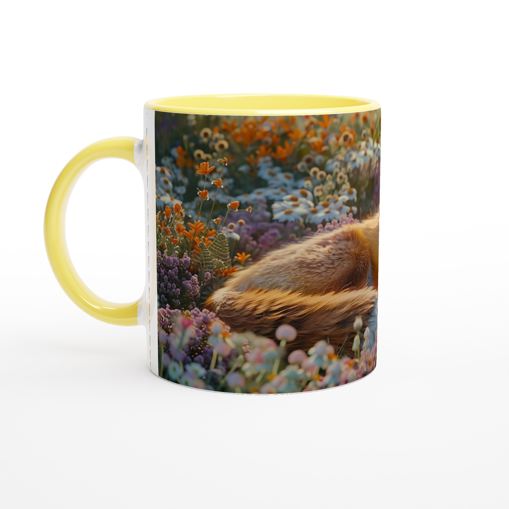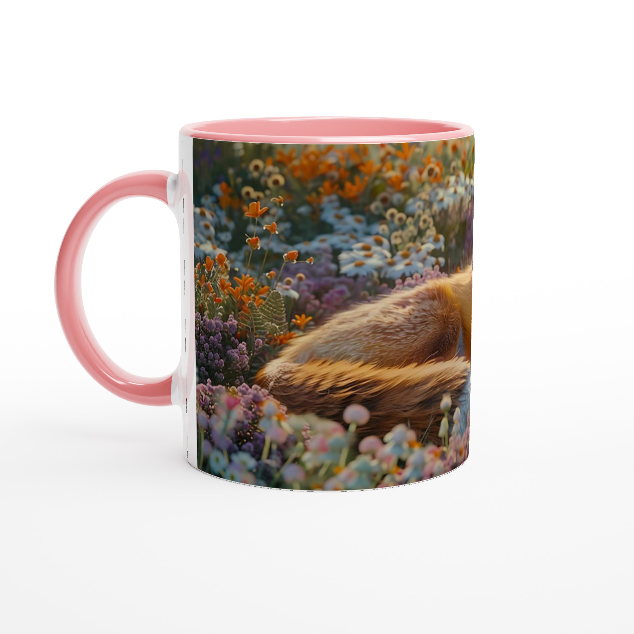 Föreställ dig en stillsam morgon eller en lugn kväll, omfamnad av en varm dryck i din nya favoritmugg. Denna mugg fångar den fridfulla charmen hos en räv som vilar i en blomstrande äng, med mjuka lila och orange toner som inbjuder till ro. Den här stilrena keramiska muggen blir snabbt en vardagsfavorit. Perfekt för morgonkaffet, kvällens varma choklad eller när du bara vill njuta av en kopp te. Den blanka ytan gör att trycken framhävs med klara och levande färger, som håller sig fina även efter många turer i mikron och diskmaskinen.