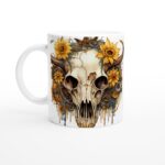 Denna fängslande keramiska mugg är mer än bara en kopp – det är ett konstverk som lyfter din dryckesupplevelse. Med sin detaljrika design av en döskalle prydd med utsirade blommor, eleganta horn och delikata fjärilar, skapar den en mystisk och sofistikerad känsla. Perfekt för morgonkaffet, kvällens varma choklad eller när du bara vill njuta av en kopp te med en touch av gotisk elegans. Den blanka vita ytan gör att trycken framhävs med klara och levande färger, som håller sig fina även efter många turer i mikron och diskmaskinen.