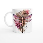 Lyft din fikastund med denna fängslande keramiska mugg, prydd med en intrikat steampunk-trollslända. Dess vingar, en blandning av turkosa och djupblå toner, är utsmyckade med detaljerade mönster som möter en kropp av gnistrande kugghjul och mekaniska element i koppar och guld. En touch av blomstrande blommor i varma nyanser av rött och lila ger en organisk kontrast till den industriella estetiken, vilket skapar en unik och konstnärlig upplevelse.
