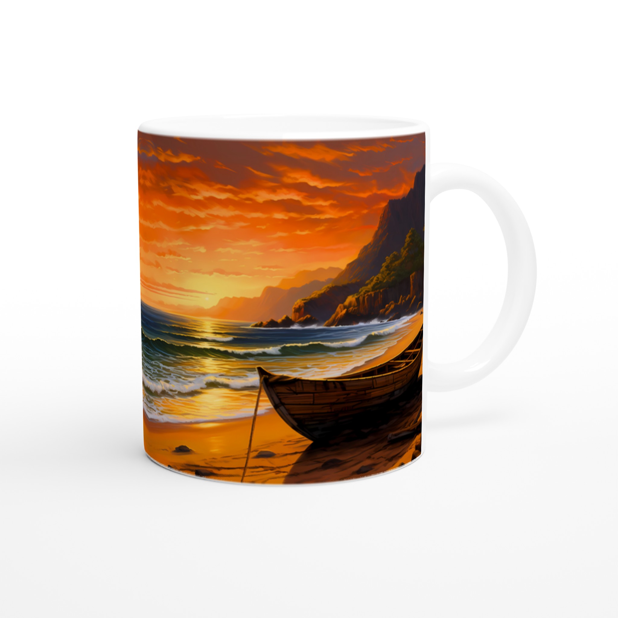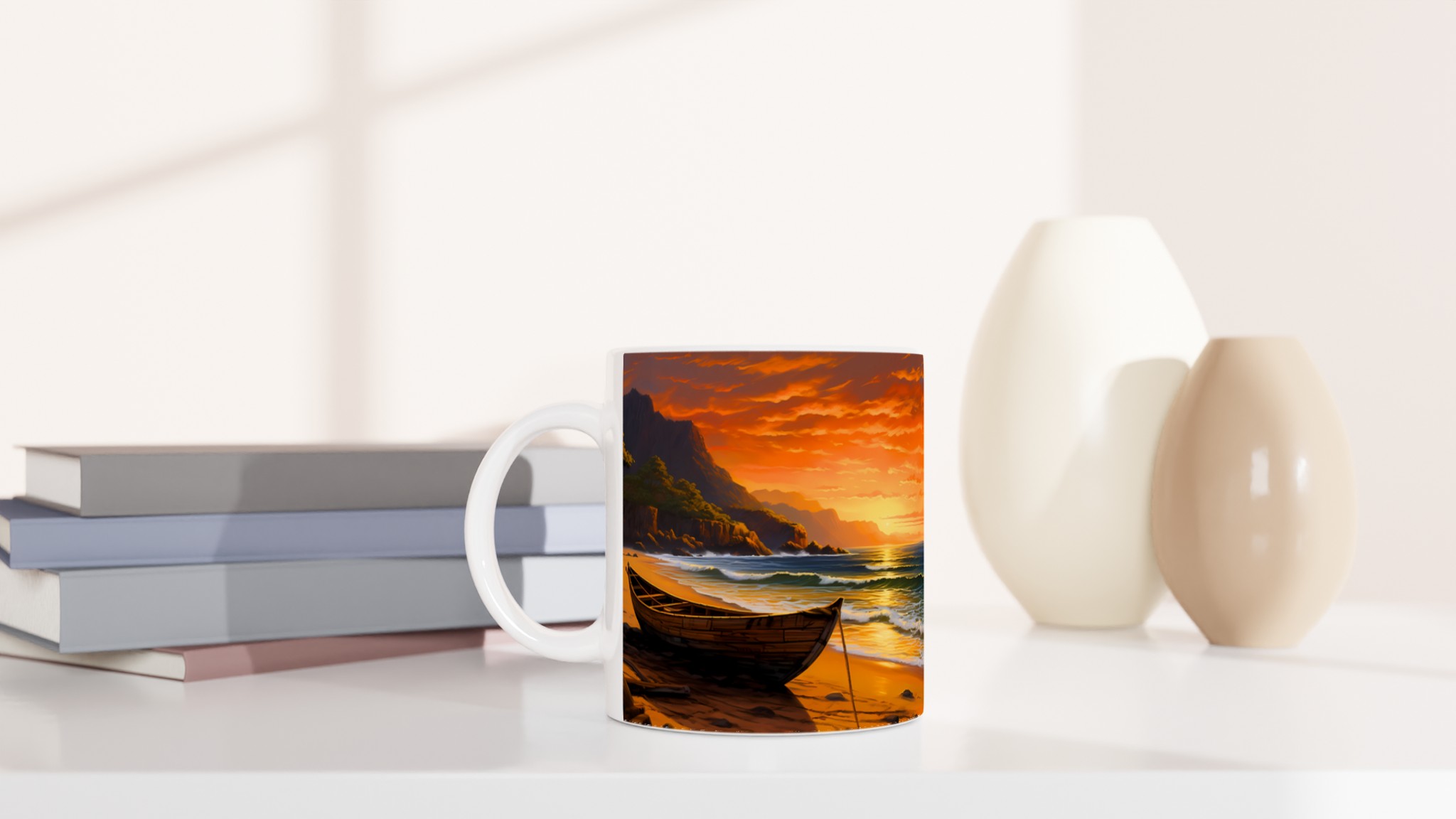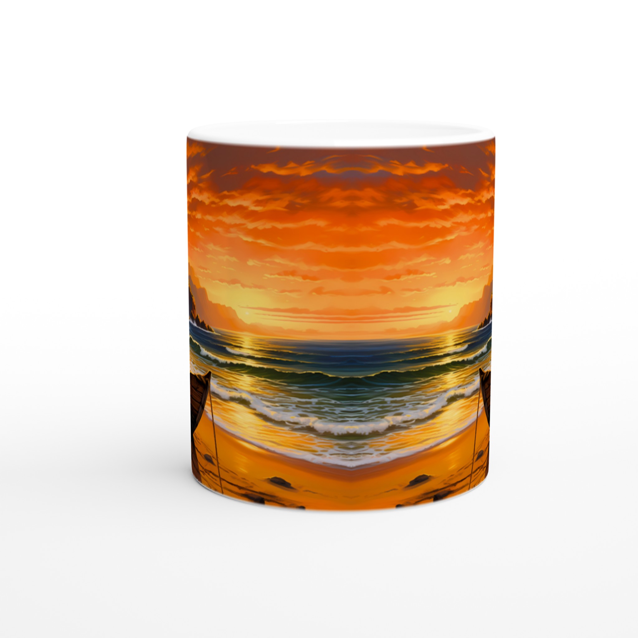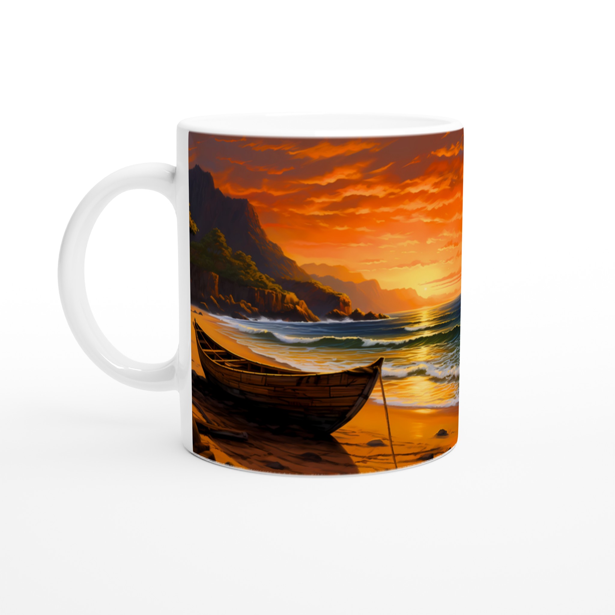 Låt dig svepas med till en lugn strand med vår keramiska mugg, som fångar den hisnande skönheten av en solnedgång över havet. Med dramatiska orange och guldiga skyar som reflekteras i vågorna, inbjuder denna mugg till en stunds avkoppling. De två båtarna som vilar på stranden förstärker känslan av frid och äventyr.