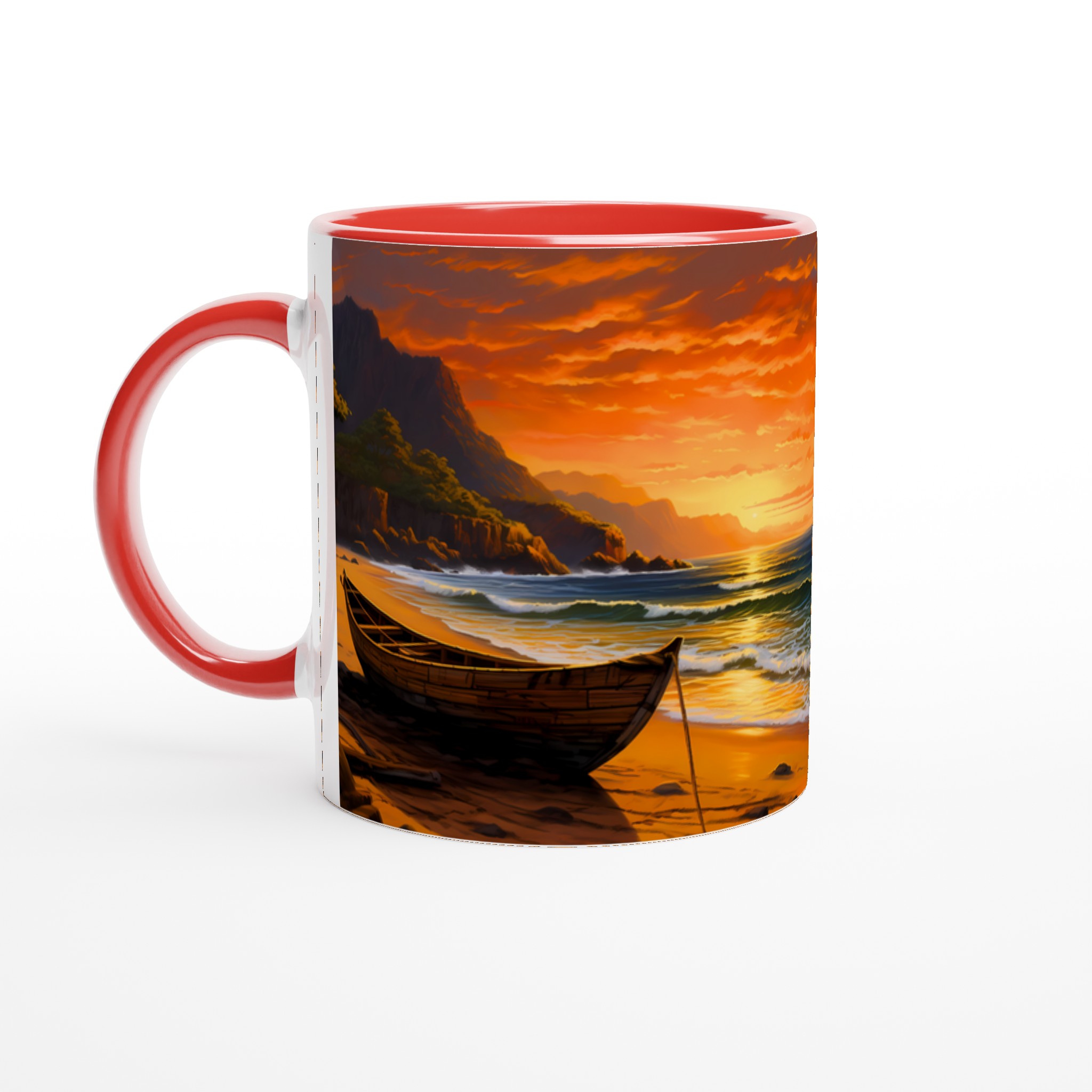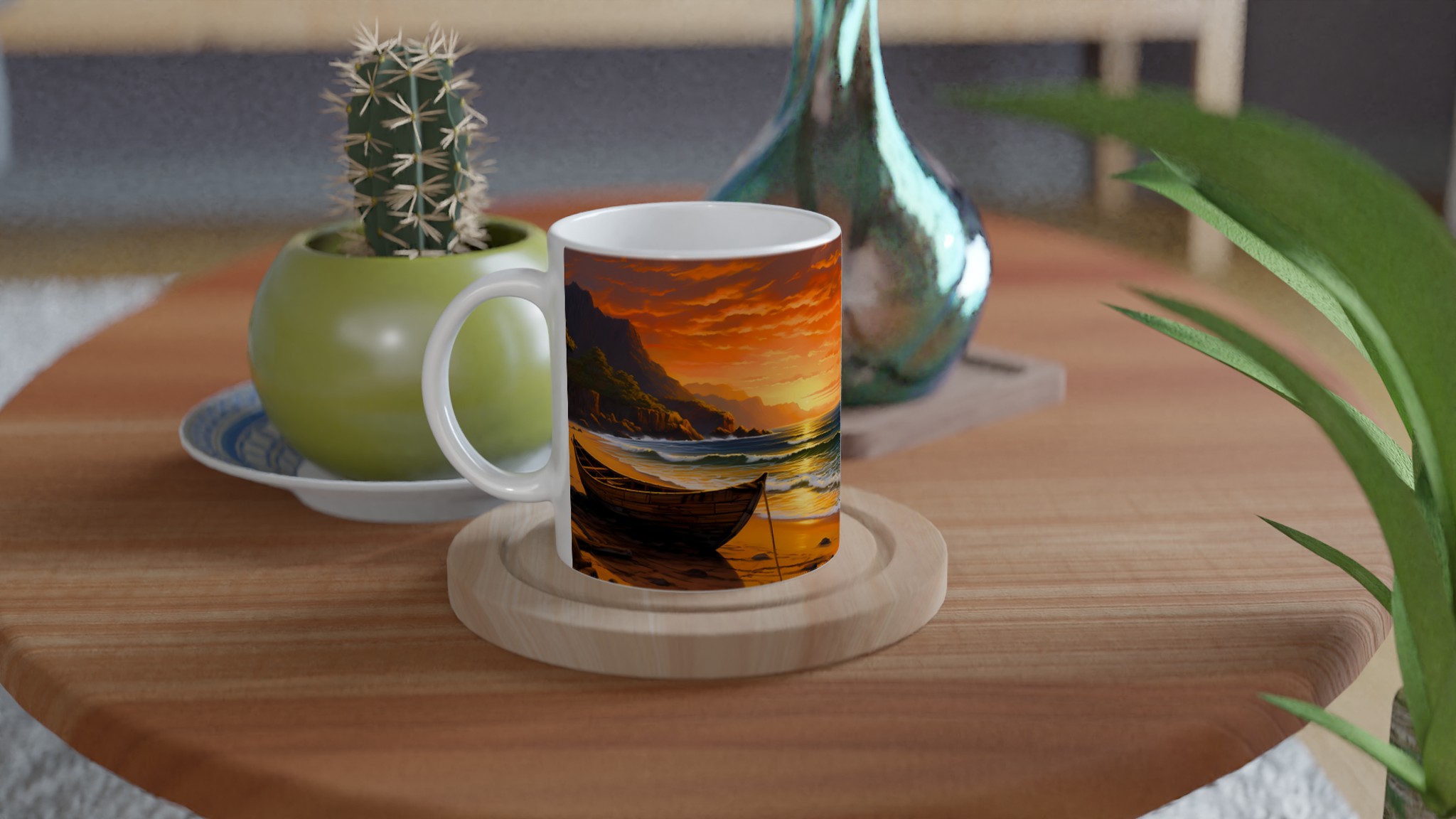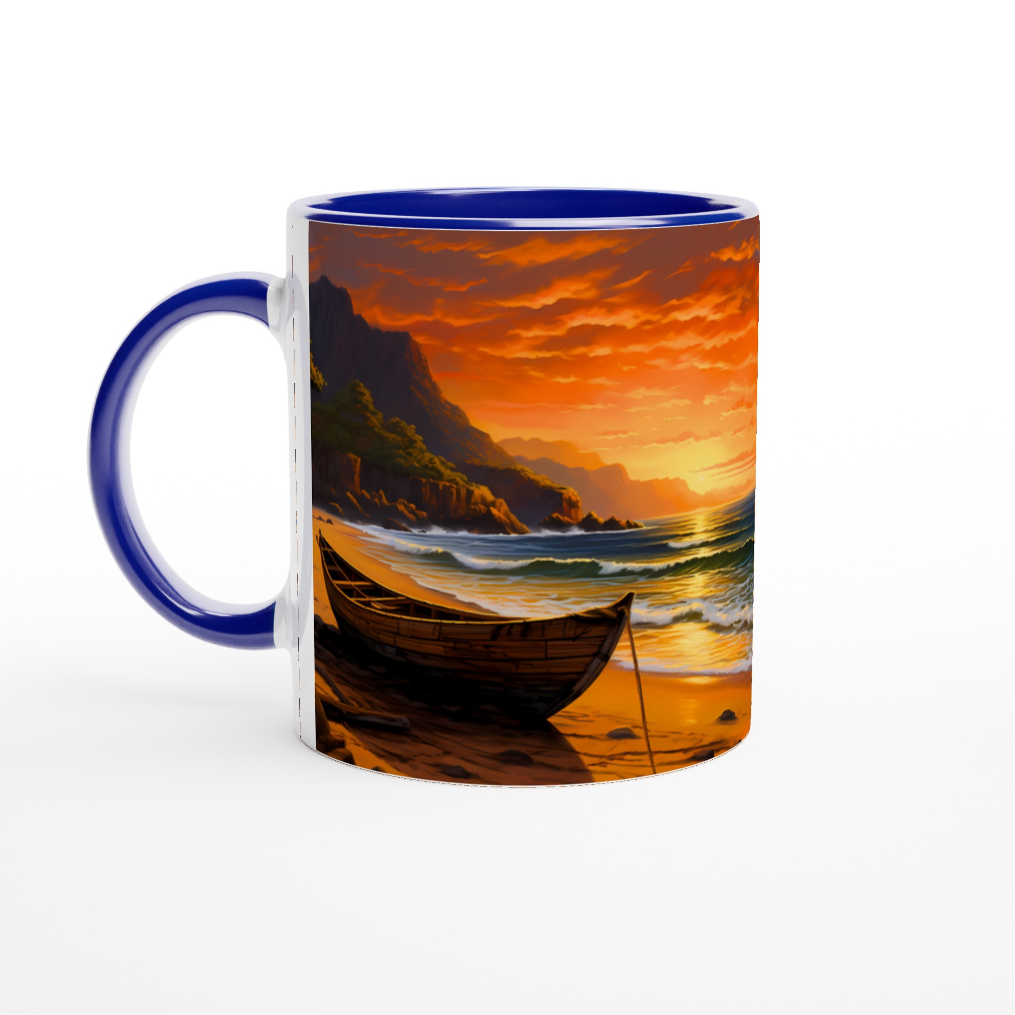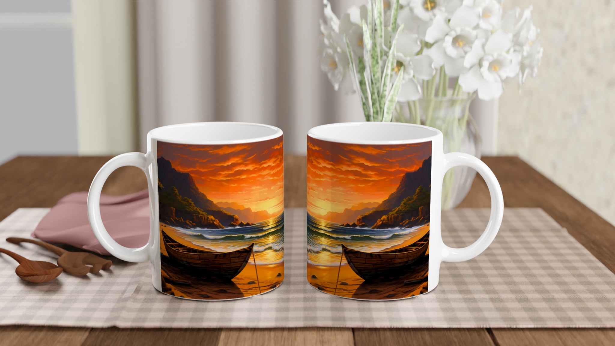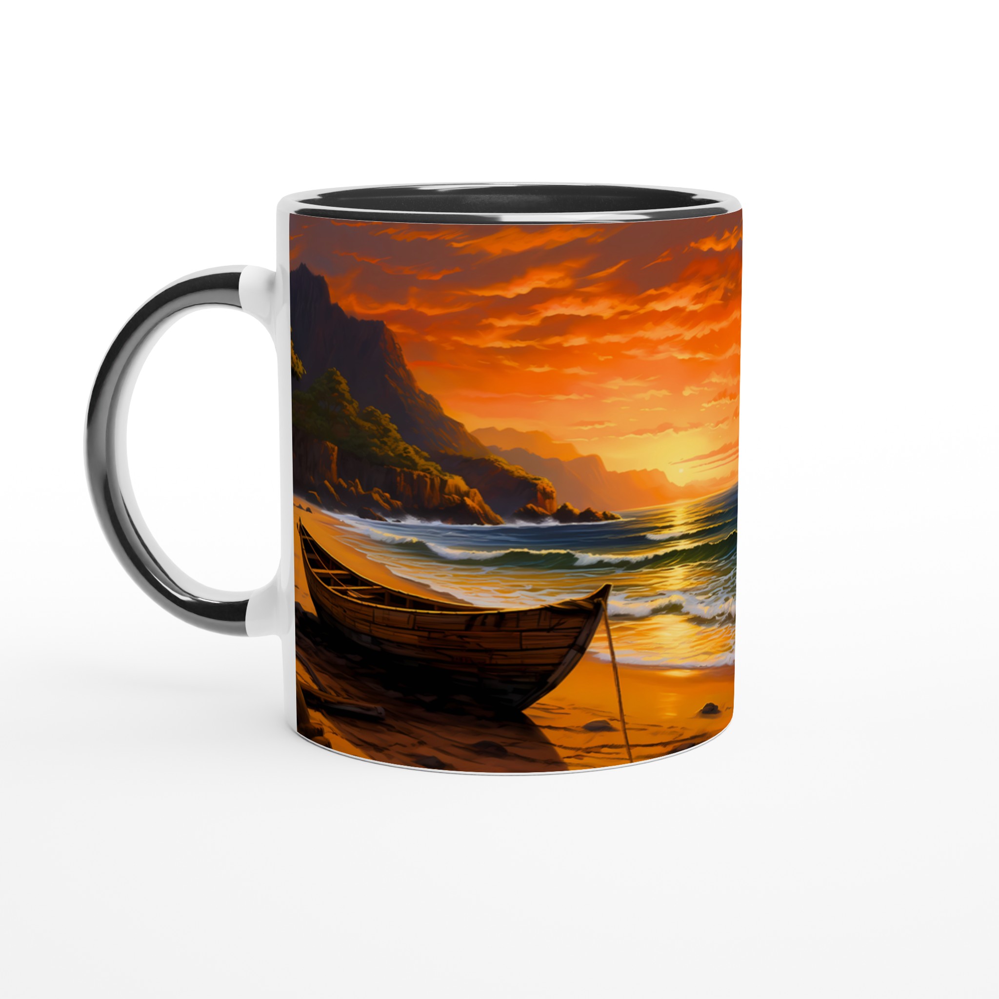 Låt dig svepas med till en lugn strand med vår keramiska mugg, som fångar den hisnande skönheten av en solnedgång över havet. Med dramatiska orange och guldiga skyar som reflekteras i vågorna, inbjuder denna mugg till en stunds avkoppling. De två båtarna som vilar på stranden förstärker känslan av frid och äventyr.