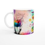 Den här stilrena keramiska muggen blir snabbt en vardagsfavorit. Perfekt för morgonkaffet, kvällens varma choklad eller när du bara vill njuta av en kopp te. Den blanka vita ytan gör att trycken framhävs med klara och levande färger, som håller sig fina även efter många turer i mikron och diskmaskinen.