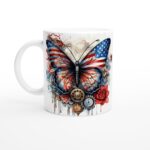 Den här stilrena keramiska muggen blir snabbt en vardagsfavorit. Perfekt för morgonkaffet, kvällens varma choklad eller när du bara vill njuta av en kopp te. Med sitt unika tryck som föreställer en steampunk-inspirerad amerikansk flagga – komplett med intrikata kugghjul, metalliska detaljer och en akvarell-estetik – blir varje sipp en upplevelse. Den blanka vita ytan gör att trycken framhävs med klara och levande färger, som håller sig fina även efter många turer i mikron och diskmaskinen.