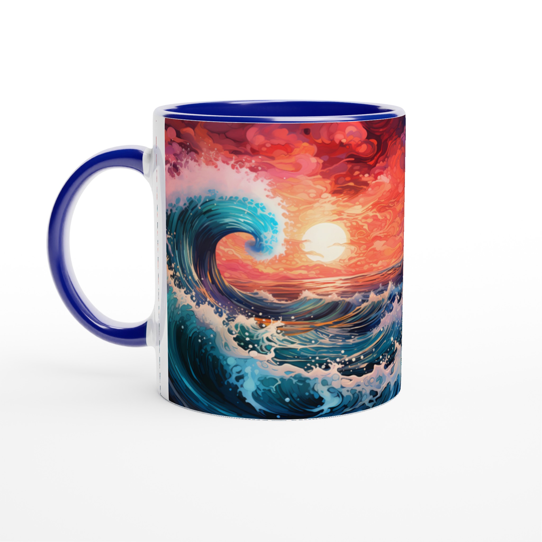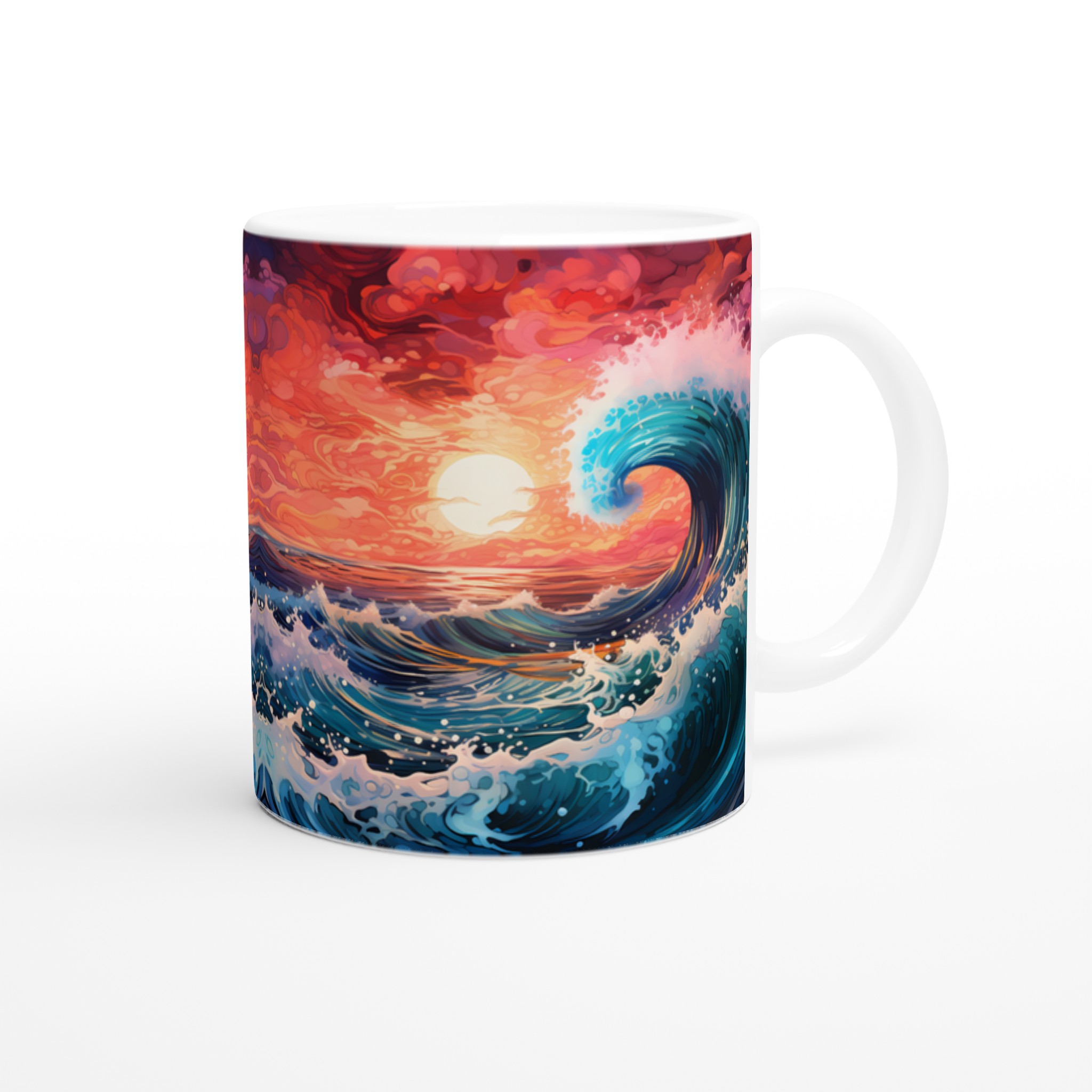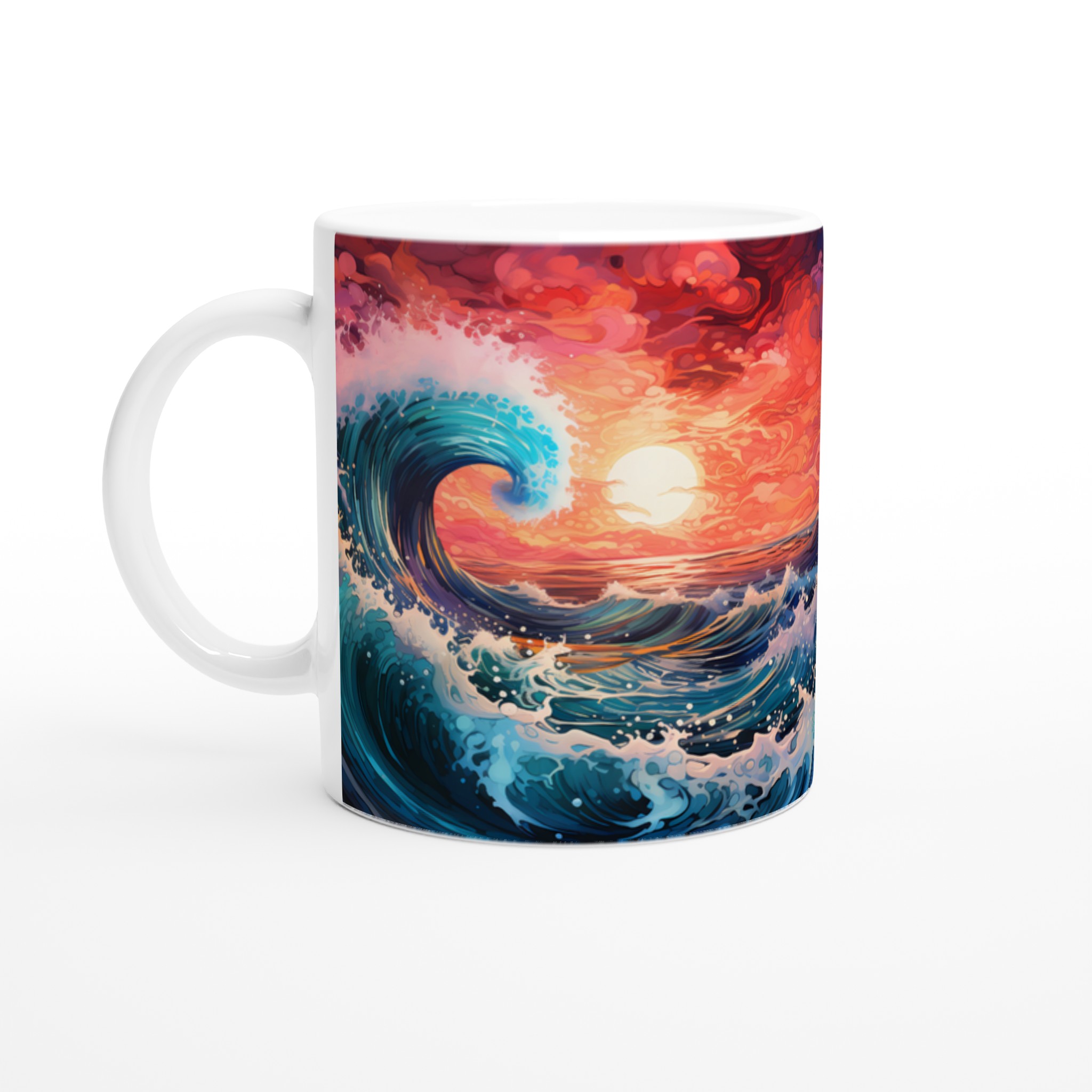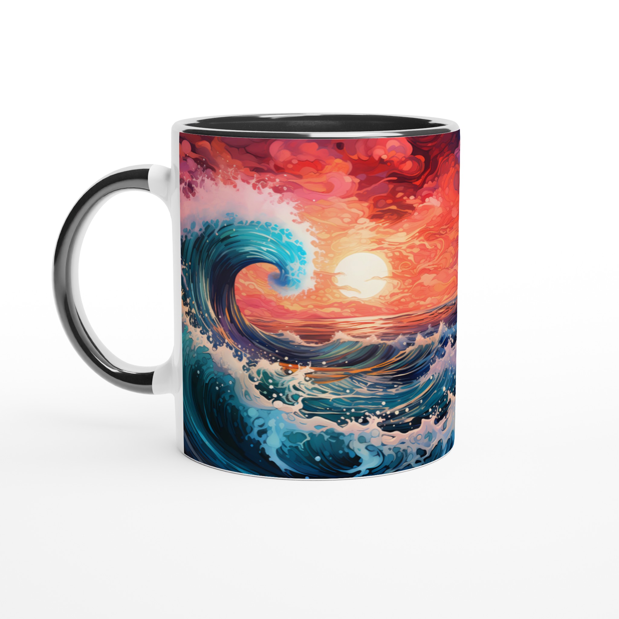 Låt dig svepas med av de majestätiska ”Stormy Sunset Waves” varje gång du tar en kopp. Denna keramiska mugg är prydd med ett dramatiskt och färgstarkt konstverk som fångar ögonblicket när solen möter det stormiga havet, med intensiva vågor i turkos och djupt blått mot en himmel i brinnande rött och orange. Det är den perfekta vardagsfavoriten för morgonkaffet, kvällens varma choklad eller när du bara vill njuta av en kopp te.