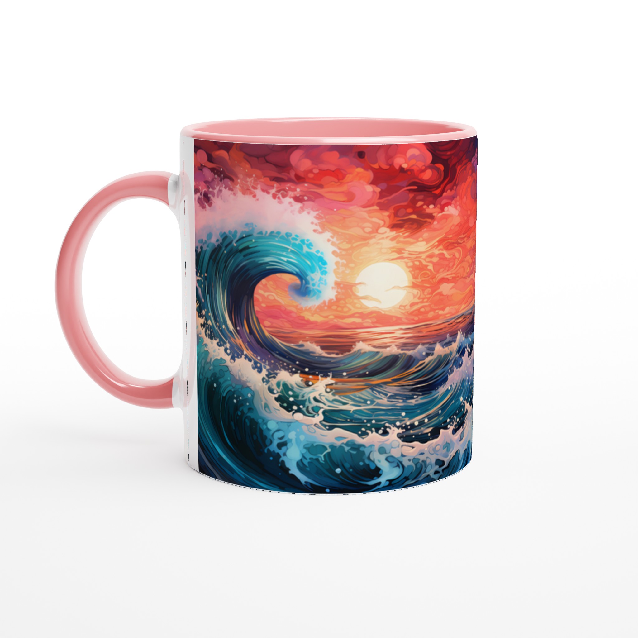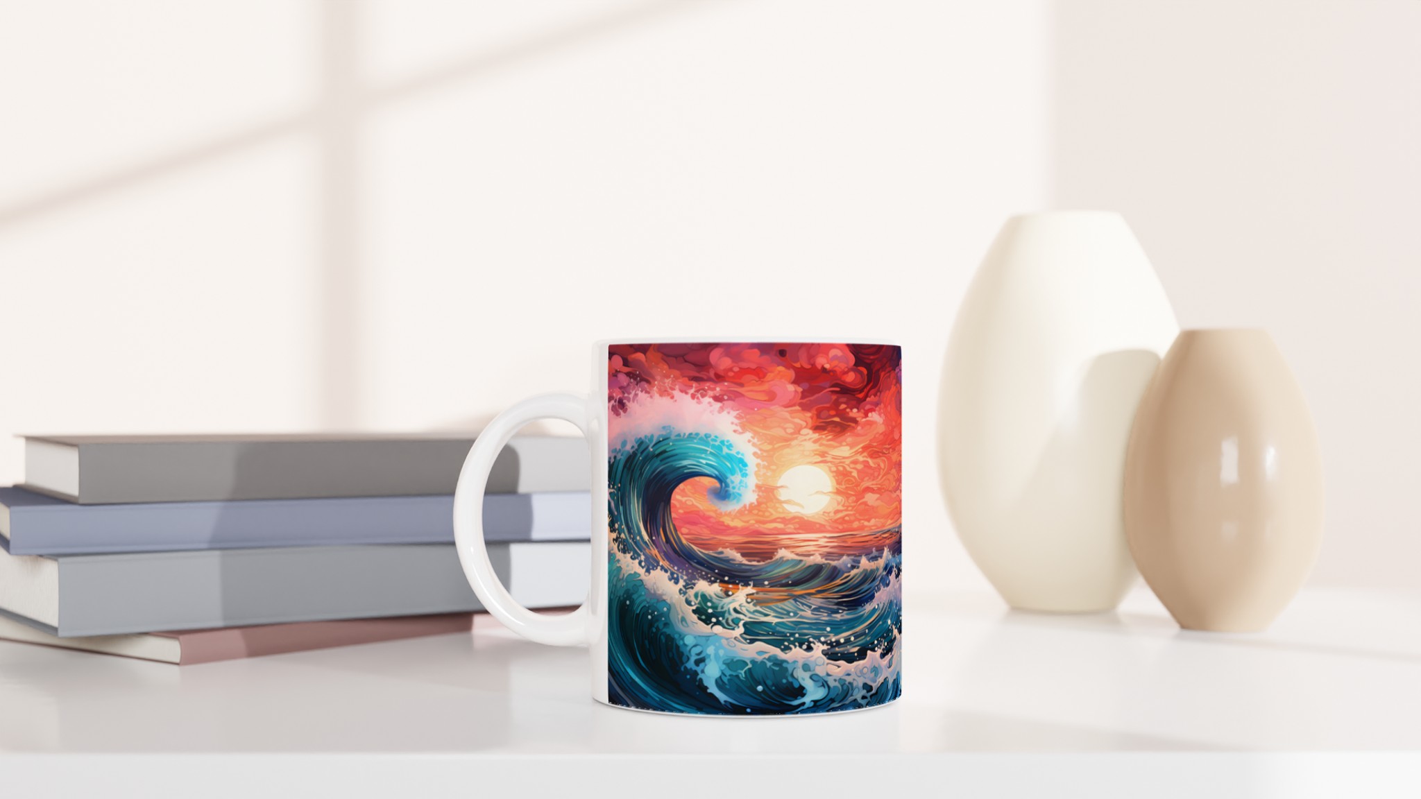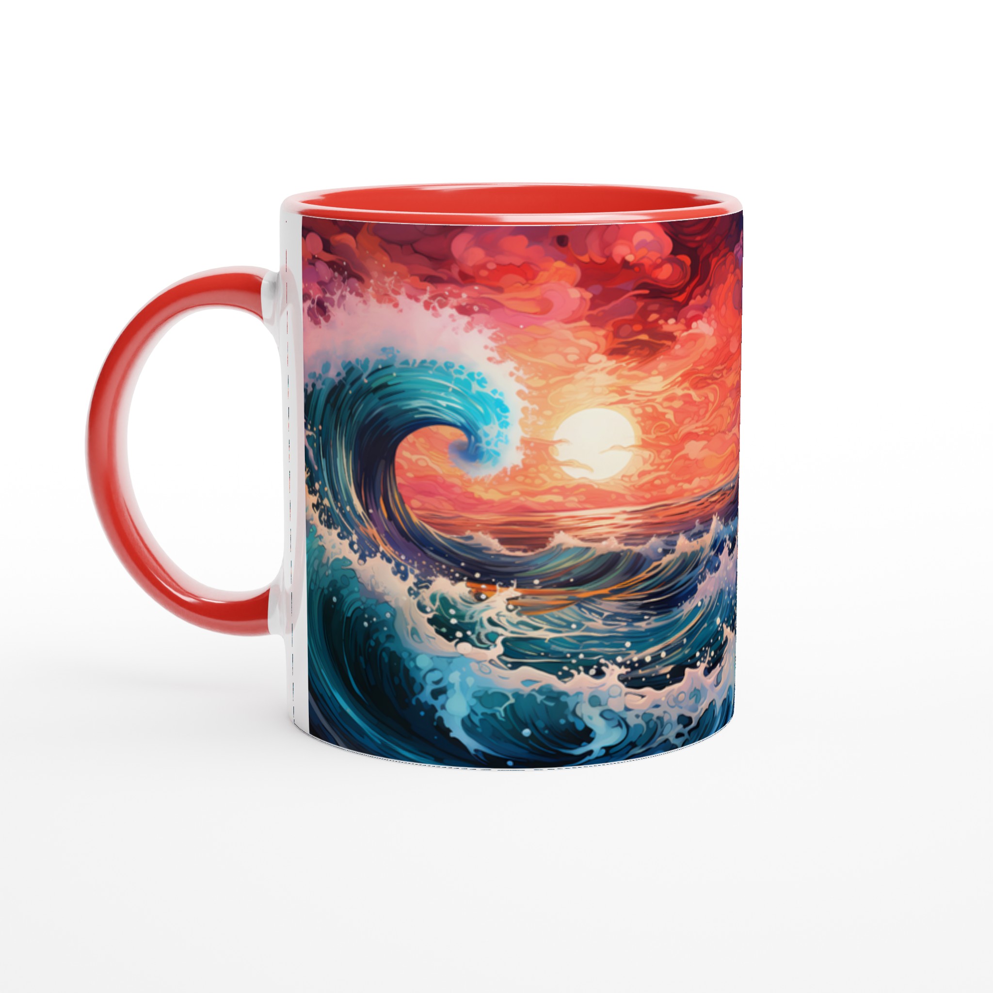 Låt dig svepas med av de majestätiska ”Stormy Sunset Waves” varje gång du tar en kopp. Denna keramiska mugg är prydd med ett dramatiskt och färgstarkt konstverk som fångar ögonblicket när solen möter det stormiga havet, med intensiva vågor i turkos och djupt blått mot en himmel i brinnande rött och orange. Det är den perfekta vardagsfavoriten för morgonkaffet, kvällens varma choklad eller när du bara vill njuta av en kopp te.
