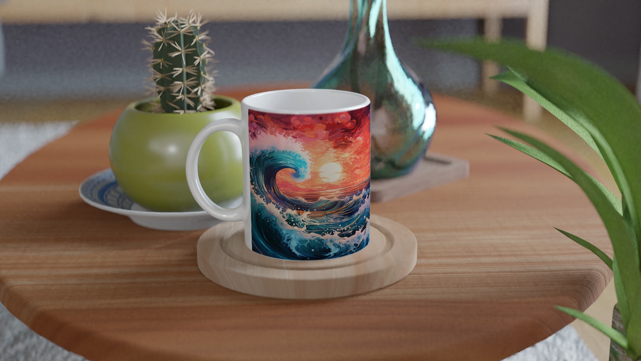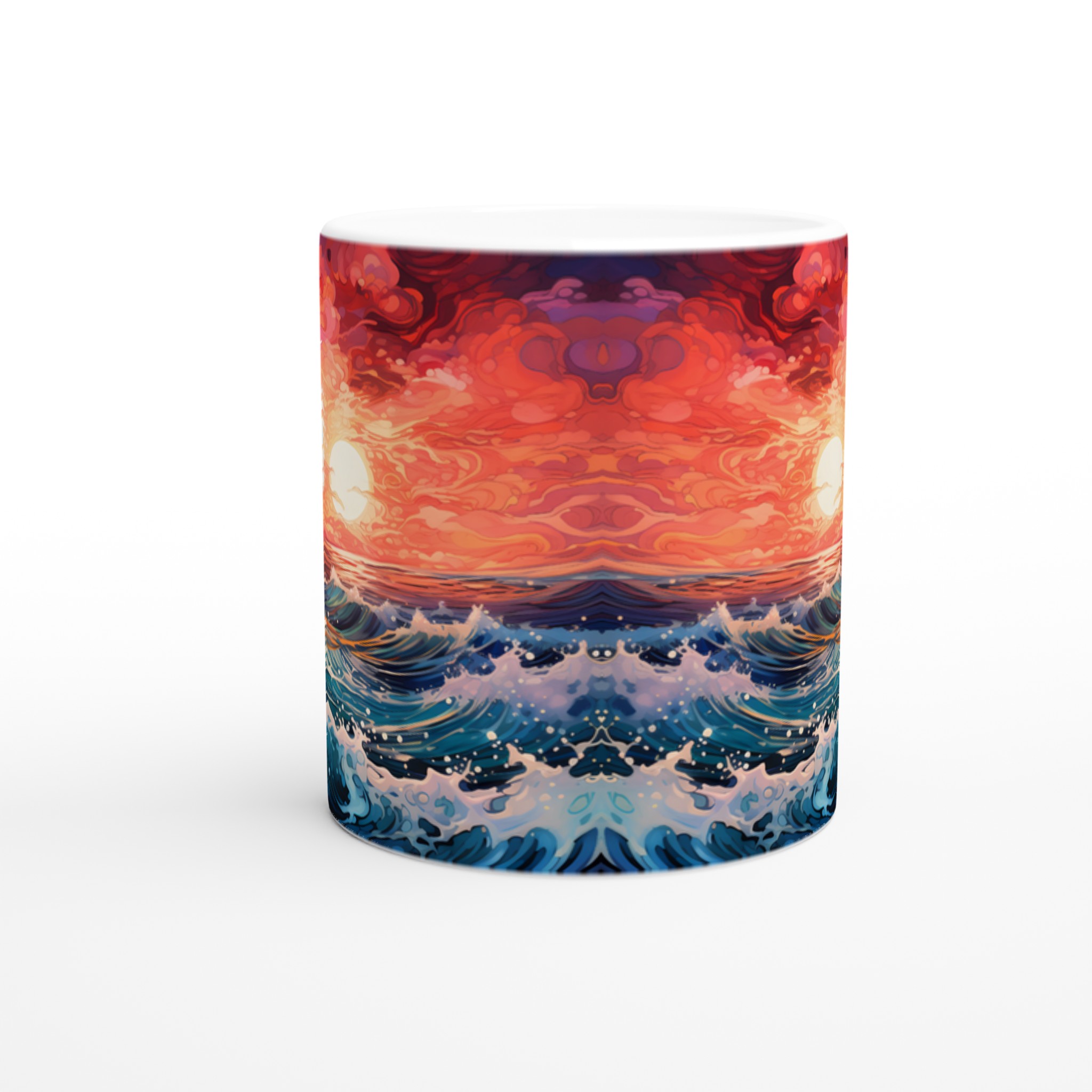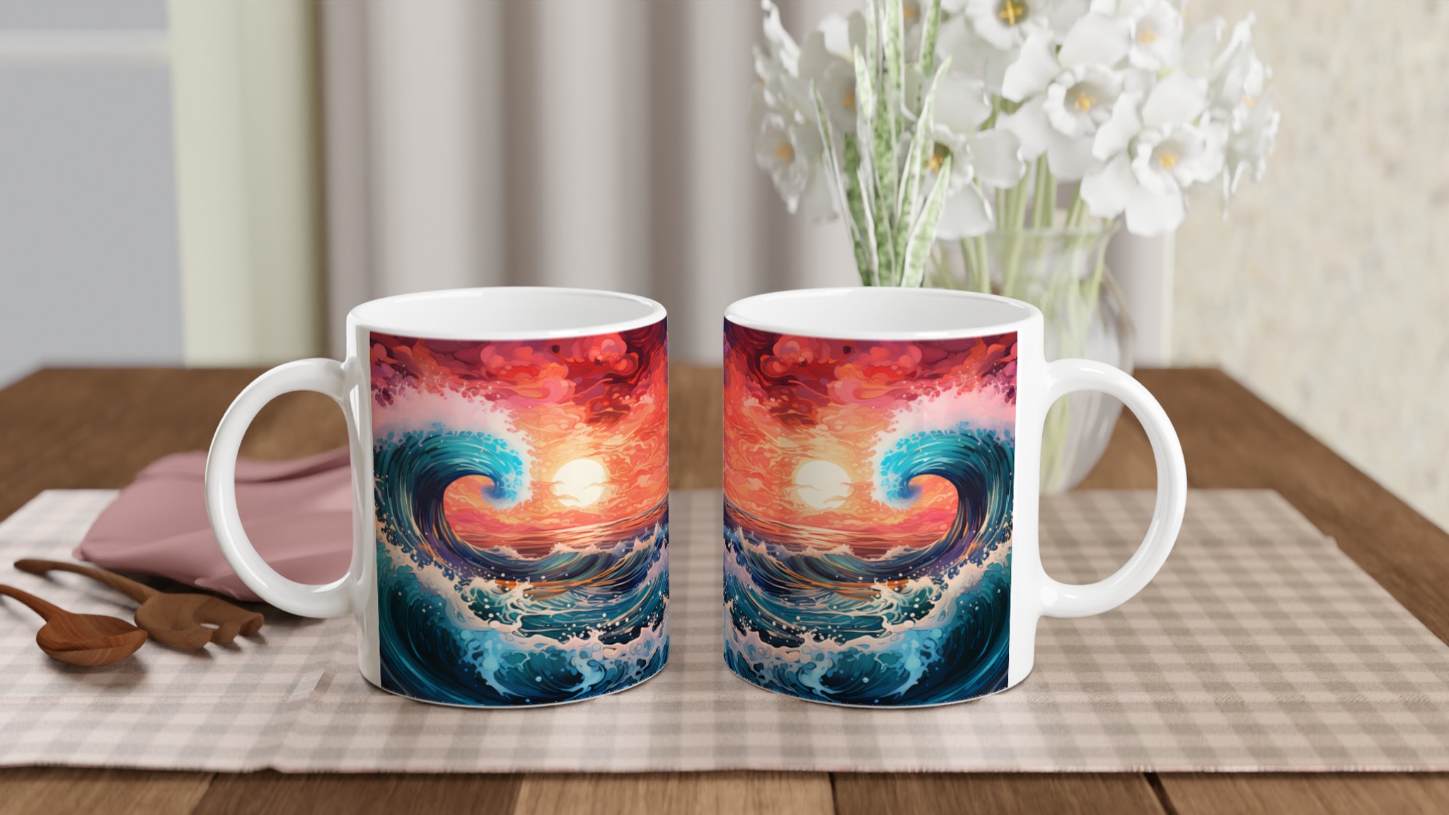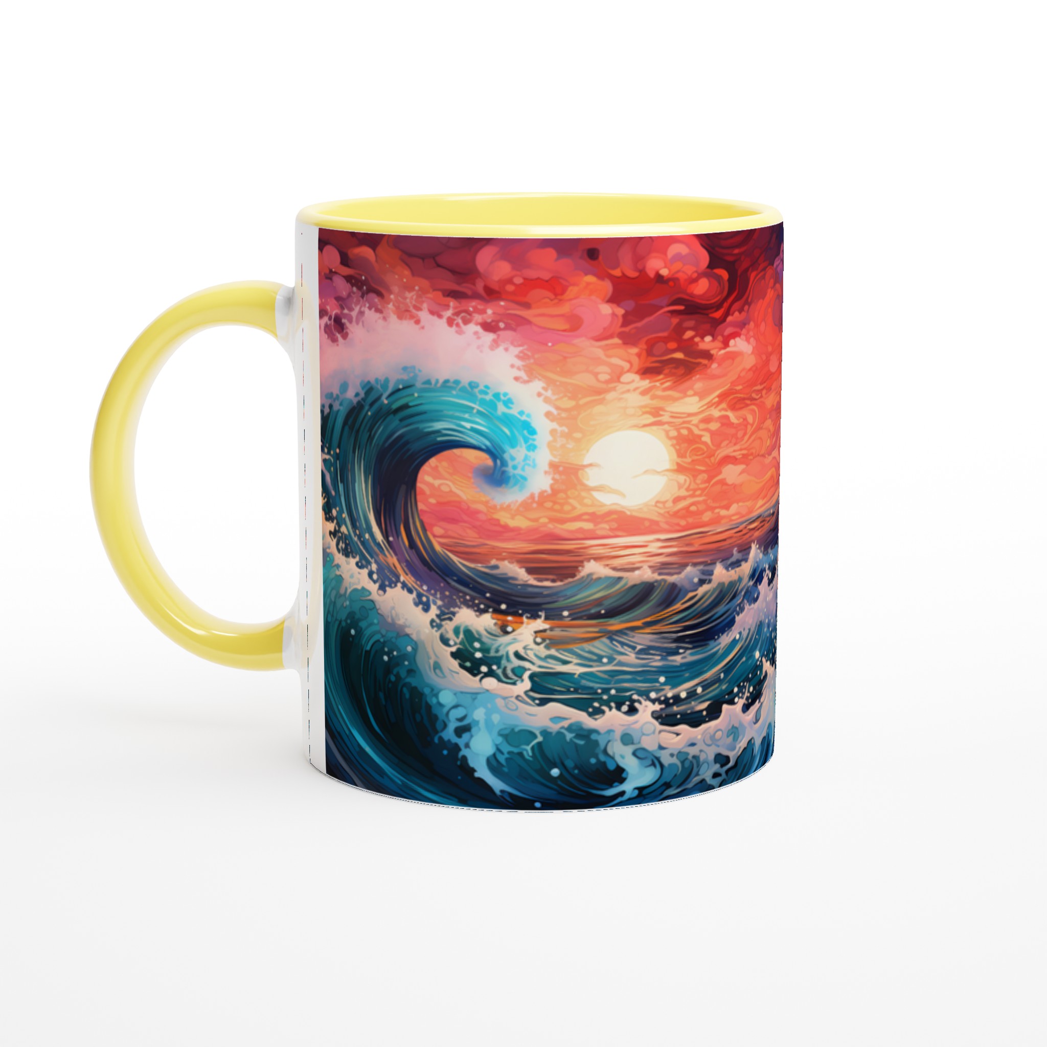 Låt dig svepas med av de majestätiska ”Stormy Sunset Waves” varje gång du tar en kopp. Denna keramiska mugg är prydd med ett dramatiskt och färgstarkt konstverk som fångar ögonblicket när solen möter det stormiga havet, med intensiva vågor i turkos och djupt blått mot en himmel i brinnande rött och orange. Det är den perfekta vardagsfavoriten för morgonkaffet, kvällens varma choklad eller när du bara vill njuta av en kopp te.