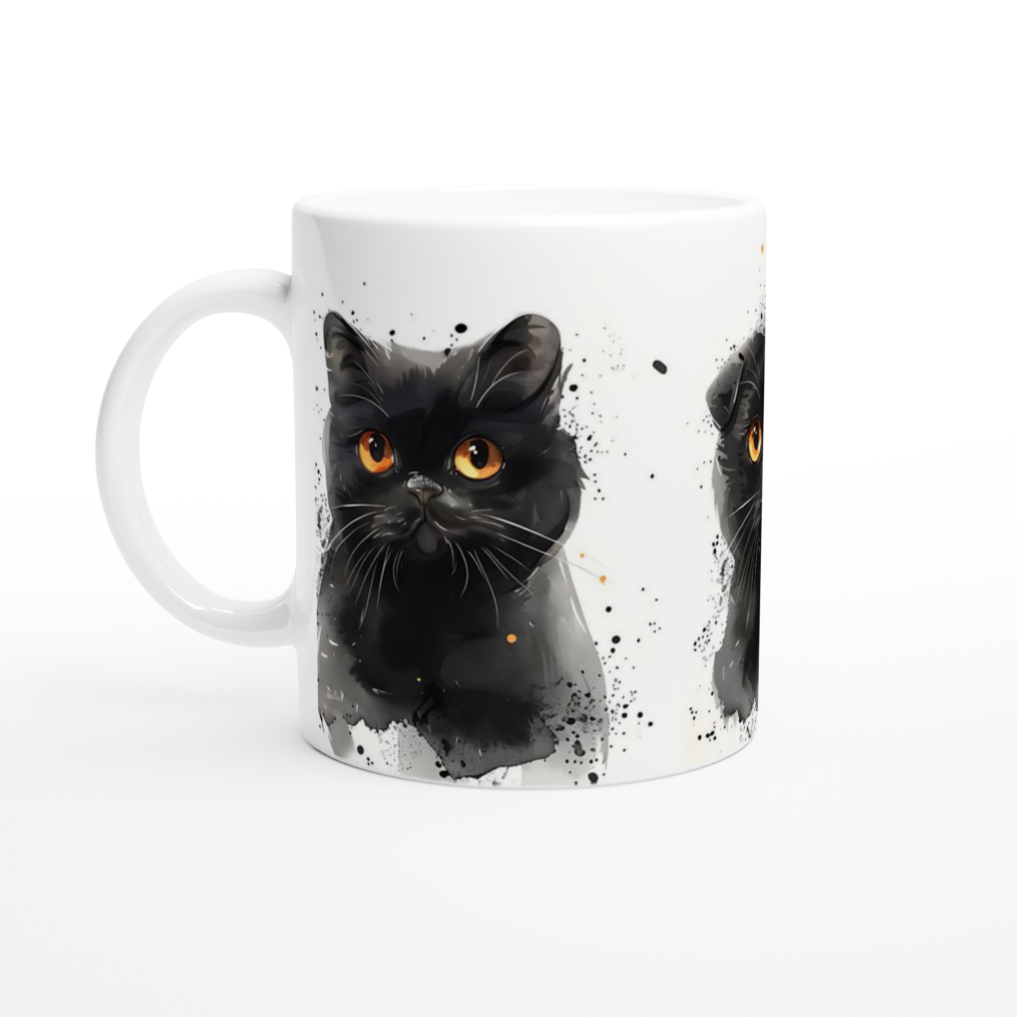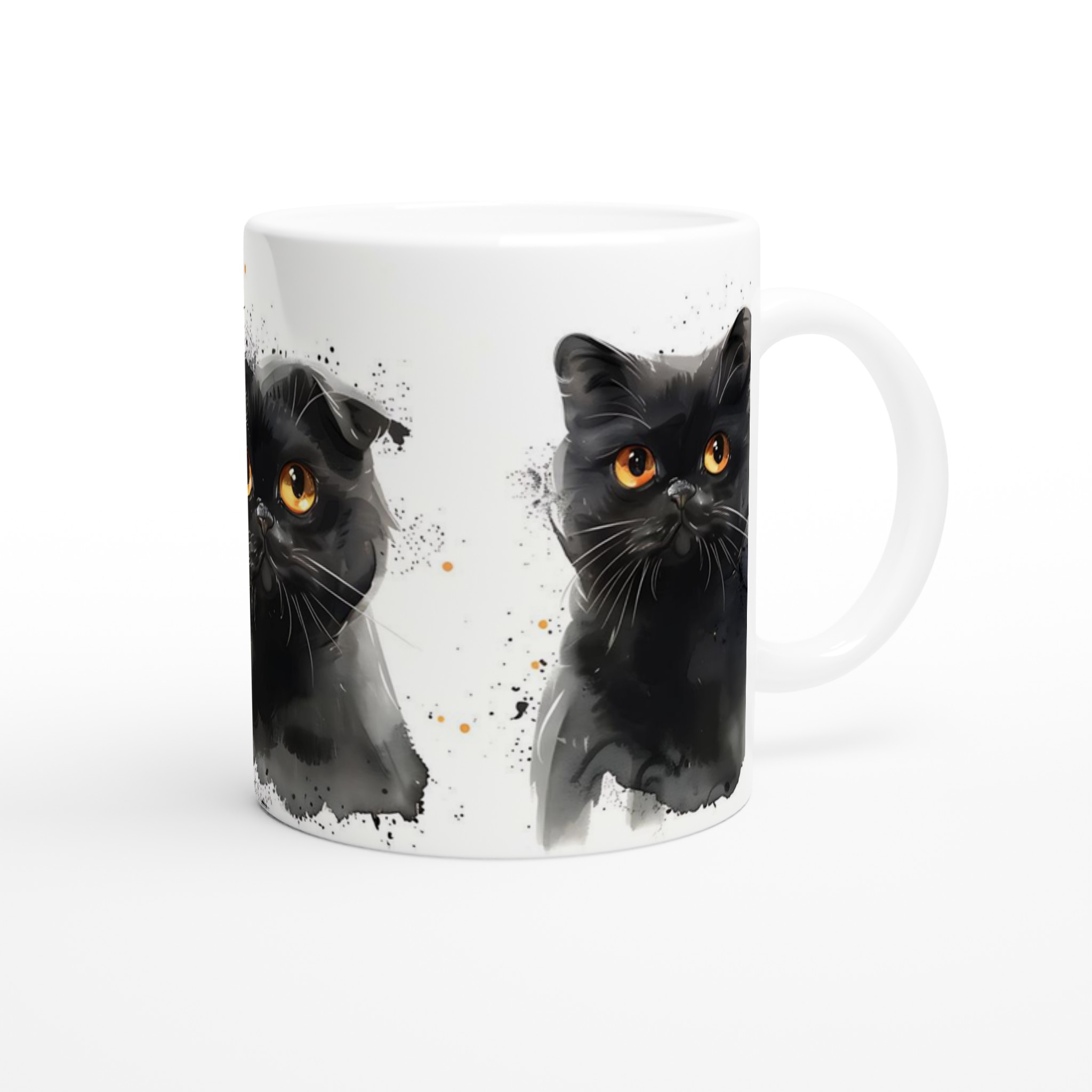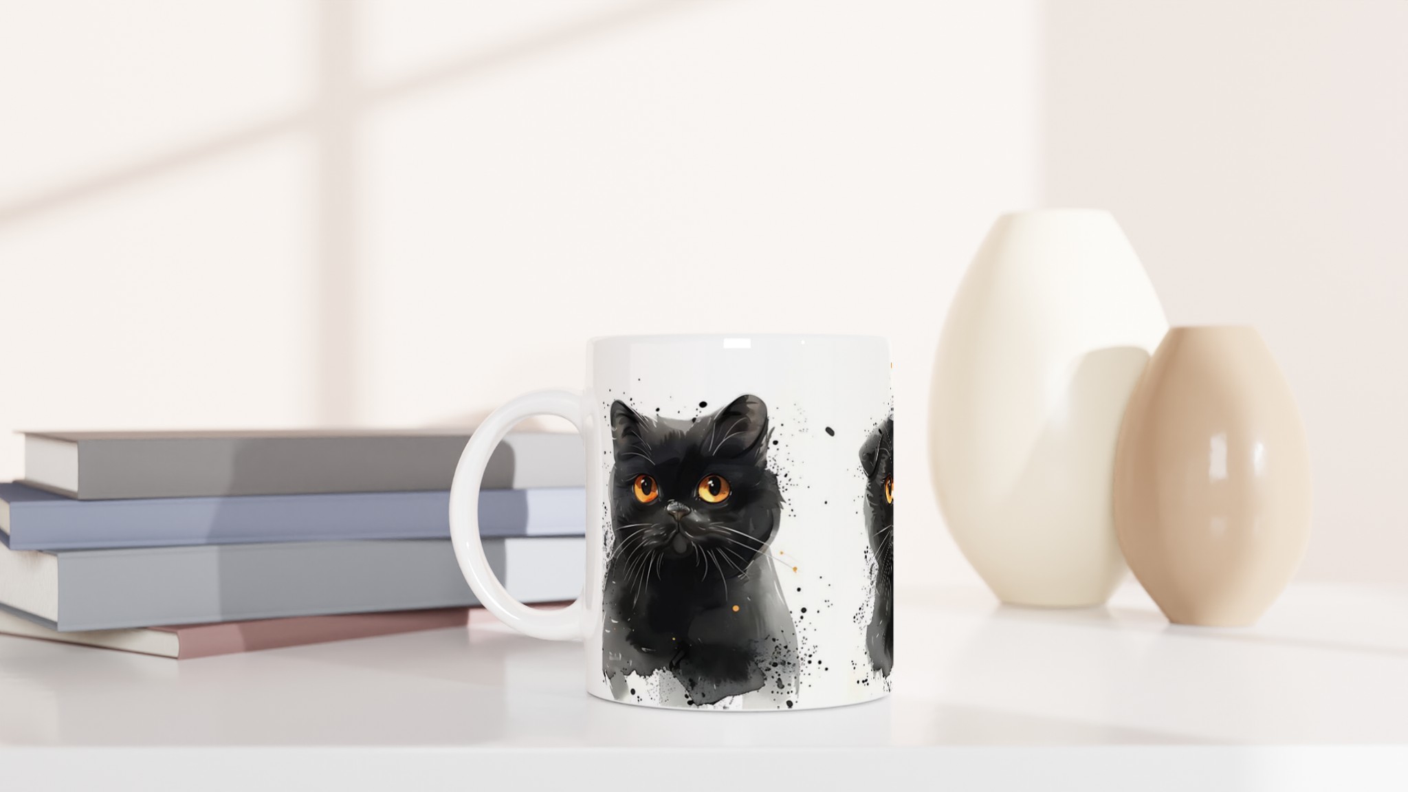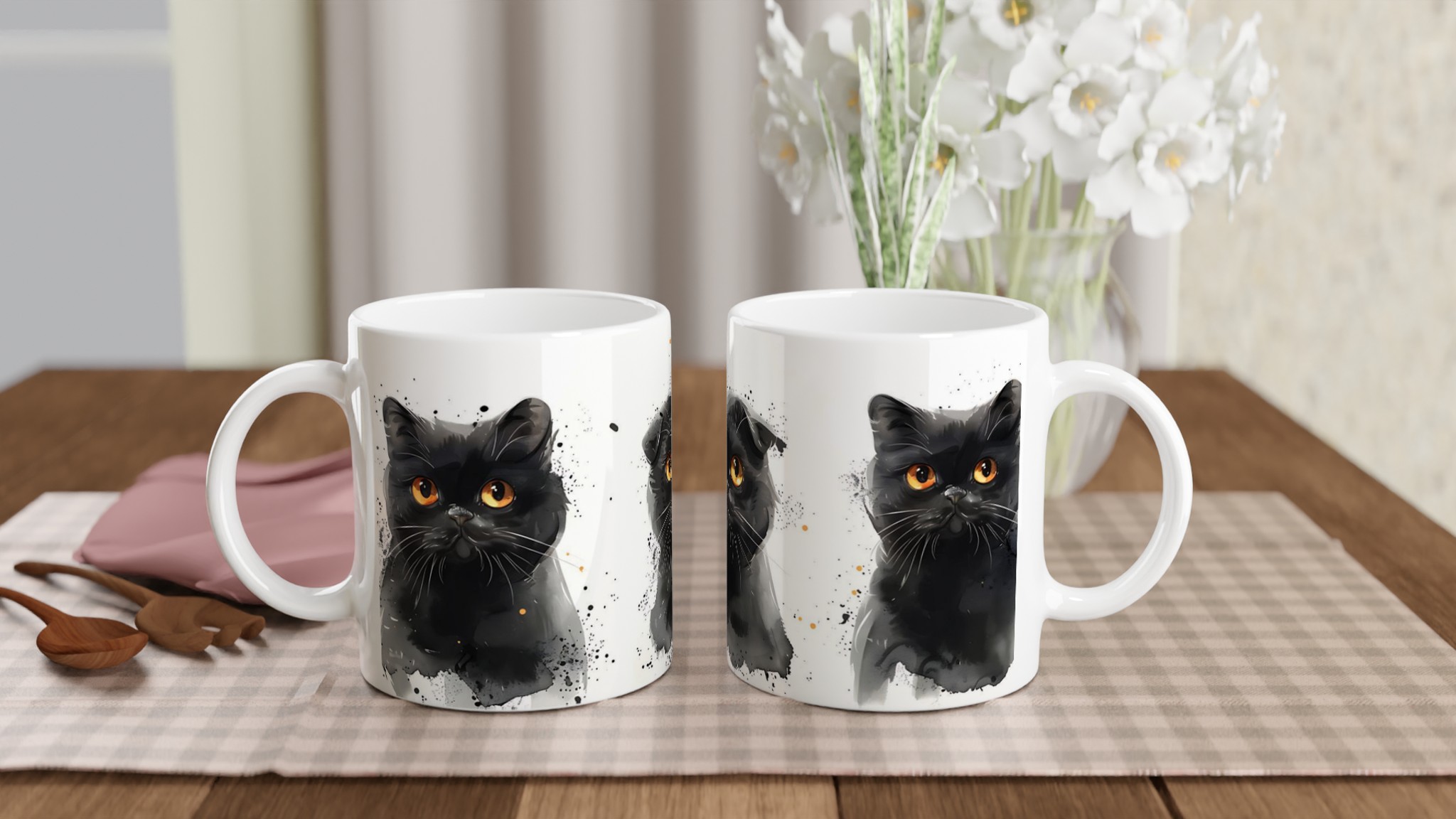 Låt den mystiska charmen hos dessa underbara svarta katter lysa upp din dag! Denna mugg fångar essensen av lekfull elegans med sin akvarellkonst, där de intensiva orange ögonen kontrasterar vackert mot den svarta pälsen och de stänkande färgdetaljerna.