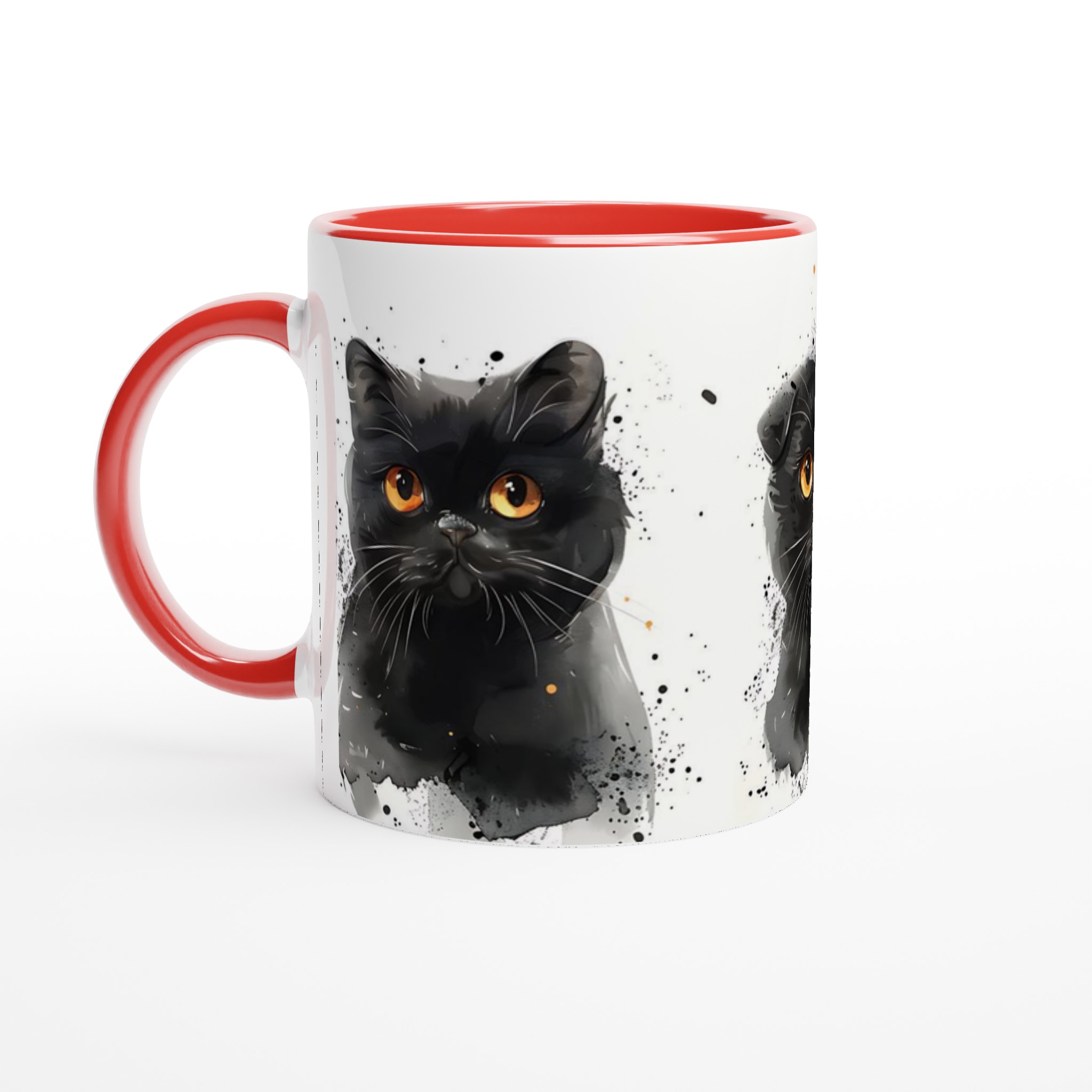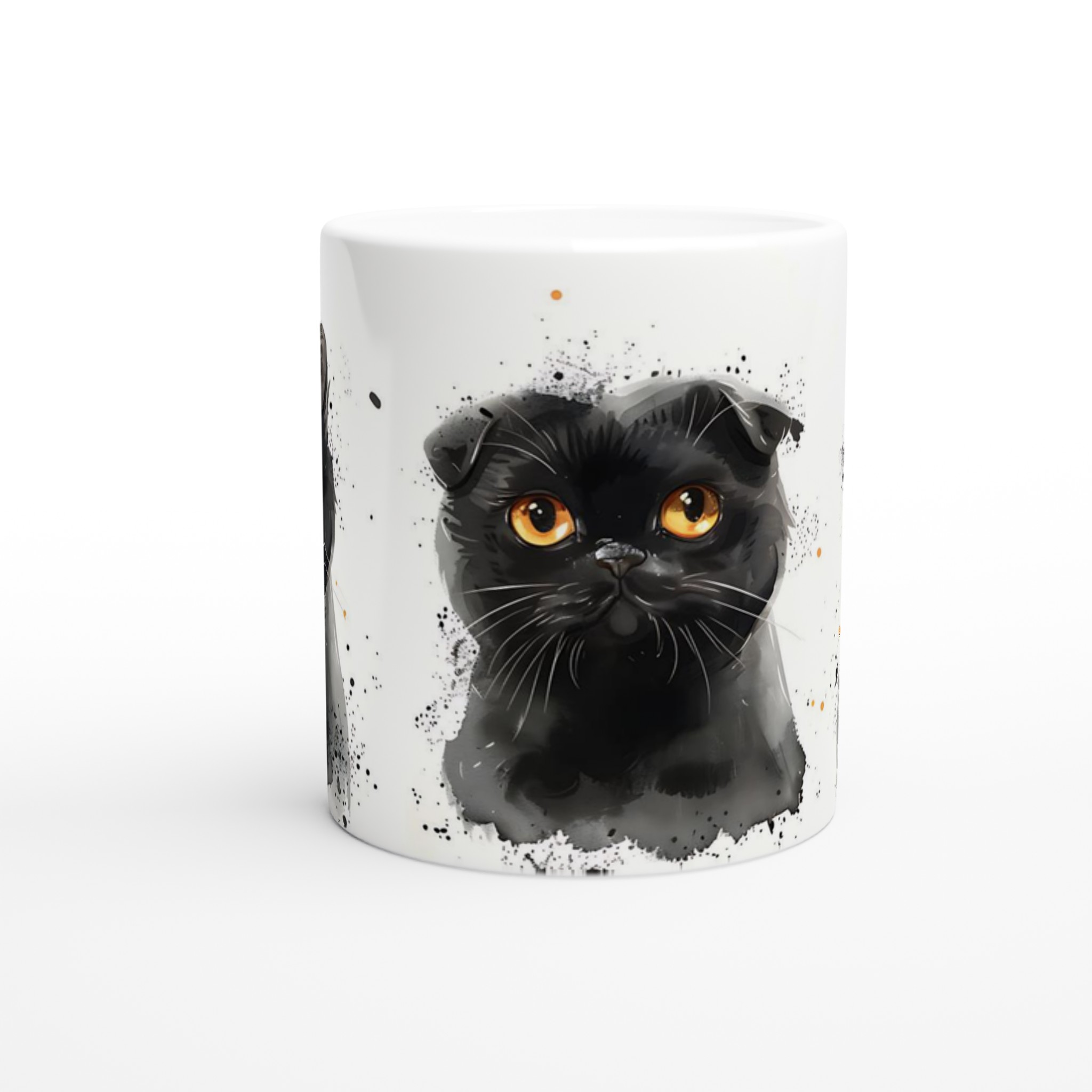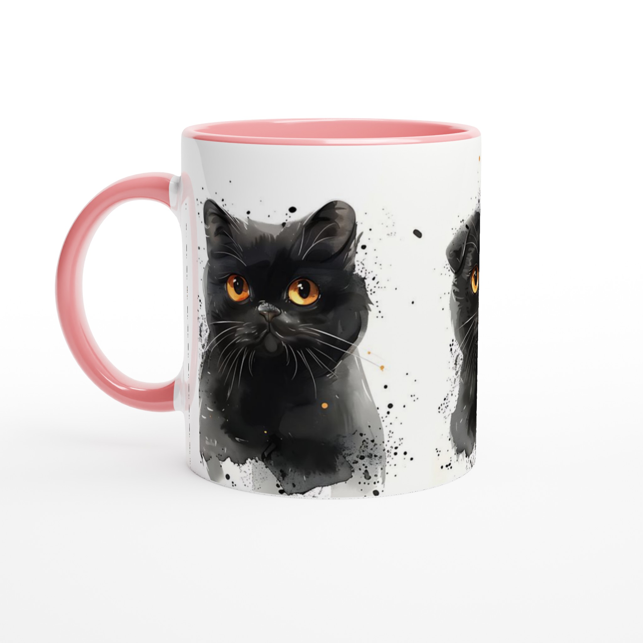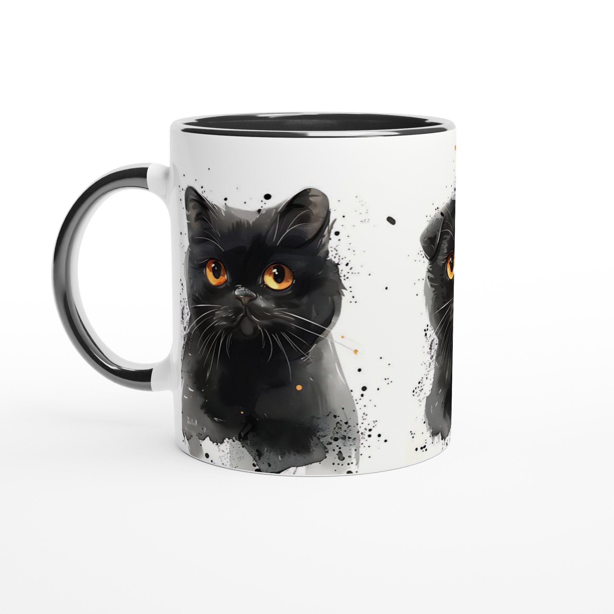 Låt den mystiska charmen hos dessa underbara svarta katter lysa upp din dag! Denna mugg fångar essensen av lekfull elegans med sin akvarellkonst, där de intensiva orange ögonen kontrasterar vackert mot den svarta pälsen och de stänkande färgdetaljerna.