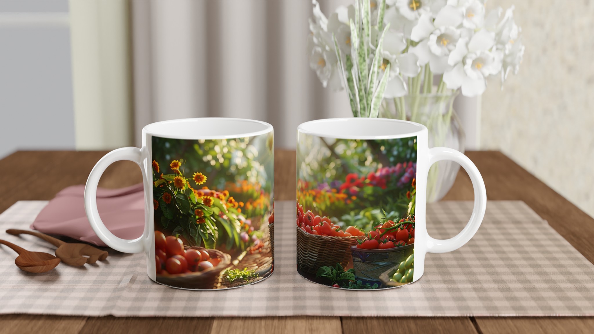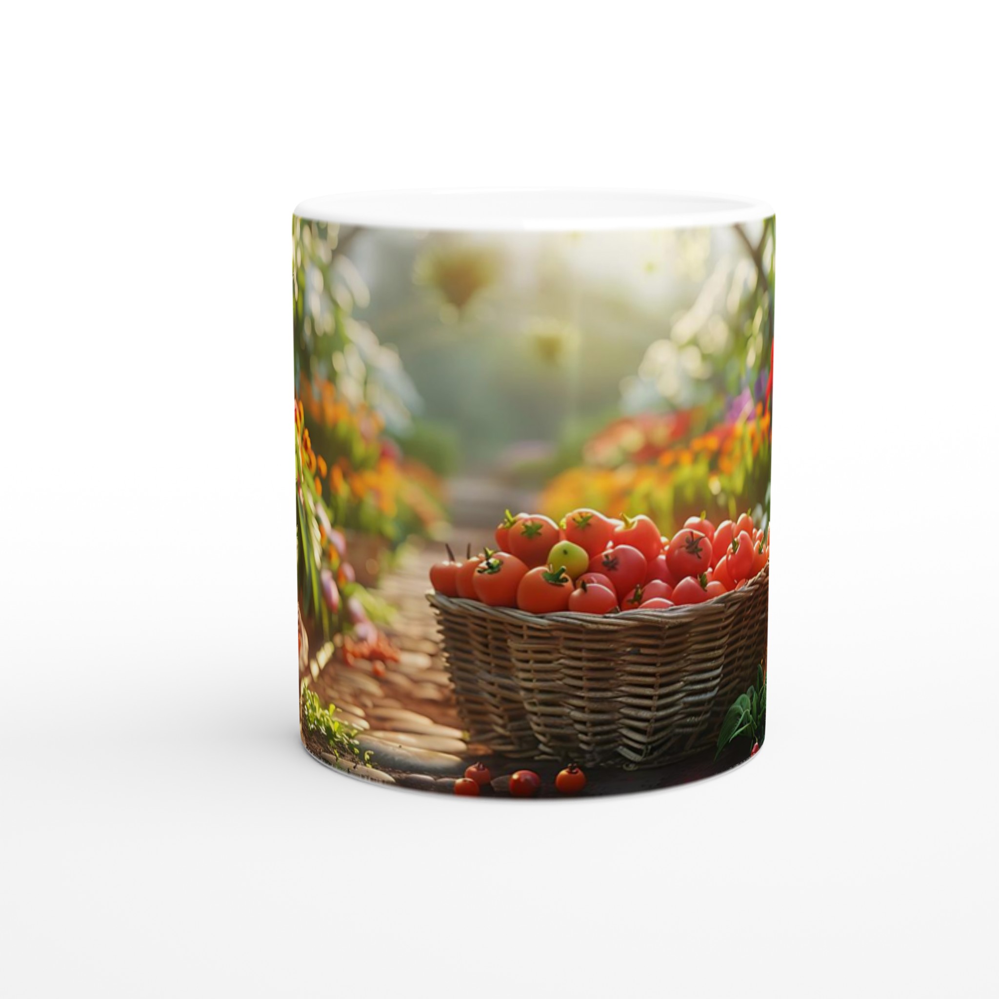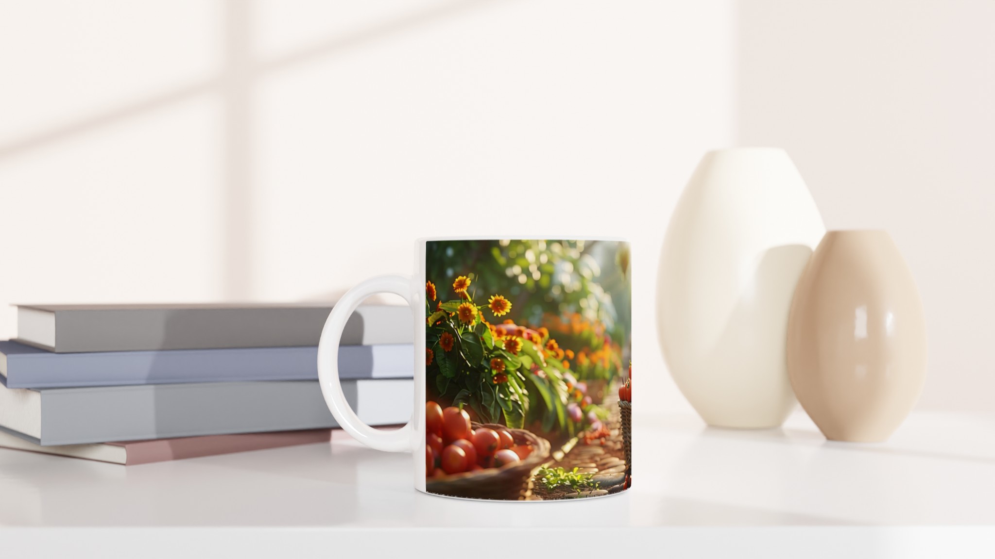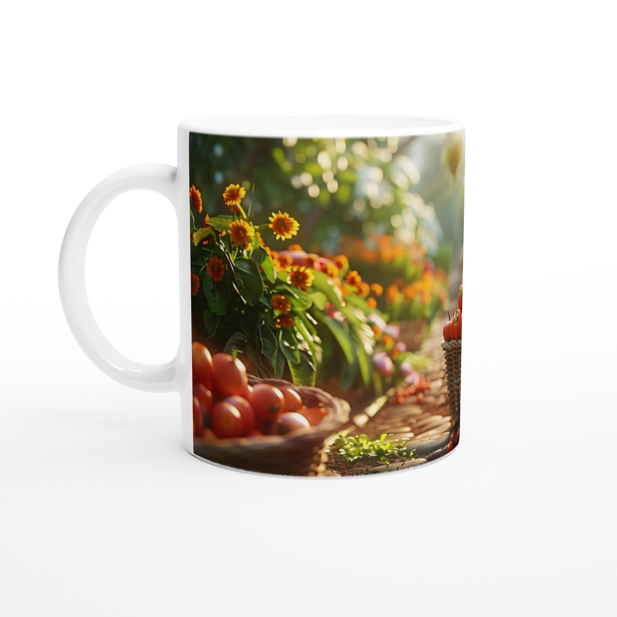 Vakna till liv med en mugg som fångar den lugna skönheten från en solbelyst trädgård, fylld med mogna tomater och blommande växter. Den här stilrena keramiska muggen blir snabbt en vardagsfavorit, perfekt för morgonkaffet, kvällens varma choklad eller när du bara vill njuta av en kopp te. Med sitt inspirerande motiv och en blank yta framhävs trycken med klara och levande färger, som håller sig fina även efter många turer i mikron och diskmaskinen.