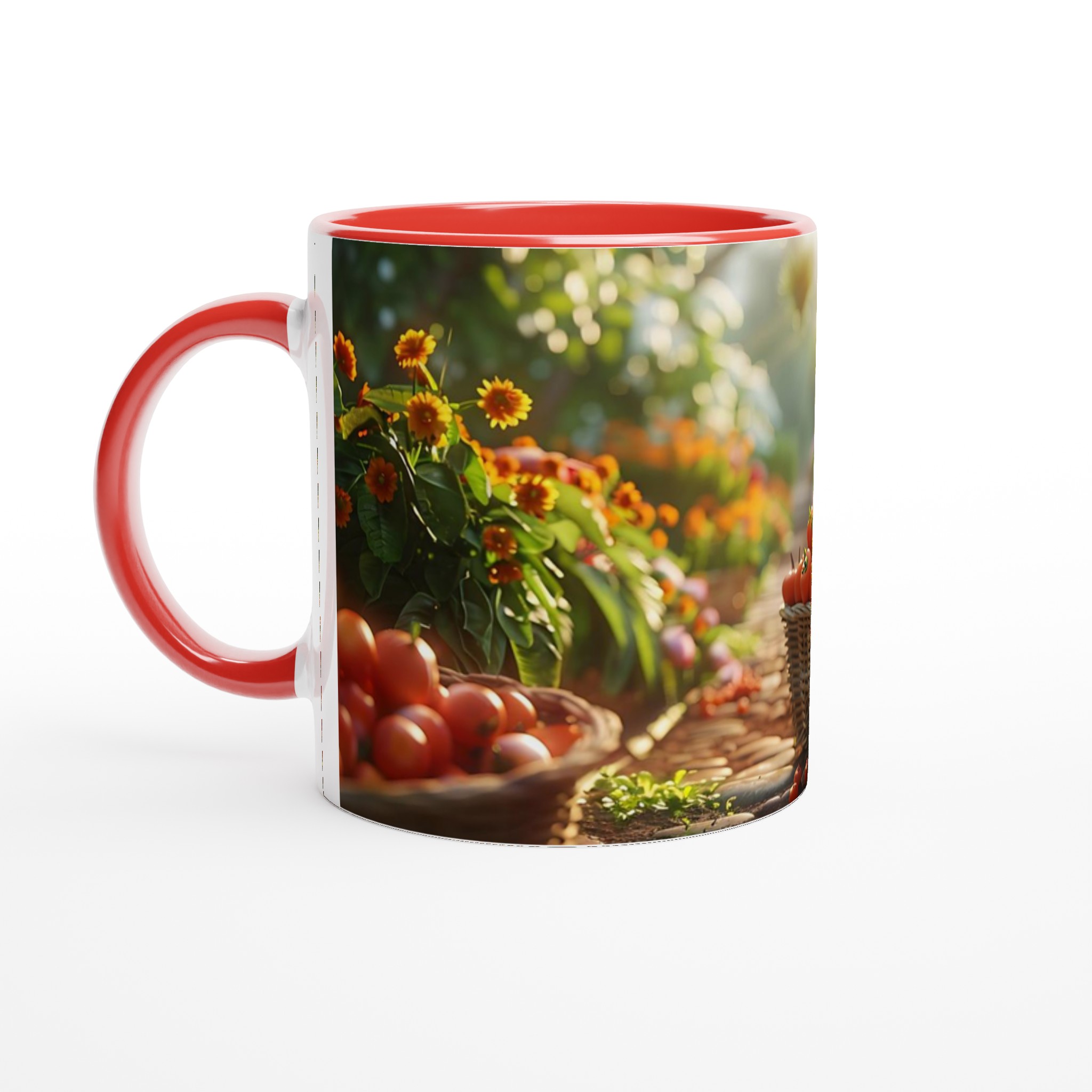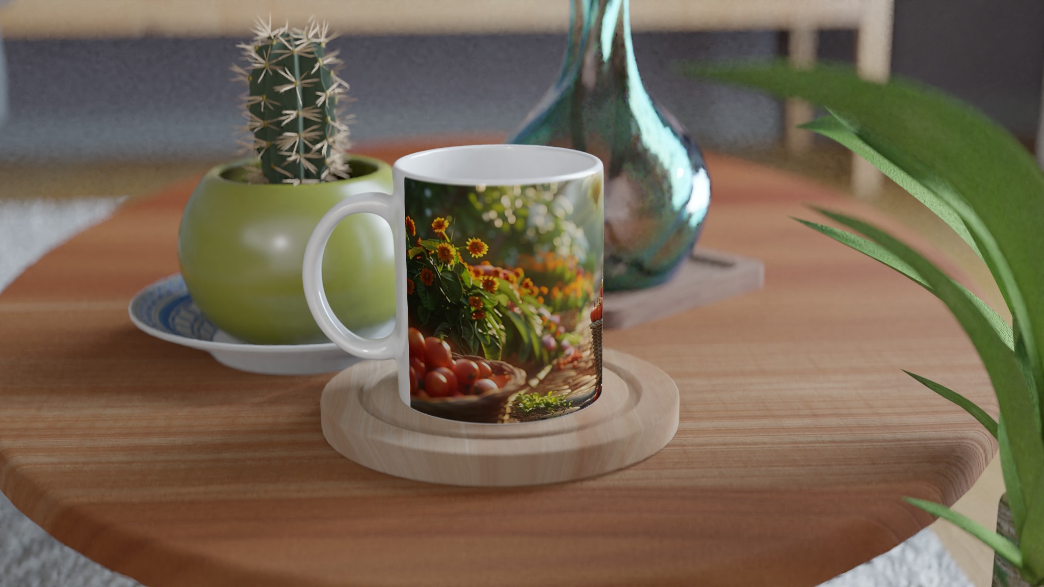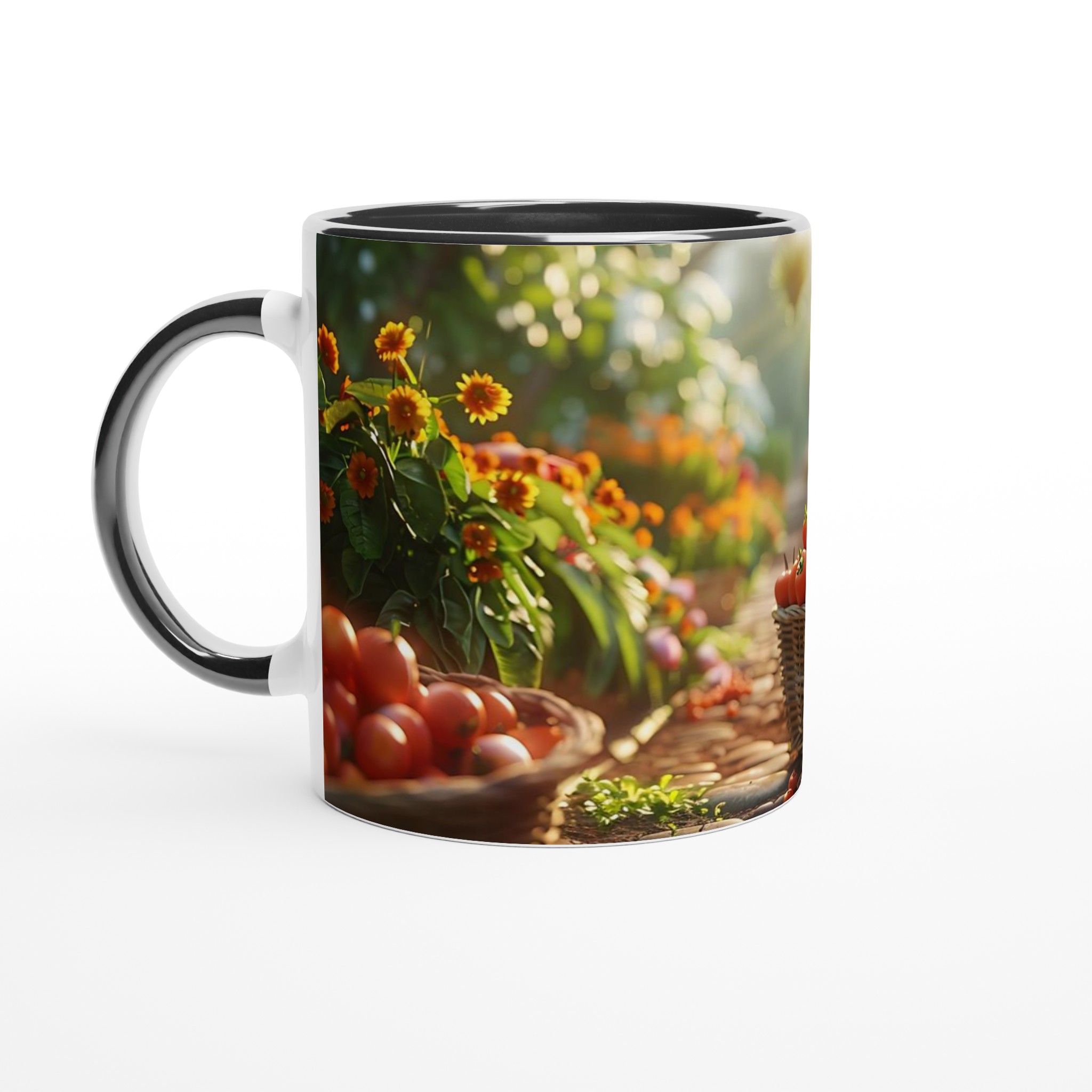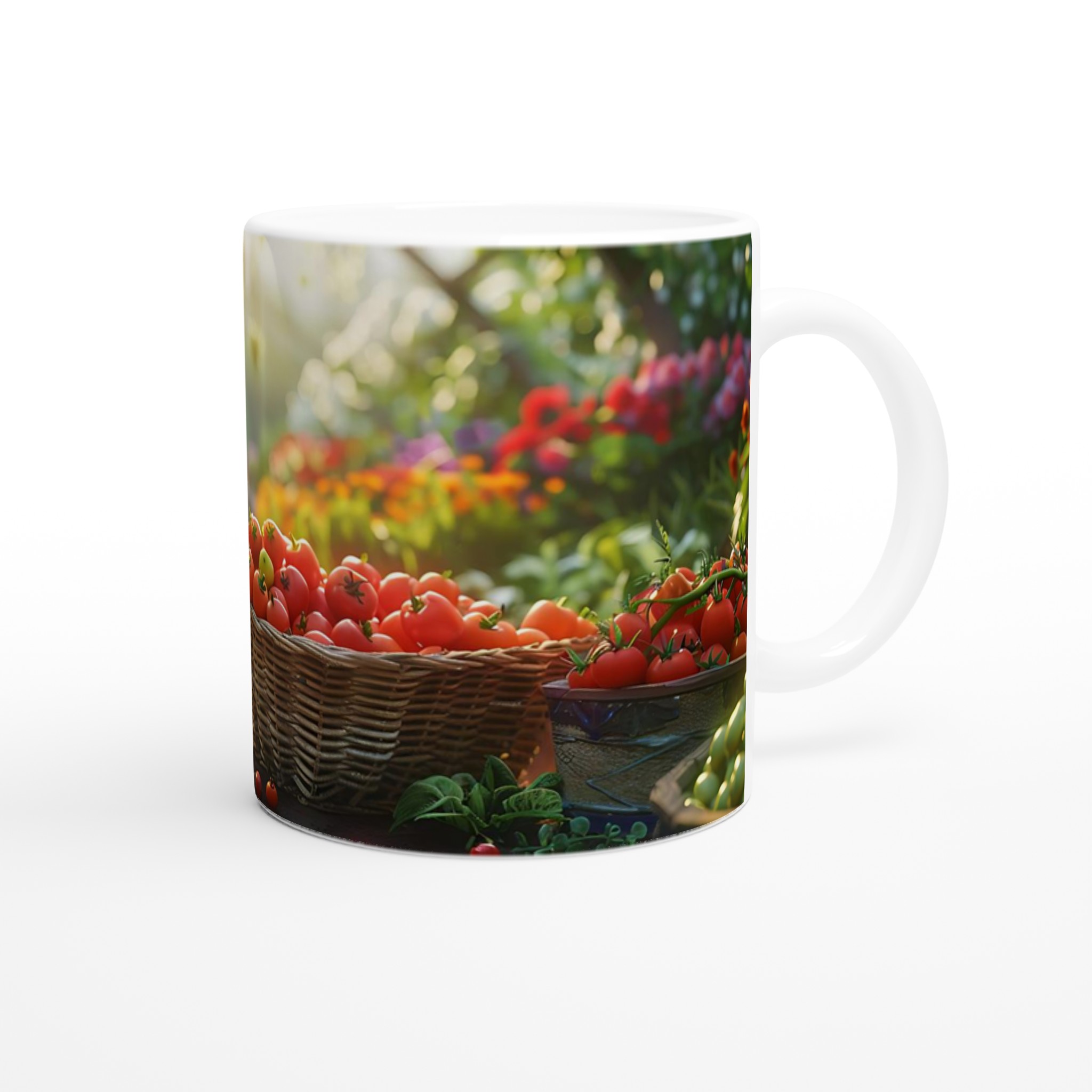 Vakna till liv med en mugg som fångar den lugna skönheten från en solbelyst trädgård, fylld med mogna tomater och blommande växter. Den här stilrena keramiska muggen blir snabbt en vardagsfavorit, perfekt för morgonkaffet, kvällens varma choklad eller när du bara vill njuta av en kopp te. Med sitt inspirerande motiv och en blank yta framhävs trycken med klara och levande färger, som håller sig fina även efter många turer i mikron och diskmaskinen.