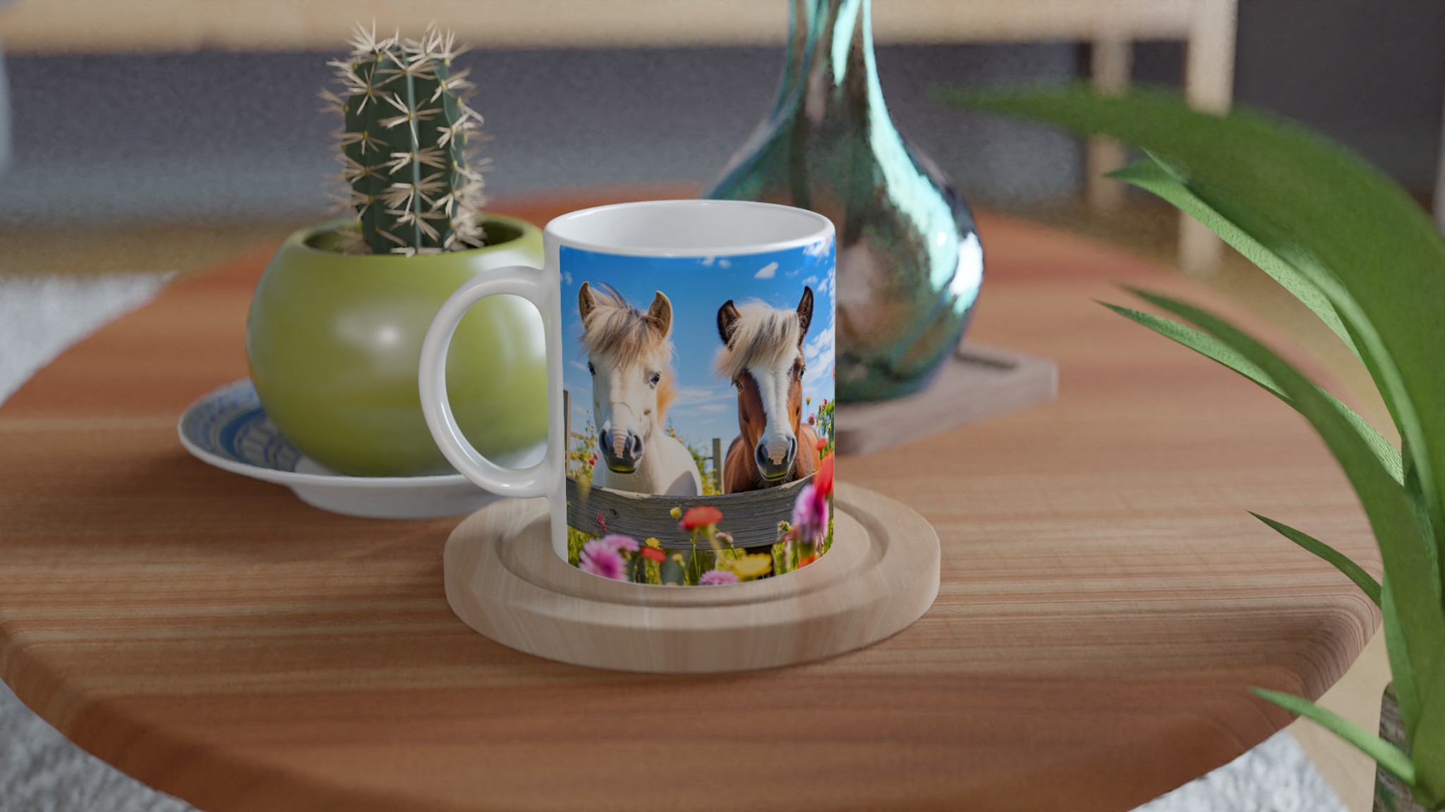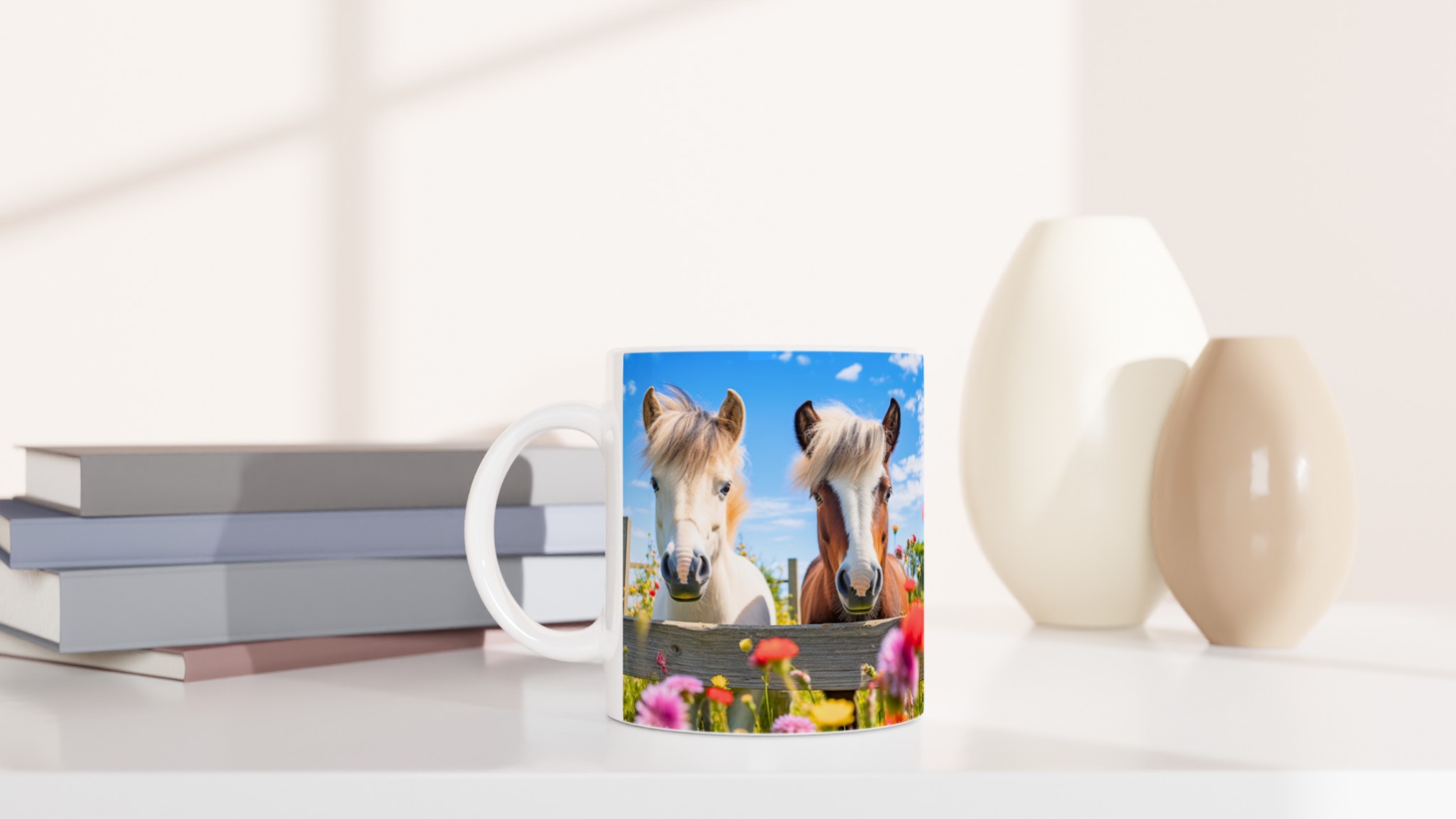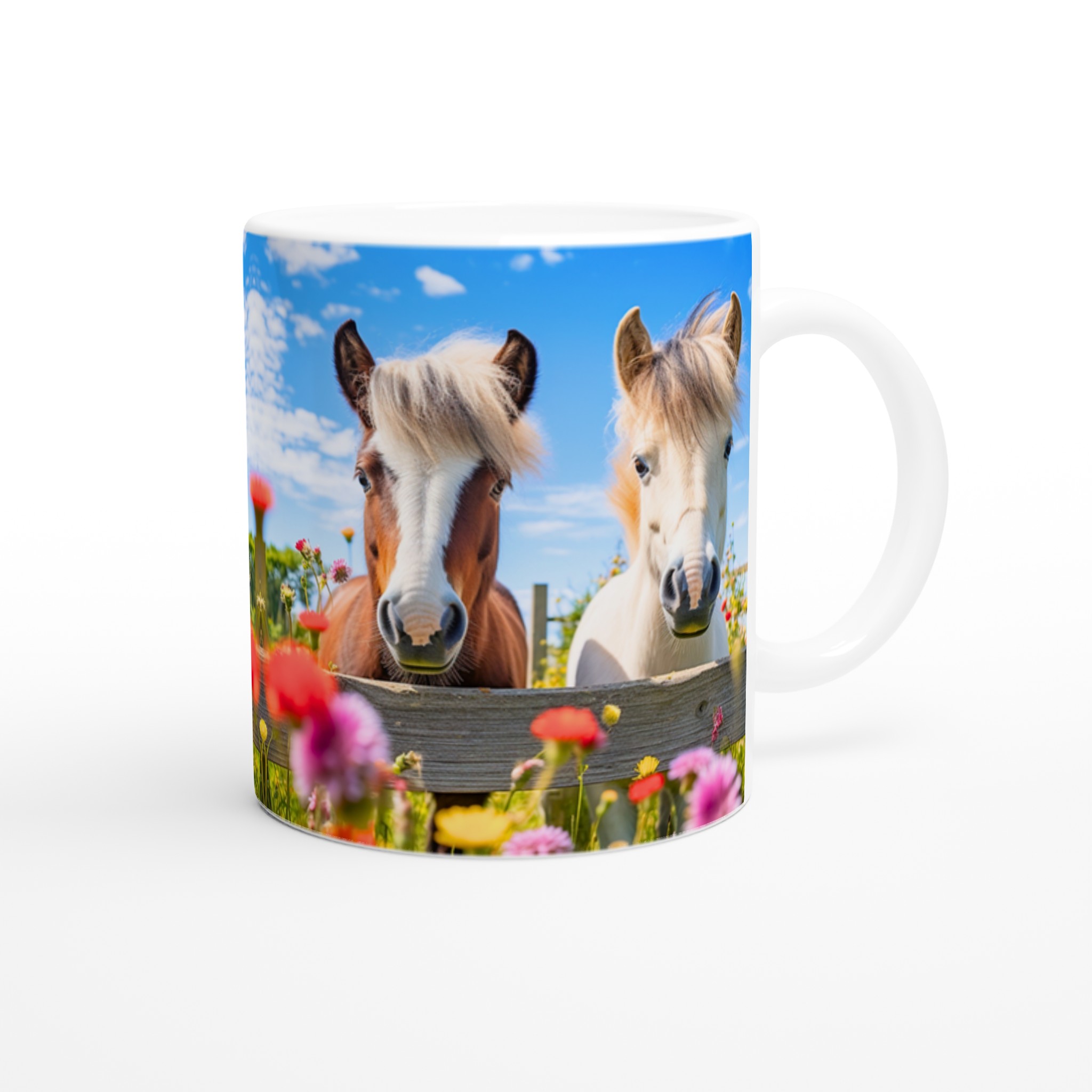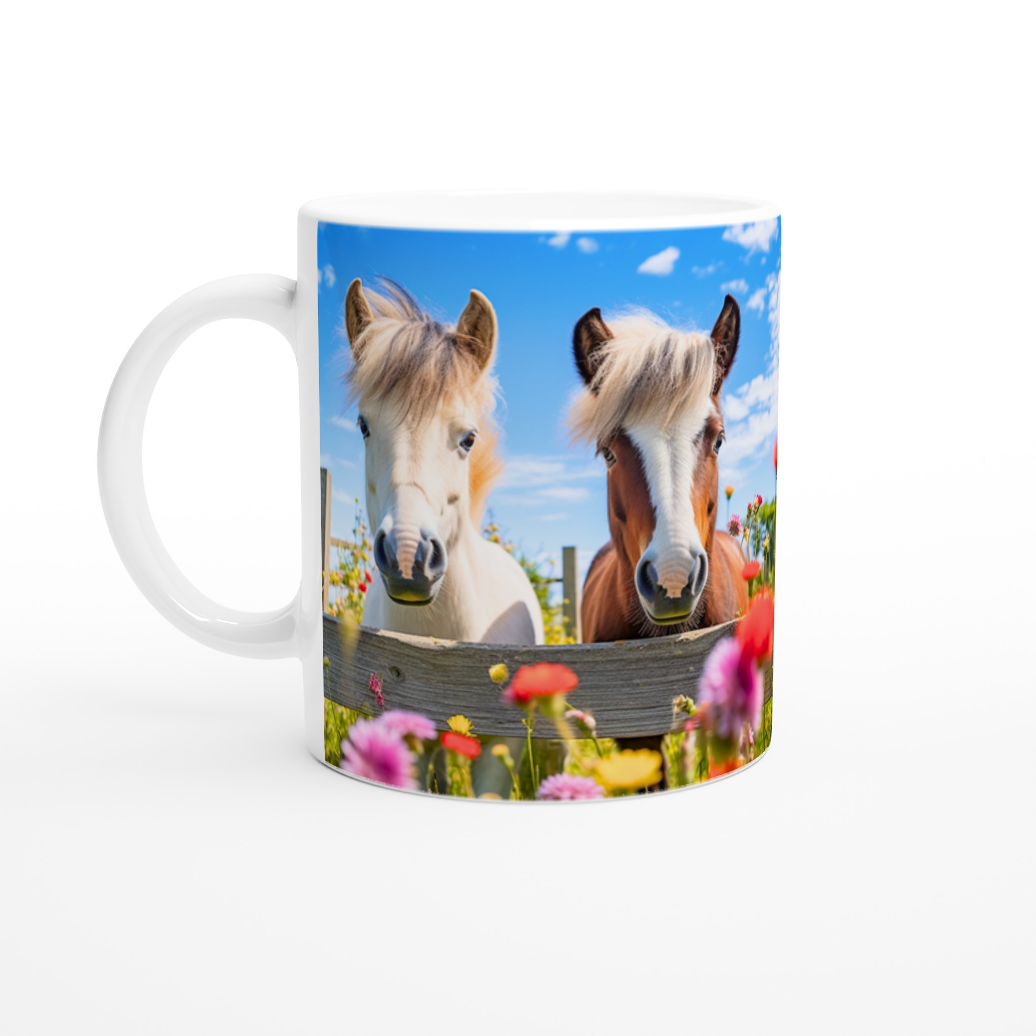 Ta en paus från vardagen och dröm dig bort till soliga ängar med denna charmiga keramiska mugg. Bilden på de nyfikna ponnyerna omgivna av blommande fält under en klarblå himmel skapar en känsla av lugn och glädje, perfekt att bära med sig in i varje fikastund.