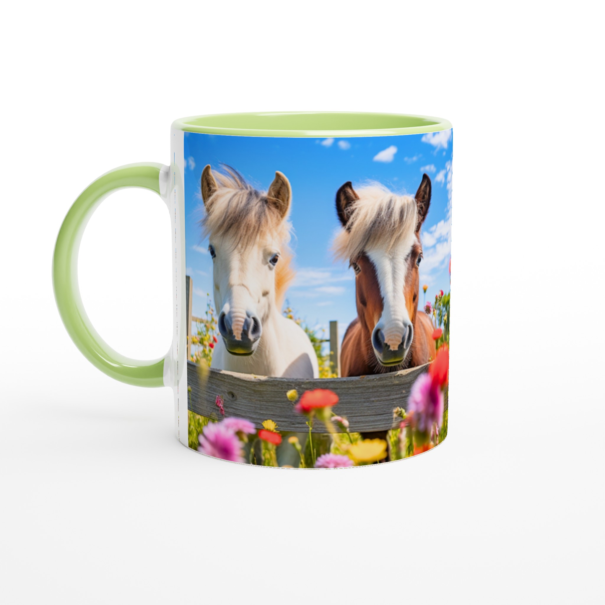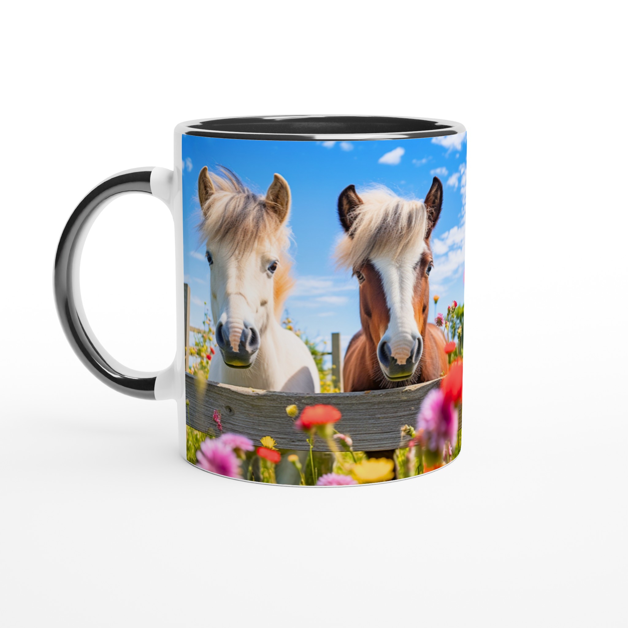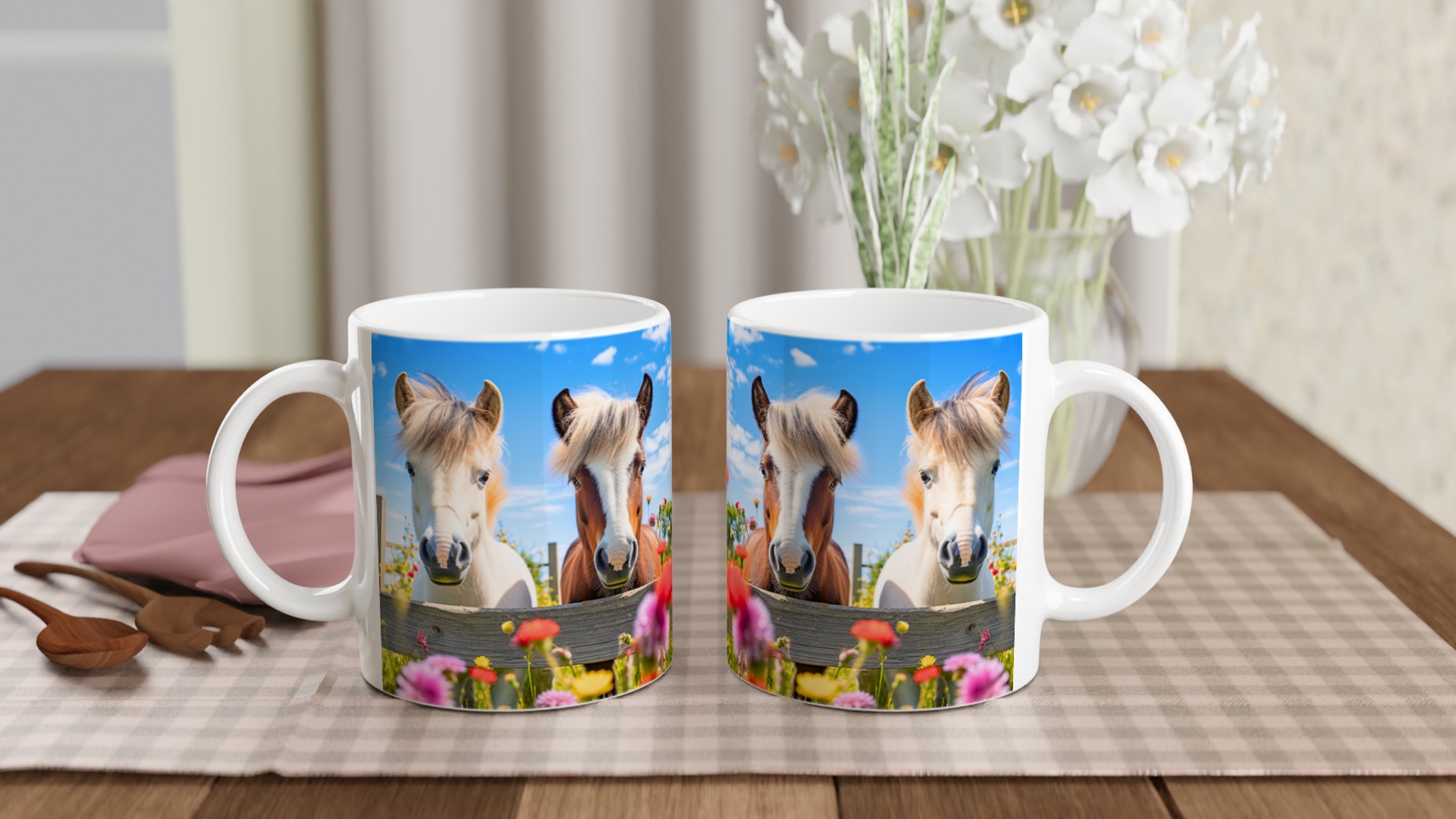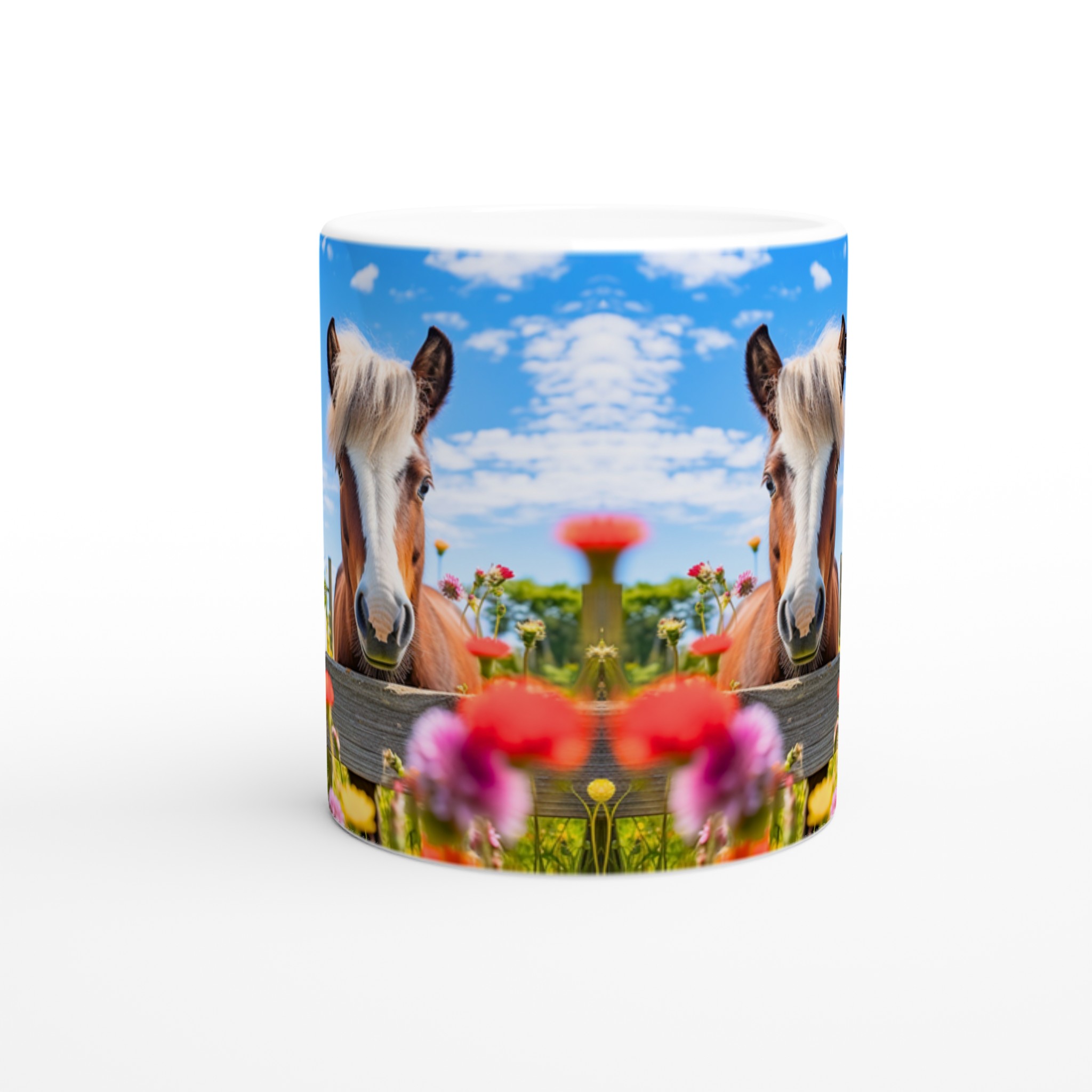 Ta en paus från vardagen och dröm dig bort till soliga ängar med denna charmiga keramiska mugg. Bilden på de nyfikna ponnyerna omgivna av blommande fält under en klarblå himmel skapar en känsla av lugn och glädje, perfekt att bära med sig in i varje fikastund.