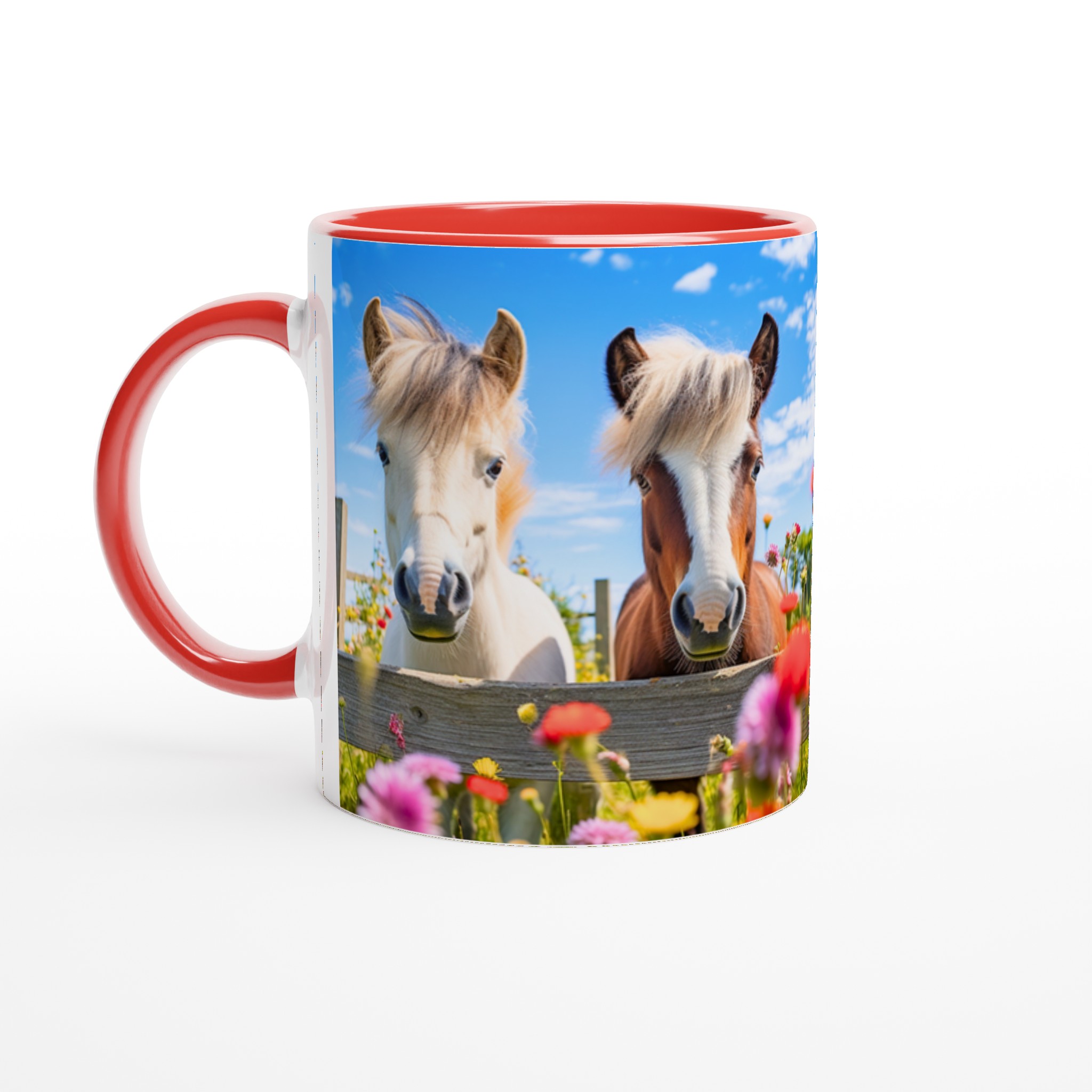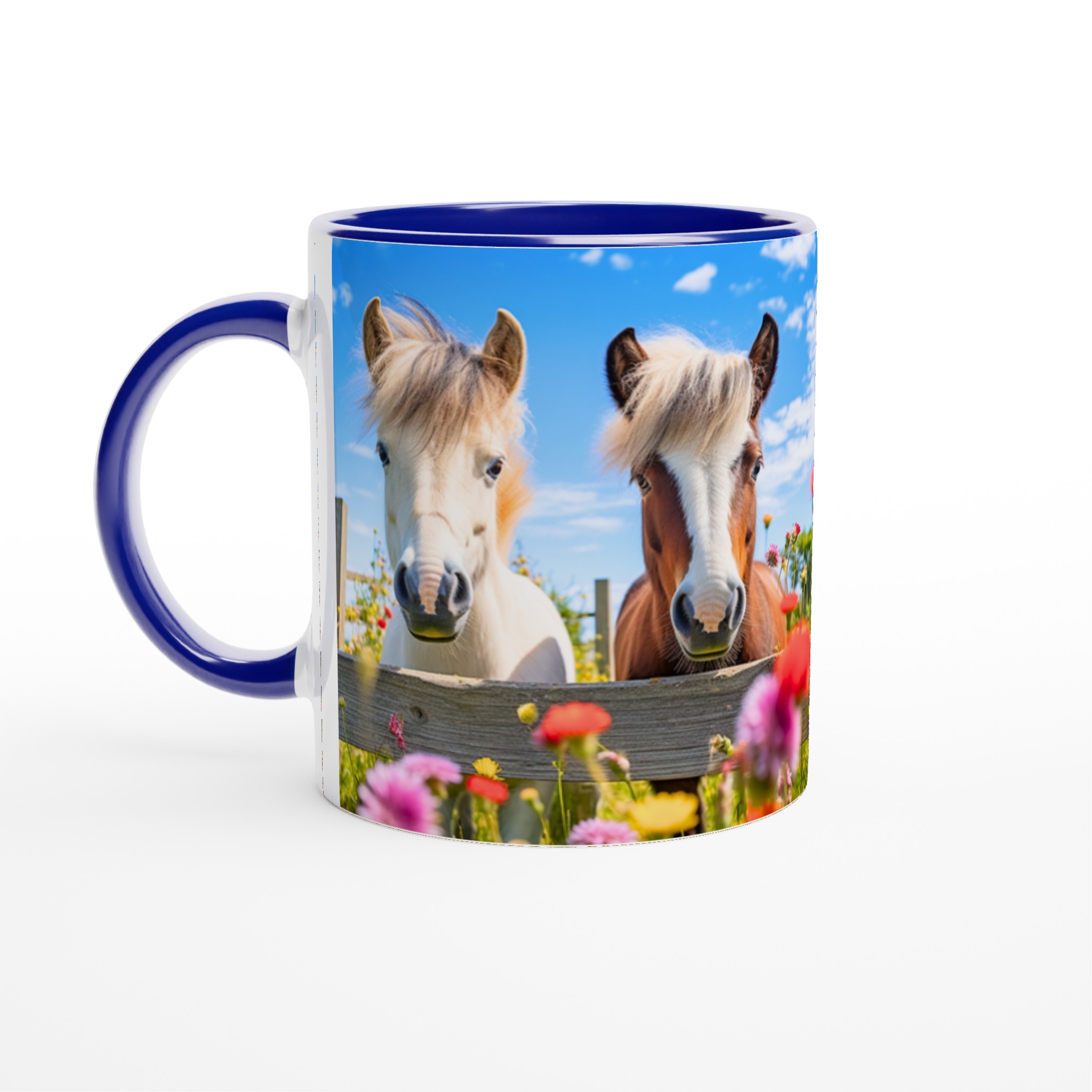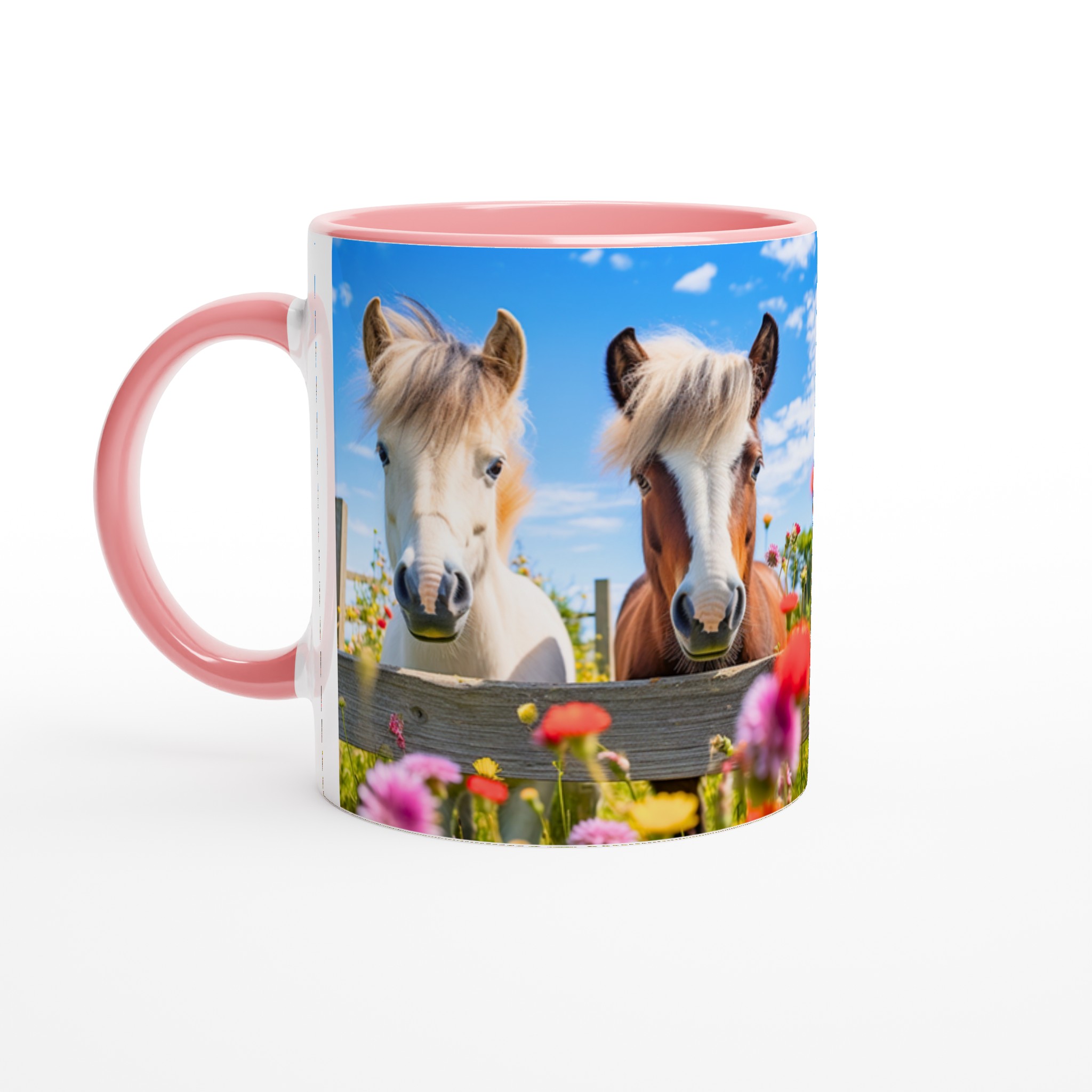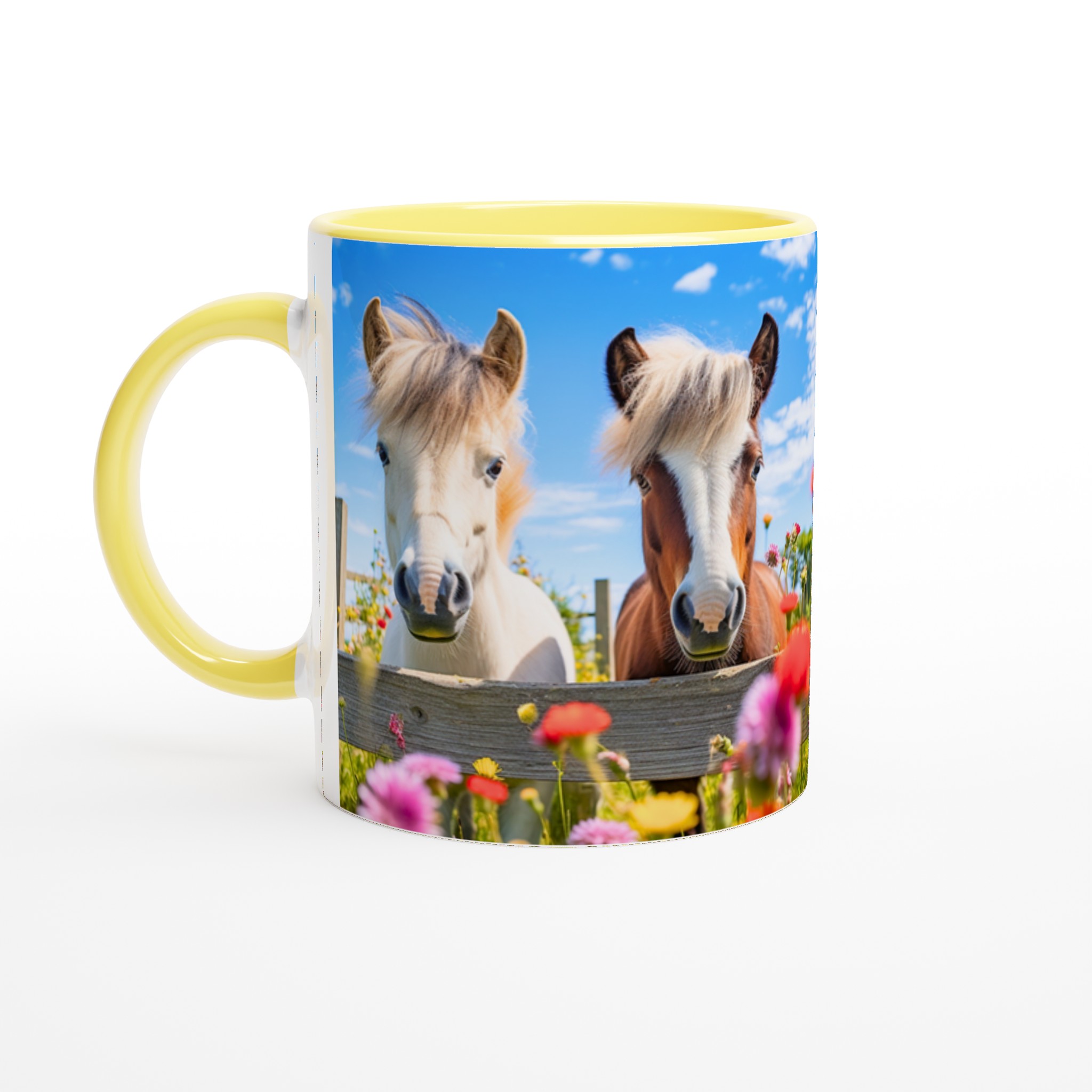 Ta en paus från vardagen och dröm dig bort till soliga ängar med denna charmiga keramiska mugg. Bilden på de nyfikna ponnyerna omgivna av blommande fält under en klarblå himmel skapar en känsla av lugn och glädje, perfekt att bära med sig in i varje fikastund.
