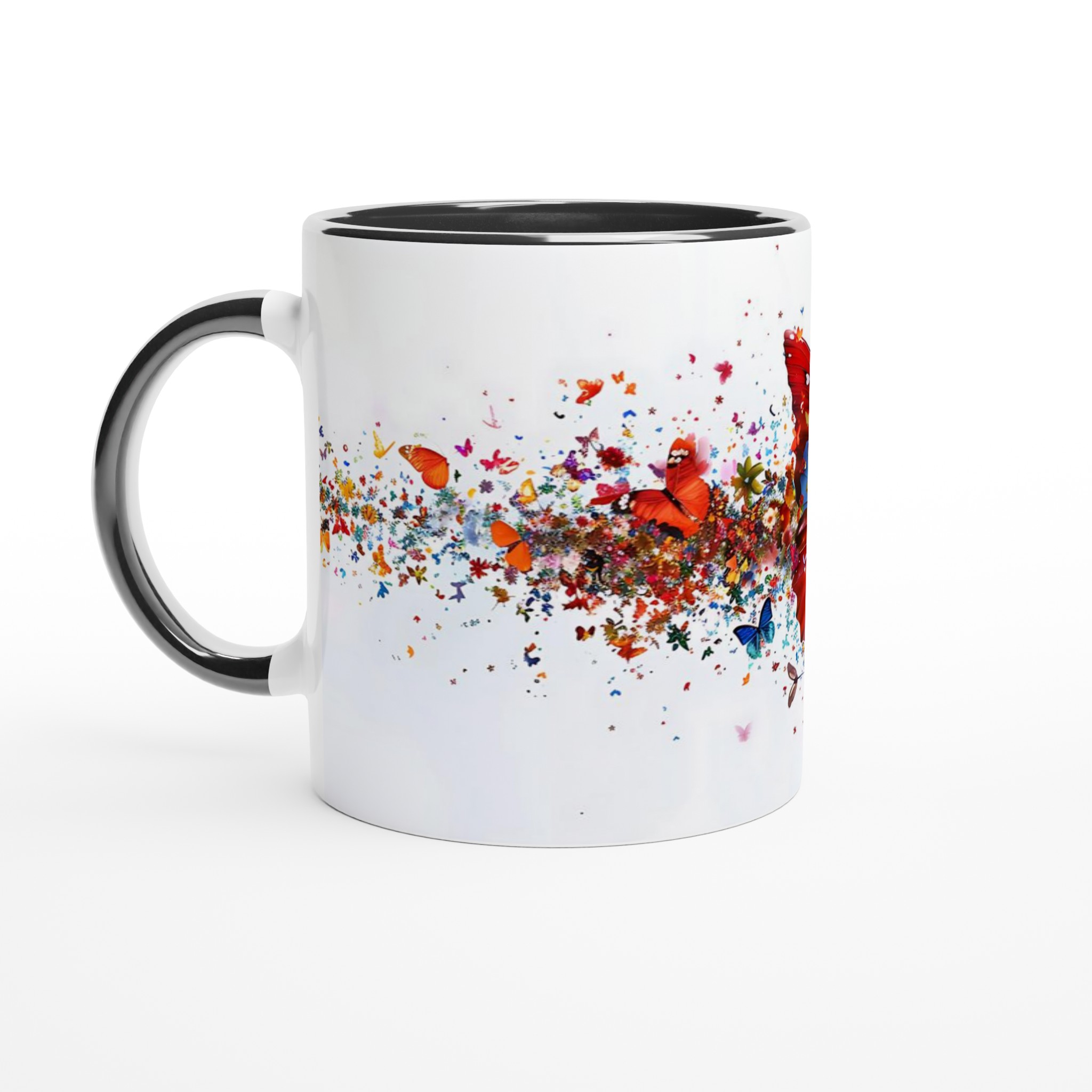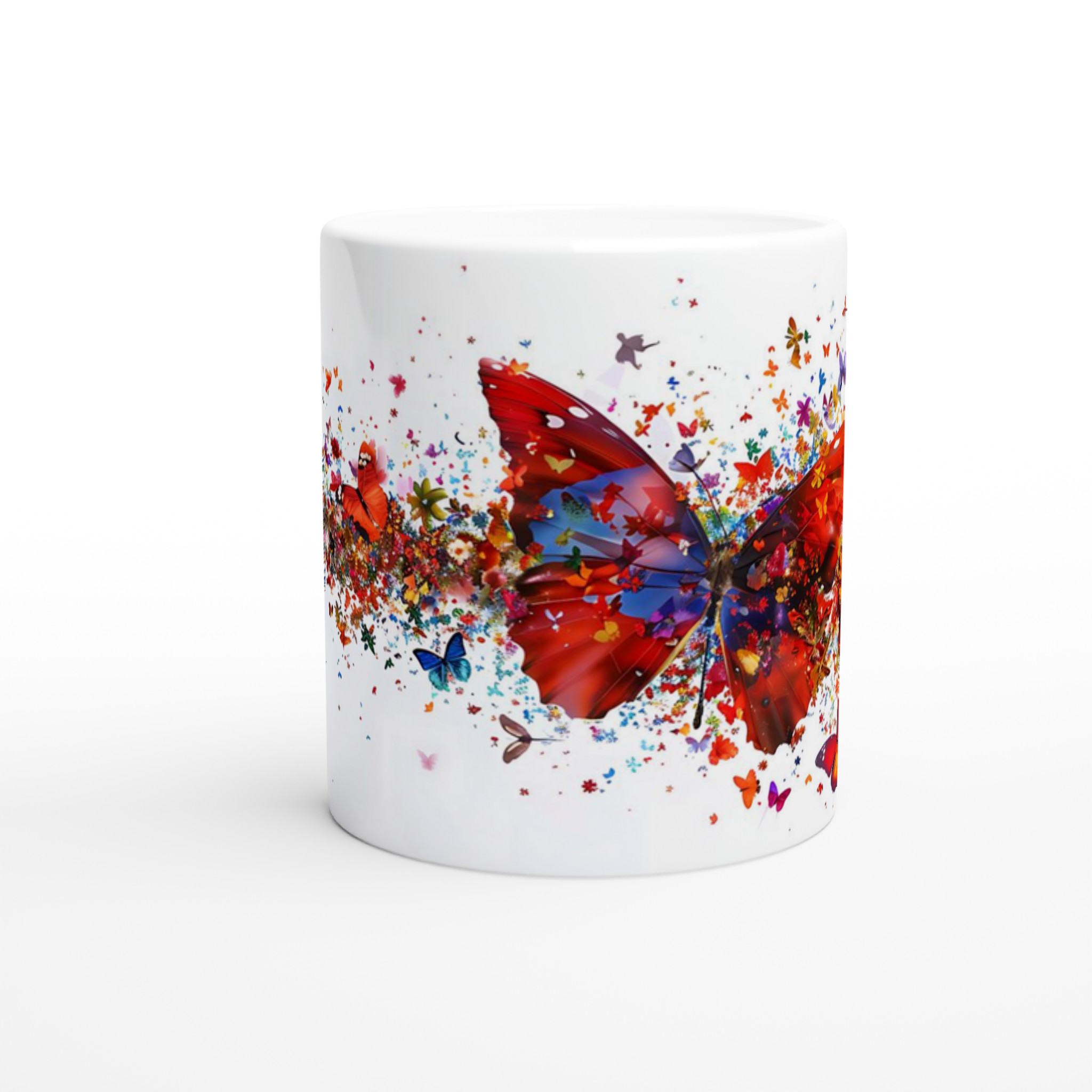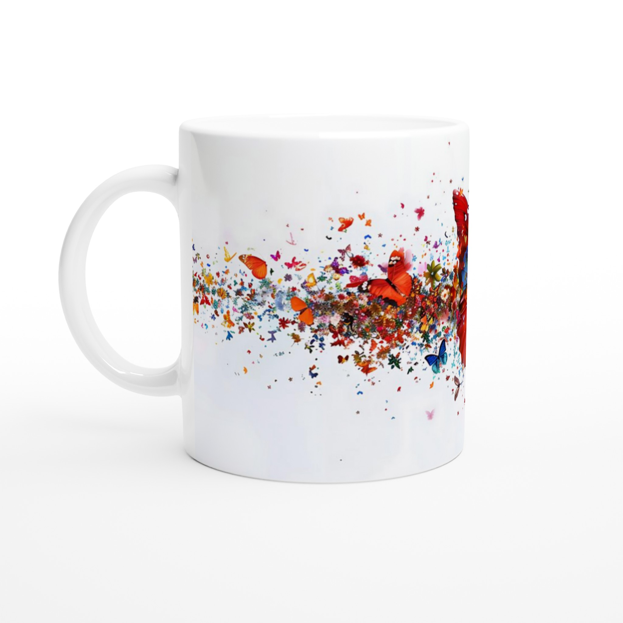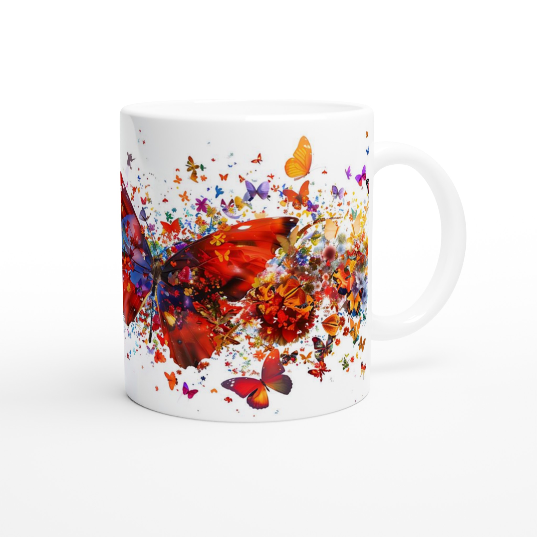 Låt varje klunk bli en färgexplosion med vår förtrollande keramiska mugg, som fångar den livfulla energin från tusentals flygande fjärilar och blomblad. Den här stilrena muggen blir snabbt en vardagsfavorit. Perfekt för morgonkaffet, kvällens varma choklad eller när du bara vill njuta av en kopp te. Den blanka vita ytan gör att trycken framhävs med klara och levande färger, som håller sig fina även efter många turer i mikron och diskmaskinen.
