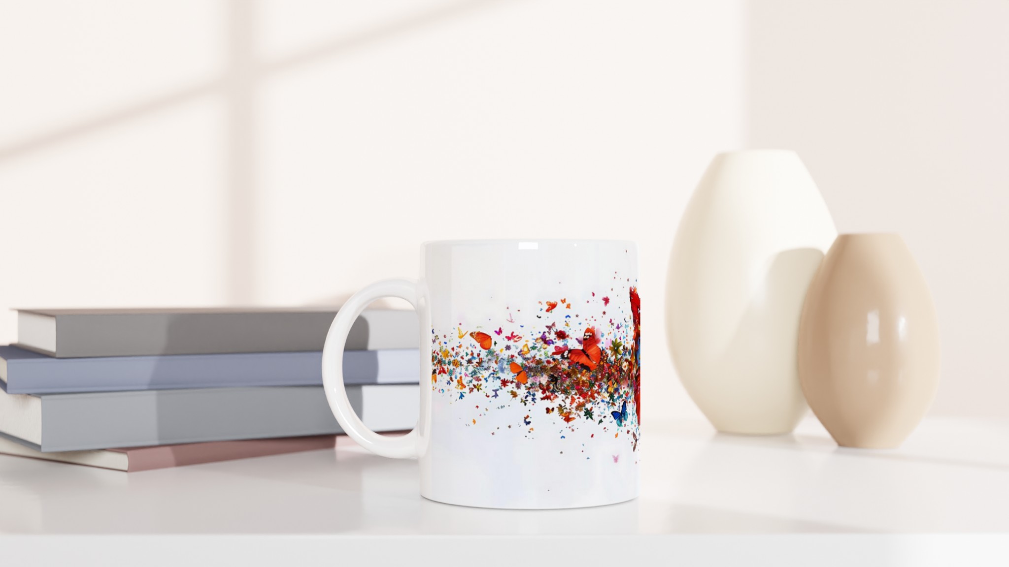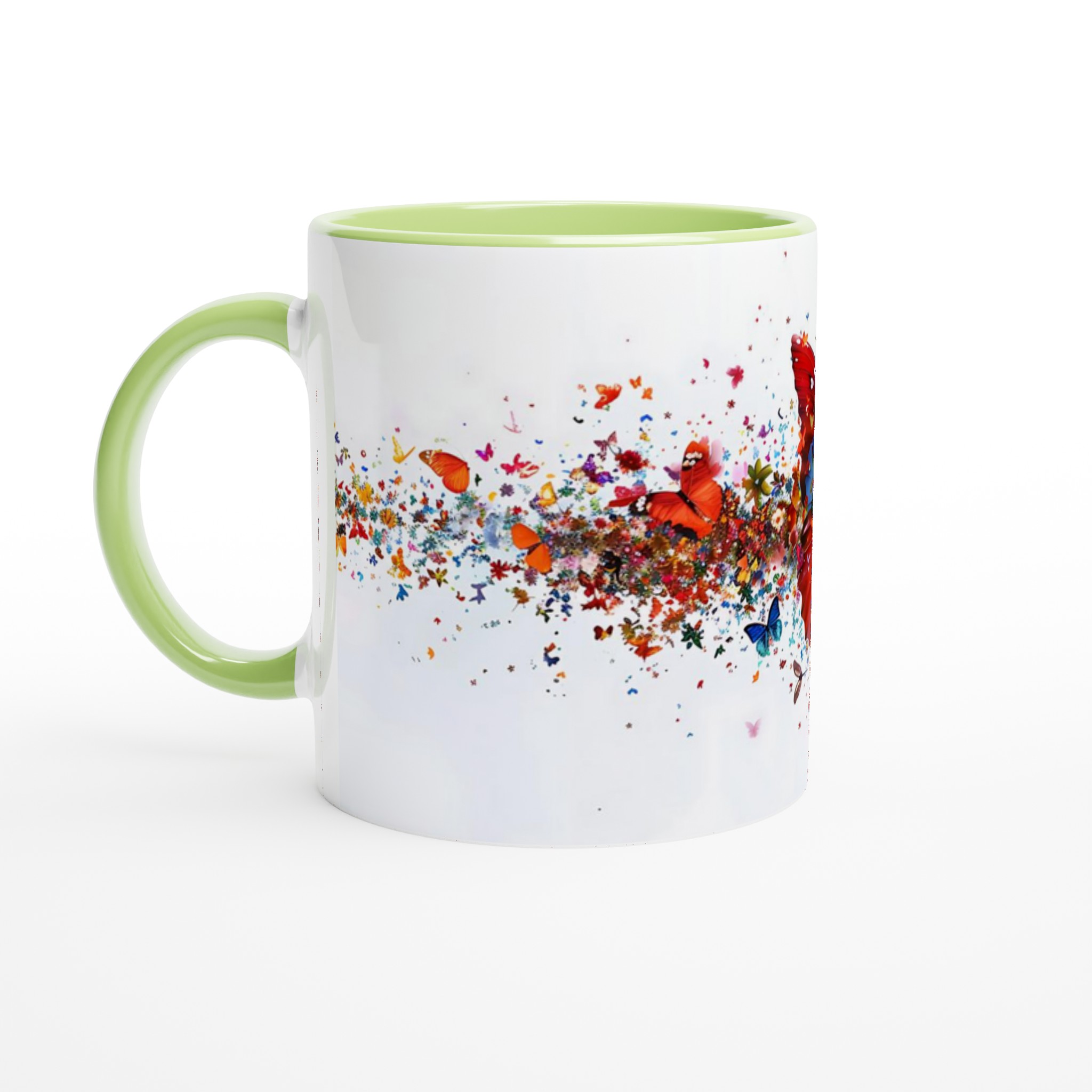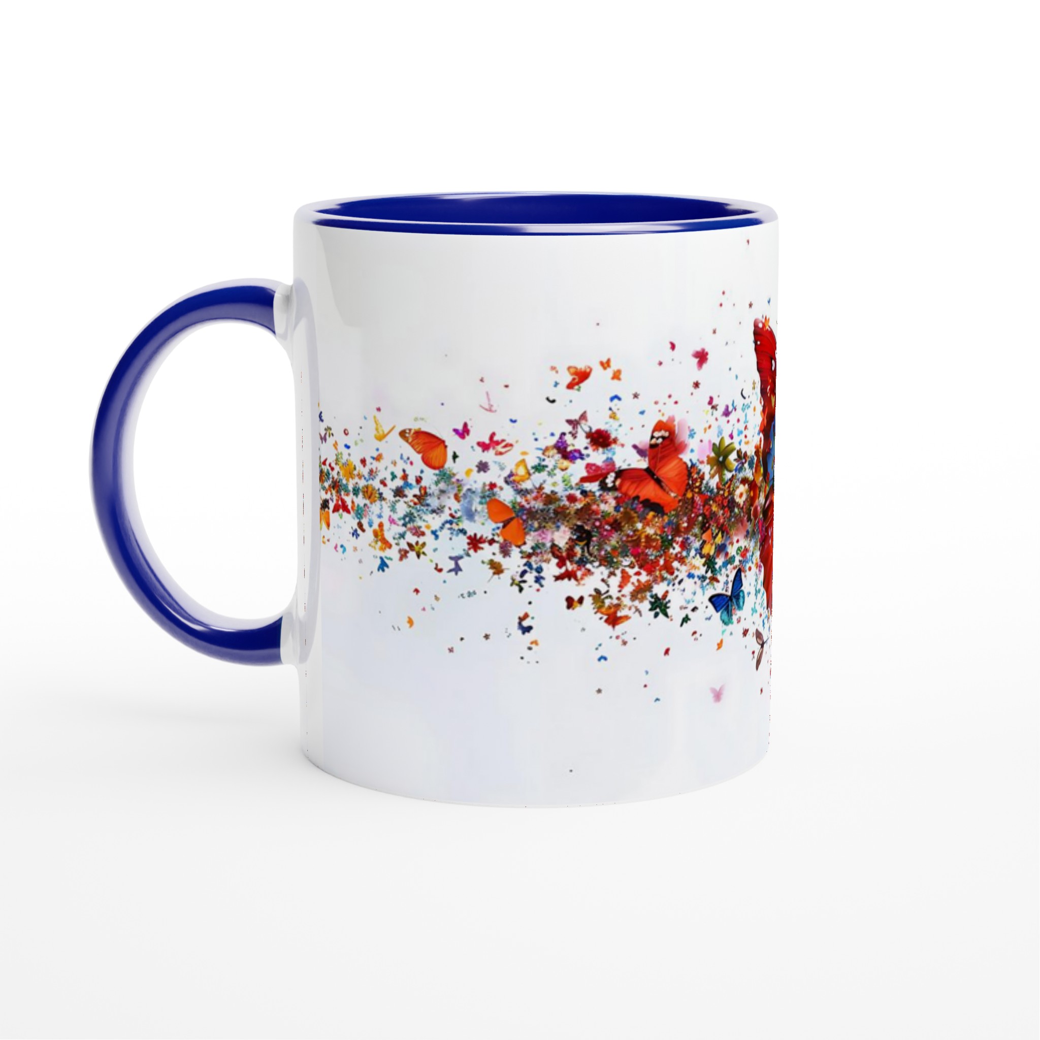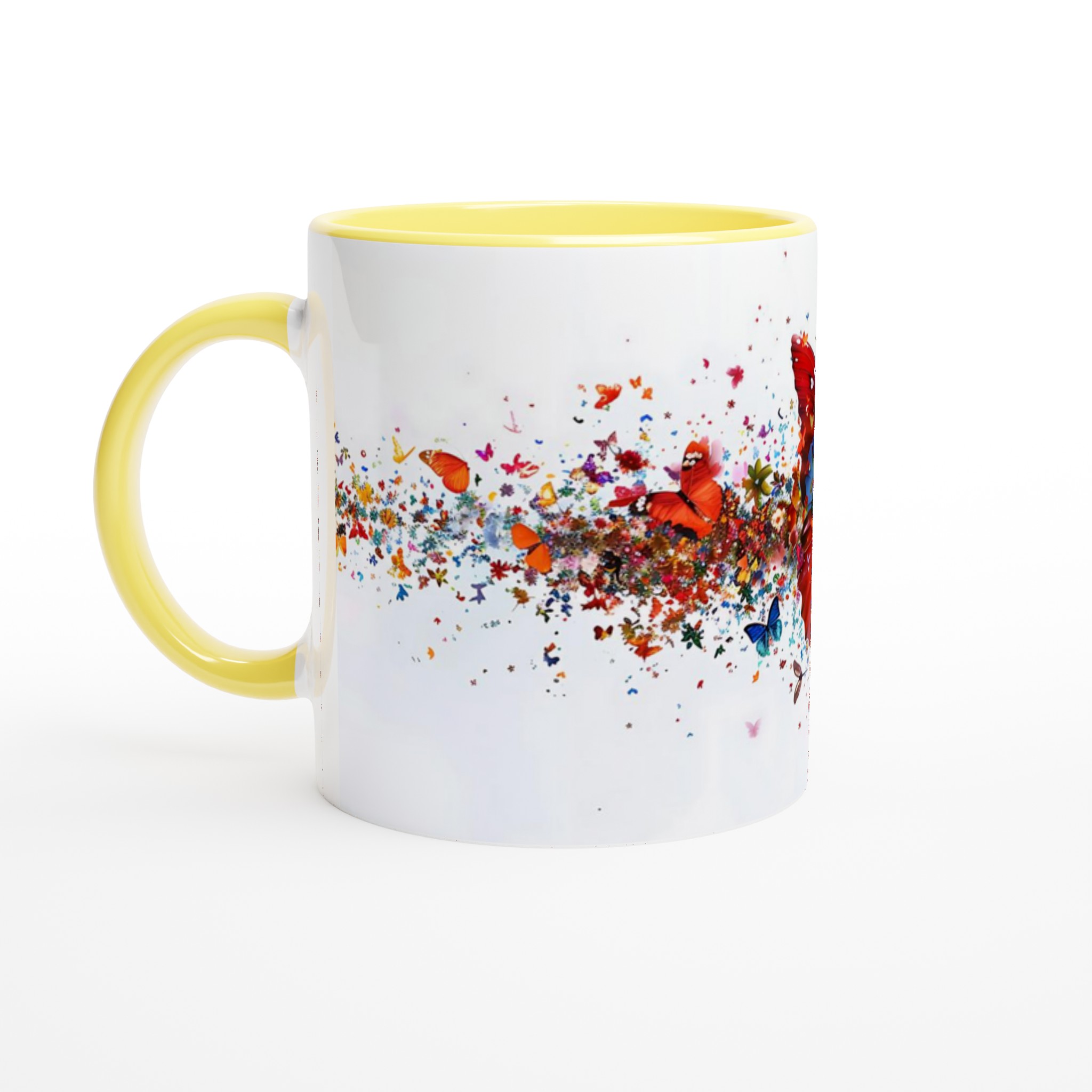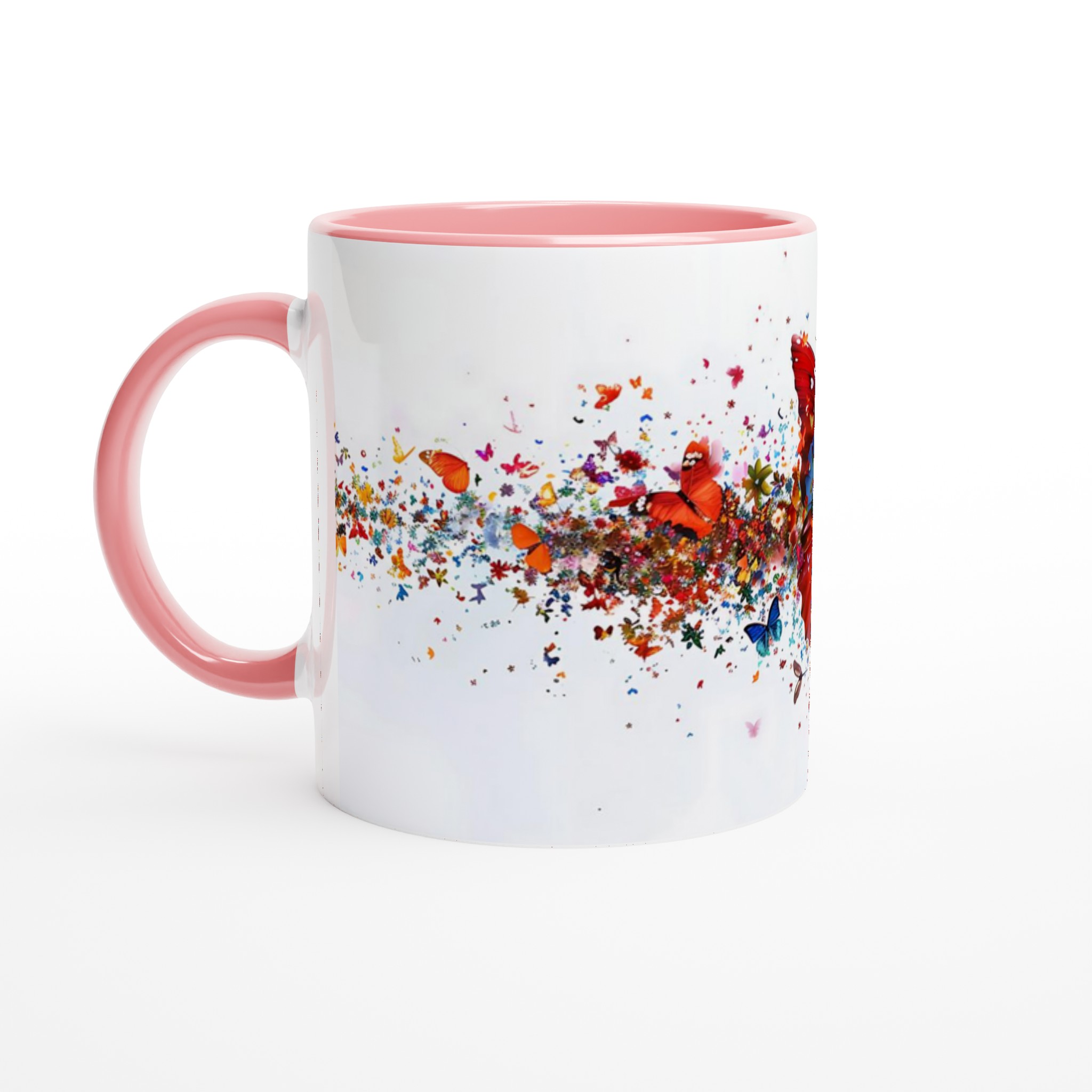 Låt varje klunk bli en färgexplosion med vår förtrollande keramiska mugg, som fångar den livfulla energin från tusentals flygande fjärilar och blomblad. Den här stilrena muggen blir snabbt en vardagsfavorit. Perfekt för morgonkaffet, kvällens varma choklad eller när du bara vill njuta av en kopp te. Den blanka vita ytan gör att trycken framhävs med klara och levande färger, som håller sig fina även efter många turer i mikron och diskmaskinen.