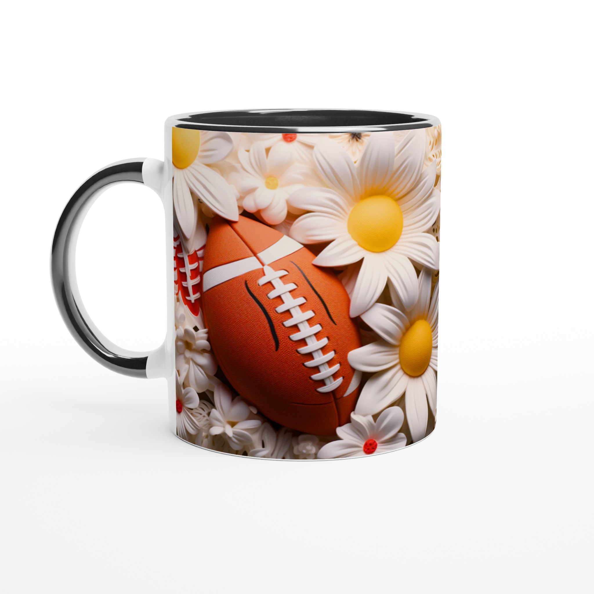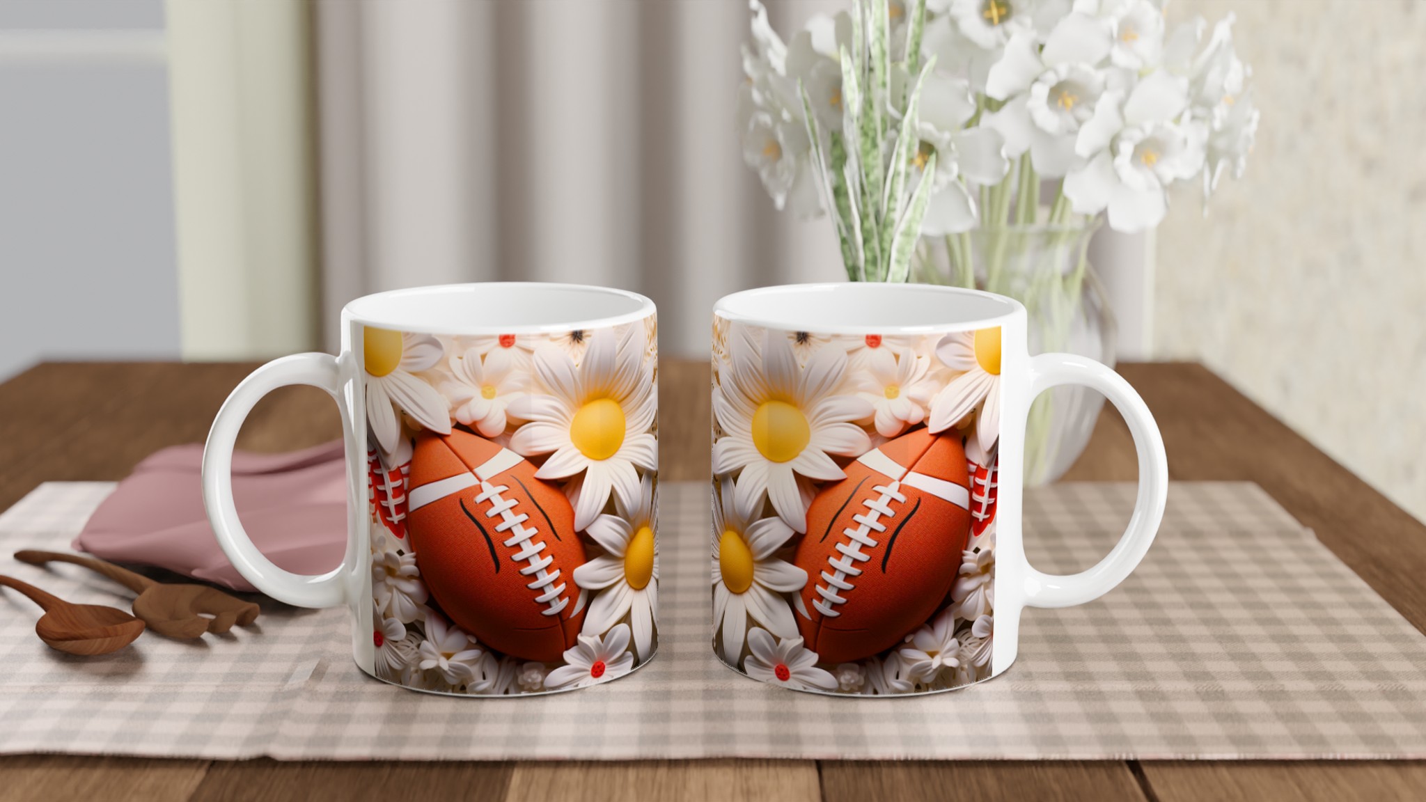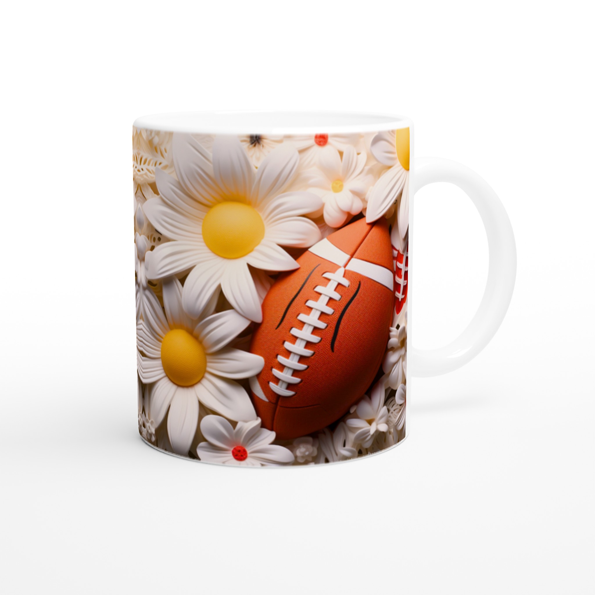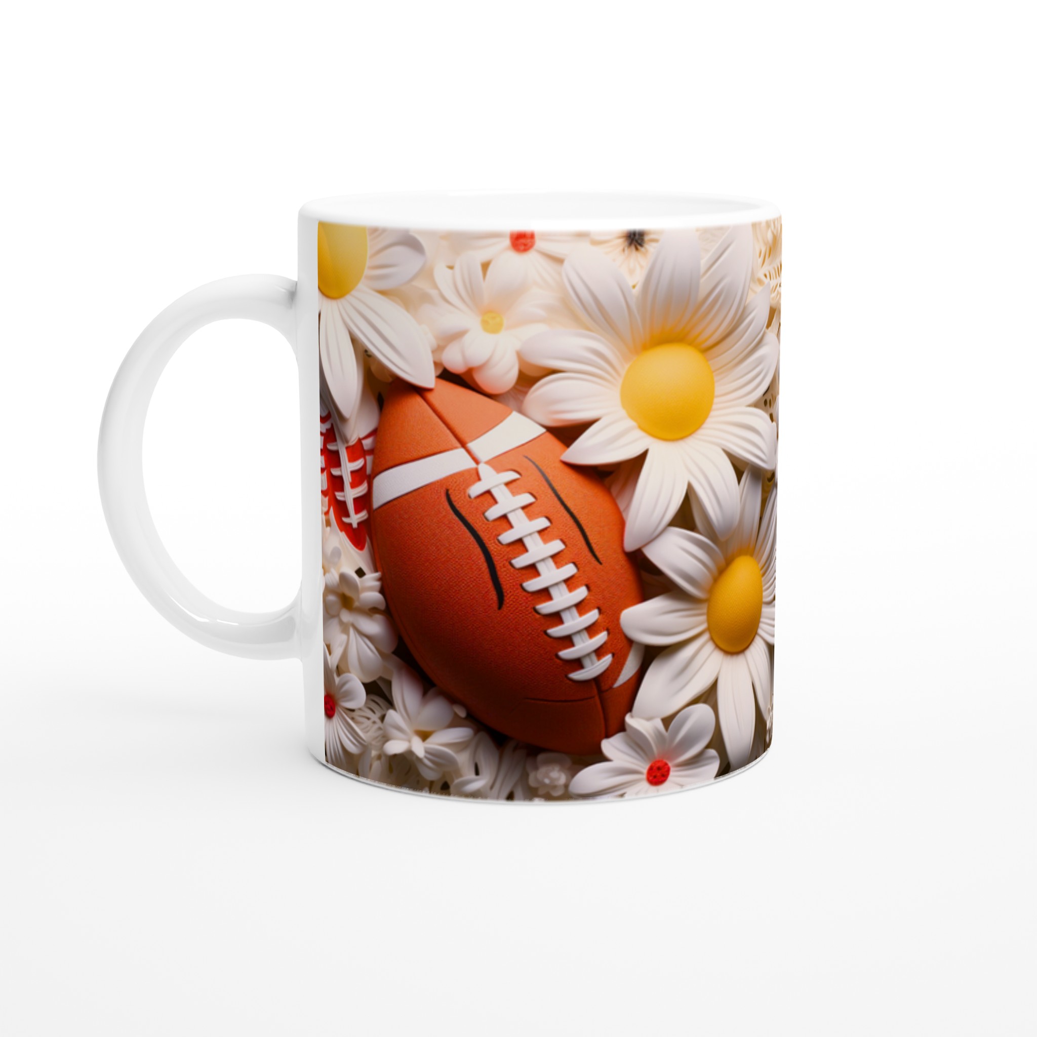 Den här stilrena keramiska muggen blir snabbt en vardagsfavorit, perfekt för dig som uppskattar en lekfull och sportig estetik. Med sin unika design som kombinerar charmiga blomdetaljer med en amerikansk fotboll, ger den varje fika en oväntad och glad känsla. Perfekt för morgonkaffet, kvällens varma choklad eller när du bara vill njuta av en kopp te. Den blanka vita ytan gör att trycken framhävs med klara och levande färger, som håller sig fina även efter många turer i mikron och diskmaskinen.
