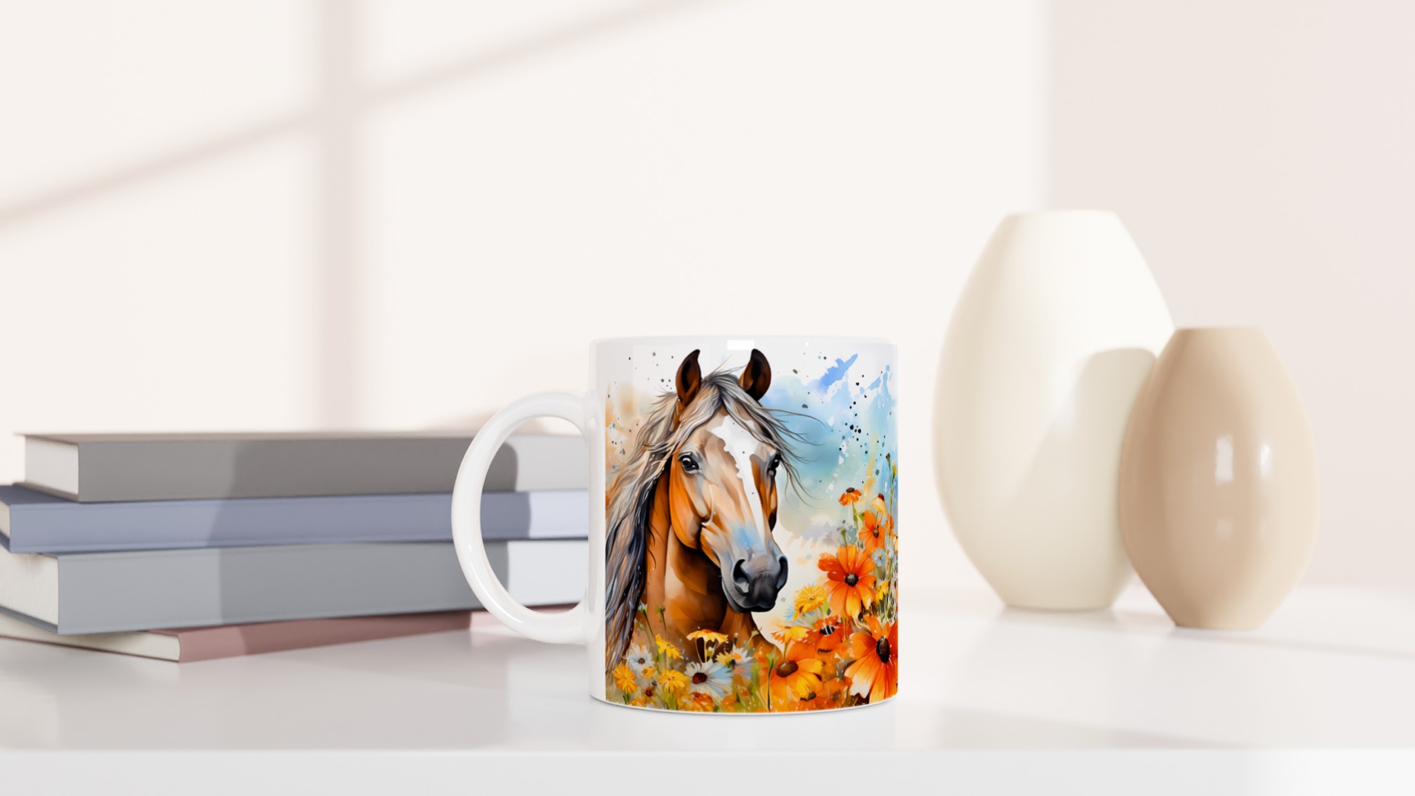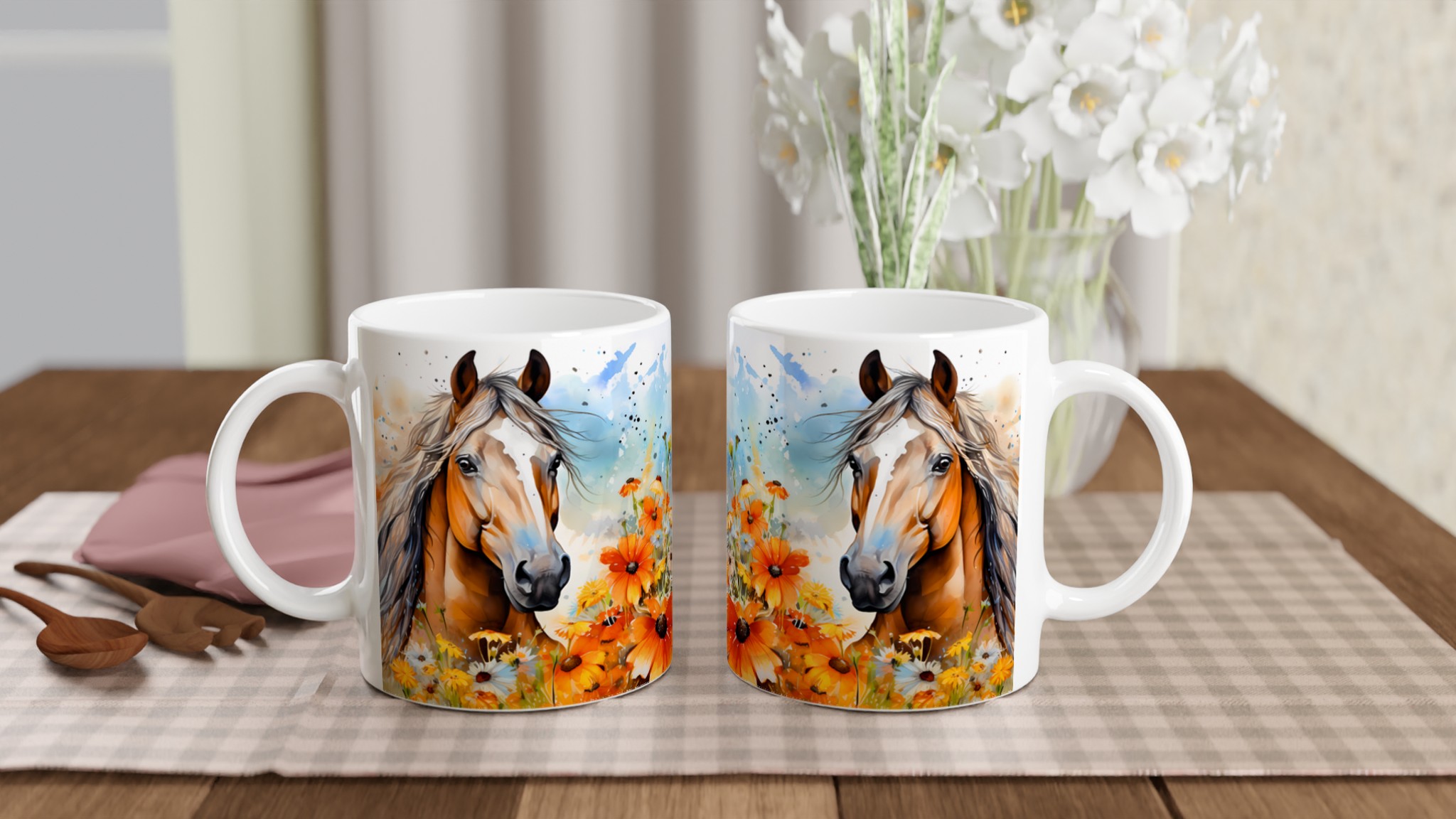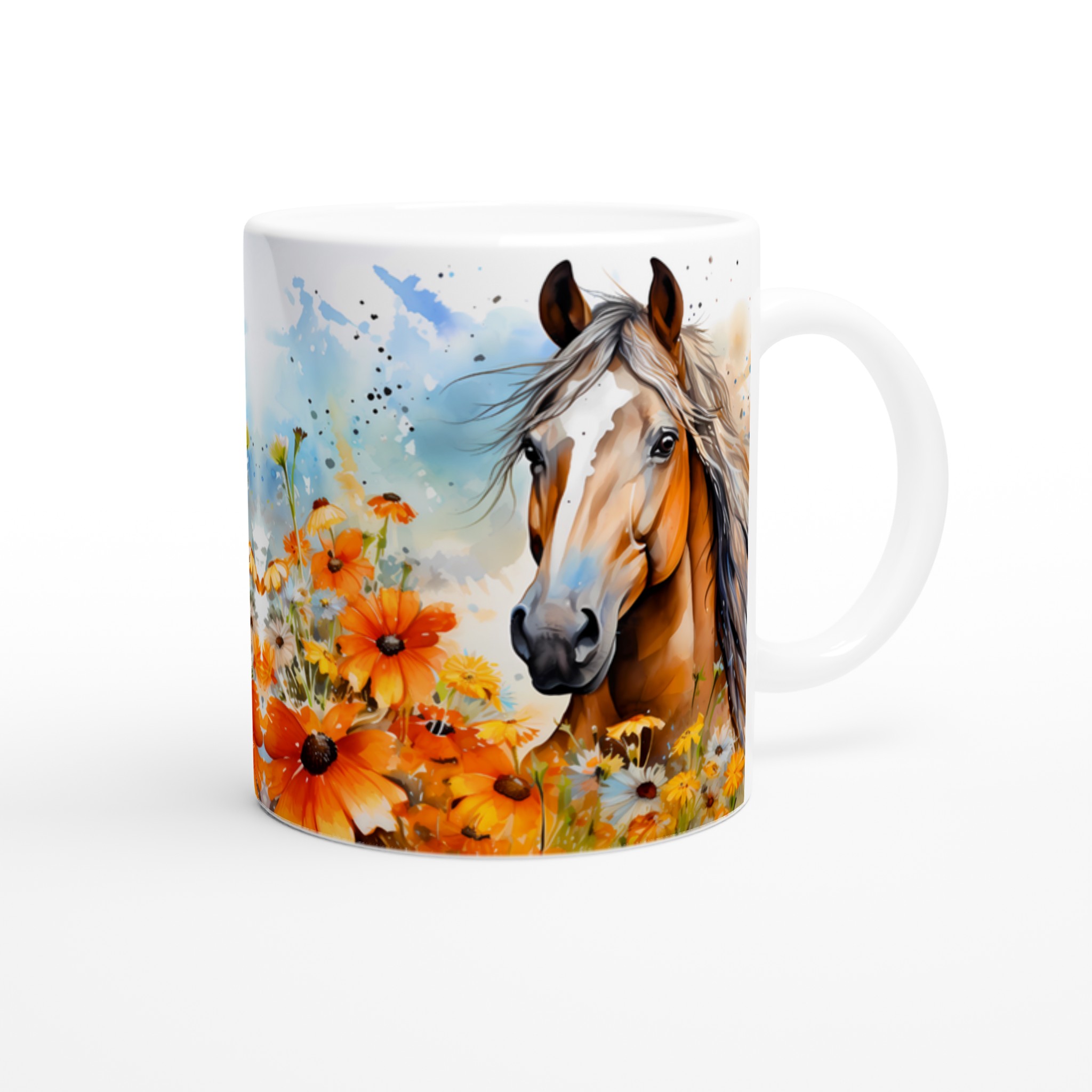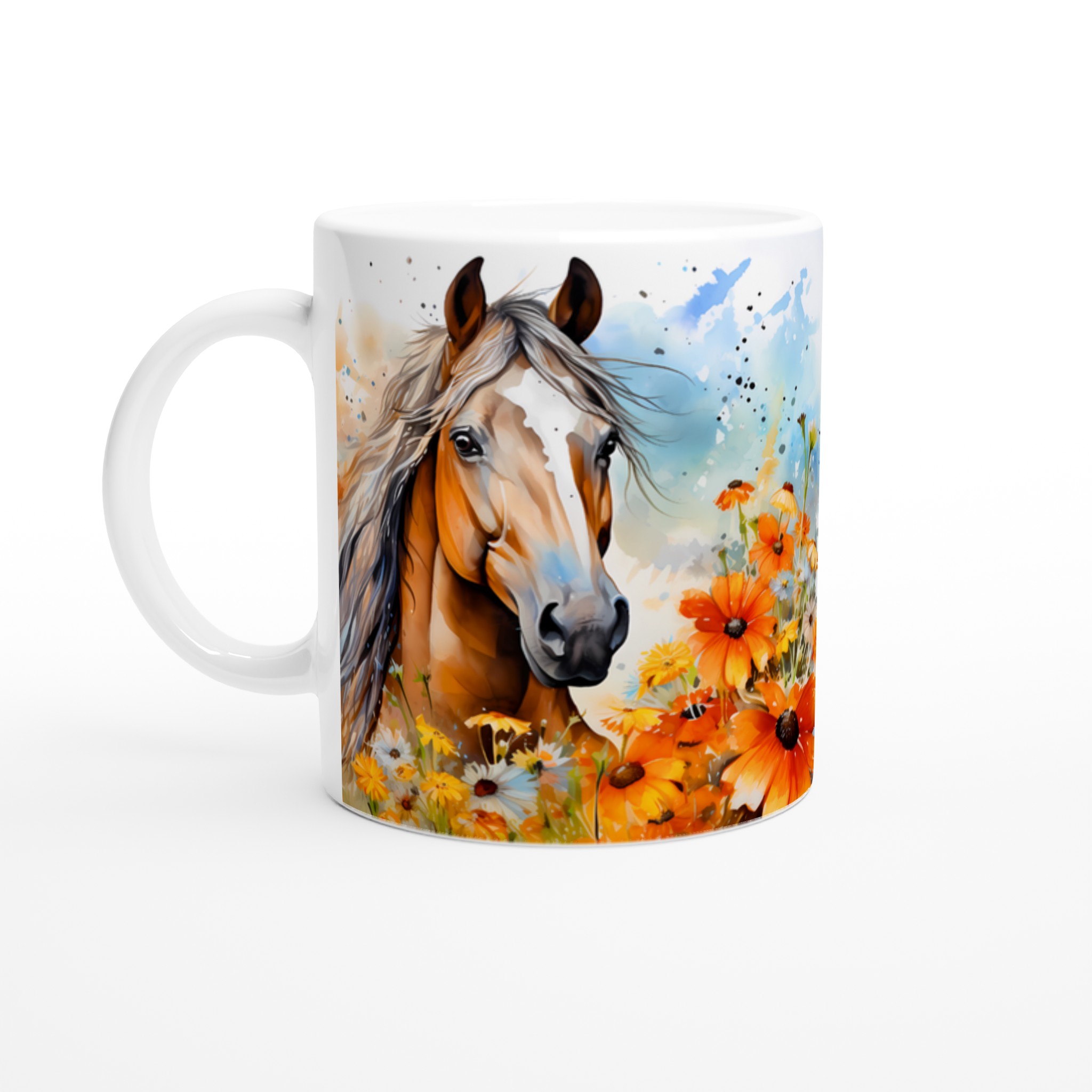 Denna fängslande keramiska mugg blir snabbt en vardagsfavorit, perfekt för att förgylla din fikastund. Med ett drömskt akvarellmotiv av vilda hästar i ett blomstrande hav av varma orange och gula nyanser, mot en lugnande blå bakgrund, bjuder den in till en stund av frid och skönhet. Föreställ dig att starta morgonen med kaffe i denna mugg, låta kvällens varma choklad värma själen, eller bara njuta av en kopp te medan du betraktar de mjuka färgskiftningarna.