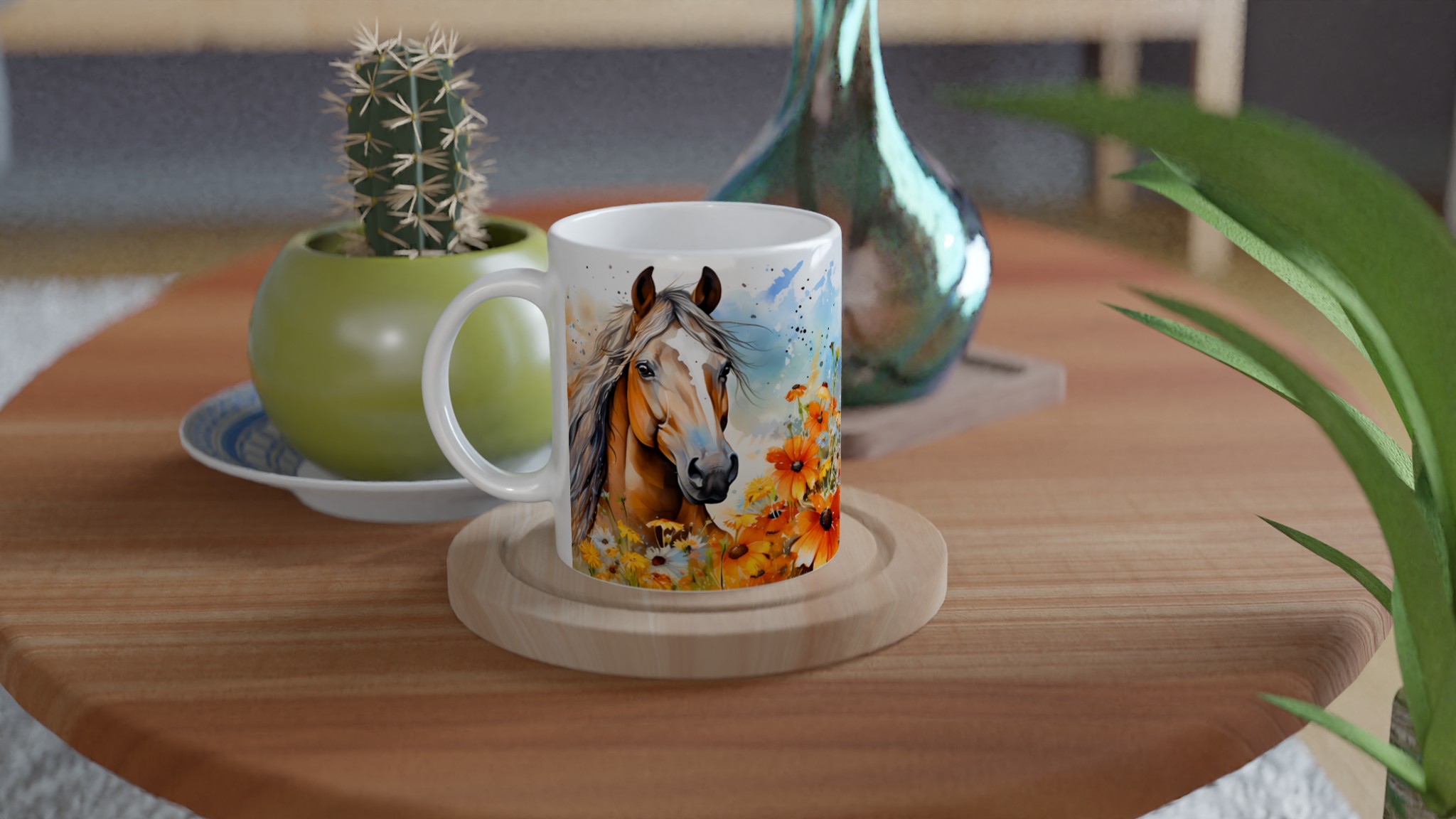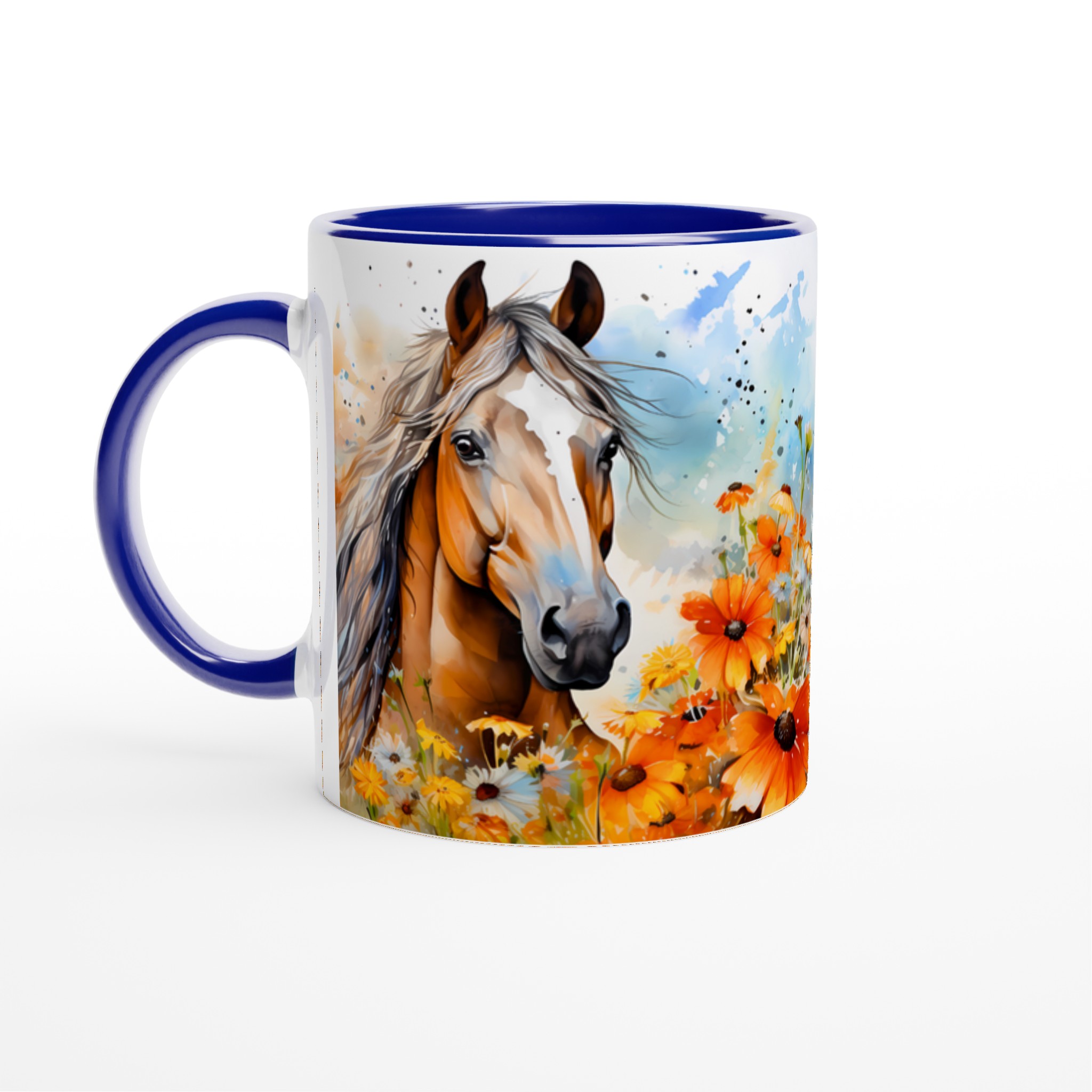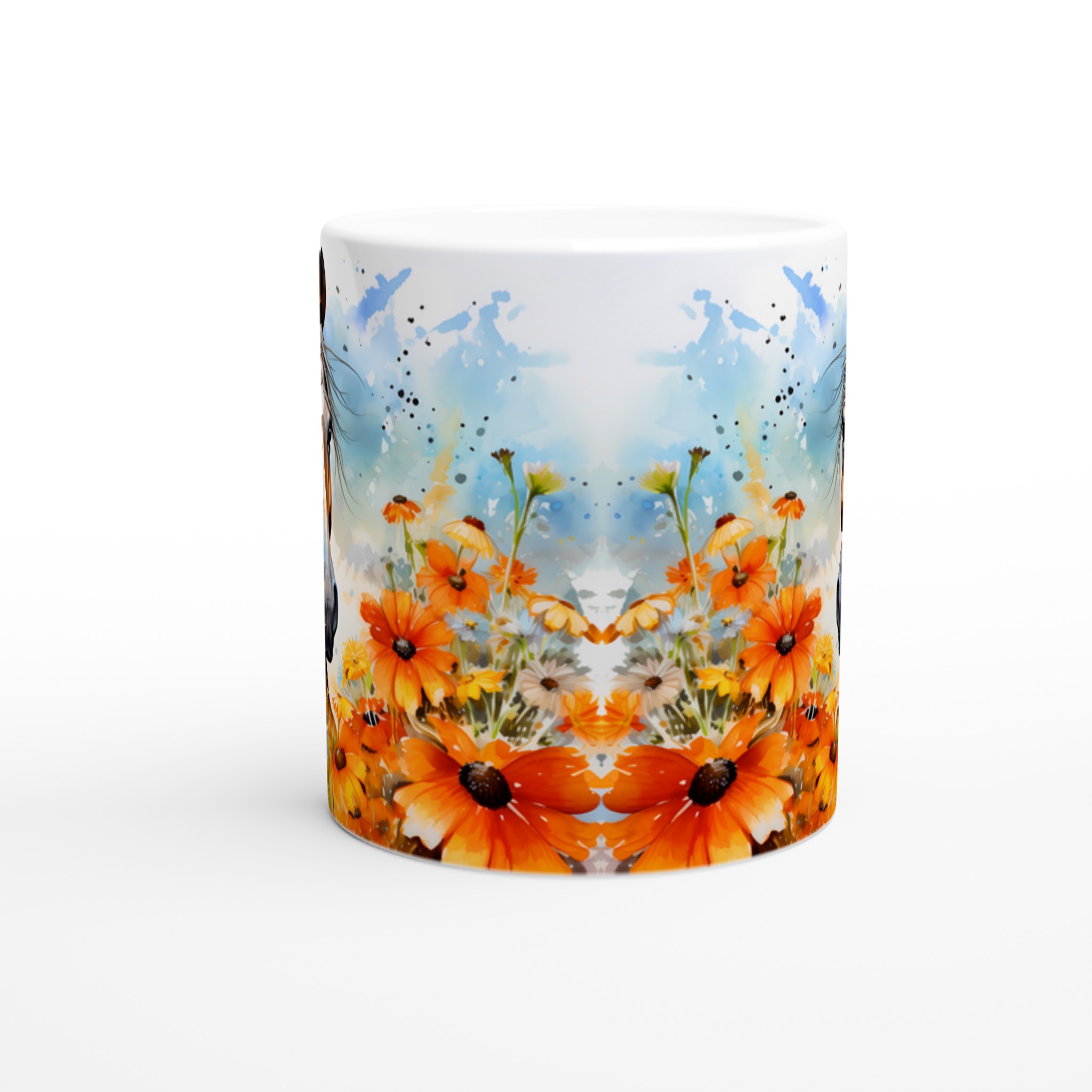 Denna fängslande keramiska mugg blir snabbt en vardagsfavorit, perfekt för att förgylla din fikastund. Med ett drömskt akvarellmotiv av vilda hästar i ett blomstrande hav av varma orange och gula nyanser, mot en lugnande blå bakgrund, bjuder den in till en stund av frid och skönhet. Föreställ dig att starta morgonen med kaffe i denna mugg, låta kvällens varma choklad värma själen, eller bara njuta av en kopp te medan du betraktar de mjuka färgskiftningarna.