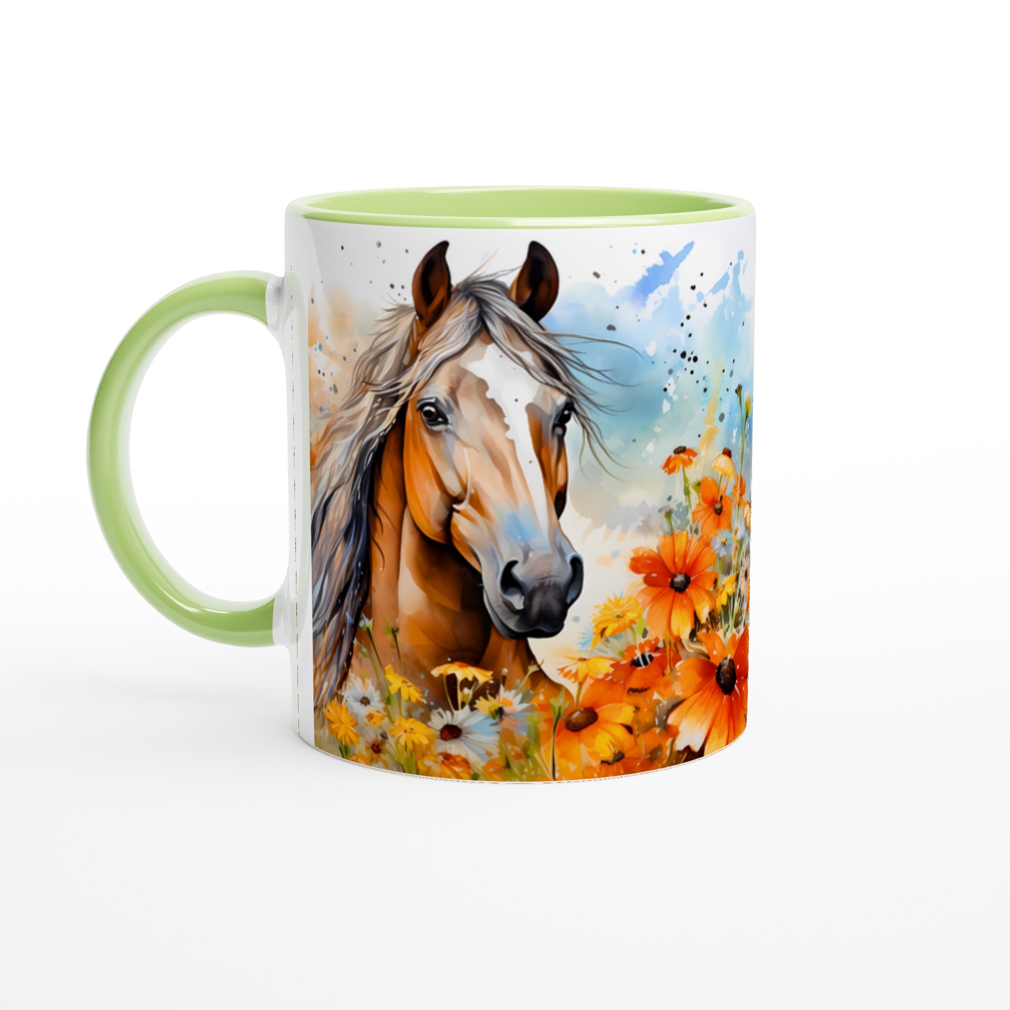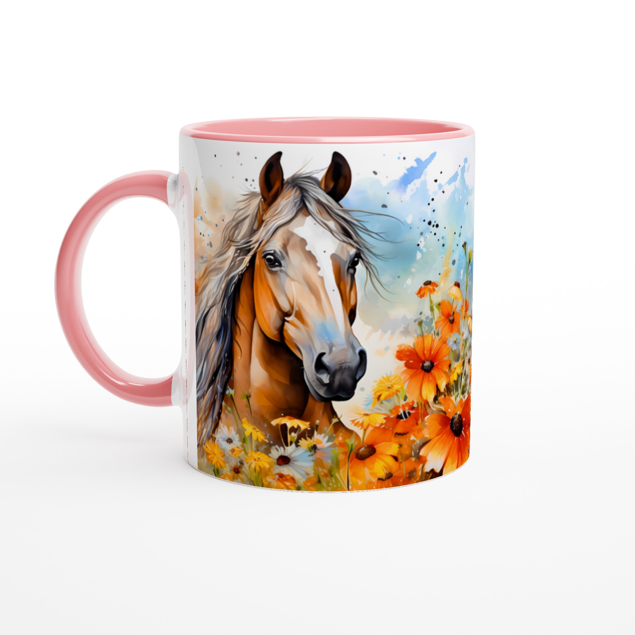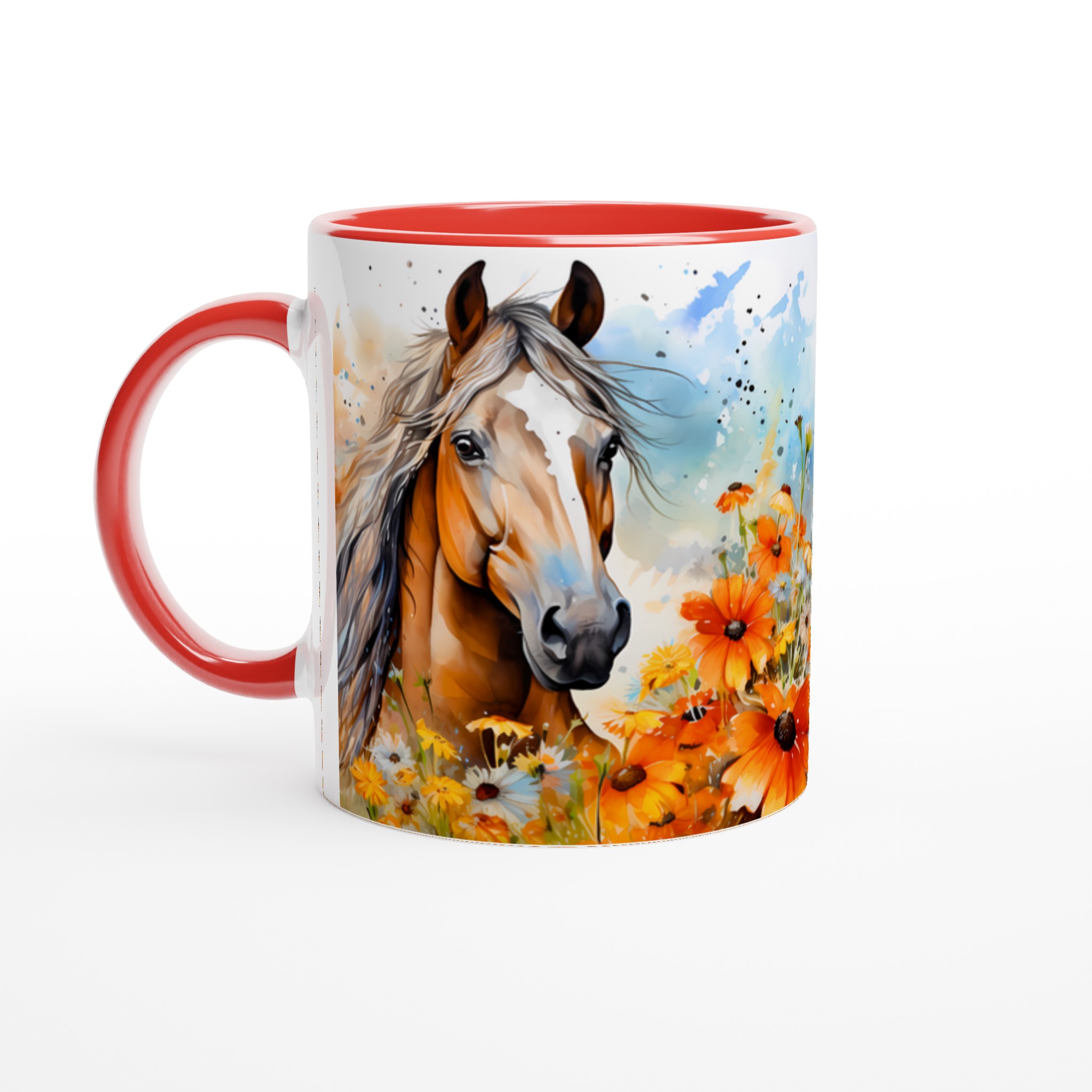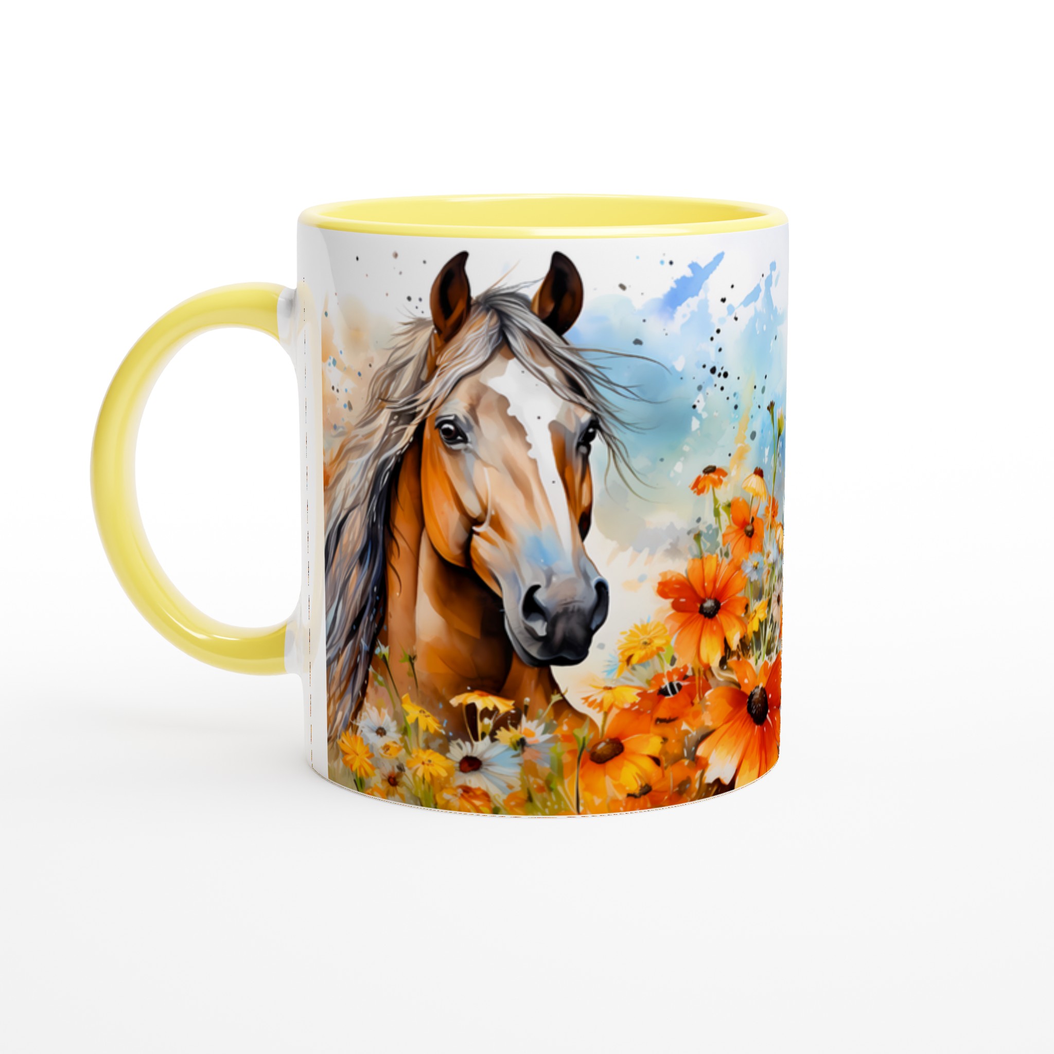Denna fängslande keramiska mugg blir snabbt en vardagsfavorit, perfekt för att förgylla din fikastund. Med ett drömskt akvarellmotiv av vilda hästar i ett blomstrande hav av varma orange och gula nyanser, mot en lugnande blå bakgrund, bjuder den in till en stund av frid och skönhet. Föreställ dig att starta morgonen med kaffe i denna mugg, låta kvällens varma choklad värma själen, eller bara njuta av en kopp te medan du betraktar de mjuka färgskiftningarna.