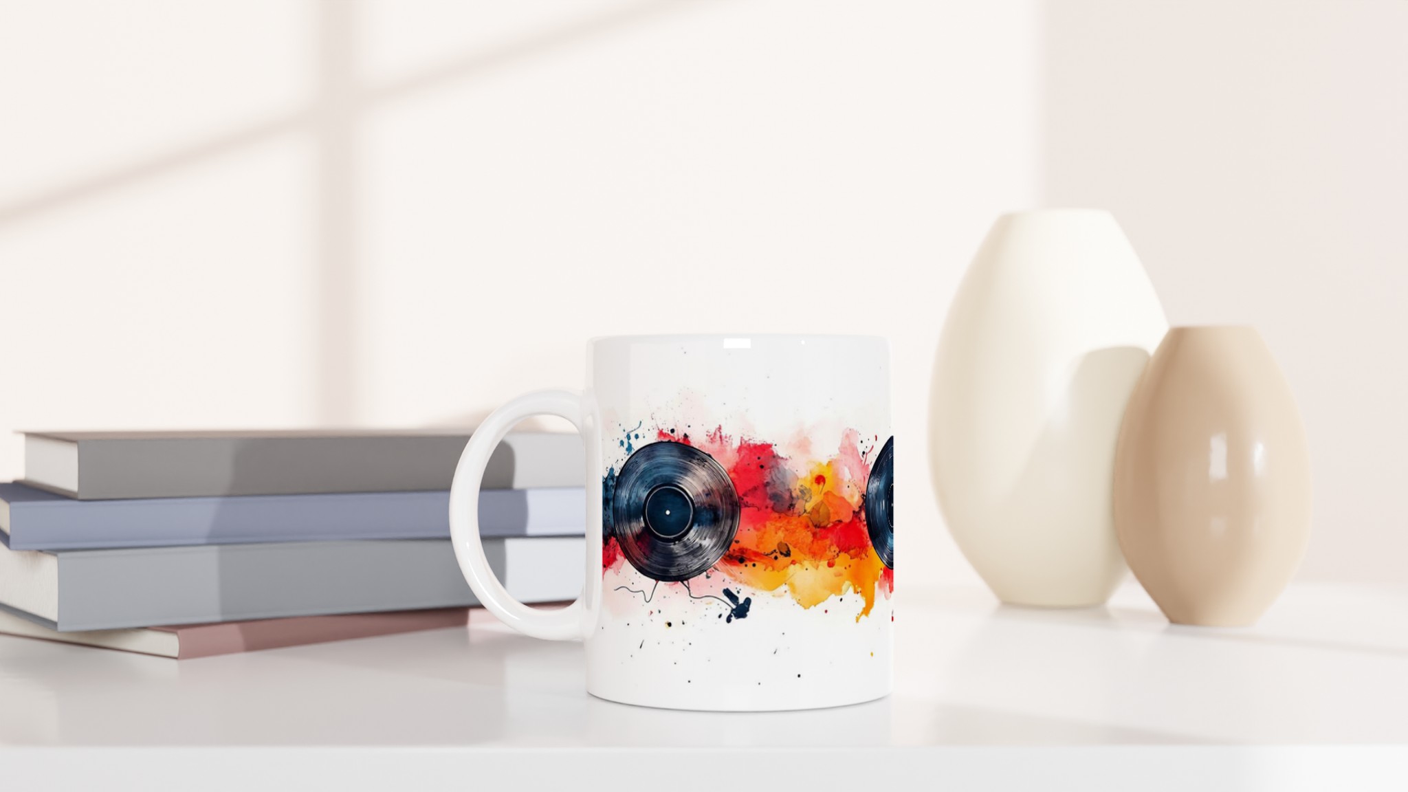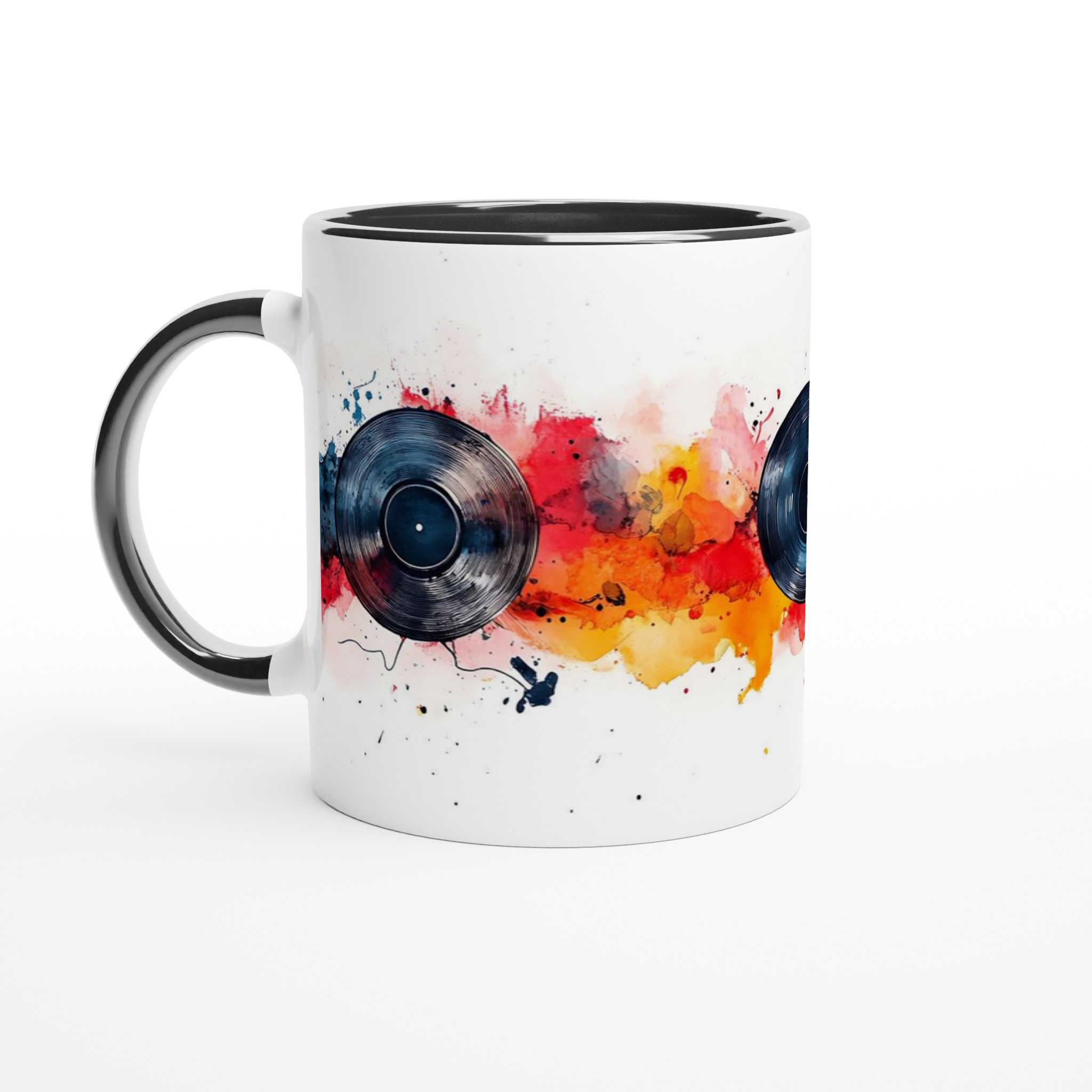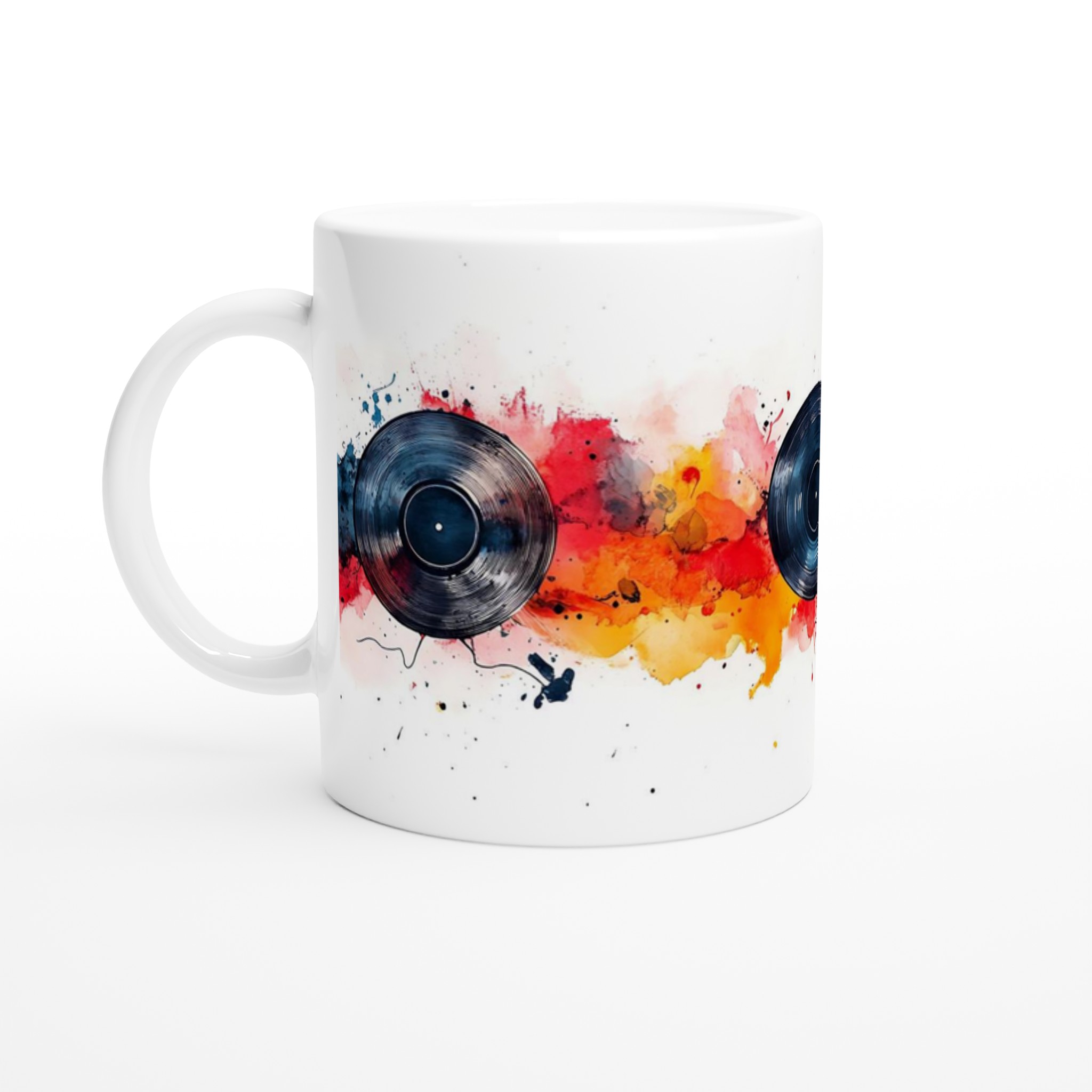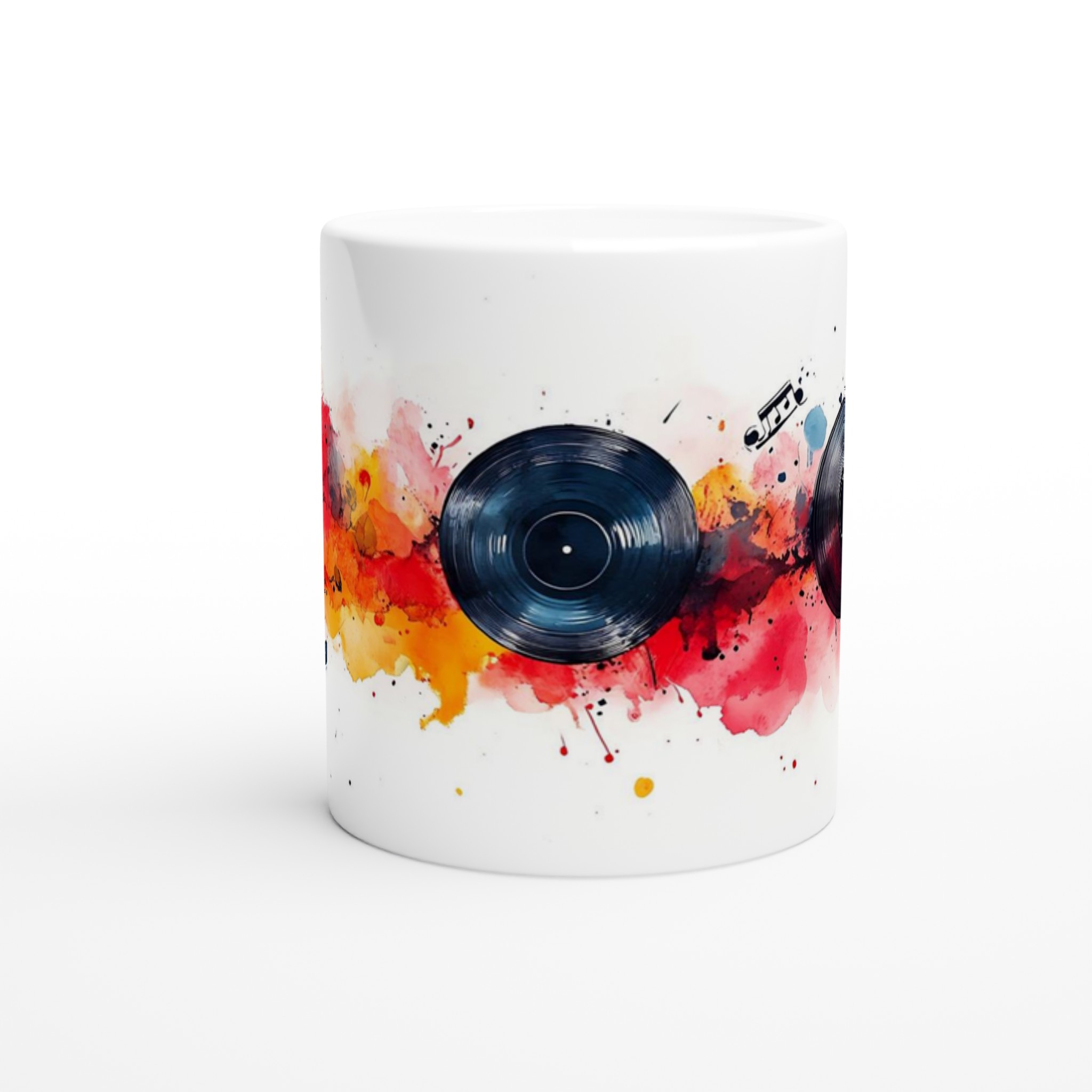 Låt musiken flöda och färgerna dansa med vår unika keramiska mugg, inspirerad av dynamiska vinylskivor och livfulla akvareller! Den här stilrena muggen blir snabbt en vardagsfavorit, perfekt för morgonkaffet, kvällens varma choklad eller när du bara vill njuta av en kopp te medan du drömmer dig bort till en värld av toner och färger. Den blanka vita ytan gör att trycken framhävs med klara och levande färger, som håller sig fina även efter många turer i mikron och diskmaskinen.
