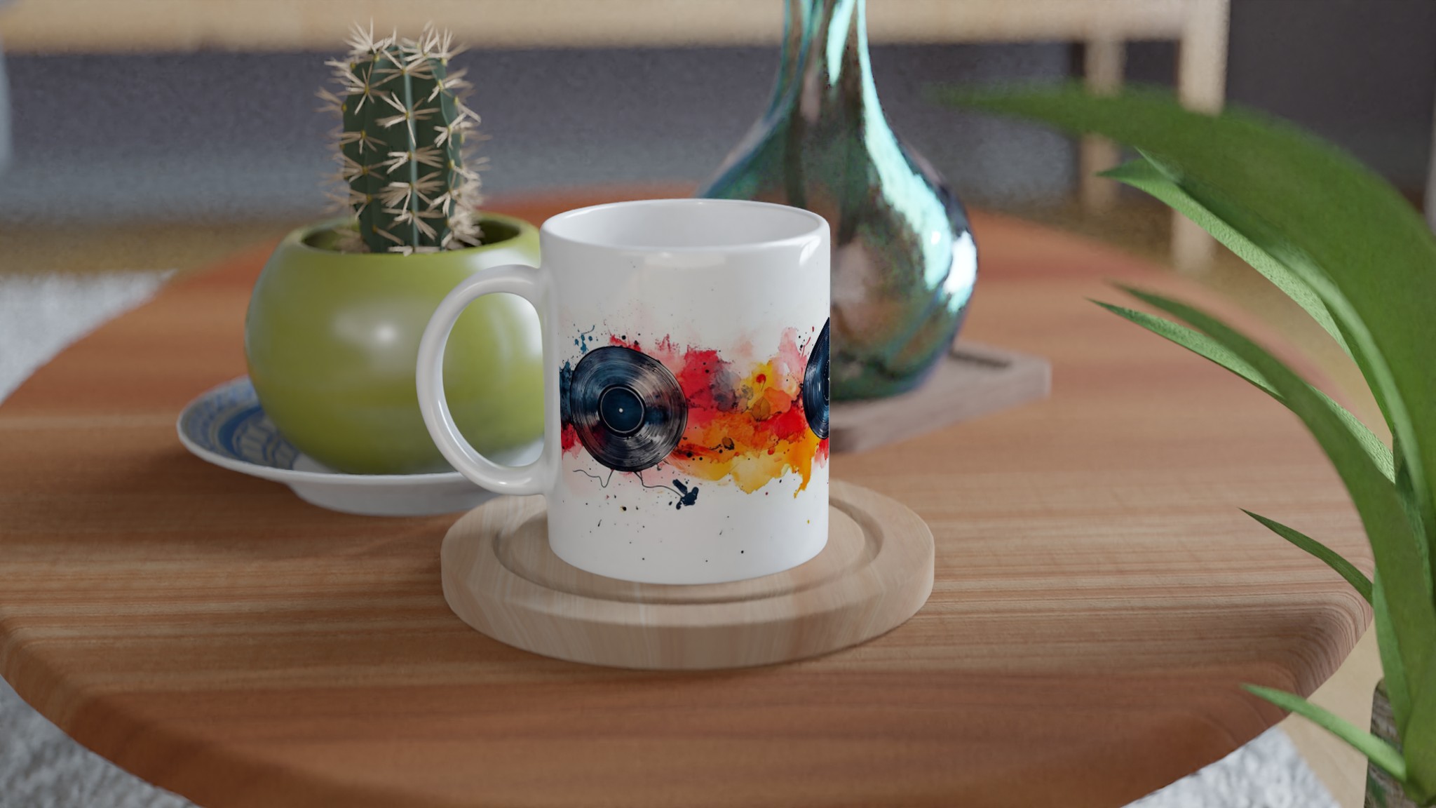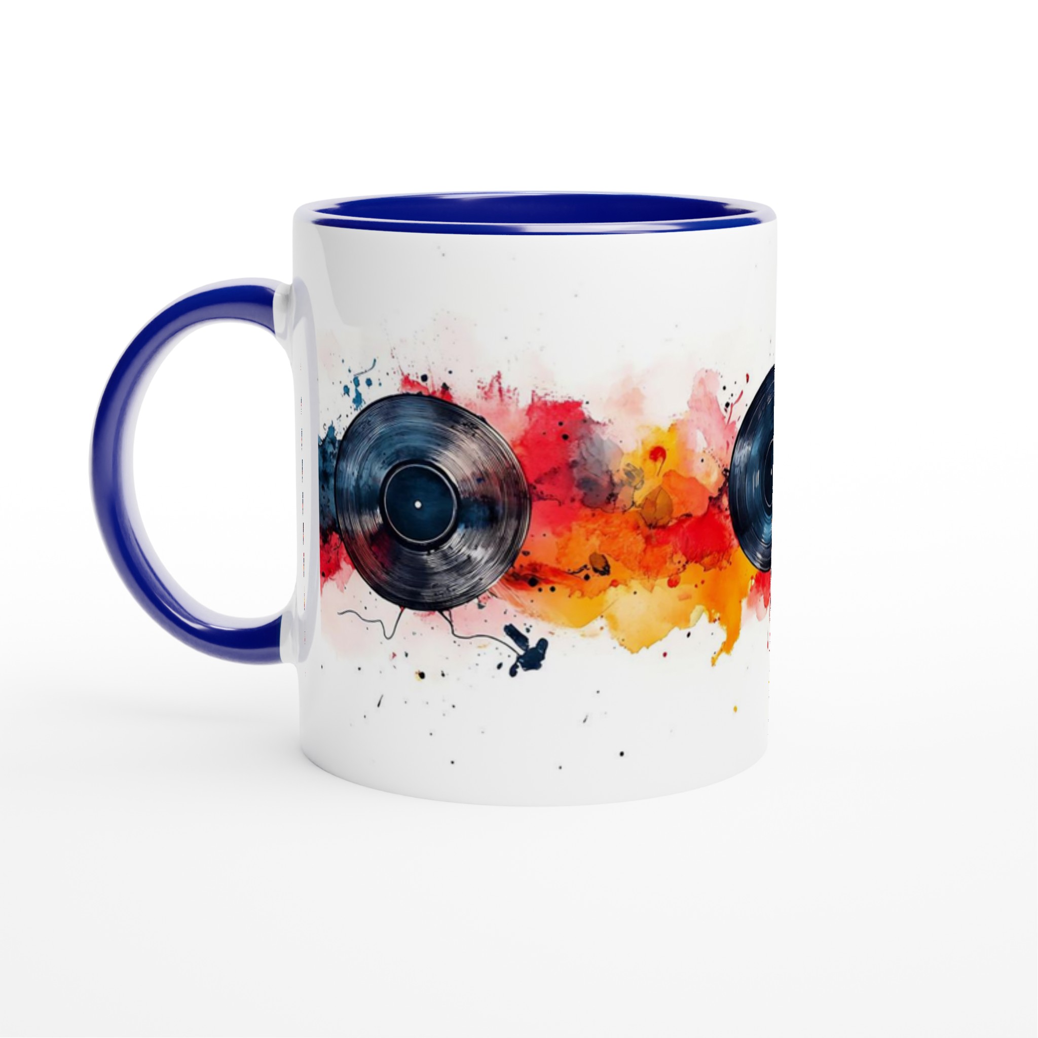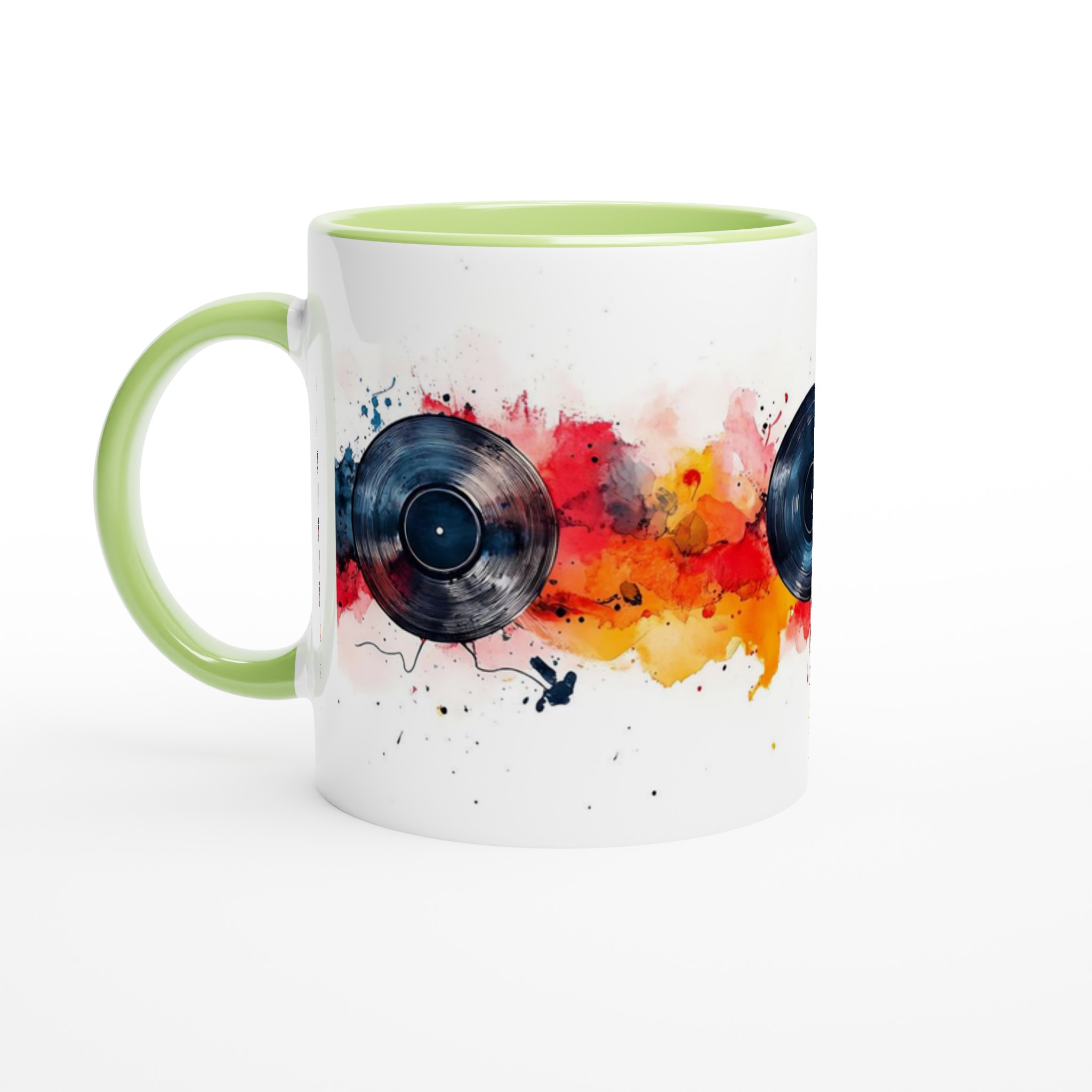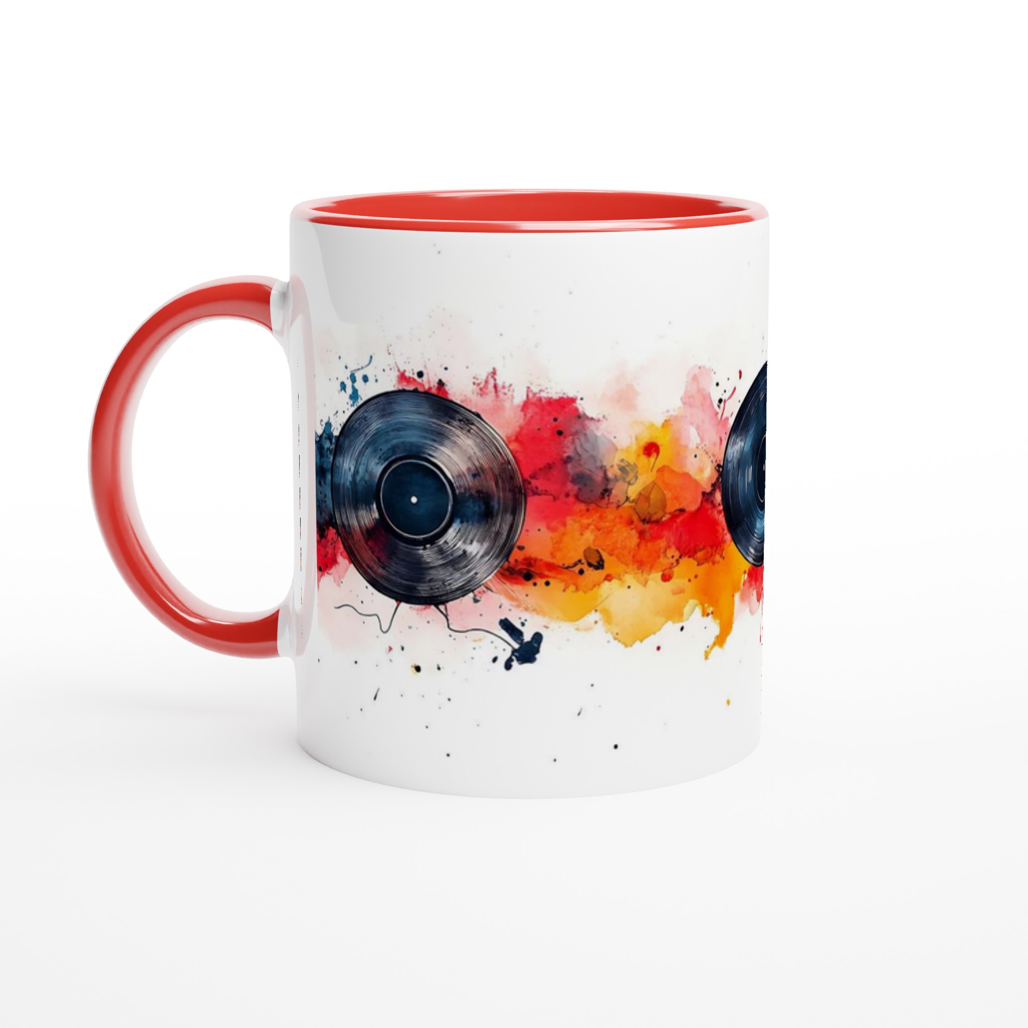 Låt musiken flöda och färgerna dansa med vår unika keramiska mugg, inspirerad av dynamiska vinylskivor och livfulla akvareller! Den här stilrena muggen blir snabbt en vardagsfavorit, perfekt för morgonkaffet, kvällens varma choklad eller när du bara vill njuta av en kopp te medan du drömmer dig bort till en värld av toner och färger. Den blanka vita ytan gör att trycken framhävs med klara och levande färger, som håller sig fina även efter många turer i mikron och diskmaskinen.
